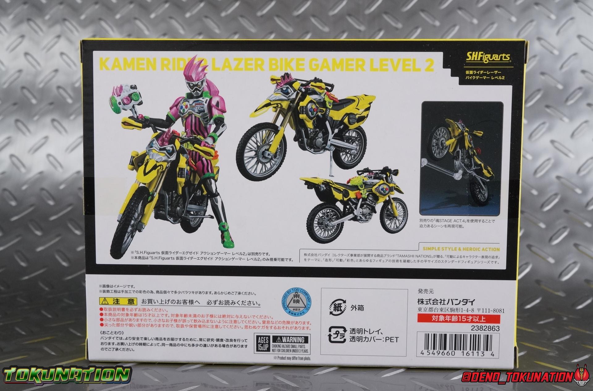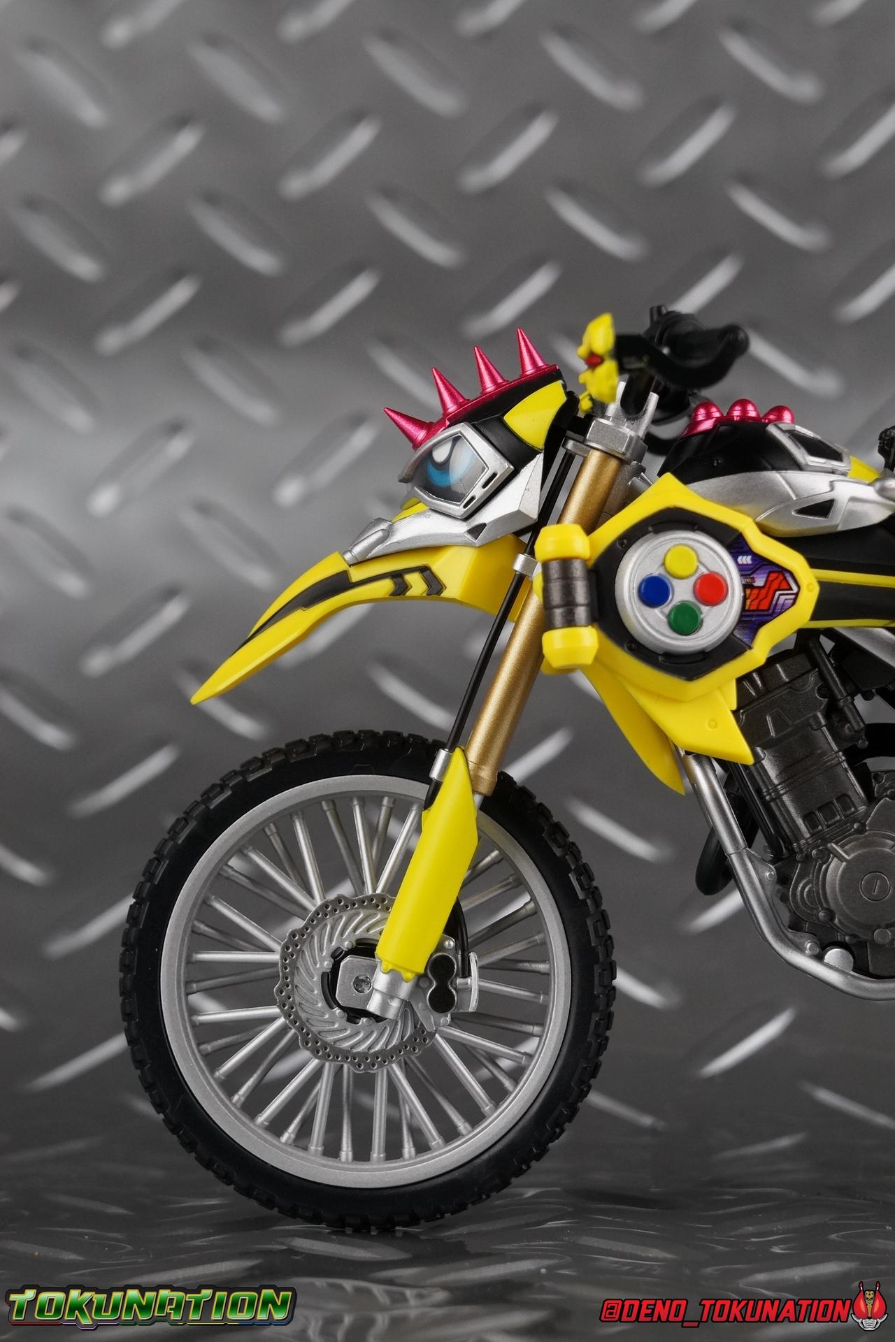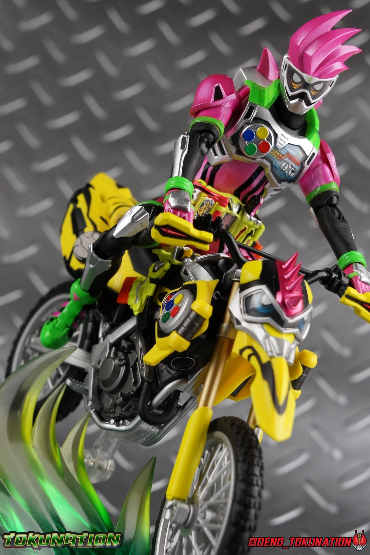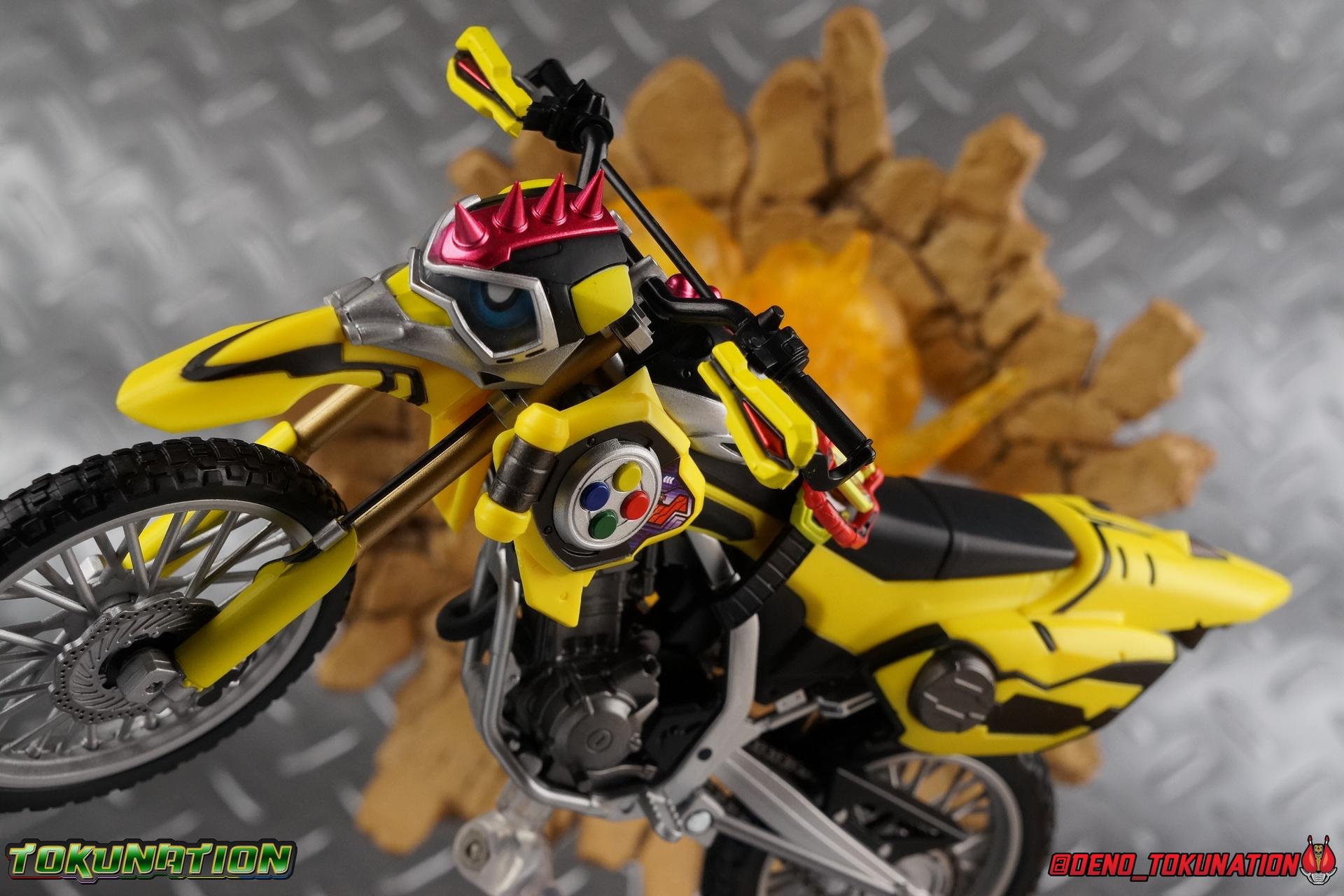 Kiriya Kujou. Liar, coroner, Bugster, Kamen Rider. Has there been a secondary character that's grown more memorable and beloved by fans of a rider show more quickly than him? I'm not so sure. Almost from the moment he stepped on screen, people fell in love with the two-faced hero. His death devastated some, his resurrection was similarly significant to others. All I know is that I personally grew to really love this character, and I've been patiently biding my time waiting for a nice collector oriented figure of his rider form to be released. While Lazer has an unconventional Level 2, it's finally been gorgeously executed. So let's dive in with a full review of S.H. Figuarts Kamen Rider Lazer Bike Gamer Level 2! Packaging Lazer Level 2 comes packaged in the same bright, colorful packaging that the rest of the line has. The vaguely game themed almost 8-bit blocky aesthetic just looks great. I know it's just a bx but I really really like the yellow they used. But yeah, I know, it's just a box. But I always love stylish packaging. Main Figure Unlike most Kamen Riders, this one IS a ride, literally. Rather than a traditional hero Lazer's Level 2 upgrade takes the form of a bike. An unusual turn for Kamen Riders. Where Accel had the ability to assume a bike form, Lazer is locked into this mode for his Level 2 form without a Level 3 Gashat. But what can a release like this bring to the table to really get us excited about something that can be as static as a bike? A decent amount actually. The main design of the bike is fairly standard, being based on a Honda CRF250L motorcycle. At a very basic level, you can clearly see the CRF components. The additional components that make Lazer who he is though are seamlessly integrated into this design. Take for instance the head & eyes added to the front of the bike, acting like a windshield almost. (This head of course is the basis for the later Level 0 Lazer Turbo form.) They just really convey Lazer's personality quite well. The only issue that bugs me is that the eyes are non-removable. Ex-Aid spoiler time, but at a certain point Kiriya is killed by Kuroto. In his dying moments he leaves his Gamer Driver and Gashat to Emu. From this point on until Kiriya's resurrection, any time Ex-Aid summons Lazer Level 2's bike form, the eyes are blacked out. Now the SO-DO candy toy release went so far as to include the blank eyes, I wish this one could have as well. Panels mimicking Lazer's Rider Gauge chest plates are positioned just above the engine block, each is painted rather nicely. And as is usual with Rider Machines the engine itself is very nicely detailed with a great metallic paint finish as well. Additionally you can see between the seat and handlebars of the bike is a vestigial Lazer Level 1 face. Much like the Mighty Action X Beginning Set, this is a shrunken down and stylized version of the rider's Level 1 faceplate, though in Lazer's case it's a bit more shrunken down to fit on a bike chassis. On either side just below this are halves of a Rider Belt, and in the center at the tip of the seat is a slot for one of two included Gamer Drivers! The fit for the Drivers is rather snug, you'll need to press firmly to lock it in. I'll get into the difference between the two Drivers below in the accessories section. Needless to say though this feature already puts this bike a step above previous similar releases. As far as the last few standard Rider Machines go, not counting Tridoron, Lazer Level 2 is a really lavishly executed bike. More so than the Sakura Hurricane for Gaim, and far far more so than the Ghostriker. I will say that I find it difficult to get a natural pose with a rider on Lazer though. No matter which of the two Gamer Drivers you choose to use, they both keep the rider from sitting too close to the handlebars and can impact the inner thighs enough to make posing difficult. That being said, when you throw him in with Ex-Aid and the gang the effect is in fantastic. Accessories Believe it or not, Lazer Level 2 actually comes with more & better accessories than most humanoid web exclusives: 1 - Clear Wheel Base. The standard kind included with nearly all Rider Machines. Just a nice solid base to hold the bike in a static position. 1 - Tamashii Stage Adapter. A neat curved piece that can lock over the bottom of the engine and allows you to recreate action shots. I like this one a bit better than most I've seen before. At the end of the curve is a tab you can pull back on like a release lever, rather than just trying to pry it off and possibly break it. 1 - Gamer Driver (normal). This Driver is the standard bulky Gamer Driver each of the Ex-Aid Figuarts has featured so far. Albeit with a new Bakusou Bike Gashat and readout on the front of the driver. As with the other Drivers, the dummy Gashat is removable, so you can give it to other figures as I have with Ex-Aid in the shots below. This normal version of the driver is what should be attached to accurately replicate the bikes on-screen appearance most of the time. 1 - Gamer Driver (stunt). This slimmed down version of the Driver is based more on the "stunt" version of the prop used for filming. A slimmed down non-functional version of the driver, both in show and toy form. It gives the bike a little sleeker look and allows a rider to sit more comfortably. Though either driver makes a natural sitting pose difficult in my opinion. The Gashast isn't removable on this on and it's really just for show, but the mere inclusion of it is a step above where accessories usually stand for web exclusives. 2 - Ex-Aid hands. These hands are design just for use with Lazer Level 2, specifically to hold the handlebar and extend 1 finger forward towards the brake lever on either handle. I find it difficult to get them on the handles without popping off the hand guard bar along the side first. That's a pretty fantastic set of accessories for a bike. Bravo. Final Thoughts Bucking the trend of Rider Machines being 