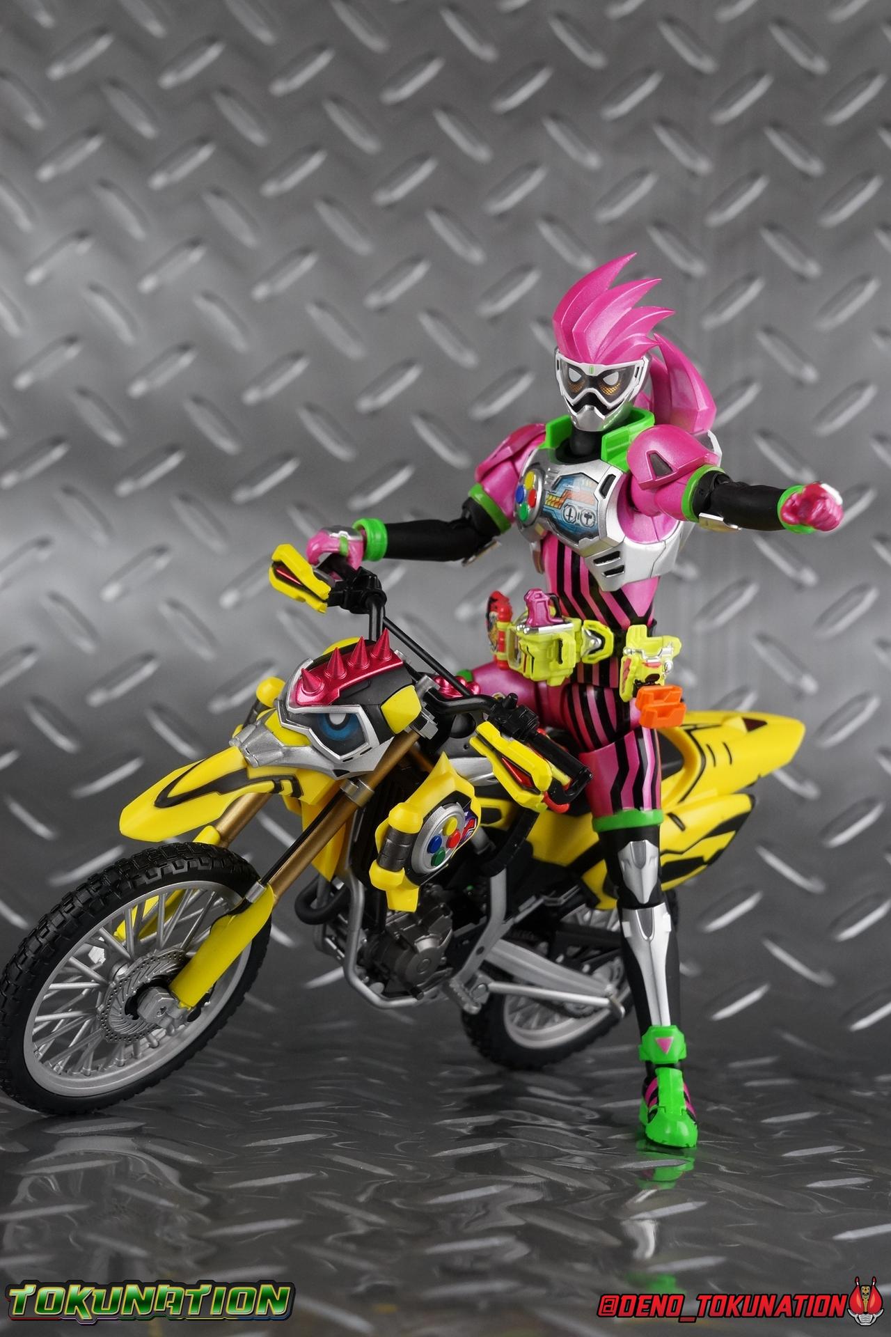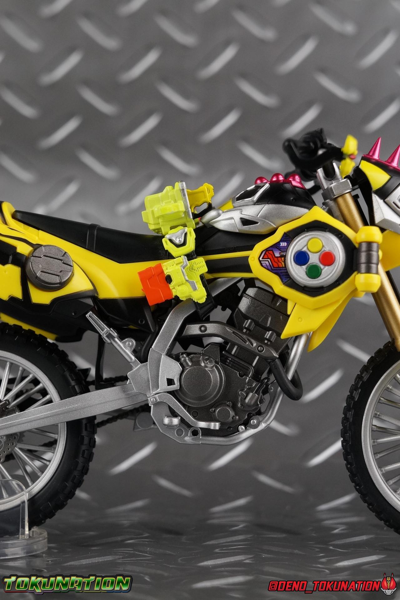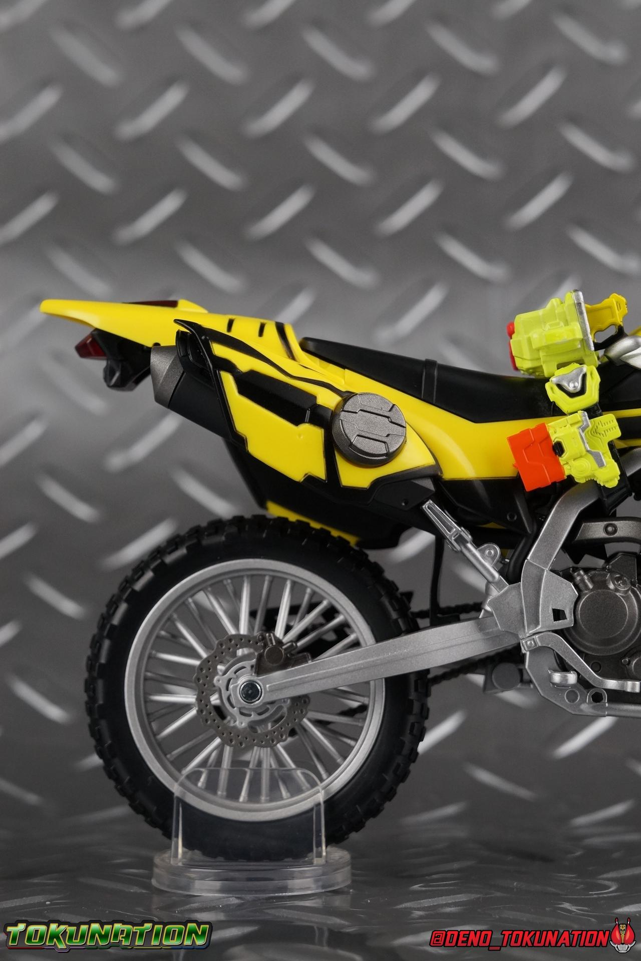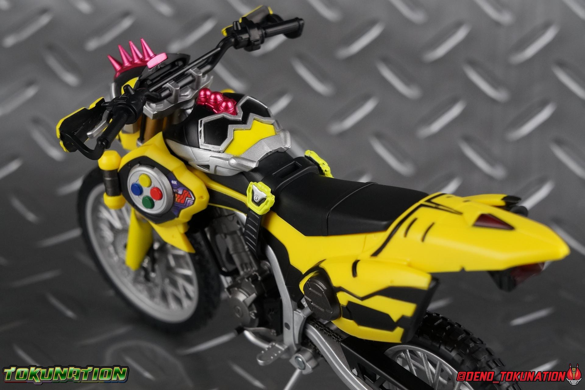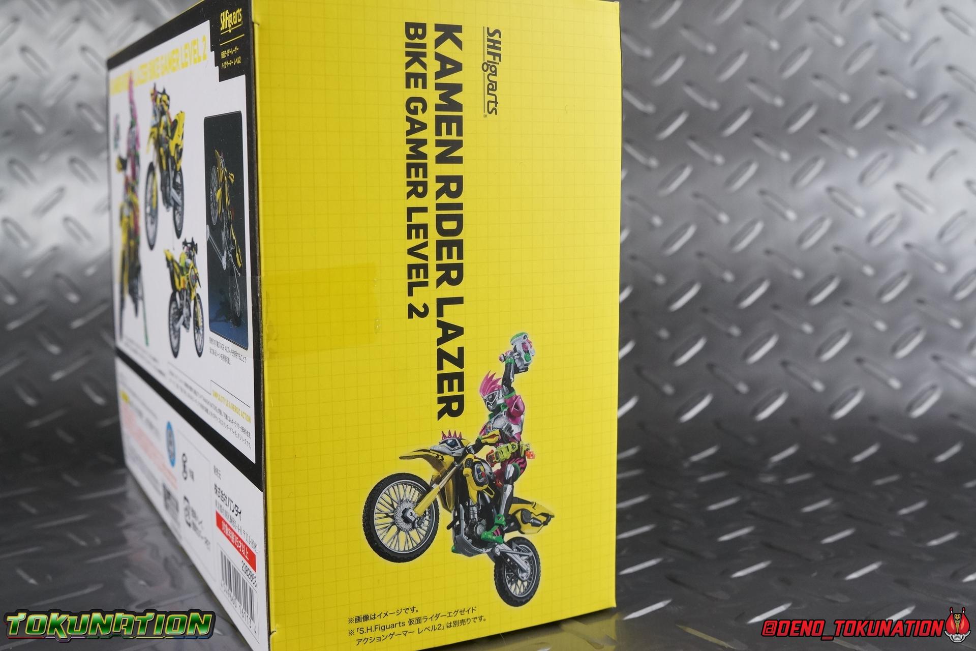 Kiriya Kujou. Liar, coroner, Bugster, Kamen Rider. Has there been a secondary character that's grown more memorable and beloved by fans of a rider show more quickly than him? I'm not so sure. Almost from the moment he stepped on screen, people fell in love with the two-faced hero. His death devastated some, his resurrection was similarly significant to others. All I know is that I personally grew to really love this character, and I've been patiently biding my time waiting for a nice collector oriented figure of his rider form to be released. While Lazer has an unconventional Level 2, it's finally been gorgeously executed. So let's dive in with a full review of S.H. Figuarts Kamen Rider Lazer Bike Gamer Level 2! Packaging Lazer Level 2 comes packaged in the same bright, colorful packaging that the rest of the line has. The vaguely game themed almost 8-bit blocky aesthetic just looks great. I know it's just a bx but I really really like the yellow they used. But yeah, I know, it's just a box. But I always love stylish packaging. Main Figure Unlike most Kamen Riders, this one IS a ride, literally. Rather than a traditional hero Lazer's Level 2 upgrade takes the form of a bike. An unusual turn for Kamen Riders. Where Accel had the ability to assume a bike form, Lazer is locked into this mode for his Level 2 form without a Level 3 Gashat. But what can a release like this bring to the table to really get us excited about something that can be as static as a bike? A decent amount actually. The main design of the bike is fairly standard, being based on a Honda CRF250L motorcycle. At a very basic level, you can clearly see the CRF components. The additional components that make Lazer who he is though are seamlessly integrated into this design. Take for instance the head & eyes added to the front of the bike, acting like a windshield almost. (This head of course is the basis for the later Level 0 Lazer Turbo form.) They just really convey Lazer's personality quite well. The only issue that bugs me is that the eyes are non-removable. Ex-Aid spoiler time, but at a certain point Kiriya is killed by Kuroto. In his dying moments he leaves his Gamer Driver and Gashat to Emu. From this point on until Kiriya's resurrection, any time Ex-Aid summons Lazer Level 2's bike form, the eyes are blacked out. Now the SO-DO candy toy release went so far as to include the blank eyes, I wish this one could have as well. Panels mimicking Lazer's Rider Gauge chest plates are positioned just above the engine block, each is painted rather nicely. And as is usual with Rider Machines the engine itself is very nicely detailed with a great metallic paint finish as well. Additionally you can see between the seat and handlebars of the bike is a vestigial Lazer Level 1 face. Much like the Mighty Action X Beginning Set, this is a shrunken down and stylized version of the rider's Level 1 faceplate, though in Lazer's case it's a bit more shrunken down to fit on a bike chassis. On either side just below this are halves of a Rider Belt, and in the center at the tip of the seat is a slot for one of two included Gamer Drivers! The fit for the Drivers is rather snug, you'll need to press firmly to lock it in. I'll get into the difference between the two Drivers below in the accessories section. Needless to say though this feature already puts this bike a step above previous similar releases. As far as the last few standard Rider Machines go, not counting Tridoron, Lazer Level 2 is a really lavishly executed bike. More so than the Sakura Hurricane for Gaim, and far far more so than the Ghostriker. I will say that I find it difficult to get a natural pose with a rider on Lazer though. No matter which of the two Gamer Drivers you choose to use, they both keep the rider from sitting too close to the handlebars and can impact the inner thighs enough to make posing difficult. That being said, when you throw him in with Ex-Aid and the gang the effect is in fantastic. Accessories Believe it or not, Lazer Level 2 actually comes with more & better accessories than most humanoid web exclusives: 1 - Clear Wheel Base. The standard kind included with nearly all Rider Machines. Just a nice solid base to hold the bike in a static position. 1 - Tamashii Stage Adapter. A neat curved piece that can lock over the bottom of the engine and allows you to recreate action shots. I like this one a bit better than most I've seen before. At the end of the curve is a tab you can pull back on like a release lever, rather than just trying to pry it off and possibly break it. 1 - Gamer Driver (normal). This Driver is the standard bulky Gamer Driver each of the Ex-Aid Figuarts has featured so far. Albeit with a new Bakusou Bike Gashat and readout on the front of the driver. As with the other Drivers, the dummy Gashat is removable, so you can give it to other figures as I have with Ex-Aid in the shots below. This normal version of the driver is what should be attached to accurately replicate the bikes on-screen appearance most of the time. 1 - Gamer Driver (stunt). This slimmed down version of the Driver is based more on the "stunt" version of the prop used for filming. A slimmed down non-functional version of the driver, both in show and toy form. It gives the bike a little sleeker look and allows a rider to sit more comfortably. Though either driver makes a natural sitting pose difficult in my opinion. The Gashast isn't removable on this on and it's really just for show, but the mere inclusion of it is a step above where accessories usually stand for web exclusives. 2 - Ex-Aid hands. These hands are design just for use with Lazer Level 2, specifically to hold the handlebar and extend 1 finger forward towards the brake lever on either handle. I find it difficult to get them on the handles without popping off the hand guard bar along the side first. That's a pretty fantastic set of accessories for a bike. Bravo. Final Thoughts Bucking the trend of Rider Machines being 