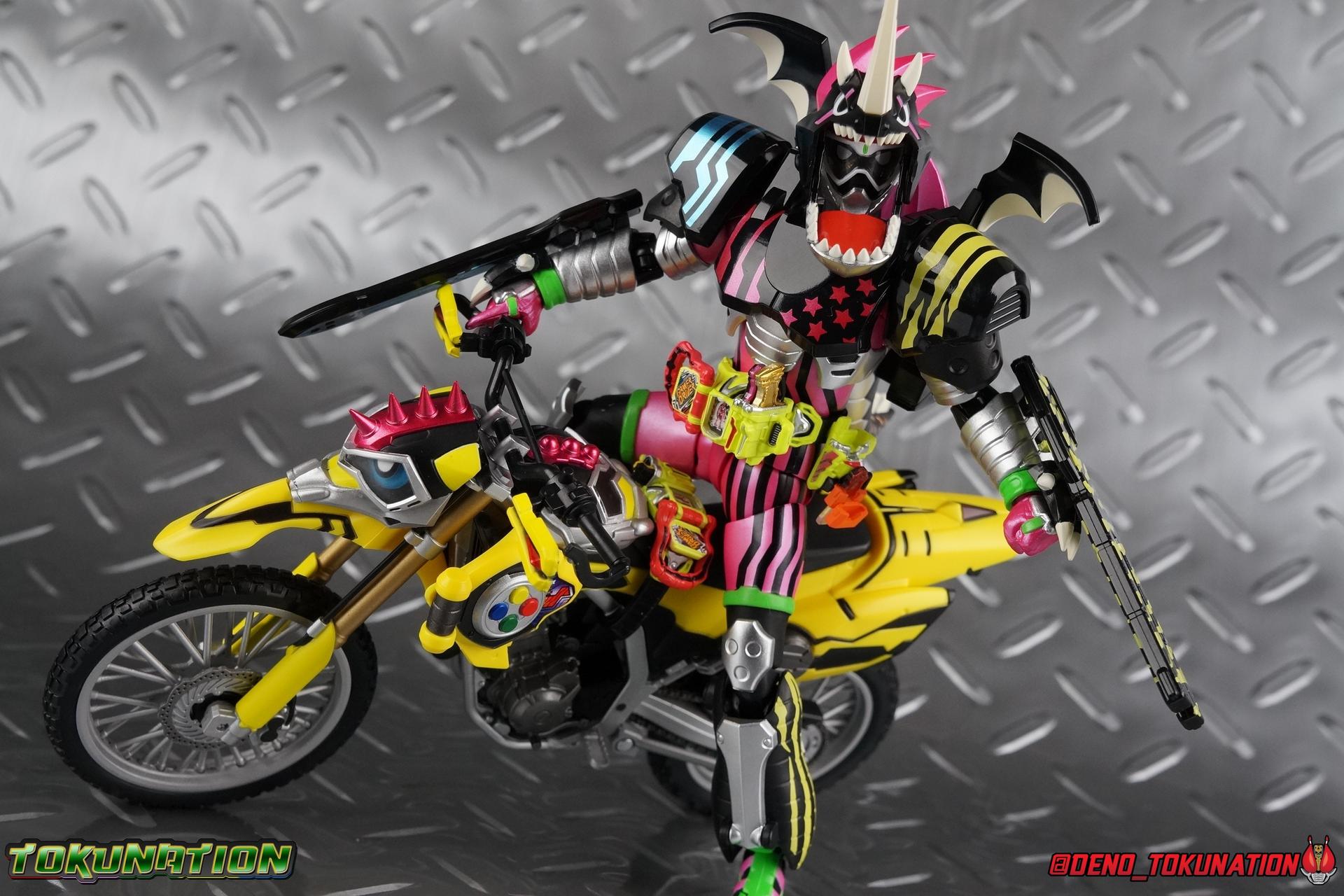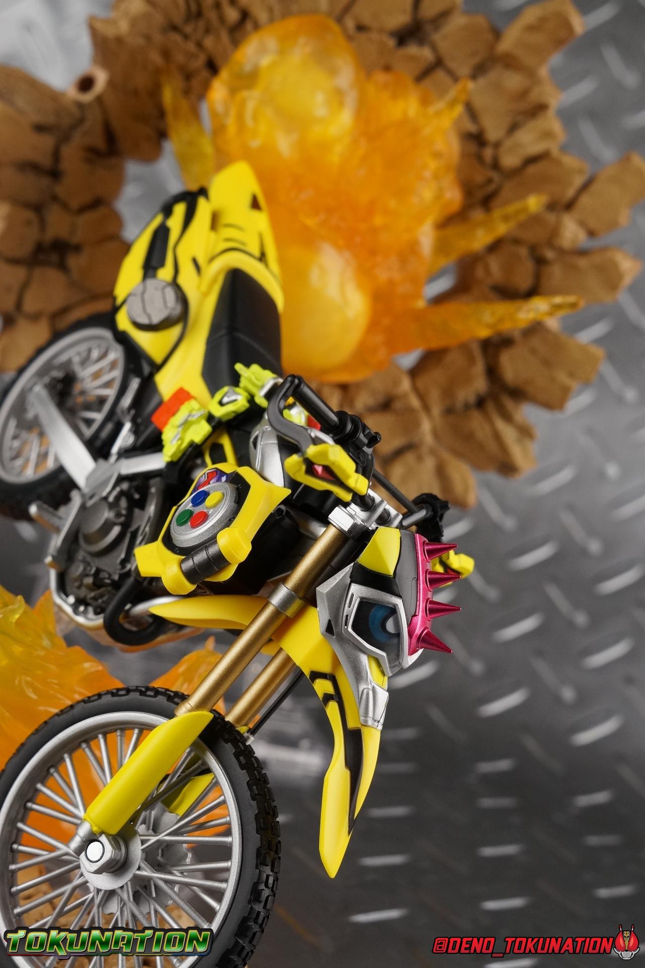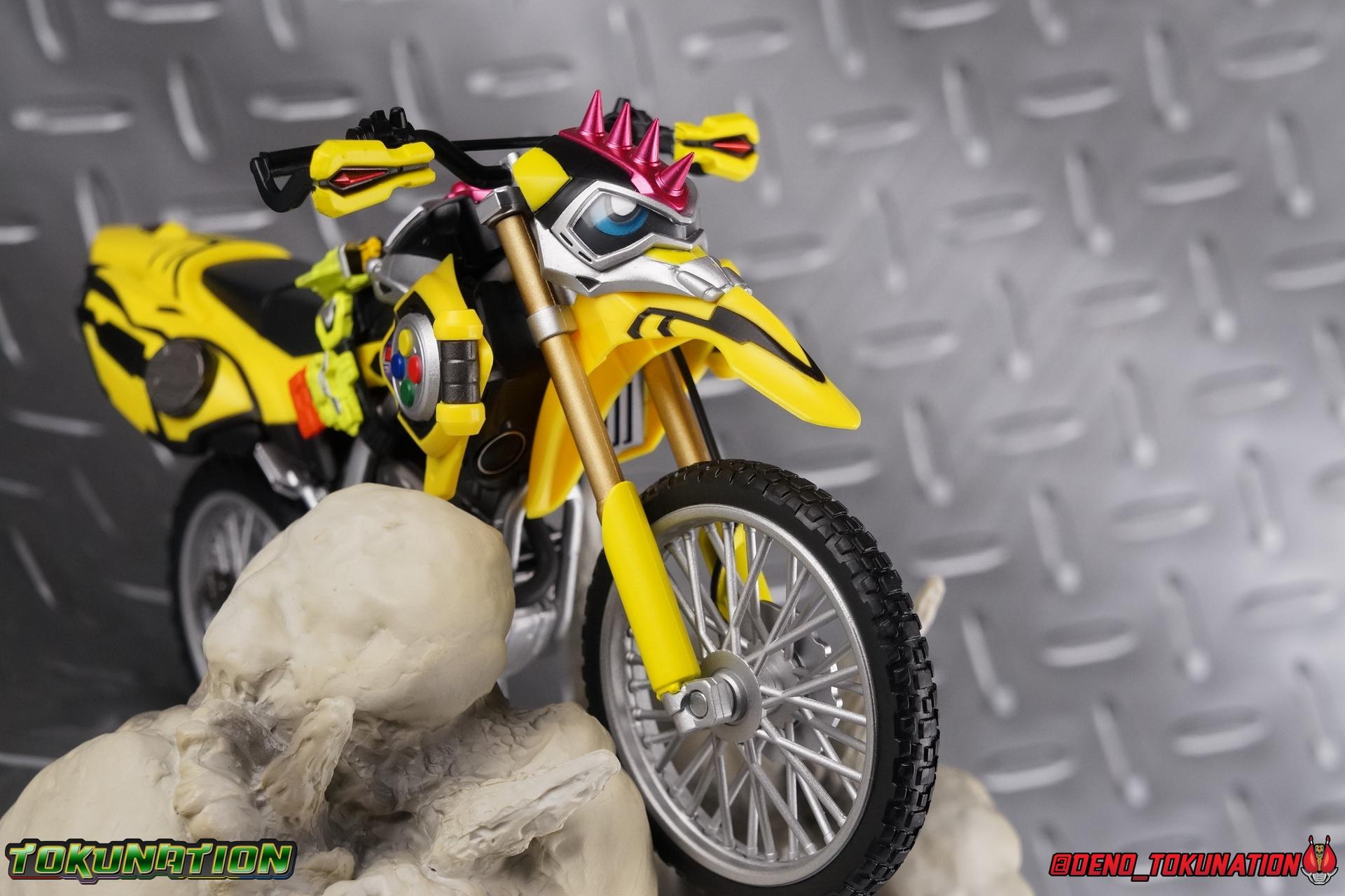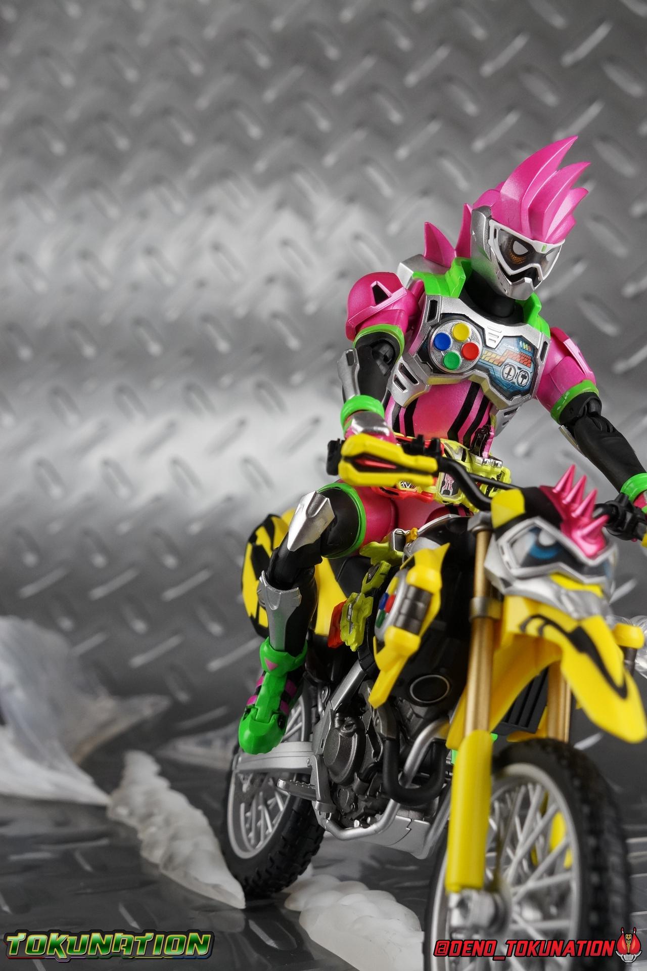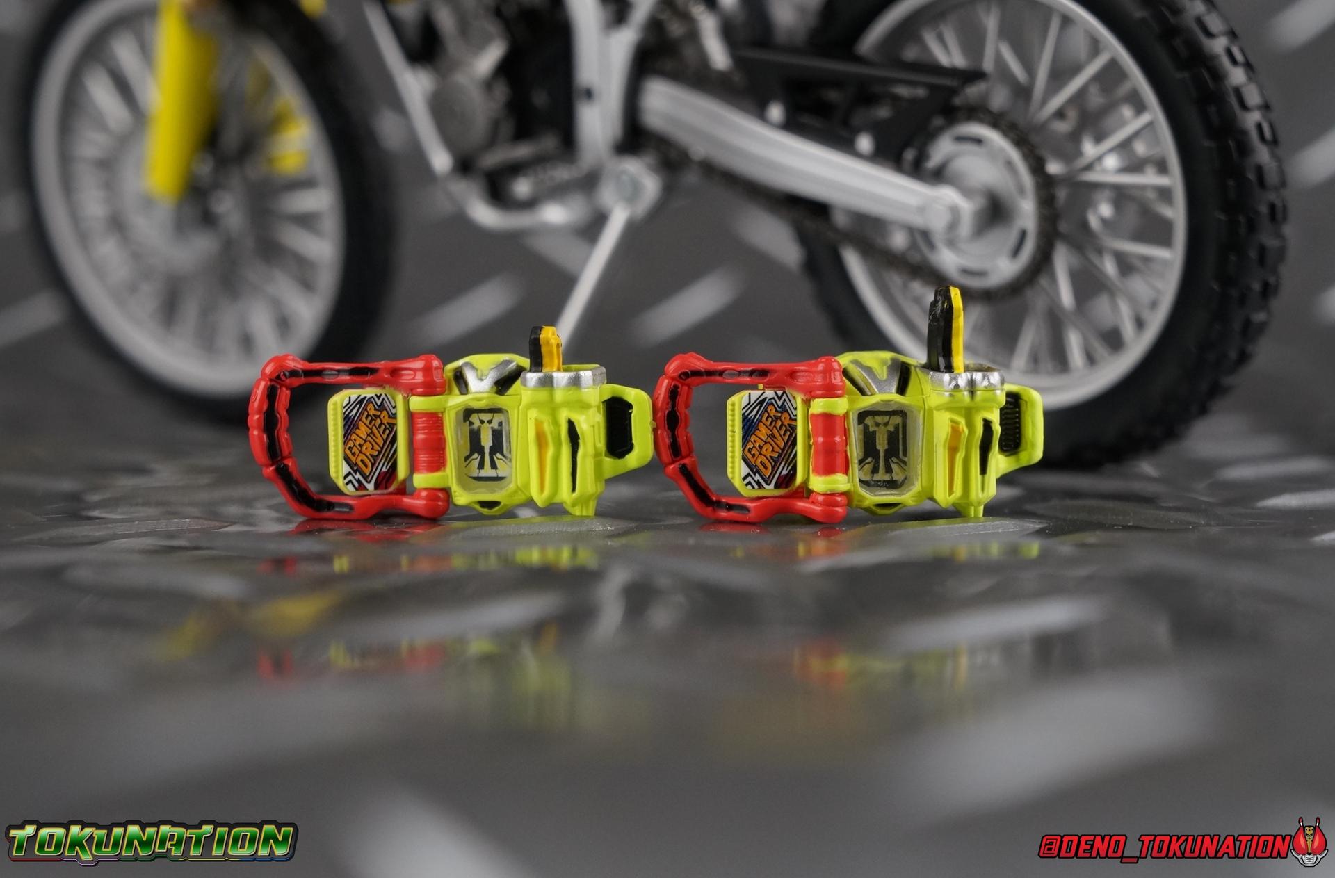 Kiriya Kujou. Liar, coroner, Bugster, Kamen Rider. Has there been a secondary character that's grown more memorable and beloved by fans of a rider show more quickly than him? I'm not so sure. Almost from the moment he stepped on screen, people fell in love with the two-faced hero. His death devastated some, his resurrection was similarly significant to others. All I know is that I personally grew to really love this character, and I've been patiently biding my time waiting for a nice collector oriented figure of his rider form to be released. While Lazer has an unconventional Level 2, it's finally been gorgeously executed. So let's dive in with a full review of S.H. Figuarts Kamen Rider Lazer Bike Gamer Level 2! Packaging Lazer Level 2 comes packaged in the same bright, colorful packaging that the rest of the line has. The vaguely game themed almost 8-bit blocky aesthetic just looks great. I know it's just a bx but I really really like the yellow they used. But yeah, I know, it's just a box. But I always love stylish packaging. Main Figure Unlike most Kamen Riders, this one IS a ride, literally. Rather than a traditional hero Lazer's Level 2 upgrade takes the form of a bike. An unusual turn for Kamen Riders. Where Accel had the ability to assume a bike form, Lazer is locked into this mode for his Level 2 form without a Level 3 Gashat. But what can a release like this bring to the table to really get us excited about something that can be as static as a bike? A decent amount actually. The main design of the bike is fairly standard, being based on a Honda CRF250L motorcycle. At a very basic level, you can clearly see the CRF components. The additional components that make Lazer who he is though are seamlessly integrated into this design. Take for instance the head & eyes added to the front of the bike, acting like a windshield almost. (This head of course is the basis for the later Level 0 Lazer Turbo form.) They just really convey Lazer's personality quite well. The only issue that bugs me is that the eyes are non-removable. Ex-Aid spoiler time, but at a certain point Kiriya is killed by Kuroto. In his dying moments he leaves his Gamer Driver and Gashat to Emu. From this point on until Kiriya's resurrection, any time Ex-Aid summons Lazer Level 2's bike form, the eyes are blacked out. Now the SO-DO candy toy release went so far as to include the blank eyes, I wish this one could have as well. Panels mimicking Lazer's Rider Gauge chest plates are positioned just above the engine block, each is painted rather nicely. And as is usual with Rider Machines the engine itself is very nicely detailed with a great metallic paint finish as well. Additionally you can see between the seat and handlebars of the bike is a vestigial Lazer Level 1 face. Much like the Mighty Action X Beginning Set, this is a shrunken down and stylized version of the rider's Level 1 faceplate, though in Lazer's case it's a bit more shrunken down to fit on a bike chassis. On either side just below this are halves of a Rider Belt, and in the center at the tip of the seat is a slot for one of two included Gamer Drivers! The fit for the Drivers is rather snug, you'll need to press firmly to lock it in. I'll get into the difference between the two Drivers below in the accessories section. Needless to say though this feature already puts this bike a step above previous similar releases. As far as the last few standard Rider Machines go, not counting Tridoron, Lazer Level 2 is a really lavishly executed bike. More so than the Sakura Hurricane for Gaim, and far far more so than the Ghostriker. I will say that I find it difficult to get a natural pose with a rider on Lazer though. No matter which of the two Gamer Drivers you choose to use, they both keep the rider from sitting too close to the handlebars and can impact the inner thighs enough to make posing difficult. That being said, when you throw him in with Ex-Aid and the gang the effect is in fantastic. Accessories Believe it or not, Lazer Level 2 actually comes with more & better accessories than most humanoid web exclusives: 1 - Clear Wheel Base. The standard kind included with nearly all Rider Machines. Just a nice solid base to hold the bike in a static position. 1 - Tamashii Stage Adapter. A neat curved piece that can lock over the bottom of the engine and allows you to recreate action shots. I like this one a bit better than most I've seen before. At the end of the curve is a tab you can pull back on like a release lever, rather than just trying to pry it off and possibly break it. 1 - Gamer Driver (normal). This Driver is the standard bulky Gamer Driver each of the Ex-Aid Figuarts has featured so far. Albeit with a new Bakusou Bike Gashat and readout on the front of the driver. As with the other Drivers, the dummy Gashat is removable, so you can give it to other figures as I have with Ex-Aid in the shots below. This normal version of the driver is what should be attached to accurately replicate the bikes on-screen appearance most of the time. 1 - Gamer Driver (stunt). This slimmed down version of the Driver is based more on the "stunt" version of the prop used for filming. A slimmed down non-functional version of the driver, both in show and toy form. It gives the bike a little sleeker look and allows a rider to sit more comfortably. Though either driver makes a natural sitting pose difficult in my opinion. The Gashast isn't removable on this on and it's really just for show, but the mere inclusion of it is a step above where accessories usually stand for web exclusives. 2 - Ex-Aid hands. These hands are design just for use with Lazer Level 2, specifically to hold the handlebar and extend 1 finger forward towards the brake lever on either handle. I find it difficult to get them on the handles without popping off the hand guard bar along the side first. That's a pretty fantastic set of accessories for a bike. Bravo. Final Thoughts Bucking the trend of Rider Machines being 