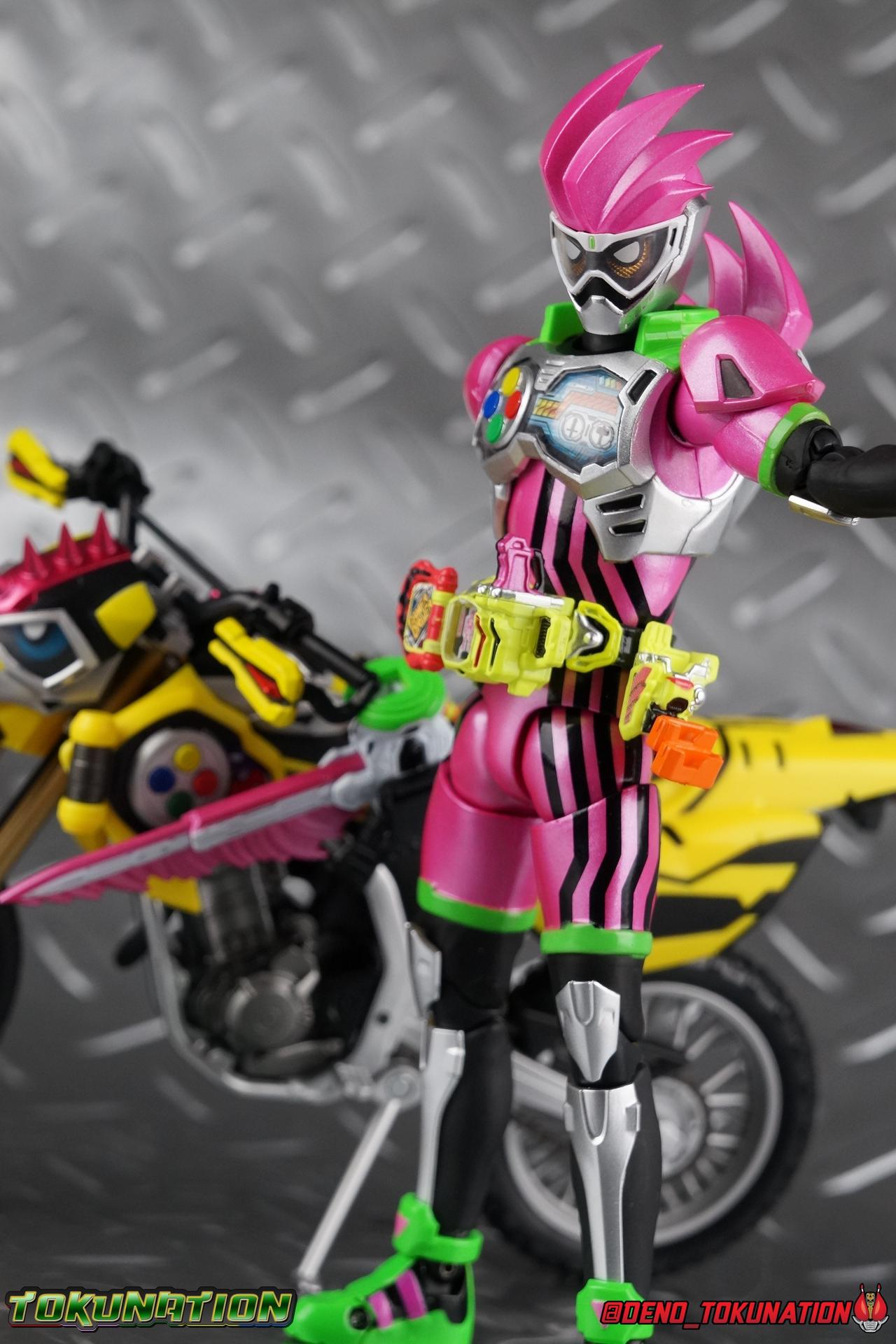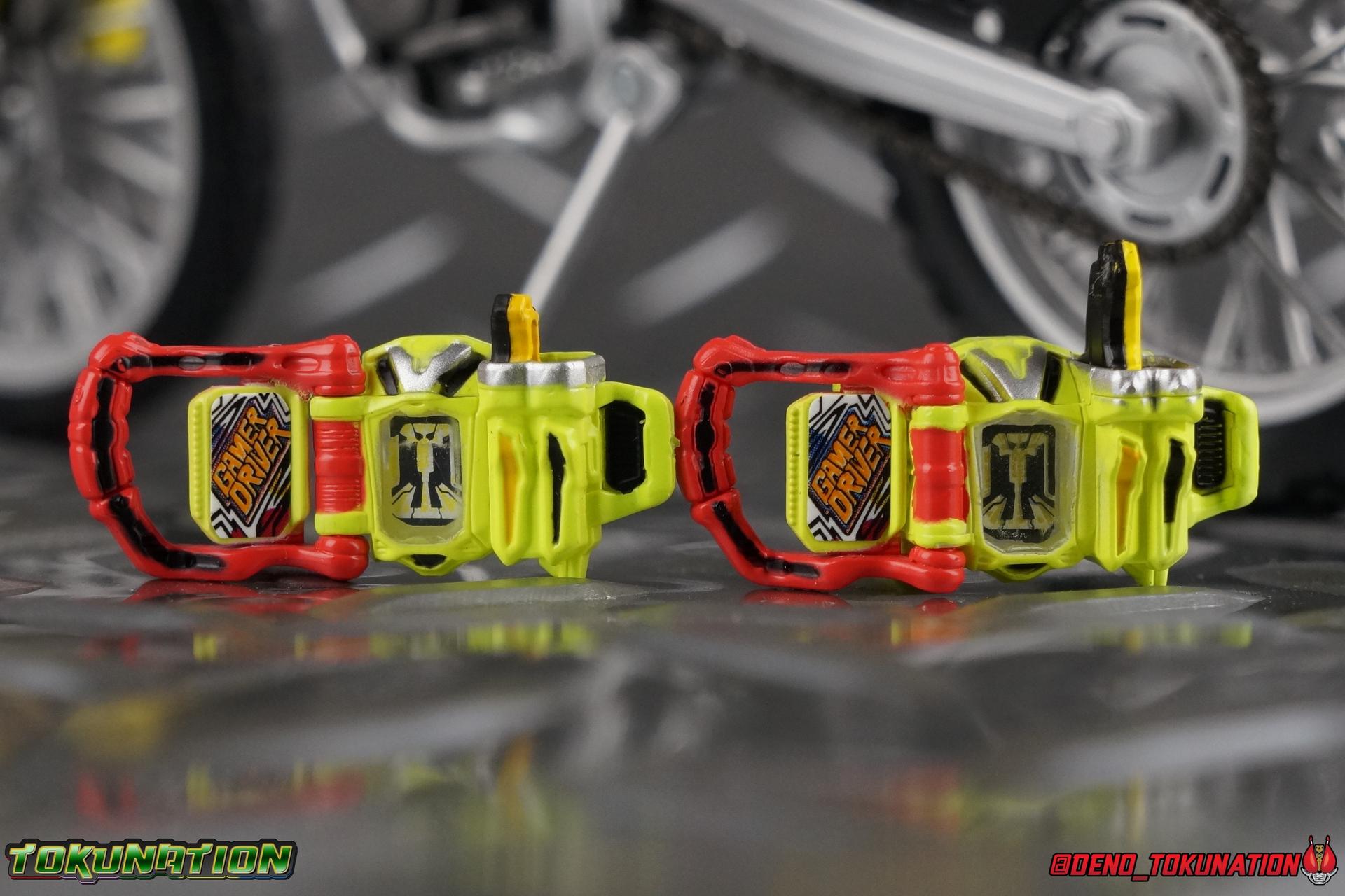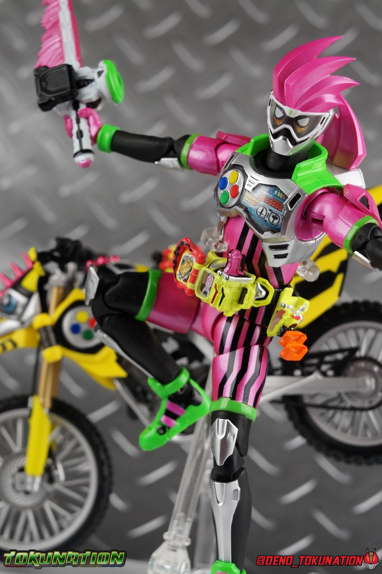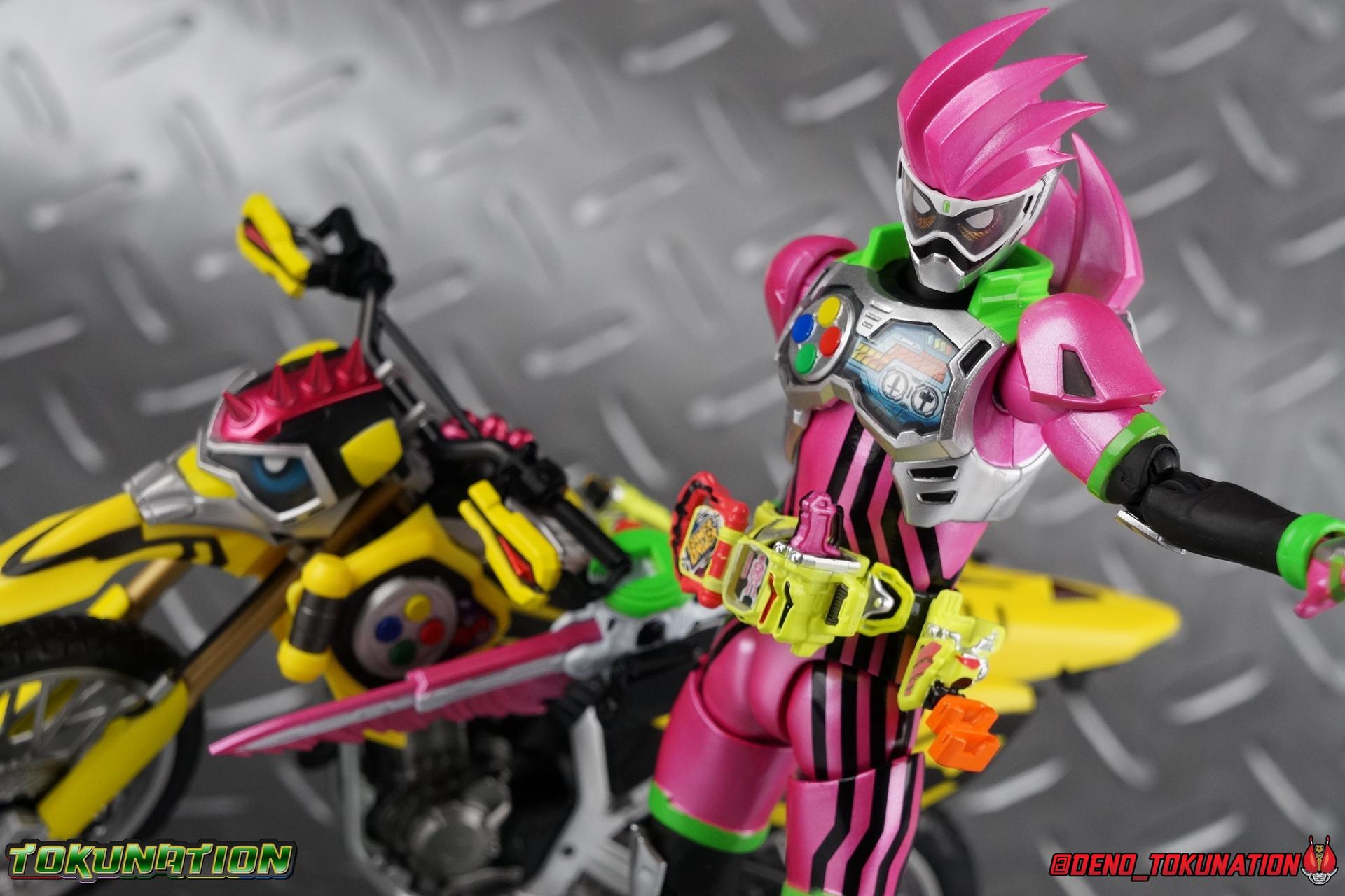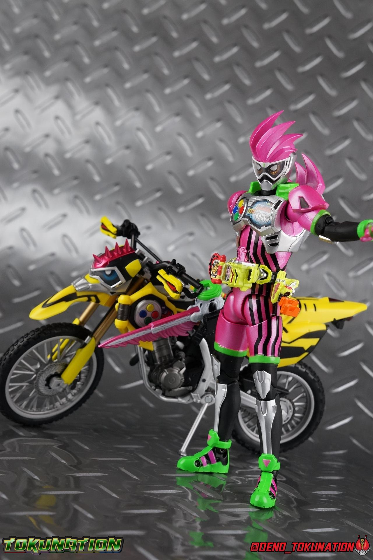 Kiriya Kujou. Liar, coroner, Bugster, Kamen Rider. Has there been a secondary character that's grown more memorable and beloved by fans of a rider show more quickly than him? I'm not so sure. Almost from the moment he stepped on screen, people fell in love with the two-faced hero. His death devastated some, his resurrection was similarly significant to others. All I know is that I personally grew to really love this character, and I've been patiently biding my time waiting for a nice collector oriented figure of his rider form to be released. While Lazer has an unconventional Level 2, it's finally been gorgeously executed. So let's dive in with a full review of S.H. Figuarts Kamen Rider Lazer Bike Gamer Level 2! Packaging Lazer Level 2 comes packaged in the same bright, colorful packaging that the rest of the line has. The vaguely game themed almost 8-bit blocky aesthetic just looks great. I know it's just a bx but I really really like the yellow they used. But yeah, I know, it's just a box. But I always love stylish packaging. Main Figure Unlike most Kamen Riders, this one IS a ride, literally. Rather than a traditional hero Lazer's Level 2 upgrade takes the form of a bike. An unusual turn for Kamen Riders. Where Accel had the ability to assume a bike form, Lazer is locked into this mode for his Level 2 form without a Level 3 Gashat. But what can a release like this bring to the table to really get us excited about something that can be as static as a bike? A decent amount actually. The main design of the bike is fairly standard, being based on a Honda CRF250L motorcycle. At a very basic level, you can clearly see the CRF components. The additional components that make Lazer who he is though are seamlessly integrated into this design. Take for instance the head & eyes added to the front of the bike, acting like a windshield almost. (This head of course is the basis for the later Level 0 Lazer Turbo form.) They just really convey Lazer's personality quite well. The only issue that bugs me is that the eyes are non-removable. Ex-Aid spoiler time, but at a certain point Kiriya is killed by Kuroto. In his dying moments he leaves his Gamer Driver and Gashat to Emu. From this point on until Kiriya's resurrection, any time Ex-Aid summons Lazer Level 2's bike form, the eyes are blacked out. Now the SO-DO candy toy release went so far as to include the blank eyes, I wish this one could have as well. Panels mimicking Lazer's Rider Gauge chest plates are positioned just above the engine block, each is painted rather nicely. And as is usual with Rider Machines the engine itself is very nicely detailed with a great metallic paint finish as well. Additionally you can see between the seat and handlebars of the bike is a vestigial Lazer Level 1 face. Much like the Mighty Action X Beginning Set, this is a shrunken down and stylized version of the rider's Level 1 faceplate, though in Lazer's case it's a bit more shrunken down to fit on a bike chassis. On either side just below this are halves of a Rider Belt, and in the center at the tip of the seat is a slot for one of two included Gamer Drivers! The fit for the Drivers is rather snug, you'll need to press firmly to lock it in. I'll get into the difference between the two Drivers below in the accessories section. Needless to say though this feature already puts this bike a step above previous similar releases. As far as the last few standard Rider Machines go, not counting Tridoron, Lazer Level 2 is a really lavishly executed bike. More so than the Sakura Hurricane for Gaim, and far far more so than the Ghostriker. I will say that I find it difficult to get a natural pose with a rider on Lazer though. No matter which of the two Gamer Drivers you choose to use, they both keep the rider from sitting too close to the handlebars and can impact the inner thighs enough to make posing difficult. That being said, when you throw him in with Ex-Aid and the gang the effect is in fantastic. Accessories Believe it or not, Lazer Level 2 actually comes with more & better accessories than most humanoid web exclusives: 1 - Clear Wheel Base. The standard kind included with nearly all Rider Machines. Just a nice solid base to hold the bike in a static position. 1 - Tamashii Stage Adapter. A neat curved piece that can lock over the bottom of the engine and allows you to recreate action shots. I like this one a bit better than most I've seen before. At the end of the curve is a tab you can pull back on like a release lever, rather than just trying to pry it off and possibly break it. 1 - Gamer Driver (normal). This Driver is the standard bulky Gamer Driver each of the Ex-Aid Figuarts has featured so far. Albeit with a new Bakusou Bike Gashat and readout on the front of the driver. As with the other Drivers, the dummy Gashat is removable, so you can give it to other figures as I have with Ex-Aid in the shots below. This normal version of the driver is what should be attached to accurately replicate the bikes on-screen appearance most of the time. 1 - Gamer Driver (stunt). This slimmed down version of the Driver is based more on the "stunt" version of the prop used for filming. A slimmed down non-functional version of the driver, both in show and toy form. It gives the bike a little sleeker look and allows a rider to sit more comfortably. Though either driver makes a natural sitting pose difficult in my opinion. The Gashast isn't removable on this on and it's really just for show, but the mere inclusion of it is a step above where accessories usually stand for web exclusives. 2 - Ex-Aid hands. These hands are design just for use with Lazer Level 2, specifically to hold the handlebar and extend 1 finger forward towards the brake lever on either handle. I find it difficult to get them on the handles without popping off the hand guard bar along the side first. That's a pretty fantastic set of accessories for a bike. Bravo. Final Thoughts Bucking the trend of Rider Machines being 