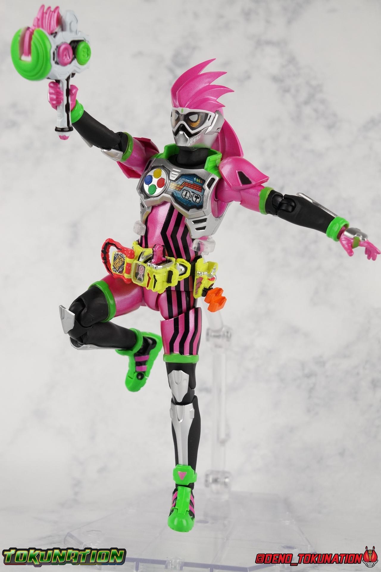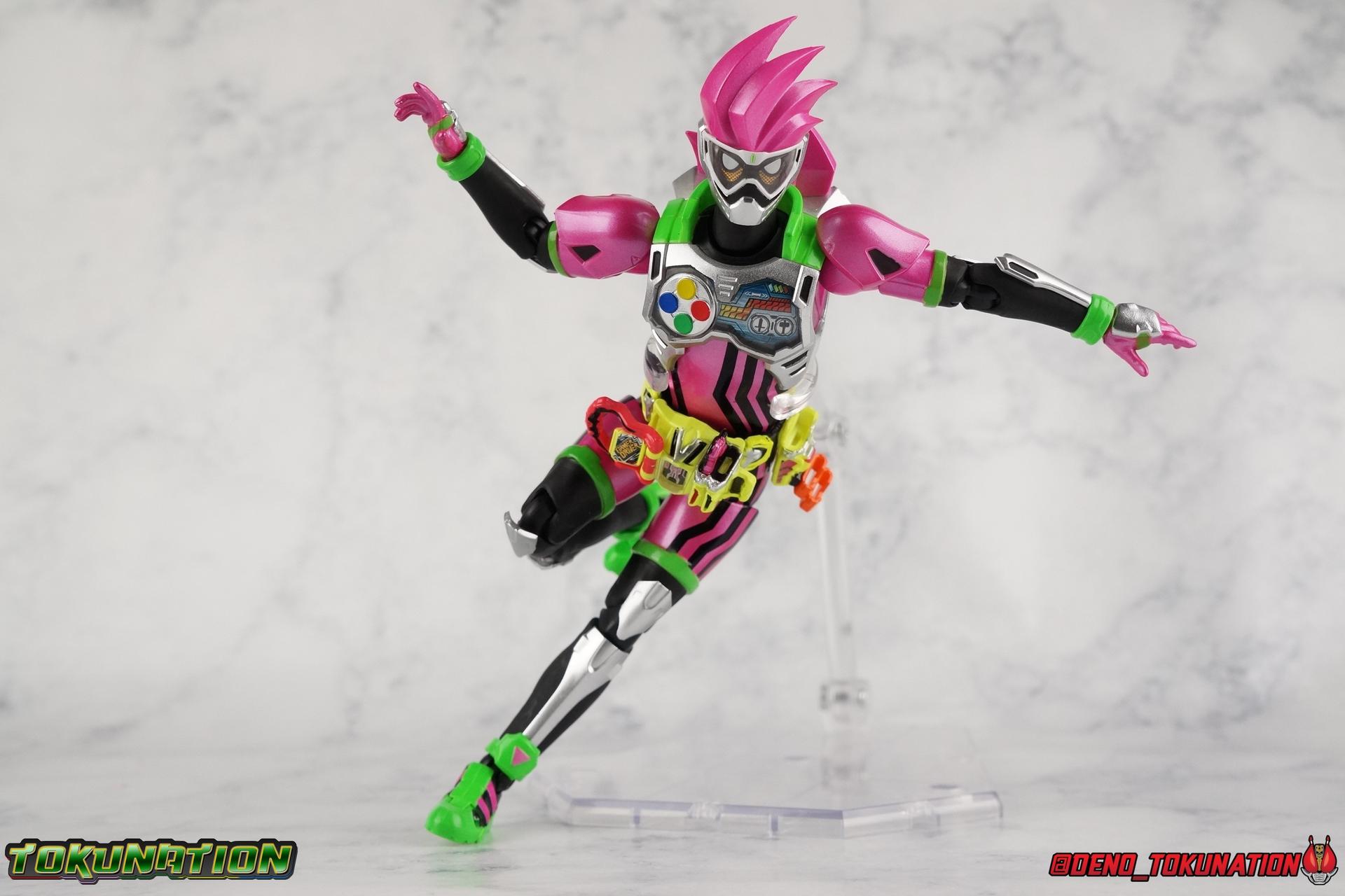 Each of the 3 figures in this set will be photographed separately. So that's 3 different galleries over the course of the week. This gallery is part 1 of 3, so for now we're going to take a look at S.H. Figuarts Kamen Rider Ex-Aid Action Gamer Level 2! Packaging The Mighty Action X Beginning set is a rather large 3-pack. Something that's rarely tried with figuarts release. The last 3-pack in recent memory was the Hakaider Squad set, that was a web exclusive release, and it didn't sell well. So for Bandai to take a chance on 3 unique riders from Ex-Aid, and release them at retail, that was pretty surprising. The box is a rather colorful 3-tone type that really pops, definitely befitting of the series it's from. Honestly the figures in box would make for a nice display piece if you'd like to pick up the individual figures to open too. It just looks good. The 3 riders come in one large tray with their hands, while the Mighty Action X stage as well as their unique weapons are in a separate tray below. Main Figure Ex-Aid Action Gamer Level 2 is our first experience with the new mold introduced for this line. I'm a little behind in my review so I was only just recently able to crack this bad boy open to give him a go. I must say that I am very impressed. Mainline rider releases have just gotten so good over the years. Now Ex-Aid joins the ranks of Gaim & Drive for fantastic inaugural releases. Find out why below. Obviously this figure is quite a bit more detailed and complex than we commonly see each year. There are a ton of paint apps, and a ton of small molded details. This figure is just lavishly executed. From the Ground up the new Ex-Aid type body is pretty solidly built. Though I do have a nit pick right at the ground floor, the ankles. They don't have the full range of motion they need for Ex-Aid to assume many of the dynamic poses he's known for. You'll find that wide stances are just really really difficult to achieve, which means he's always gonna be a bit off balance. The knees have a great bend that helps add to Mighty Action X's sort of athletic platformer theme. And all that being said, the paint apps for the legs are exquisite. including the black lines on the hips. One of the more elaborate pieces on the figure is the Gamer Driver itself. This entire device is extraordinarily detailed for something at this scale. the Driver handle can flip shut, thus hiding the rider read out on the front screen as well. The right of the driver has 2 slots for Gasshats. One is already attached in the form of the Mighty Action X Gasshat. It's kind of a dummy item though as it's really just the handle portion that pegs in. To the right of the driver, is a Gashat holster. There are 2 slots for extra Gasshats as well as 1 slot for a Critical Finish to be inserted. This whole assembly just looks fantastic. I'm taken back to Gaim Orange Arms and the wonderful design of his Sengoku Driver. I won't sell the rest of the upper body short either. Ex-Aid is gorgeous already but his chest detailing is magnificent. The paint apps on the outer layer are crisp and clear, but I'm so impressed by the Rider Gauge label within his chest. Unlike previous failures Bandai has had with labels (I'm looking at you Kiwami Arms) this is flawless. On the flip side of the torso is the deactivated Level 1 head. It's a bit stylized and shrunk down, but that's as it should be if TV CG magic could really work in toy form. Not to be forgotten are the arms, which admittedly only have one flaw that I'm truly bothered by, and that's the shoulder pads. Not because they impact the articulation, but because they pop off easily when fully extending the arms. I have the same problem with my Brave actually as well. But it's a minor issue. The wrists are solid, the elbows fully functional and the bicep swivel welcome as always. Finally that brings us to the head. I know plenty of people weren't a fan of this head when the original stock photos and prototype images began to circulate. Many people take issue with the angle and placement of Ex-Aids' eyes. I actually think it looks pretty spot on. My big issue is the inconsistent white paint apps on the visor, you can see a decent amount of overspray up close, admittedly that bugs me more than it would most people. But it's there. Otherwise I think the shape of the head is generally great, and the hair looks very solid. I'm just really really pleased with how this initial release in the line has turned out. It's a great new body mold with a ton of personality and some seriously striking colors. Accessories Ex-aid is included in a pretty massive 3-pack, but the accessories aren't actually all that heavy: 3 - sets of additional hands. 1 set for holding the Gashacon Breaker. 1 open palm posing set. 1 flat "karate chop" type of set. 1 - Gashacon Breaker handle. Just plug it into either of the other included modules to form a full weapon. 1 - Gashacon Breaker Hammer Mode. While traditionally more associated with Ex-Aid Level 1, the Hammer Mode has been seen with Level 2 plenty of times too. Just plug the handle into the bottom and it's ready to go. I would have preferred to see a fully transformable breaker with a swap out longer edge for the blade mode. But what Bandai has opted for here will do just fine. 1 - Gashacon Breaker Blade Mode. Just plug the handle into the bottom and it's ready to go. Again, I would have preferred to see a fully transformable breaker with a swap out for the blade instead. But it looks just fine as a standard weapon for level 2. As with Brave & Snipe, there are no individual Gasshats included other than the dummy ones already attached to the Gamer Drivers. I think this is easily the biggest omission with any of these releases. Much like last year when Eyecons were few and far between with Ghost releases, Ex-Aid appears to be missing the boat with Gasshats. Final Thoughts As the first release from Ex-Aids' now fledgling figuarts line-up, I am very very satisfied! Someti