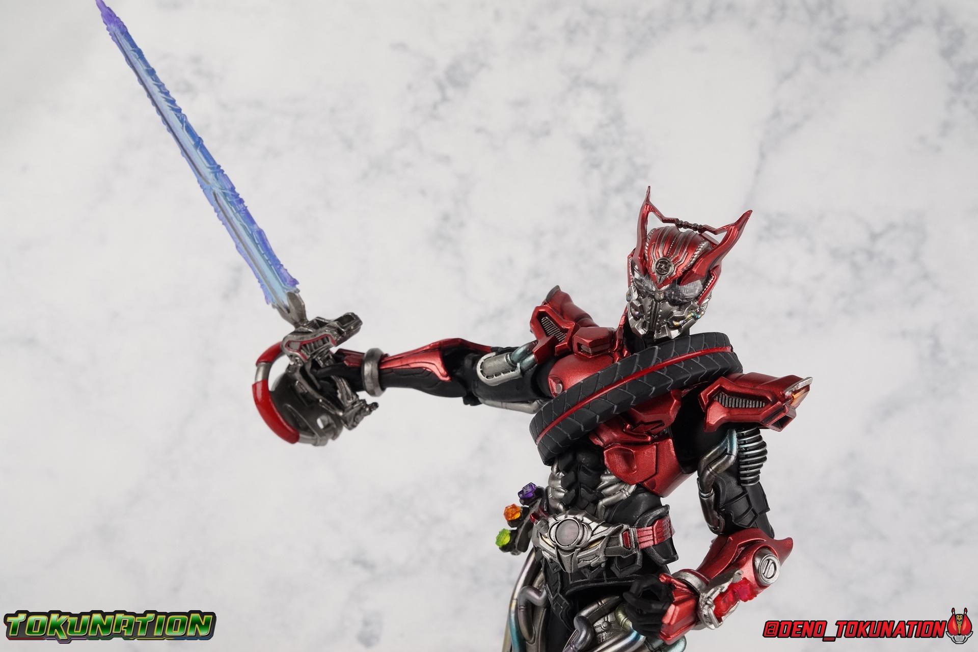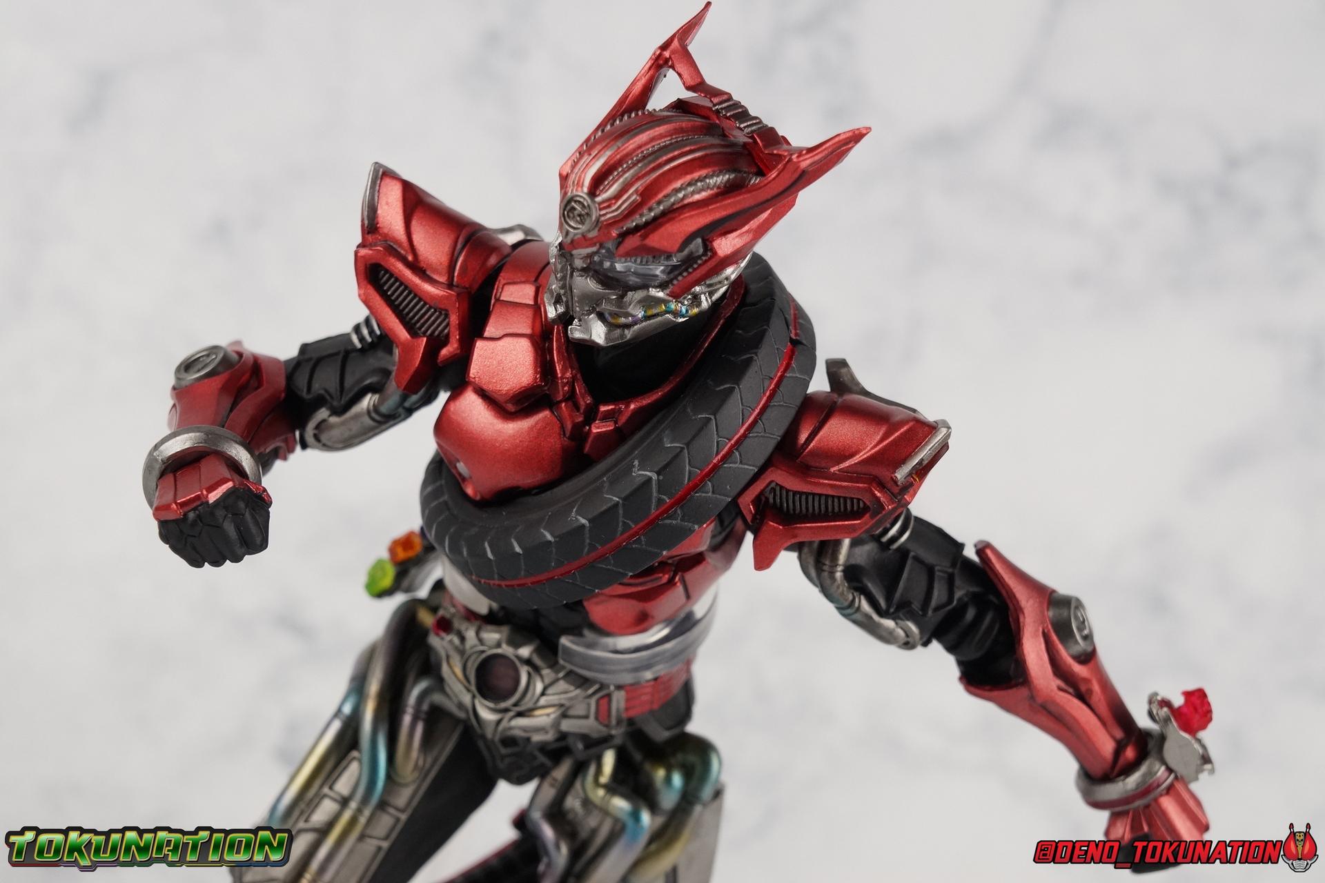 Normally I tend to limit myself to one scale of collecting for a particular show. I stick to 1/12 stuff, most often S.H. Figuarts. or gimmick and vintage figures around that scale. But every once in a while a show or figure grabs me enough that I do want to own it in a different size or line. Today's example of my weakness is brought to you by Kamen Rider Drive! I've never been huge into collecting S.I.C. figures, but S.I.C. Kamen Rider Drive Type Speed may finally be changing my tastes a little. Check out a full gallery & review below! Packaging As with most all modern S.I.C.'s, Drive Type Speed comes in a really elaborate and detailed window style box. The front actually looks like a stylized version of his helmet which I really dig. Obviously S.I.C.'s are fairly large, clocking in around 8", so this box is quite a bit bigger than an average figuart. And there are some fantastic stock photos on the exterior. They don't quite do this figure justice. Also the cardboard insert for the box is a fantastic reflective chrome with Drive's "R" emblem on it. It works great as a photo backdrop! Main Figure One thing I'll always give the S.I.C. toyline, details are key. And that's almost entirely thanks to the amazing man behind the line, Takeyuki Takeya. A brilliant artist with a mind for elaborate details and the meshing of organic and technological detailing. This release is doubly impressive because Takeya himself designed all the Roidmudes for Kamen Rider Drive. It was the first Kamen Rider Series to feature villains to be entirely designed by him. Though the riders themselves were not. S.I.C. Drive however, as with practically every other S.I.C. figure, was. This is Takeya taking a crack at Drive with his own unique style of detail and flourish. And it has been wonderfully executed. Though there are some minor caveats. The way the ball joints operate in the feet really irks me. They're on hinges but the ball also rotates 360, so it's very easy to get them off center, then Drive's feet won't sit flat at the same angle. The double jointed knees are astounding though. The entire calve can rest on the back of the thigh. That's just crazy. The hips can actually rotate out much further than I would have assumed too, those pipes on the thighs don't get in the way too much for outward movement, but they aren't exactly perfect either. They do pop off easily due to their design. And actually the hips can pull down a decent amount out of the waist so forward and back movement is remarkably good. This Drive can sit properly as though there were a Tridoron scaled to him. However he cant really get down on one knee to kneel, which is sort of my benchmark for figure posability. The upper body really only has one big thing that bugs me. And that's how loosely the Drive Driver sits on the belt itself. It's quite easy to pop off, the belt is pretty loose around the waist already, which normally I like because it frees up movement. But in this case it makes it easier to knock the driver off, that coupled with the soft plastic of the belt is obviously a great recipe for losing small parts. The lower torso also moves quite freely and is made of a soft plastic, though sometimes you can see straight through a hole in the waist because of the way it moves. The upper torso has some of the best asymmetrical detailing I've ever seen, I really love it. Taking Drive's tire sash to a new level. The way the ridges on the lower right & upper left corner of the chest compliment each other is gorgeous. And I love the added detail of a neck collar around the right side of Drive's head. It really drives (pun!) home the 'bisected by a tire idea' of his design. It's as though he was a totally normal rider then this thing just smashed it's way into the design and the suit just accommodated. This is why I love Takeya's work. The arms have some pretty standard movement, which is to say the shoulder pads keep them from doing much and the elbows can do about a 90 degree angle. The wrists don't have a ton of clearance because of how they sit flush with the wrist pads but you can get some use out of them. And lastly the head. Wow that just gorgeous brilliant detailed head. This take on the design easily looks like it could have fit in with the Roidmudes of the series. It's heroic, but it looks so, sinister? I love it. And it actually has plenty of room to move. Bravo on this design. This figure just rocks it at every level. It's just a gorgeous re-design of a suit that I already loved immensely. S.I.C. Kamen Rider Drive Type Speed gets the best of both worlds in it's first outing with this line. Hopefully S.I.C. Mashin Chaser & Heart can live up to this standard as well! Accessories As with most S.I.C.'s Drive is loaded up! 1 - Handle Sword. This version of the handle sword is quite the detailed departure from the figuart. As with everything else about this figure it takes the car aesthetic to the extreme. I love it. It can accept Shift Cars in a similar fashion to the S.H. Figuarts release. 1 - Door Gun. While the Door Gun may not look as radically different as the normal version it's still a great looking weapon that compliments Drive's new deep details very well. It can accept Shift Cars in a similar fashion to the S.H. Figuarts release and has an opening door as well. 1 - Max Flare Tire. This giant hunk of plastic can replace the standard Type Speed tire in much the same way as the figuart. It comes apart in sections to snap over the chest. In the case of this one the flame effects are molded onto the tire so they aren't removable. They are also totally awesome. 1 - Max Flare belt read out. This replaces Mr. Belt's standard face. It works basically just like the SHF, take the driver off and replace the plate. 3 - sets of hands. 1 open pair, 1 set for holding the gun, 1 set for holding the sword. I am a bit disappointed that he doesn't have a pair of relaxed open hands, but oh well. 6 - Shift Cars. That's 1 each of Midnight Shadow, 