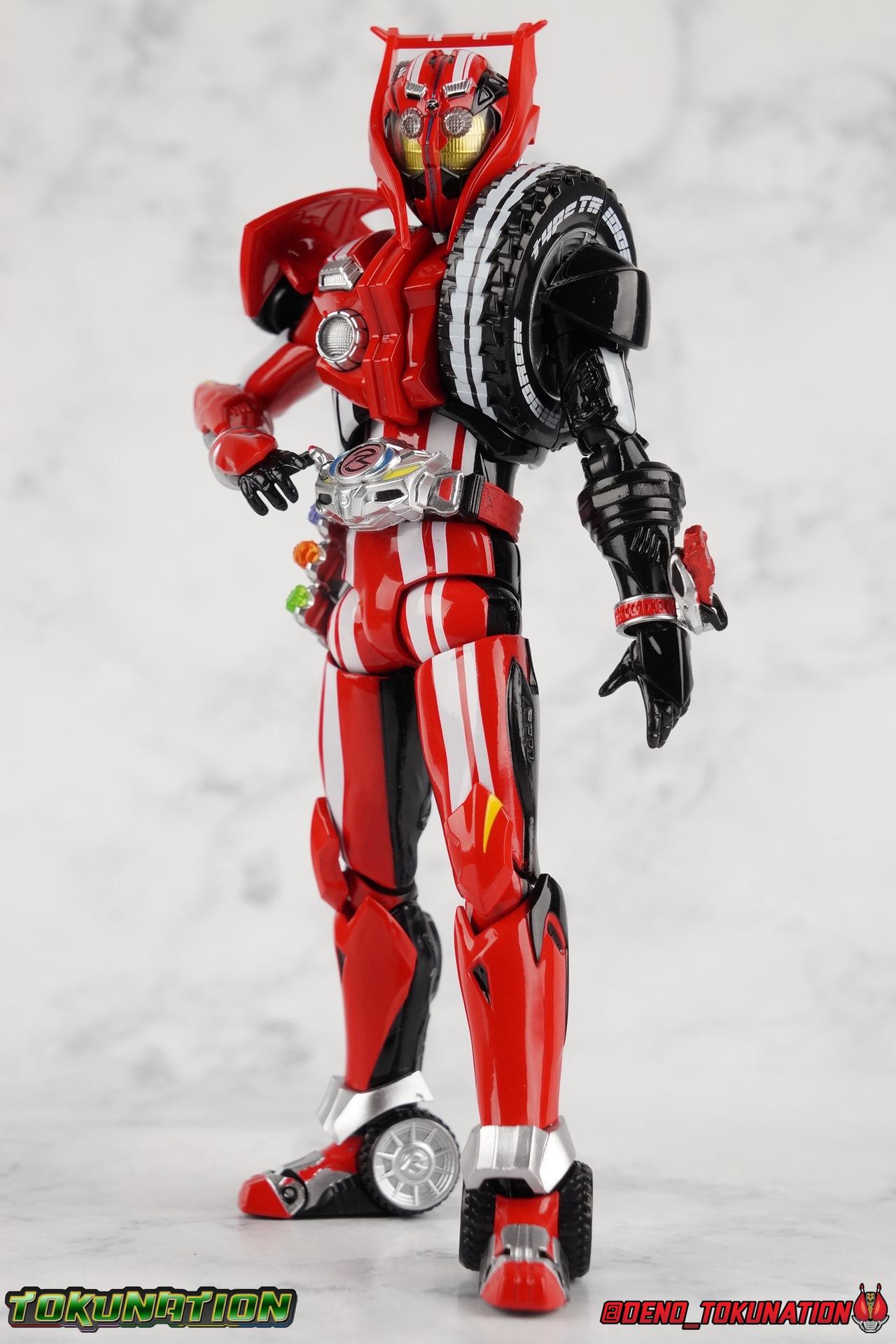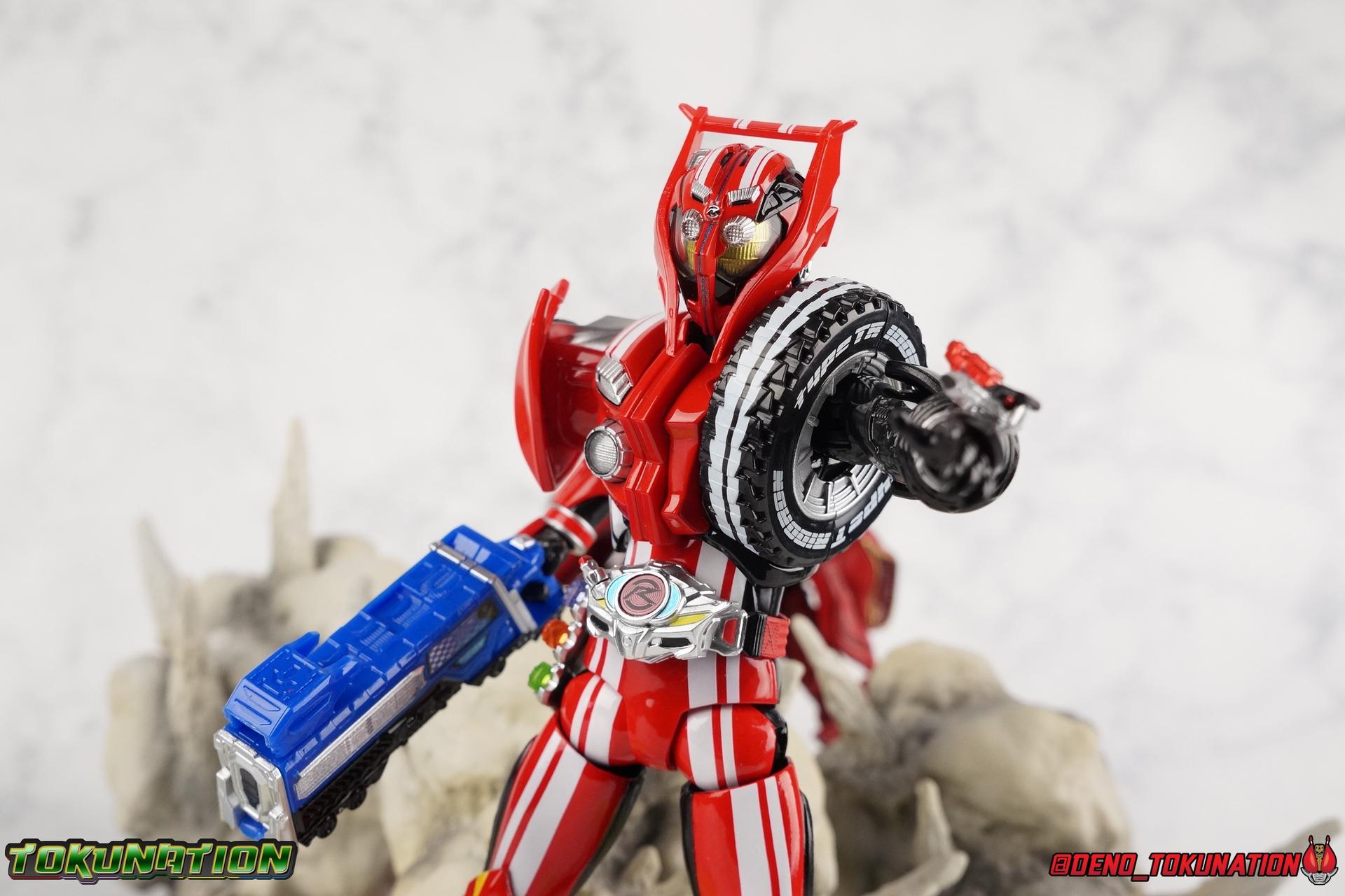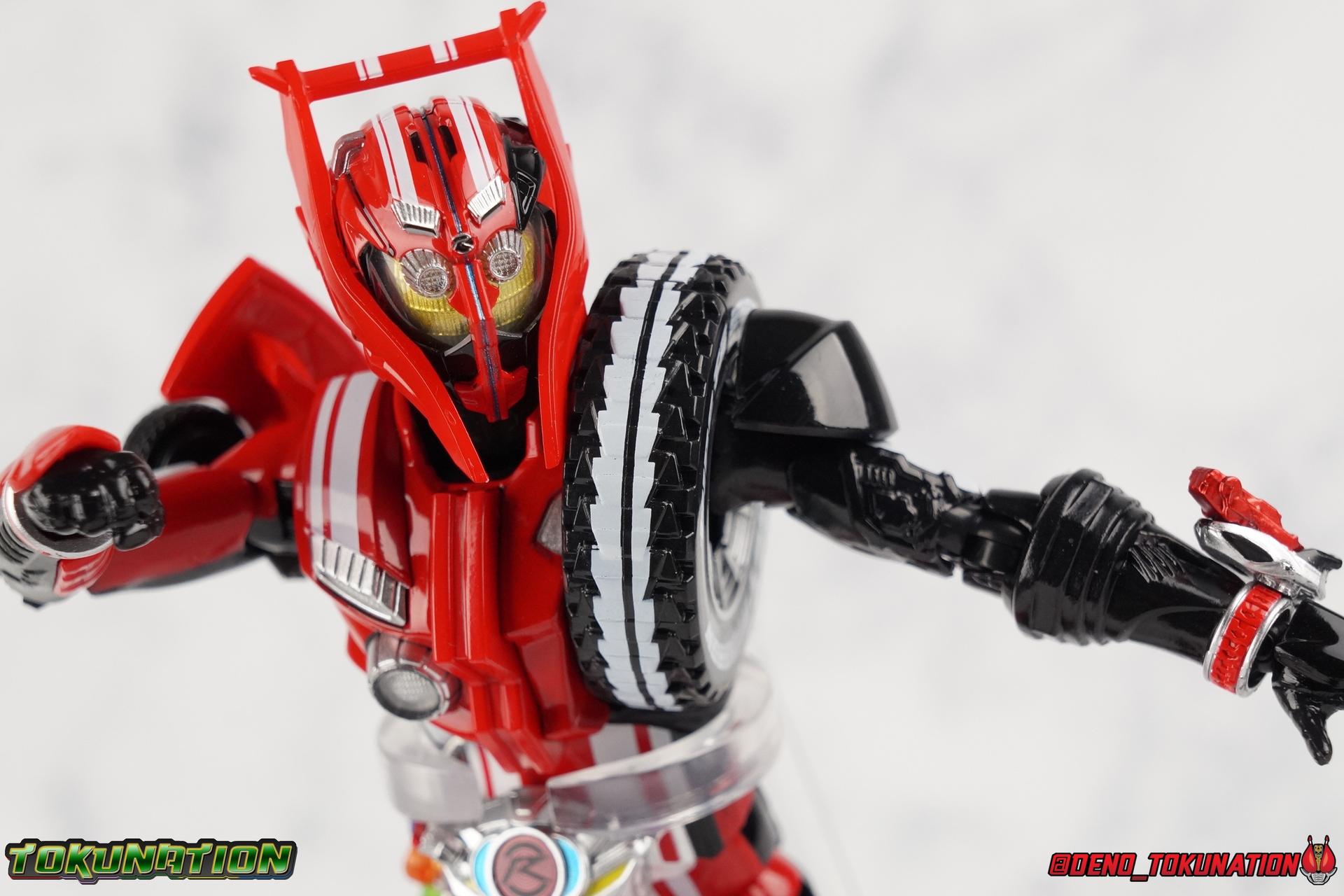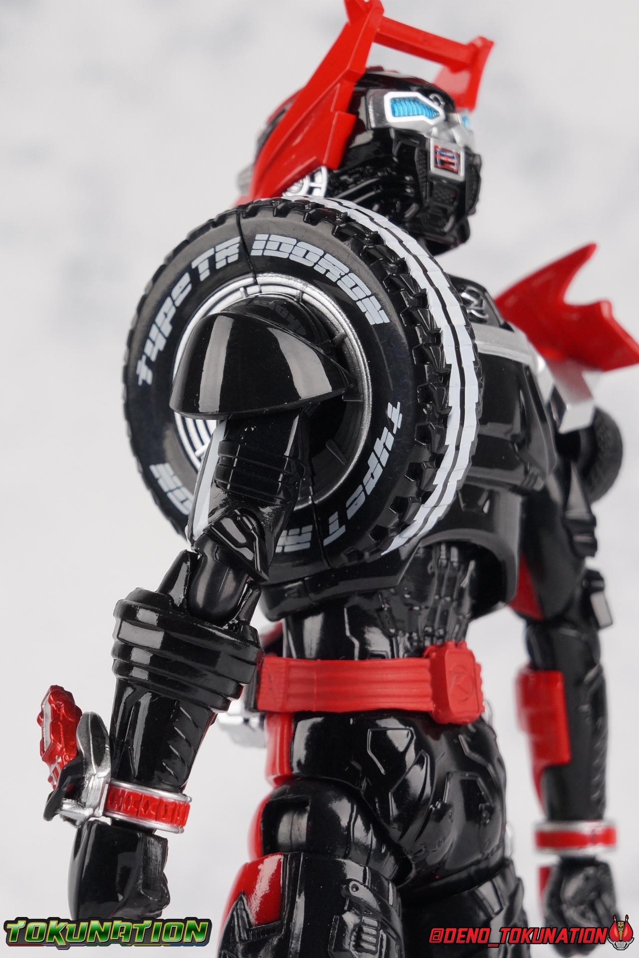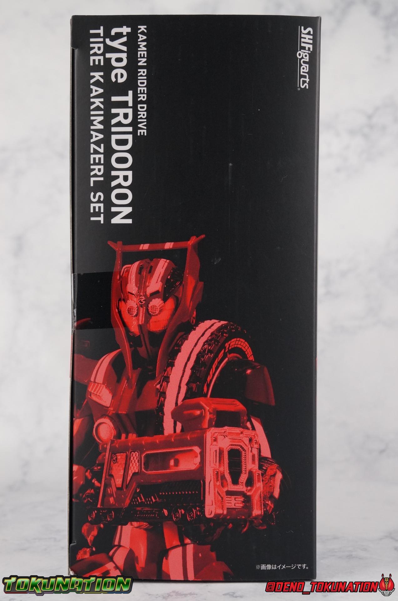 It's been a long time coming but we're proud to finally present a gallery of Kamen Rider Drive's final form with S.H. Figuarts Kamen Rider Drive Type Tridoron (Tire Blending Set)! Unlike many Heisei riders, Drive has yet to gain a new form that appears in a film after the end of his series, that also seems to exceed the power of his original final form. Den-O went from Liner to Super Climax, Fourze went from Cosmic to either of the two Fusion States, Wizard went from Infinity to Infinity All Dragon, etc. Plenty of riders have gotten yet another form that seems to exceed the power of their series' final form. Drive has only received one additional form of his own since the end of the TV series proper, and that was Kamen Rider Zero Drive, which is actually a precursor to even the most basic Drive form, Proto-Drive. So it's refreshing to see that the hulking power-house of Type Tridoron has yet to be outclassed! Let's dive into the figure below! **This gallery contains over 100 images! So it's split across 3 posts. Feel free to peruse them at your leisure. Packaging Type Tridoron continues the steadfast tradition of Drive packaging we've come to know and love over the last 2+ years. Those slick black boxes with a subtle racing theme and killer stock photos. Tridoron's box is a bit thicker in this case because it's specifically the Tire Blending (Tire Kakimazerl) release. So it includes several blended tires for accessories, making the trays a bit thicker. Main Figure It's pretty satisfying to finally have this bad boy in hand. Drive has shaped up to have one of my favorite toylines to date so I'm especially pleased we've finally made it to his final form. Drive Type Tridoron finally rounds out the slew of TV series forms for our heroes. We're left now with only a handful of releases to wait for. But as as is I'm pretty pleased with what we've gotten in Tridoron. Despite what appear to be cumbersome thick feet, the tire ankles actually serve their purpose very well. They balance this figure magnificently, and they still rock side to side a decent amount. Though wide angle stances aren't going to work as well as you'd probably like, the feet won't quite lay flat. The legs are the standard we've seen from this line so far, but the knee pads irk me to no end since they constantly pop off. The Drive Driver & Shift Car holster are identical to previous uses of those molds. The only difference with the driver is the new Type Tridoron read out. It still works just like any other release of the driver in that the face can be replaced. Sadly the arms disappoint me. They're asymmetrical both in design and functionality. They look great, but the left arm can only just manage a 90 degree angle. The second bend in the arm is neutered by the shift tire peg style molding on the forearm. The right arm fares a bit better, but not by much. The arms just aren't super dynamic. Luckily the shoulders are great, even though the Tire has been placed much further over for this outing the left arm doesn't suffer from that. The right is also free of obstruction thanks to the hinge that the fender/bumper part is on. The new chest detailing to replicate Tridoron's front bumper looks fantastic, It's a nice scale representation of what the Tridoron itself looks like. And of course there's that magnificent head. I know a lot of people didn't care for the elongated design itself, but I absolutely adore it. And those gorgeous compound eyes as well. But I think the one bit of detailing I might love most about this figure is the back side of it. It's designed to resemble the undercarriage of the Tridoron itself and it looks incredible. Right down to the small license plate type application on the back of Drive's head. All in all this is a fantastic mold. And I'm glad to see it's getting some mild reuse with the Heart Type Miracle release. I'd love to see another repaint of this mold out down the line but they'll need to make up a new V-cinema form for me to get something that awesome. Drive Type Tridoron is yet another fantastic figure in this great line. Accessories Since this is the more deluxe styled Tire Blending set, Type Tridoron comes with a number of accessories. Everything you could have hoped for: 5 - sets of additional hands. Each set has one red right hand and one black left hand. I love that the asymmetry of this suit carries all the way down to such a minute detail like the hands. You get basically everything you need with this kind of selection as well. 1 - Alternate Krim Head. This extra head represents Krim's control of this form, which was only really demonstrated in show a few times. Primarily we saw it in Drive's final clash with the Freeze Roidmude. The only difference with this head is the bright red compound eyes. It's an extra accessory that totally didn't have to be includde but that I'm very grateful to have as an option. 1 - Trailer Cannon. A straight repack of the accessory included with Type Formula."] It operates exactly the same as before and can accept Shift Cars. 1 - Shift Speed. An extra of this shift car to be used with the included Trailer Cannon, it can be slotted into the cannon just as you could with Type Formula. 1 - Shift Tridoron. An extra of this shift car to be used with the included Trailer Cannon, it can be slotted into the cannon just as you could with Type Formula. 1 - Attack 1 2 3 Tire. A blend of the Midnight Shadow, Max Flare, & Funky Spike Tires. As with any tire that's compatible with Type Tridoron, you just need to split it apart to attach it to his chest/shoulder. 1 - People Saver Tire. A blend of the Mad Doctor, Fire Braver & Justice Hunter Tires. As with any tire that's compatible with Type Tridoron, you just need to split it apart to attach it to his chest/shoulder. 1 - Construction Site (Kouji Genbar) Tire. A blend of the Rumble Dump, Spin Mixer, & Rolling Gravity Tires. As with any tire that's compatible with Type Tridoron, you just need to split it apart to attach it