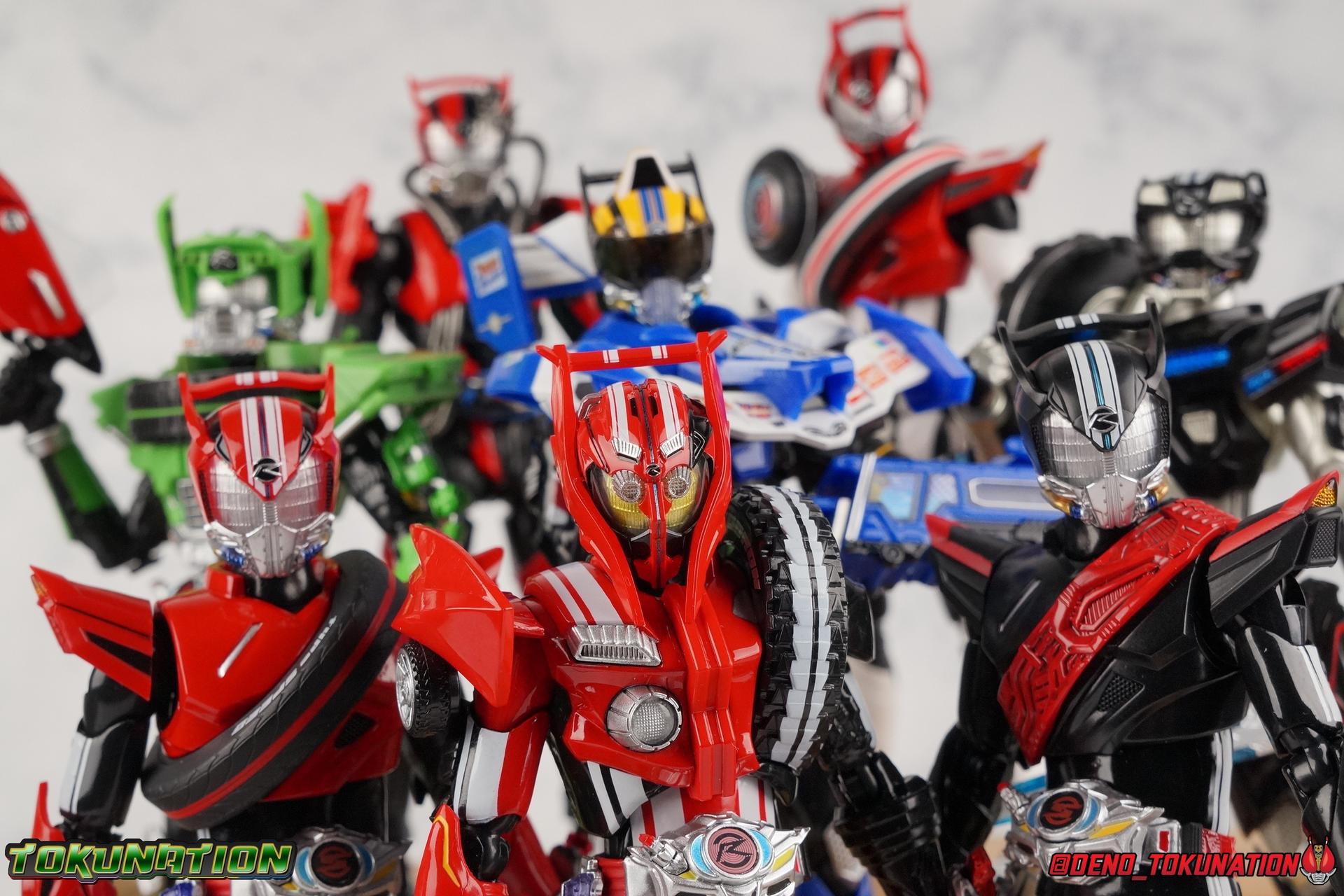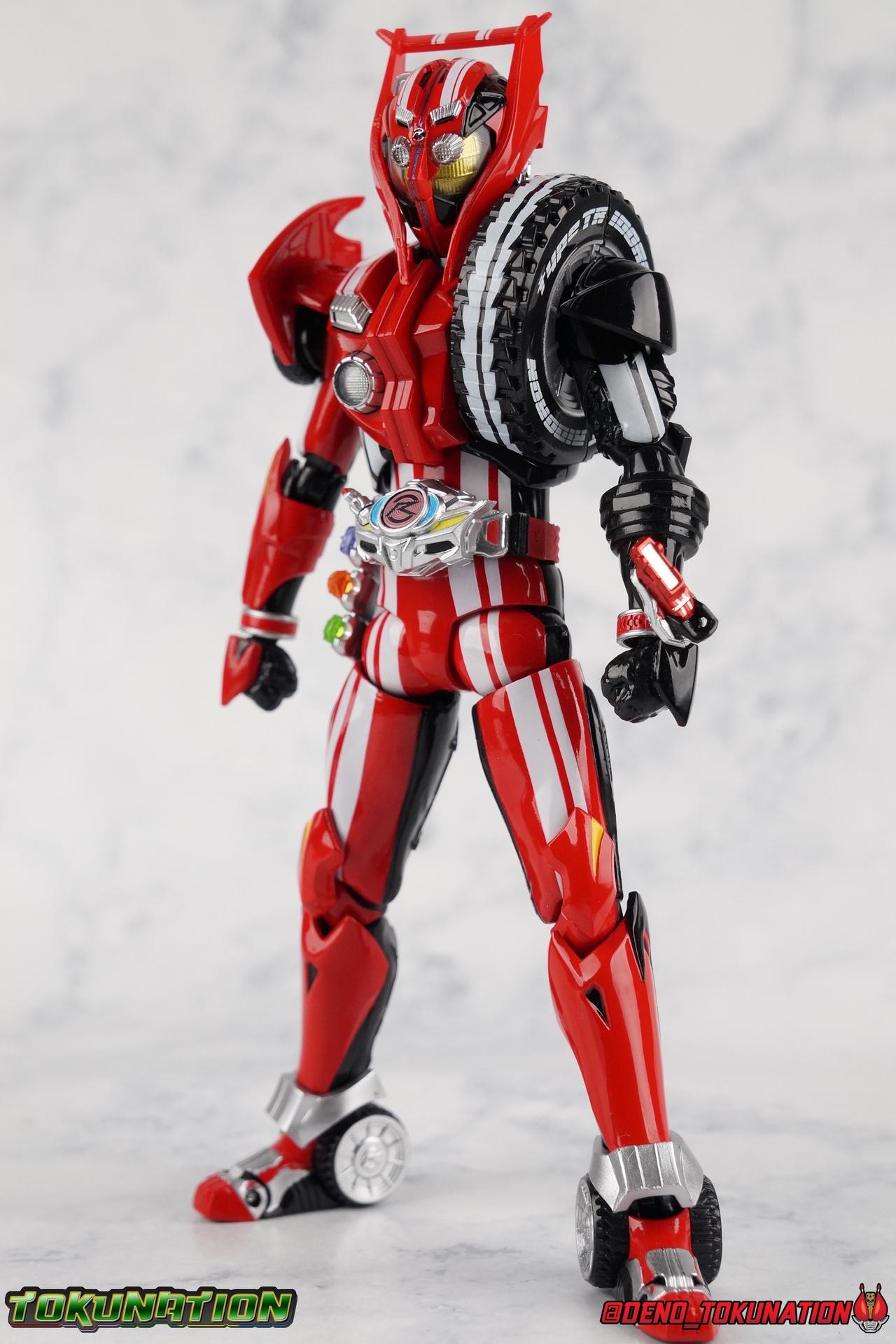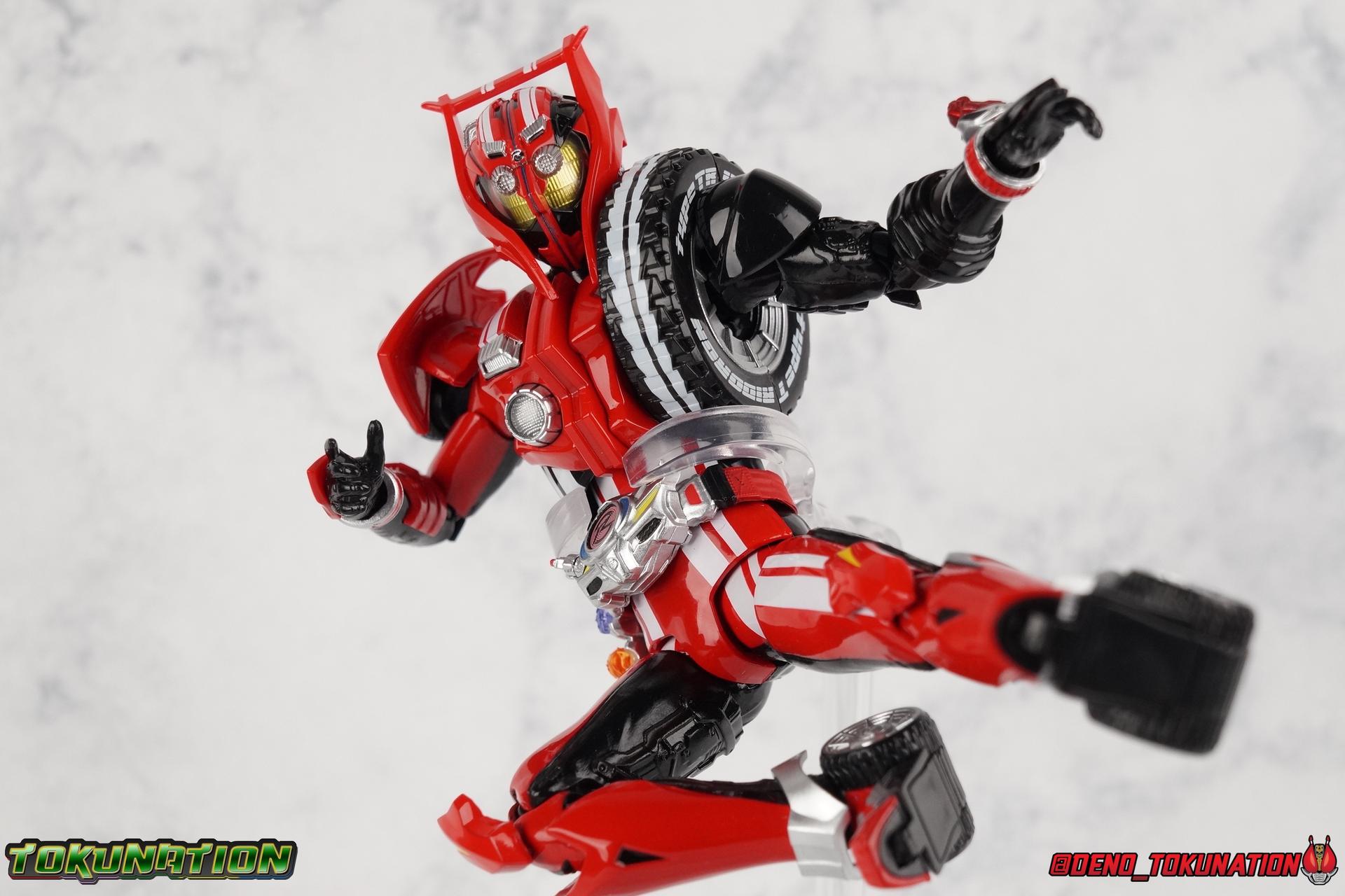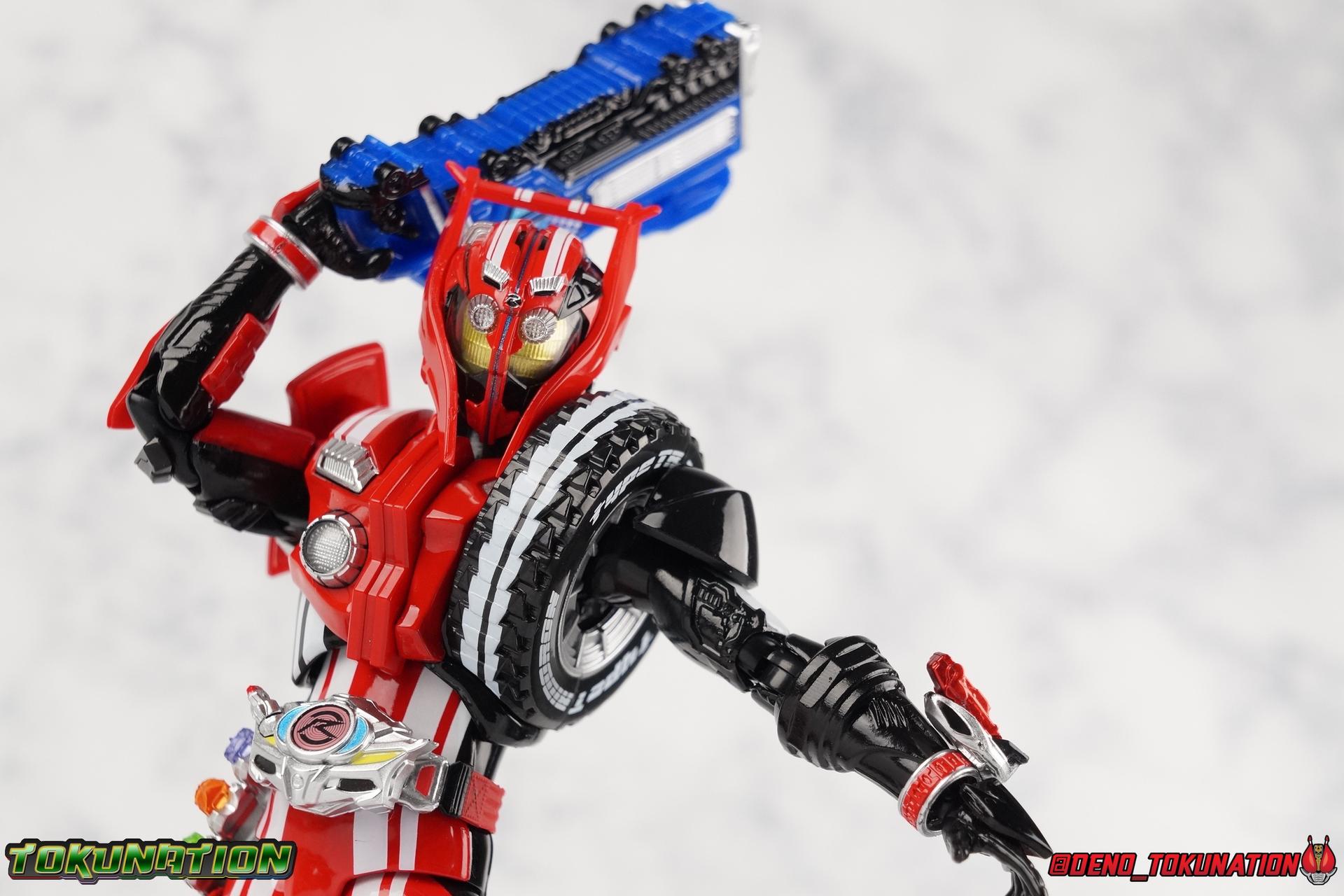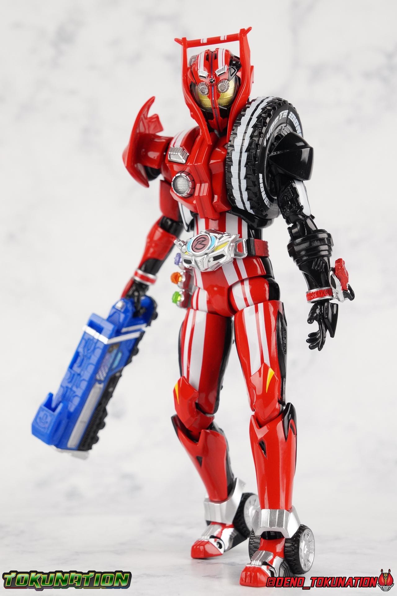 It's been a long time coming but we're proud to finally present a gallery of Kamen Rider Drive's final form with S.H. Figuarts Kamen Rider Drive Type Tridoron (Tire Blending Set)! Unlike many Heisei riders, Drive has yet to gain a new form that appears in a film after the end of his series, that also seems to exceed the power of his original final form. Den-O went from Liner to Super Climax, Fourze went from Cosmic to either of the two Fusion States, Wizard went from Infinity to Infinity All Dragon, etc. Plenty of riders have gotten yet another form that seems to exceed the power of their series' final form. Drive has only received one additional form of his own since the end of the TV series proper, and that was Kamen Rider Zero Drive, which is actually a precursor to even the most basic Drive form, Proto-Drive. So it's refreshing to see that the hulking power-house of Type Tridoron has yet to be outclassed! Let's dive into the figure below! **This gallery contains over 100 images! So it's split across 3 posts. Feel free to peruse them at your leisure. Packaging Type Tridoron continues the steadfast tradition of Drive packaging we've come to know and love over the last 2+ years. Those slick black boxes with a subtle racing theme and killer stock photos. Tridoron's box is a bit thicker in this case because it's specifically the Tire Blending (Tire Kakimazerl) release. So it includes several blended tires for accessories, making the trays a bit thicker. Main Figure It's pretty satisfying to finally have this bad boy in hand. Drive has shaped up to have one of my favorite toylines to date so I'm especially pleased we've finally made it to his final form. Drive Type Tridoron finally rounds out the slew of TV series forms for our heroes. We're left now with only a handful of releases to wait for. But as as is I'm pretty pleased with what we've gotten in Tridoron. Despite what appear to be cumbersome thick feet, the tire ankles actually serve their purpose very well. They balance this figure magnificently, and they still rock side to side a decent amount. Though wide angle stances aren't going to work as well as you'd probably like, the feet won't quite lay flat. The legs are the standard we've seen from this line so far, but the knee pads irk me to no end since they constantly pop off. The Drive Driver & Shift Car holster are identical to previous uses of those molds. The only difference with the driver is the new Type Tridoron read out. It still works just like any other release of the driver in that the face can be replaced. Sadly the arms disappoint me. They're asymmetrical both in design and functionality. They look great, but the left arm can only just manage a 90 degree angle. The second bend in the arm is neutered by the shift tire peg style molding on the forearm. The right arm fares a bit better, but not by much. The arms just aren't super dynamic. Luckily the shoulders are great, even though the Tire has been placed much further over for this outing the left arm doesn't suffer from that. The right is also free of obstruction thanks to the hinge that the fender/bumper part is on. The new chest detailing to replicate Tridoron's front bumper looks fantastic, It's a nice scale representation of what the Tridoron itself looks like. And of course there's that magnificent head. I know a lot of people didn't care for the elongated design itself, but I absolutely adore it. And those gorgeous compound eyes as well. But I think the one bit of detailing I might love most about this figure is the back side of it. It's designed to resemble the undercarriage of the Tridoron itself and it looks incredible. Right down to the small license plate type application on the back of Drive's head. All in all this is a fantastic mold. And I'm glad to see it's getting some mild reuse with the Heart Type Miracle release. I'd love to see another repaint of this mold out down the line but they'll need to make up a new V-cinema form for me to get something that awesome. Drive Type Tridoron is yet another fantastic figure in this great line. Accessories Since this is the more deluxe styled Tire Blending set, Type Tridoron comes with a number of accessories. Everything you could have hoped for: 5 - sets of additional hands. Each set has one red right hand and one black left hand. I love that the asymmetry of this suit carries all the way down to such a minute detail like the hands. You get basically everything you need with this kind of selection as well. 1 - Alternate Krim Head. This extra head represents Krim's control of this form, which was only really demonstrated in show a few times. Primarily we saw it in Drive's final clash with the Freeze Roidmude. The only difference with this head is the bright red compound eyes. It's an extra accessory that totally didn't have to be includde but that I'm very grateful to have as an option. 1 - Trailer Cannon. A straight repack of the accessory included with Type Formula."] It operates exactly the same as before and can accept Shift Cars. 1 - Shift Speed. An extra of this shift car to be used with the included Trailer Cannon, it can be slotted into the cannon just as you could with Type Formula. 1 - Shift Tridoron. An extra of this shift car to be used with the included Trailer Cannon, it can be slotted into the cannon just as you could with Type Formula. 1 - Attack 1 2 3 Tire. A blend of the Midnight Shadow, Max Flare, & Funky Spike Tires. As with any tire that's compatible with Type Tridoron, you just need to split it apart to attach it to his chest/shoulder. 1 - People Saver Tire. A blend of the Mad Doctor, Fire Braver & Justice Hunter Tires. As with any tire that's compatible with Type Tridoron, you just need to split it apart to attach it to his chest/shoulder. 1 - Construction Site (Kouji Genbar) Tire. A blend of the Rumble Dump, Spin Mixer, & Rolling Gravity Tires. As with any tire that's compatible with Type Tridoron, you just need to split it apart to attach it