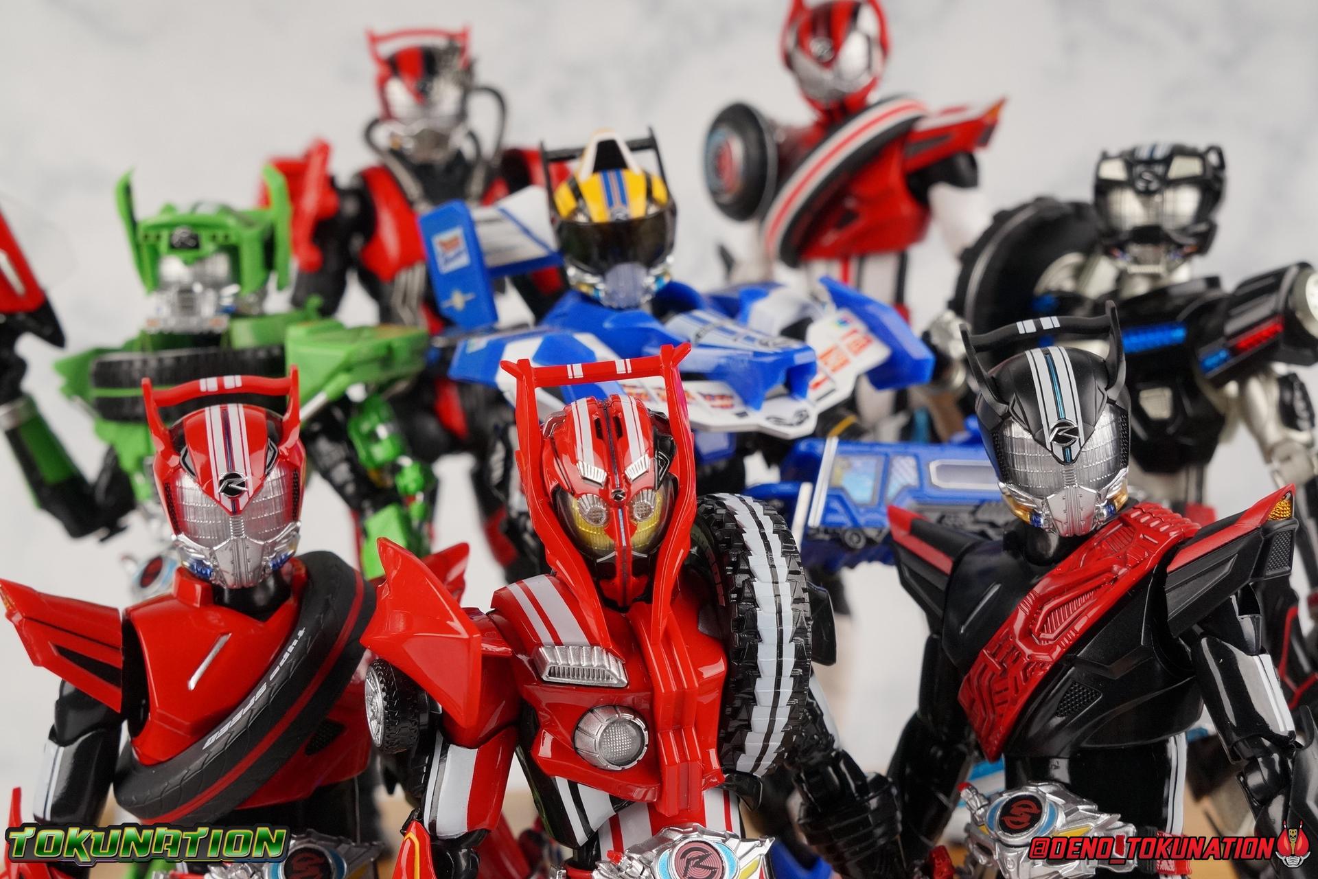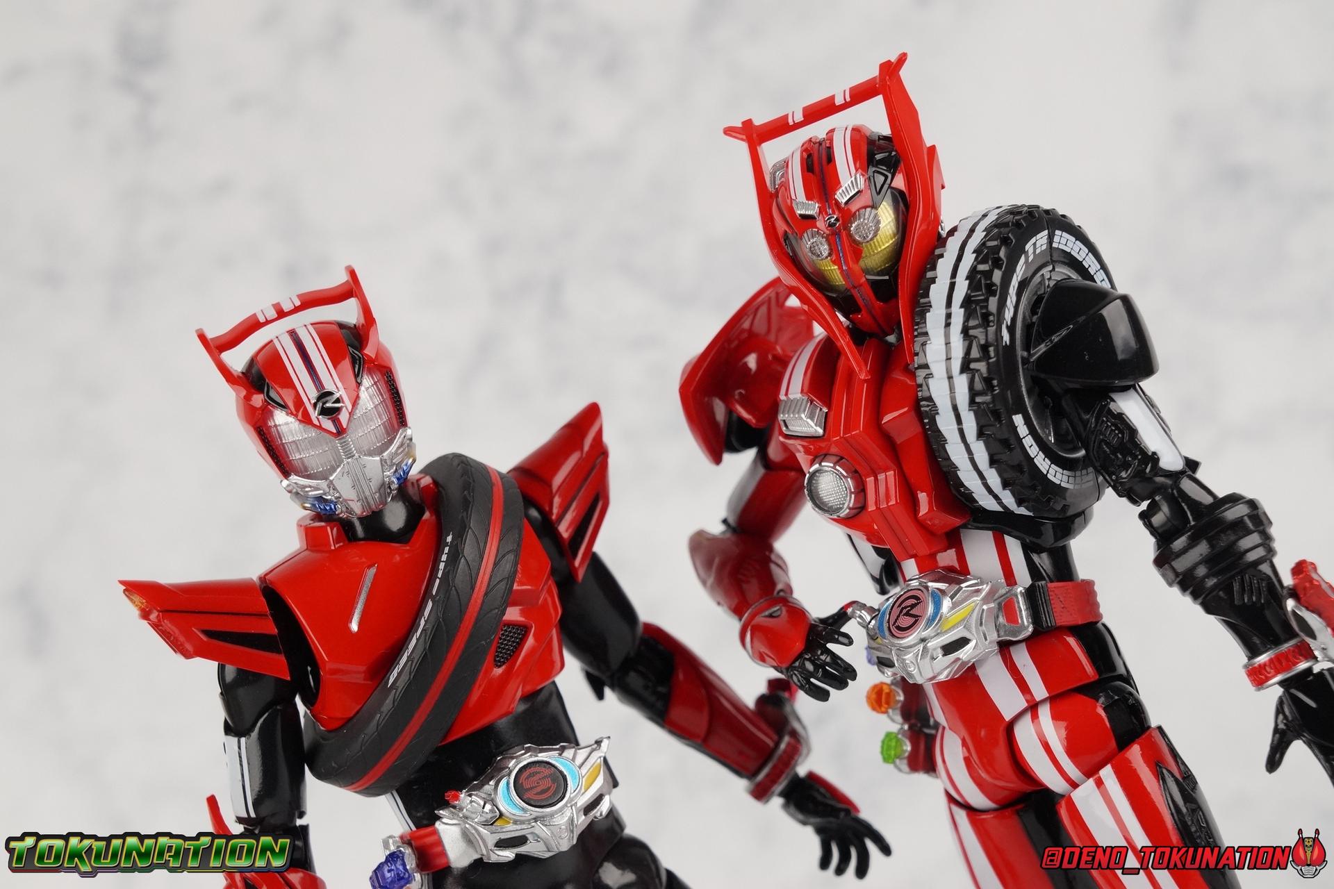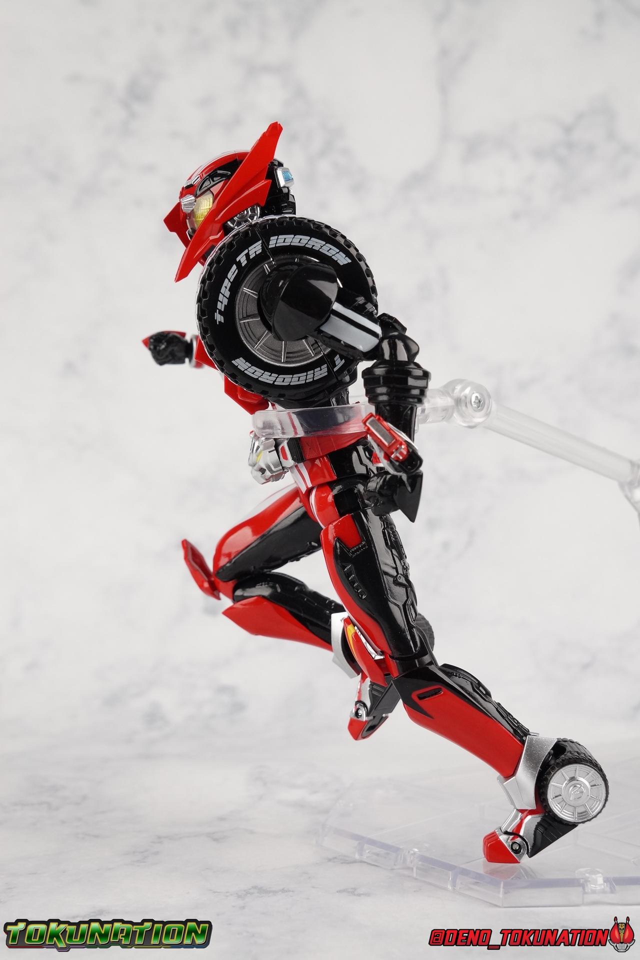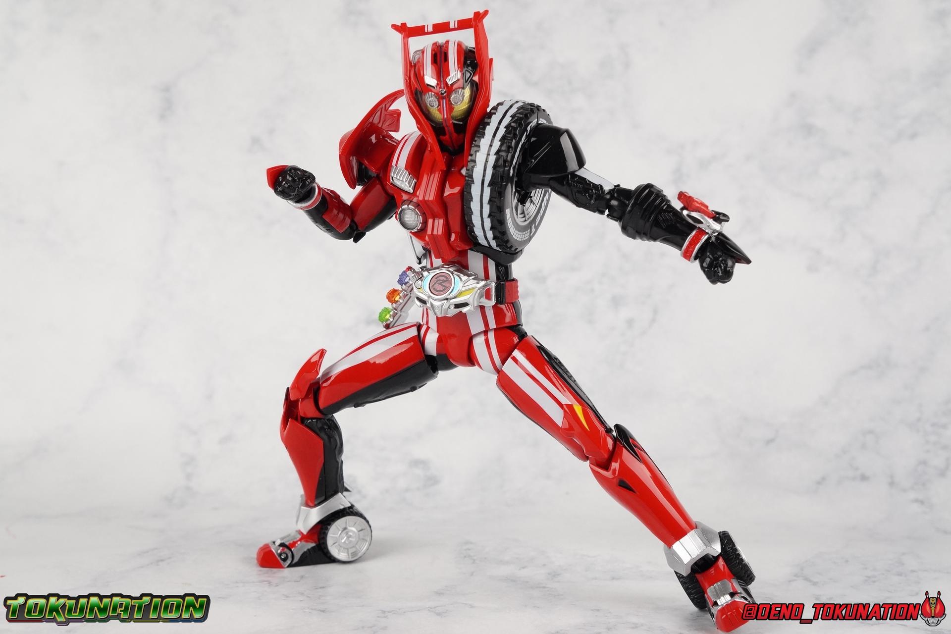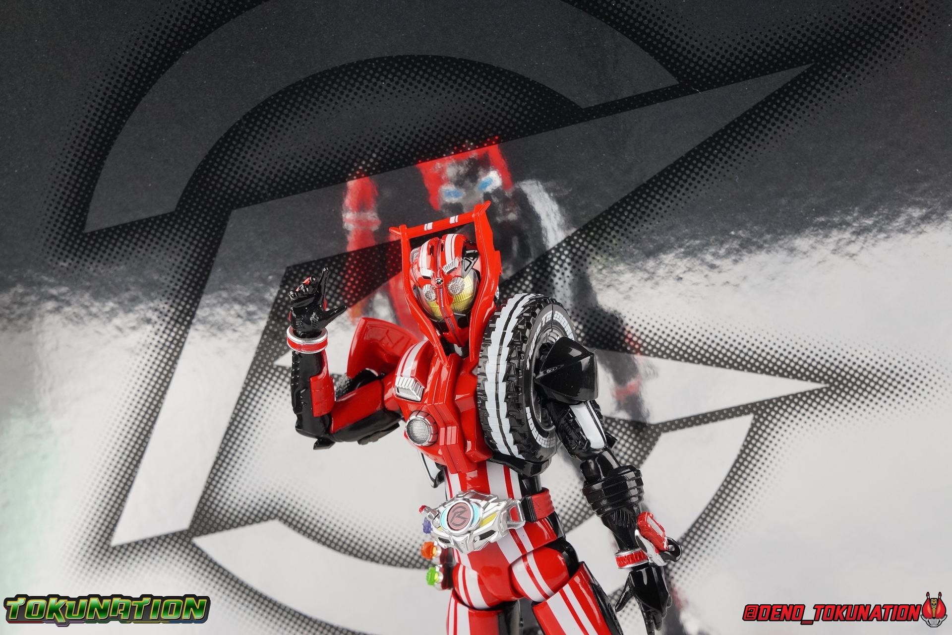 It's been a long time coming but we're proud to finally present a gallery of Kamen Rider Drive's final form with S.H. Figuarts Kamen Rider Drive Type Tridoron (Tire Blending Set)! Unlike many Heisei riders, Drive has yet to gain a new form that appears in a film after the end of his series, that also seems to exceed the power of his original final form. Den-O went from Liner to Super Climax, Fourze went from Cosmic to either of the two Fusion States, Wizard went from Infinity to Infinity All Dragon, etc. Plenty of riders have gotten yet another form that seems to exceed the power of their series' final form. Drive has only received one additional form of his own since the end of the TV series proper, and that was Kamen Rider Zero Drive, which is actually a precursor to even the most basic Drive form, Proto-Drive. So it's refreshing to see that the hulking power-house of Type Tridoron has yet to be outclassed! Let's dive into the figure below! **This gallery contains over 100 images! So it's split across 3 posts. Feel free to peruse them at your leisure. Packaging Type Tridoron continues the steadfast tradition of Drive packaging we've come to know and love over the last 2+ years. Those slick black boxes with a subtle racing theme and killer stock photos. Tridoron's box is a bit thicker in this case because it's specifically the Tire Blending (Tire Kakimazerl) release. So it includes several blended tires for accessories, making the trays a bit thicker. Main Figure It's pretty satisfying to finally have this bad boy in hand. Drive has shaped up to have one of my favorite toylines to date so I'm especially pleased we've finally made it to his final form. Drive Type Tridoron finally rounds out the slew of TV series forms for our heroes. We're left now with only a handful of releases to wait for. But as as is I'm pretty pleased with what we've gotten in Tridoron. Despite what appear to be cumbersome thick feet, the tire ankles actually serve their purpose very well. They balance this figure magnificently, and they still rock side to side a decent amount. Though wide angle stances aren't going to work as well as you'd probably like, the feet won't quite lay flat. The legs are the standard we've seen from this line so far, but the knee pads irk me to no end since they constantly pop off. The Drive Driver & Shift Car holster are identical to previous uses of those molds. The only difference with the driver is the new Type Tridoron read out. It still works just like any other release of the driver in that the face can be replaced. Sadly the arms disappoint me. They're asymmetrical both in design and functionality. They look great, but the left arm can only just manage a 90 degree angle. The second bend in the arm is neutered by the shift tire peg style molding on the forearm. The right arm fares a bit better, but not by much. The arms just aren't super dynamic. Luckily the shoulders are great, even though the Tire has been placed much further over for this outing the left arm doesn't suffer from that. The right is also free of obstruction thanks to the hinge that the fender/bumper part is on. The new chest detailing to replicate Tridoron's front bumper looks fantastic, It's a nice scale representation of what the Tridoron itself looks like. And of course there's that magnificent head. I know a lot of people didn't care for the elongated design itself, but I absolutely adore it. And those gorgeous compound eyes as well. But I think the one bit of detailing I might love most about this figure is the back side of it. It's designed to resemble the undercarriage of the Tridoron itself and it looks incredible. Right down to the small license plate type application on the back of Drive's head. All in all this is a fantastic mold. And I'm glad to see it's getting some mild reuse with the Heart Type Miracle release. I'd love to see another repaint of this mold out down the line but they'll need to make up a new V-cinema form for me to get something that awesome. Drive Type Tridoron is yet another fantastic figure in this great line. Accessories Since this is the more deluxe styled Tire Blending set, Type Tridoron comes with a number of accessories. Everything you could have hoped for: 5 - sets of additional hands. Each set has one red right hand and one black left hand. I love that the asymmetry of this suit carries all the way down to such a minute detail like the hands. You get basically everything you need with this kind of selection as well. 1 - Alternate Krim Head. This extra head represents Krim's control of this form, which was only really demonstrated in show a few times. Primarily we saw it in Drive's final clash with the Freeze Roidmude. The only difference with this head is the bright red compound eyes. It's an extra accessory that totally didn't have to be includde but that I'm very grateful to have as an option. 1 - Trailer Cannon. A straight repack of the accessory included with Type Formula."] It operates exactly the same as before and can accept Shift Cars. 1 - Shift Speed. An extra of this shift car to be used with the included Trailer Cannon, it can be slotted into the cannon just as you could with Type Formula. 1 - Shift Tridoron. An extra of this shift car to be used with the included Trailer Cannon, it can be slotted into the cannon just as you could with Type Formula. 1 - Attack 1 2 3 Tire. A blend of the Midnight Shadow, Max Flare, & Funky Spike Tires. As with any tire that's compatible with Type Tridoron, you just need to split it apart to attach it to his chest/shoulder. 1 - People Saver Tire. A blend of the Mad Doctor, Fire Braver & Justice Hunter Tires. As with any tire that's compatible with Type Tridoron, you just need to split it apart to attach it to his chest/shoulder. 1 - Construction Site (Kouji Genbar) Tire. A blend of the Rumble Dump, Spin Mixer, & Rolling Gravity Tires. As with any tire that's compatible with Type Tridoron, you just need to split it apart to attach it