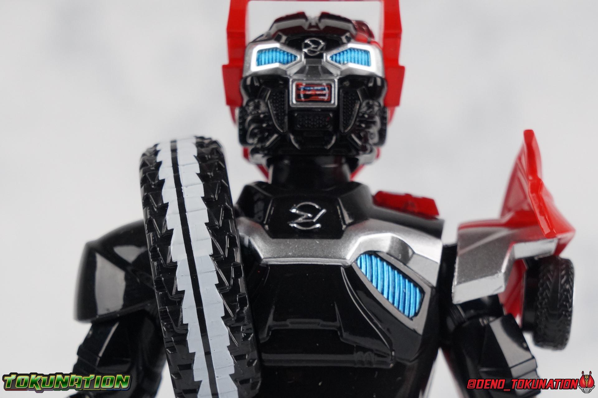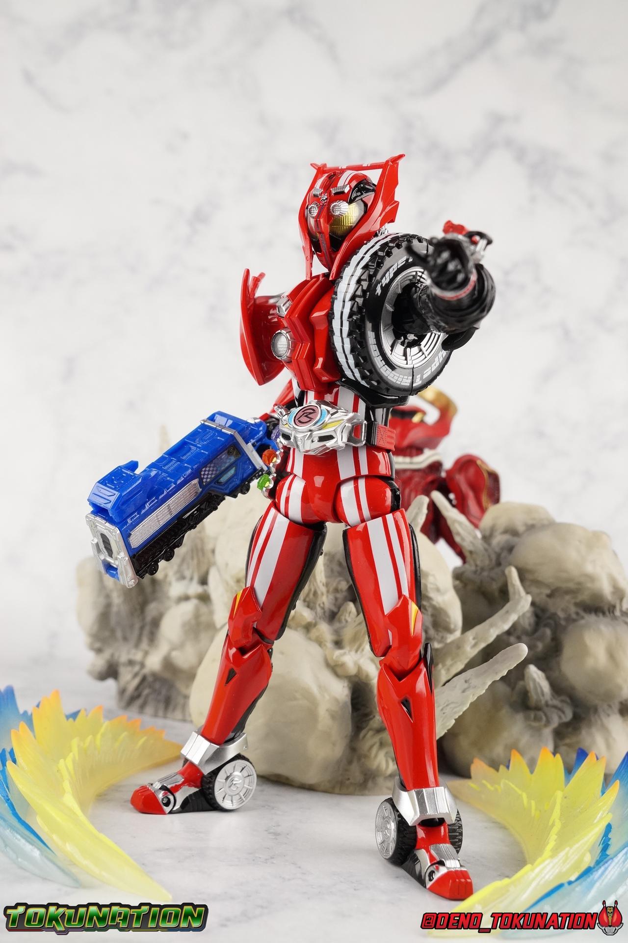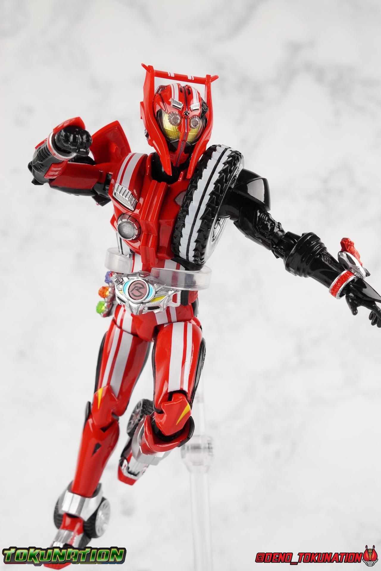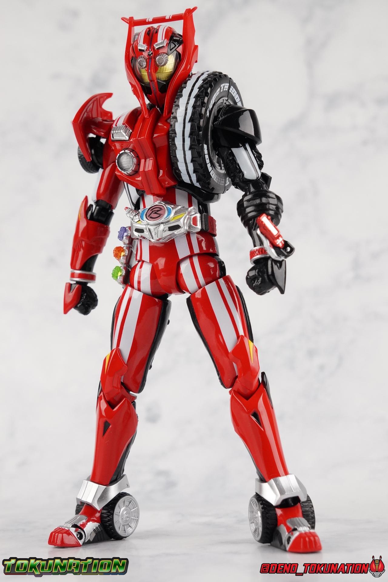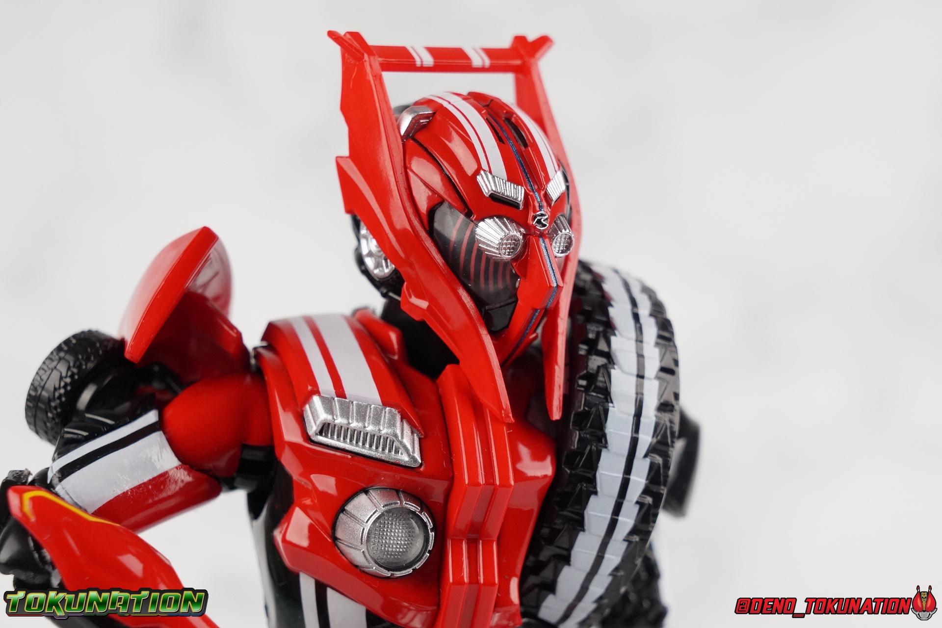 It's been a long time coming but we're proud to finally present a gallery of Kamen Rider Drive's final form with S.H. Figuarts Kamen Rider Drive Type Tridoron (Tire Blending Set)! Unlike many Heisei riders, Drive has yet to gain a new form that appears in a film after the end of his series, that also seems to exceed the power of his original final form. Den-O went from Liner to Super Climax, Fourze went from Cosmic to either of the two Fusion States, Wizard went from Infinity to Infinity All Dragon, etc. Plenty of riders have gotten yet another form that seems to exceed the power of their series' final form. Drive has only received one additional form of his own since the end of the TV series proper, and that was Kamen Rider Zero Drive, which is actually a precursor to even the most basic Drive form, Proto-Drive. So it's refreshing to see that the hulking power-house of Type Tridoron has yet to be outclassed! Let's dive into the figure below! **This gallery contains over 100 images! So it's split across 3 posts. Feel free to peruse them at your leisure. Packaging Type Tridoron continues the steadfast tradition of Drive packaging we've come to know and love over the last 2+ years. Those slick black boxes with a subtle racing theme and killer stock photos. Tridoron's box is a bit thicker in this case because it's specifically the Tire Blending (Tire Kakimazerl) release. So it includes several blended tires for accessories, making the trays a bit thicker. Main Figure It's pretty satisfying to finally have this bad boy in hand. Drive has shaped up to have one of my favorite toylines to date so I'm especially pleased we've finally made it to his final form. Drive Type Tridoron finally rounds out the slew of TV series forms for our heroes. We're left now with only a handful of releases to wait for. But as as is I'm pretty pleased with what we've gotten in Tridoron. Despite what appear to be cumbersome thick feet, the tire ankles actually serve their purpose very well. They balance this figure magnificently, and they still rock side to side a decent amount. Though wide angle stances aren't going to work as well as you'd probably like, the feet won't quite lay flat. The legs are the standard we've seen from this line so far, but the knee pads irk me to no end since they constantly pop off. The Drive Driver & Shift Car holster are identical to previous uses of those molds. The only difference with the driver is the new Type Tridoron read out. It still works just like any other release of the driver in that the face can be replaced. Sadly the arms disappoint me. They're asymmetrical both in design and functionality. They look great, but the left arm can only just manage a 90 degree angle. The second bend in the arm is neutered by the shift tire peg style molding on the forearm. The right arm fares a bit better, but not by much. The arms just aren't super dynamic. Luckily the shoulders are great, even though the Tire has been placed much further over for this outing the left arm doesn't suffer from that. The right is also free of obstruction thanks to the hinge that the fender/bumper part is on. The new chest detailing to replicate Tridoron's front bumper looks fantastic, It's a nice scale representation of what the Tridoron itself looks like. And of course there's that magnificent head. I know a lot of people didn't care for the elongated design itself, but I absolutely adore it. And those gorgeous compound eyes as well. But I think the one bit of detailing I might love most about this figure is the back side of it. It's designed to resemble the undercarriage of the Tridoron itself and it looks incredible. Right down to the small license plate type application on the back of Drive's head. All in all this is a fantastic mold. And I'm glad to see it's getting some mild reuse with the Heart Type Miracle release. I'd love to see another repaint of this mold out down the line but they'll need to make up a new V-cinema form for me to get something that awesome. Drive Type Tridoron is yet another fantastic figure in this great line. Accessories Since this is the more deluxe styled Tire Blending set, Type Tridoron comes with a number of accessories. Everything you could have hoped for: 5 - sets of additional hands. Each set has one red right hand and one black left hand. I love that the asymmetry of this suit carries all the way down to such a minute detail like the hands. You get basically everything you need with this kind of selection as well. 1 - Alternate Krim Head. This extra head represents Krim's control of this form, which was only really demonstrated in show a few times. Primarily we saw it in Drive's final clash with the Freeze Roidmude. The only difference with this head is the bright red compound eyes. It's an extra accessory that totally didn't have to be includde but that I'm very grateful to have as an option. 1 - Trailer Cannon. A straight repack of the accessory included with Type Formula."] It operates exactly the same as before and can accept Shift Cars. 1 - Shift Speed. An extra of this shift car to be used with the included Trailer Cannon, it can be slotted into the cannon just as you could with Type Formula. 1 - Shift Tridoron. An extra of this shift car to be used with the included Trailer Cannon, it can be slotted into the cannon just as you could with Type Formula. 1 - Attack 1 2 3 Tire. A blend of the Midnight Shadow, Max Flare, & Funky Spike Tires. As with any tire that's compatible with Type Tridoron, you just need to split it apart to attach it to his chest/shoulder. 1 - People Saver Tire. A blend of the Mad Doctor, Fire Braver & Justice Hunter Tires. As with any tire that's compatible with Type Tridoron, you just need to split it apart to attach it to his chest/shoulder. 1 - Construction Site (Kouji Genbar) Tire. A blend of the Rumble Dump, Spin Mixer, & Rolling Gravity Tires. As with any tire that's compatible with Type Tridoron, you just need to split it apart to attach it