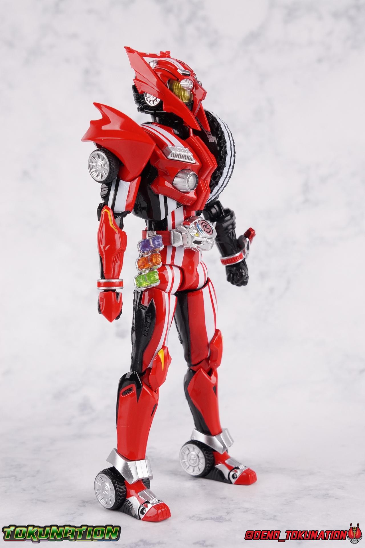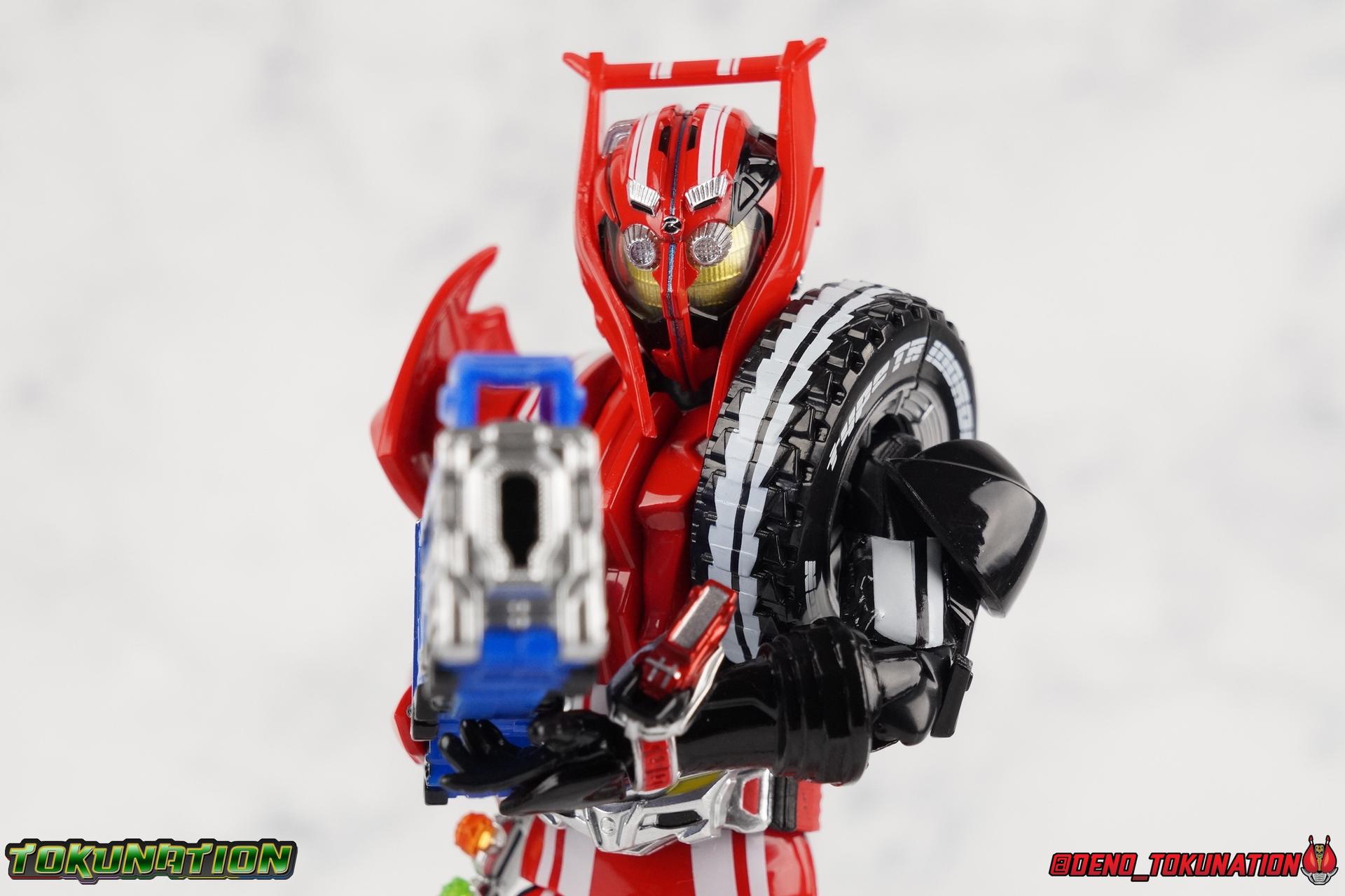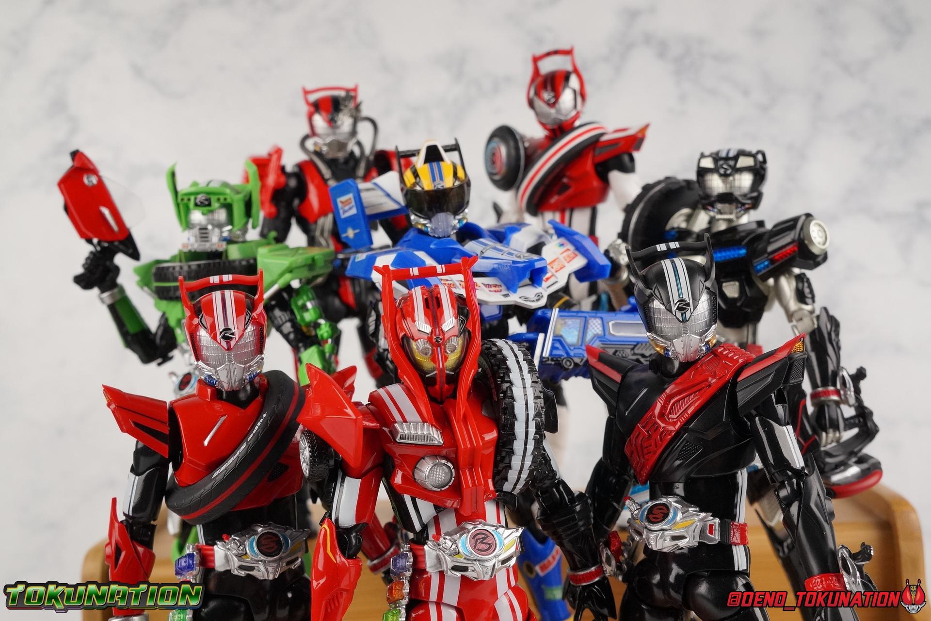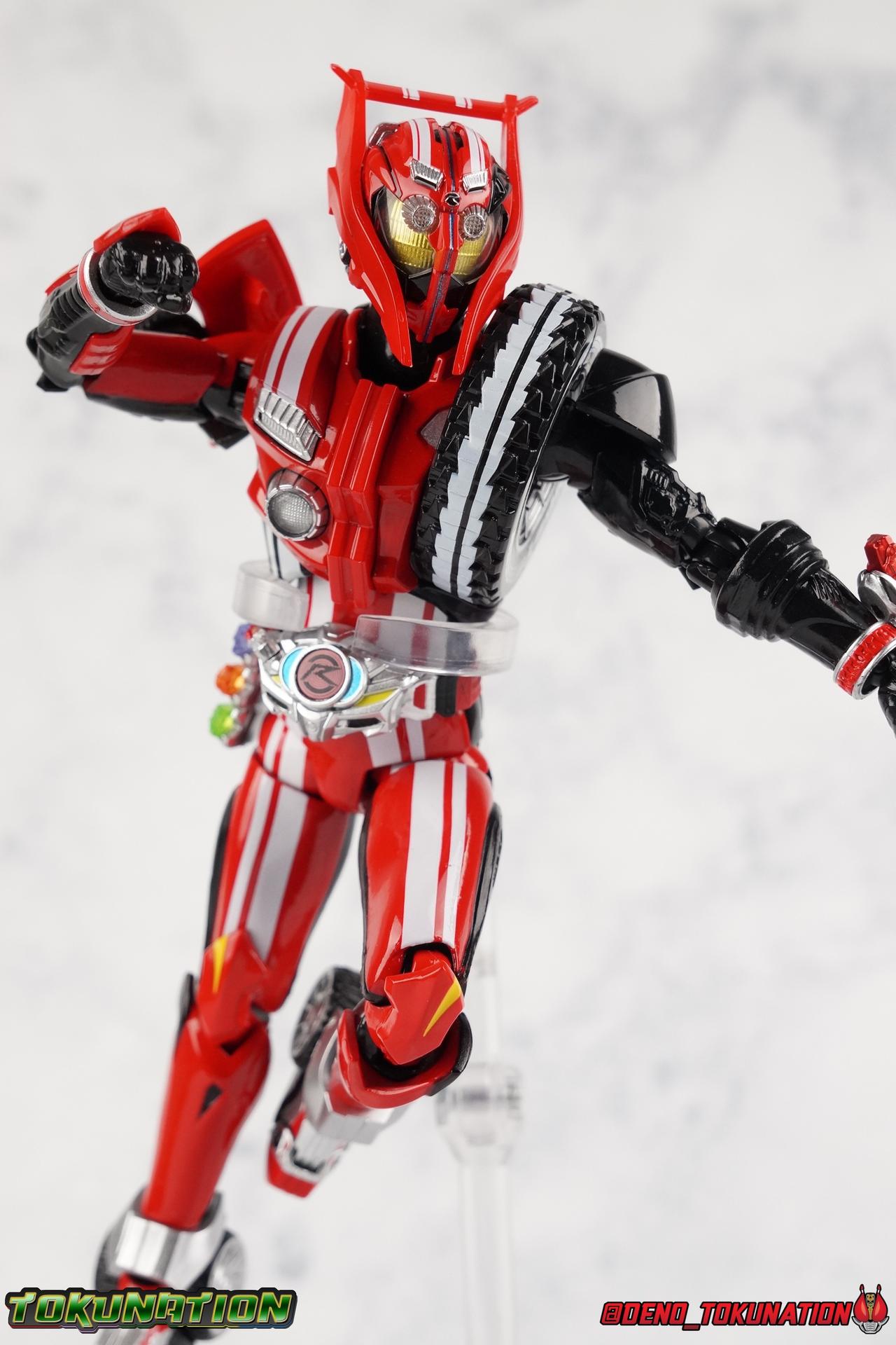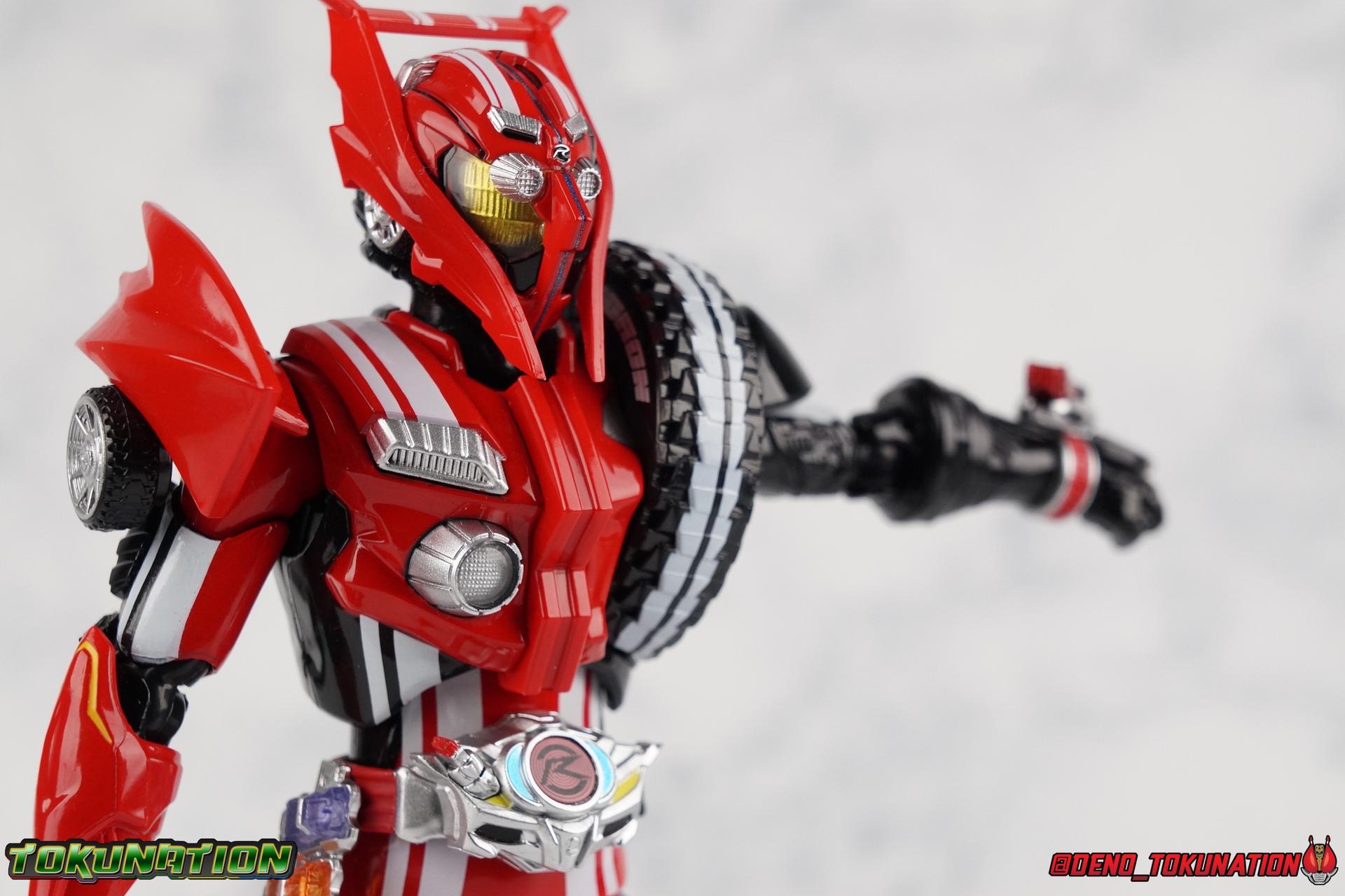 It's been a long time coming but we're proud to finally present a gallery of Kamen Rider Drive's final form with S.H. Figuarts Kamen Rider Drive Type Tridoron (Tire Blending Set)! Unlike many Heisei riders, Drive has yet to gain a new form that appears in a film after the end of his series, that also seems to exceed the power of his original final form. Den-O went from Liner to Super Climax, Fourze went from Cosmic to either of the two Fusion States, Wizard went from Infinity to Infinity All Dragon, etc. Plenty of riders have gotten yet another form that seems to exceed the power of their series' final form. Drive has only received one additional form of his own since the end of the TV series proper, and that was Kamen Rider Zero Drive, which is actually a precursor to even the most basic Drive form, Proto-Drive. So it's refreshing to see that the hulking power-house of Type Tridoron has yet to be outclassed! Let's dive into the figure below! **This gallery contains over 100 images! So it's split across 3 posts. Feel free to peruse them at your leisure. Packaging Type Tridoron continues the steadfast tradition of Drive packaging we've come to know and love over the last 2+ years. Those slick black boxes with a subtle racing theme and killer stock photos. Tridoron's box is a bit thicker in this case because it's specifically the Tire Blending (Tire Kakimazerl) release. So it includes several blended tires for accessories, making the trays a bit thicker. Main Figure It's pretty satisfying to finally have this bad boy in hand. Drive has shaped up to have one of my favorite toylines to date so I'm especially pleased we've finally made it to his final form. Drive Type Tridoron finally rounds out the slew of TV series forms for our heroes. We're left now with only a handful of releases to wait for. But as as is I'm pretty pleased with what we've gotten in Tridoron. Despite what appear to be cumbersome thick feet, the tire ankles actually serve their purpose very well. They balance this figure magnificently, and they still rock side to side a decent amount. Though wide angle stances aren't going to work as well as you'd probably like, the feet won't quite lay flat. The legs are the standard we've seen from this line so far, but the knee pads irk me to no end since they constantly pop off. The Drive Driver & Shift Car holster are identical to previous uses of those molds. The only difference with the driver is the new Type Tridoron read out. It still works just like any other release of the driver in that the face can be replaced. Sadly the arms disappoint me. They're asymmetrical both in design and functionality. They look great, but the left arm can only just manage a 90 degree angle. The second bend in the arm is neutered by the shift tire peg style molding on the forearm. The right arm fares a bit better, but not by much. The arms just aren't super dynamic. Luckily the shoulders are great, even though the Tire has been placed much further over for this outing the left arm doesn't suffer from that. The right is also free of obstruction thanks to the hinge that the fender/bumper part is on. The new chest detailing to replicate Tridoron's front bumper looks fantastic, It's a nice scale representation of what the Tridoron itself looks like. And of course there's that magnificent head. I know a lot of people didn't care for the elongated design itself, but I absolutely adore it. And those gorgeous compound eyes as well. But I think the one bit of detailing I might love most about this figure is the back side of it. It's designed to resemble the undercarriage of the Tridoron itself and it looks incredible. Right down to the small license plate type application on the back of Drive's head. All in all this is a fantastic mold. And I'm glad to see it's getting some mild reuse with the Heart Type Miracle release. I'd love to see another repaint of this mold out down the line but they'll need to make up a new V-cinema form for me to get something that awesome. Drive Type Tridoron is yet another fantastic figure in this great line. Accessories Since this is the more deluxe styled Tire Blending set, Type Tridoron comes with a number of accessories. Everything you could have hoped for: 5 - sets of additional hands. Each set has one red right hand and one black left hand. I love that the asymmetry of this suit carries all the way down to such a minute detail like the hands. You get basically everything you need with this kind of selection as well. 1 - Alternate Krim Head. This extra head represents Krim's control of this form, which was only really demonstrated in show a few times. Primarily we saw it in Drive's final clash with the Freeze Roidmude. The only difference with this head is the bright red compound eyes. It's an extra accessory that totally didn't have to be includde but that I'm very grateful to have as an option. 1 - Trailer Cannon. A straight repack of the accessory included with Type Formula."] It operates exactly the same as before and can accept Shift Cars. 1 - Shift Speed. An extra of this shift car to be used with the included Trailer Cannon, it can be slotted into the cannon just as you could with Type Formula. 1 - Shift Tridoron. An extra of this shift car to be used with the included Trailer Cannon, it can be slotted into the cannon just as you could with Type Formula. 1 - Attack 1 2 3 Tire. A blend of the Midnight Shadow, Max Flare, & Funky Spike Tires. As with any tire that's compatible with Type Tridoron, you just need to split it apart to attach it to his chest/shoulder. 1 - People Saver Tire. A blend of the Mad Doctor, Fire Braver & Justice Hunter Tires. As with any tire that's compatible with Type Tridoron, you just need to split it apart to attach it to his chest/shoulder. 1 - Construction Site (Kouji Genbar) Tire. A blend of the Rumble Dump, Spin Mixer, & Rolling Gravity Tires. As with any tire that's compatible with Type Tridoron, you just need to split it apart to attach it
