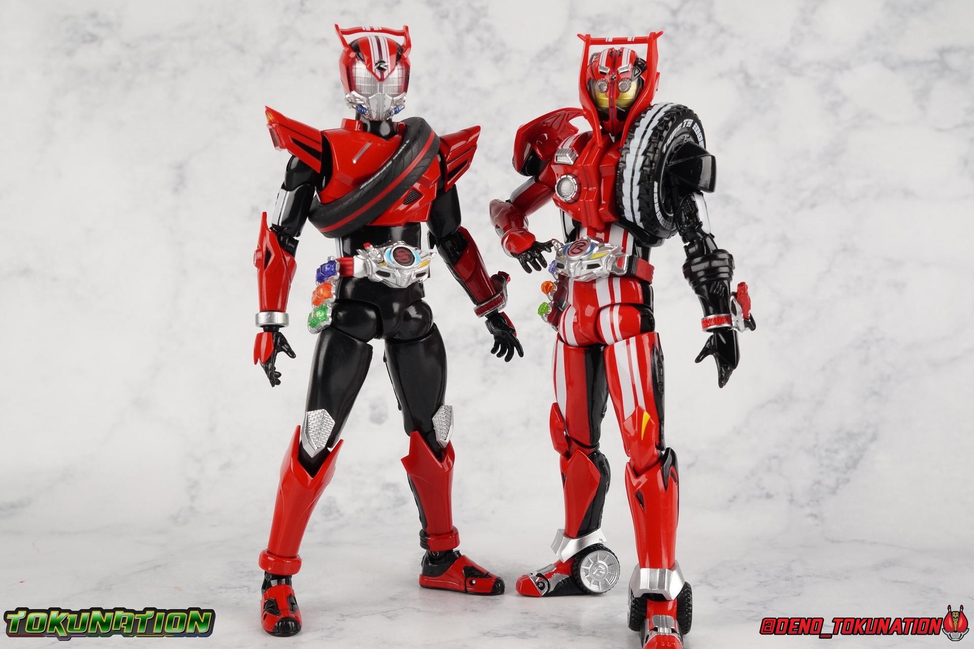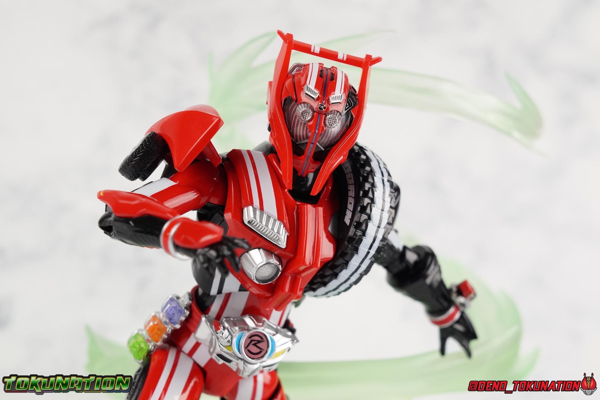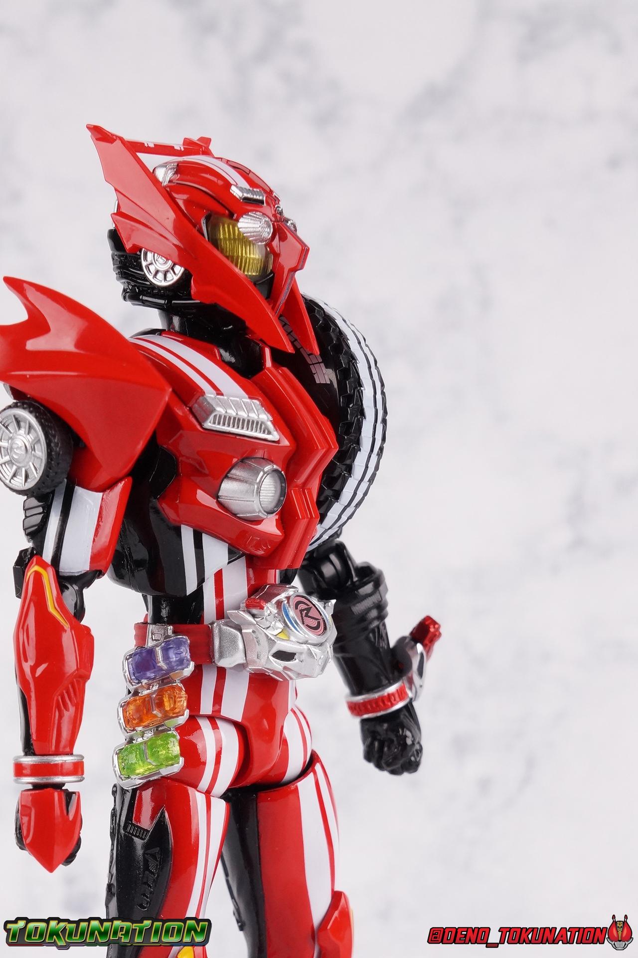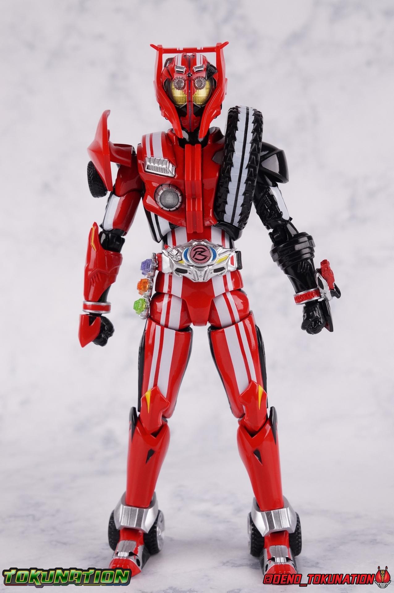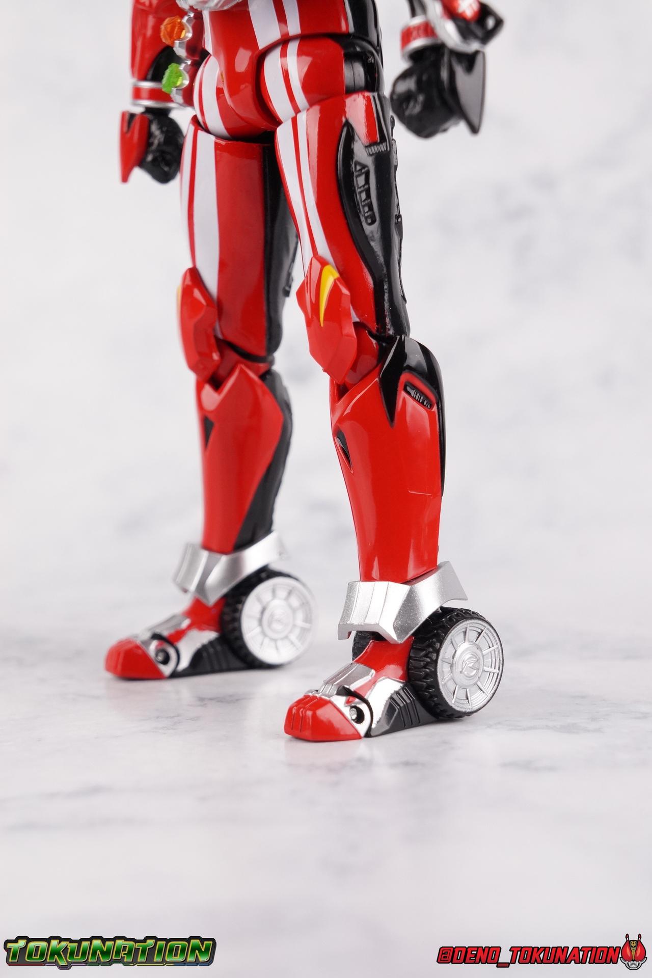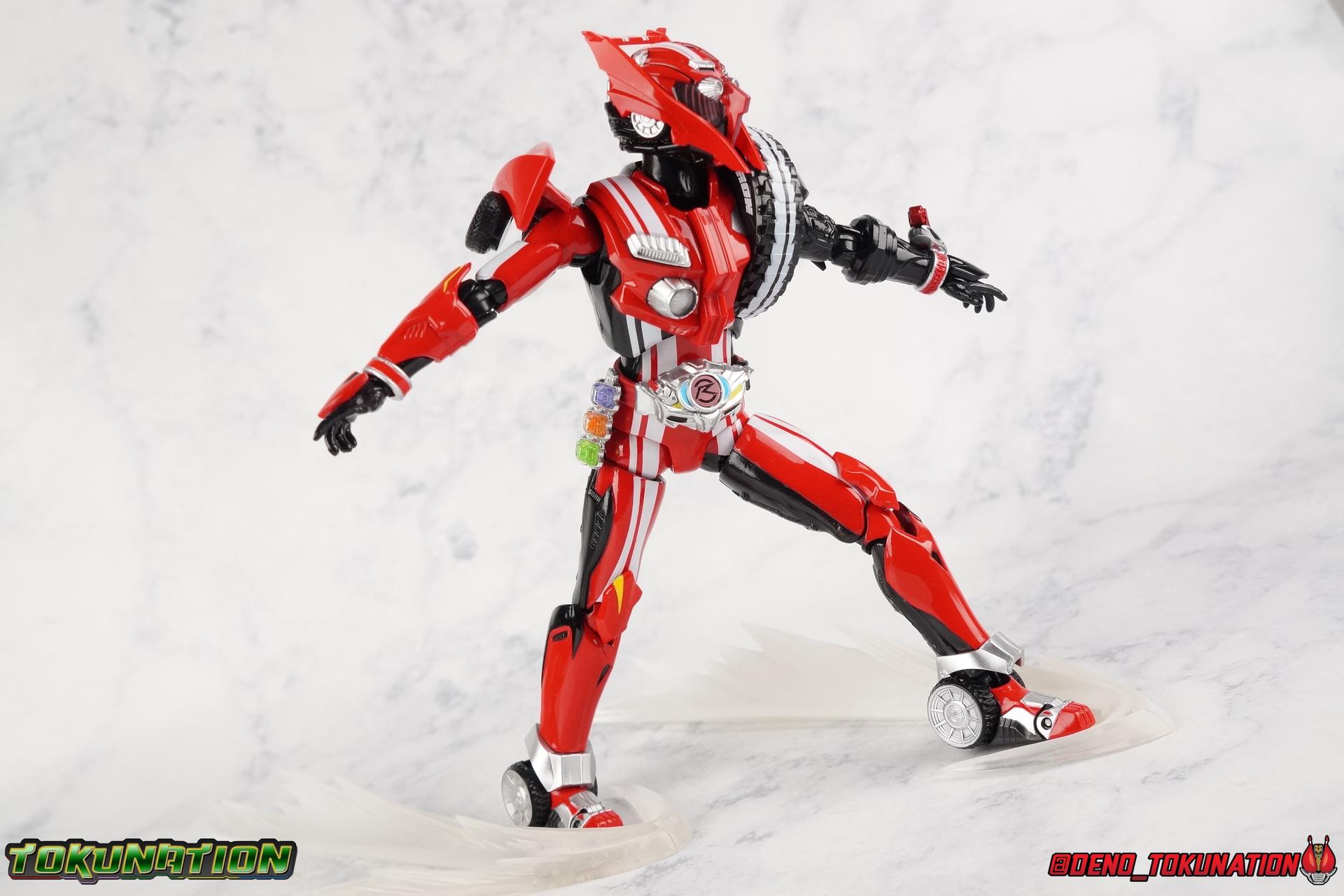 It's been a long time coming but we're proud to finally present a gallery of Kamen Rider Drive's final form with S.H. Figuarts Kamen Rider Drive Type Tridoron (Tire Blending Set)! Unlike many Heisei riders, Drive has yet to gain a new form that appears in a film after the end of his series, that also seems to exceed the power of his original final form. Den-O went from Liner to Super Climax, Fourze went from Cosmic to either of the two Fusion States, Wizard went from Infinity to Infinity All Dragon, etc. Plenty of riders have gotten yet another form that seems to exceed the power of their series' final form. Drive has only received one additional form of his own since the end of the TV series proper, and that was Kamen Rider Zero Drive, which is actually a precursor to even the most basic Drive form, Proto-Drive. So it's refreshing to see that the hulking power-house of Type Tridoron has yet to be outclassed! Let's dive into the figure below! **This gallery contains over 100 images! So it's split across 3 posts. Feel free to peruse them at your leisure. Packaging Type Tridoron continues the steadfast tradition of Drive packaging we've come to know and love over the last 2+ years. Those slick black boxes with a subtle racing theme and killer stock photos. Tridoron's box is a bit thicker in this case because it's specifically the Tire Blending (Tire Kakimazerl) release. So it includes several blended tires for accessories, making the trays a bit thicker. Main Figure It's pretty satisfying to finally have this bad boy in hand. Drive has shaped up to have one of my favorite toylines to date so I'm especially pleased we've finally made it to his final form. Drive Type Tridoron finally rounds out the slew of TV series forms for our heroes. We're left now with only a handful of releases to wait for. But as as is I'm pretty pleased with what we've gotten in Tridoron. Despite what appear to be cumbersome thick feet, the tire ankles actually serve their purpose very well. They balance this figure magnificently, and they still rock side to side a decent amount. Though wide angle stances aren't going to work as well as you'd probably like, the feet won't quite lay flat. The legs are the standard we've seen from this line so far, but the knee pads irk me to no end since they constantly pop off. The Drive Driver & Shift Car holster are identical to previous uses of those molds. The only difference with the driver is the new Type Tridoron read out. It still works just like any other release of the driver in that the face can be replaced. Sadly the arms disappoint me. They're asymmetrical both in design and functionality. They look great, but the left arm can only just manage a 90 degree angle. The second bend in the arm is neutered by the shift tire peg style molding on the forearm. The right arm fares a bit better, but not by much. The arms just aren't super dynamic. Luckily the shoulders are great, even though the Tire has been placed much further over for this outing the left arm doesn't suffer from that. The right is also free of obstruction thanks to the hinge that the fender/bumper part is on. The new chest detailing to replicate Tridoron's front bumper looks fantastic, It's a nice scale representation of what the Tridoron itself looks like. And of course there's that magnificent head. I know a lot of people didn't care for the elongated design itself, but I absolutely adore it. And those gorgeous compound eyes as well. But I think the one bit of detailing I might love most about this figure is the back side of it. It's designed to resemble the undercarriage of the Tridoron itself and it looks incredible. Right down to the small license plate type application on the back of Drive's head. All in all this is a fantastic mold. And I'm glad to see it's getting some mild reuse with the Heart Type Miracle release. I'd love to see another repaint of this mold out down the line but they'll need to make up a new V-cinema form for me to get something that awesome. Drive Type Tridoron is yet another fantastic figure in this great line. Accessories Since this is the more deluxe styled Tire Blending set, Type Tridoron comes with a number of accessories. Everything you could have hoped for: 5 - sets of additional hands. Each set has one red right hand and one black left hand. I love that the asymmetry of this suit carries all the way down to such a minute detail like the hands. You get basically everything you need with this kind of selection as well. 1 - Alternate Krim Head. This extra head represents Krim's control of this form, which was only really demonstrated in show a few times. Primarily we saw it in Drive's final clash with the Freeze Roidmude. The only difference with this head is the bright red compound eyes. It's an extra accessory that totally didn't have to be includde but that I'm very grateful to have as an option. 1 - Trailer Cannon. A straight repack of the accessory included with Type Formula."] It operates exactly the same as before and can accept Shift Cars. 1 - Shift Speed. An extra of this shift car to be used with the included Trailer Cannon, it can be slotted into the cannon just as you could with Type Formula. 1 - Shift Tridoron. An extra of this shift car to be used with the included Trailer Cannon, it can be slotted into the cannon just as you could with Type Formula. 1 - Attack 1 2 3 Tire. A blend of the Midnight Shadow, Max Flare, & Funky Spike Tires. As with any tire that's compatible with Type Tridoron, you just need to split it apart to attach it to his chest/shoulder. 1 - People Saver Tire. A blend of the Mad Doctor, Fire Braver & Justice Hunter Tires. As with any tire that's compatible with Type Tridoron, you just need to split it apart to attach it to his chest/shoulder. 1 - Construction Site (Kouji Genbar) Tire. A blend of the Rumble Dump, Spin Mixer, & Rolling Gravity Tires. As with any tire that's compatible with Type Tridoron, you just need to split it apart to attach it