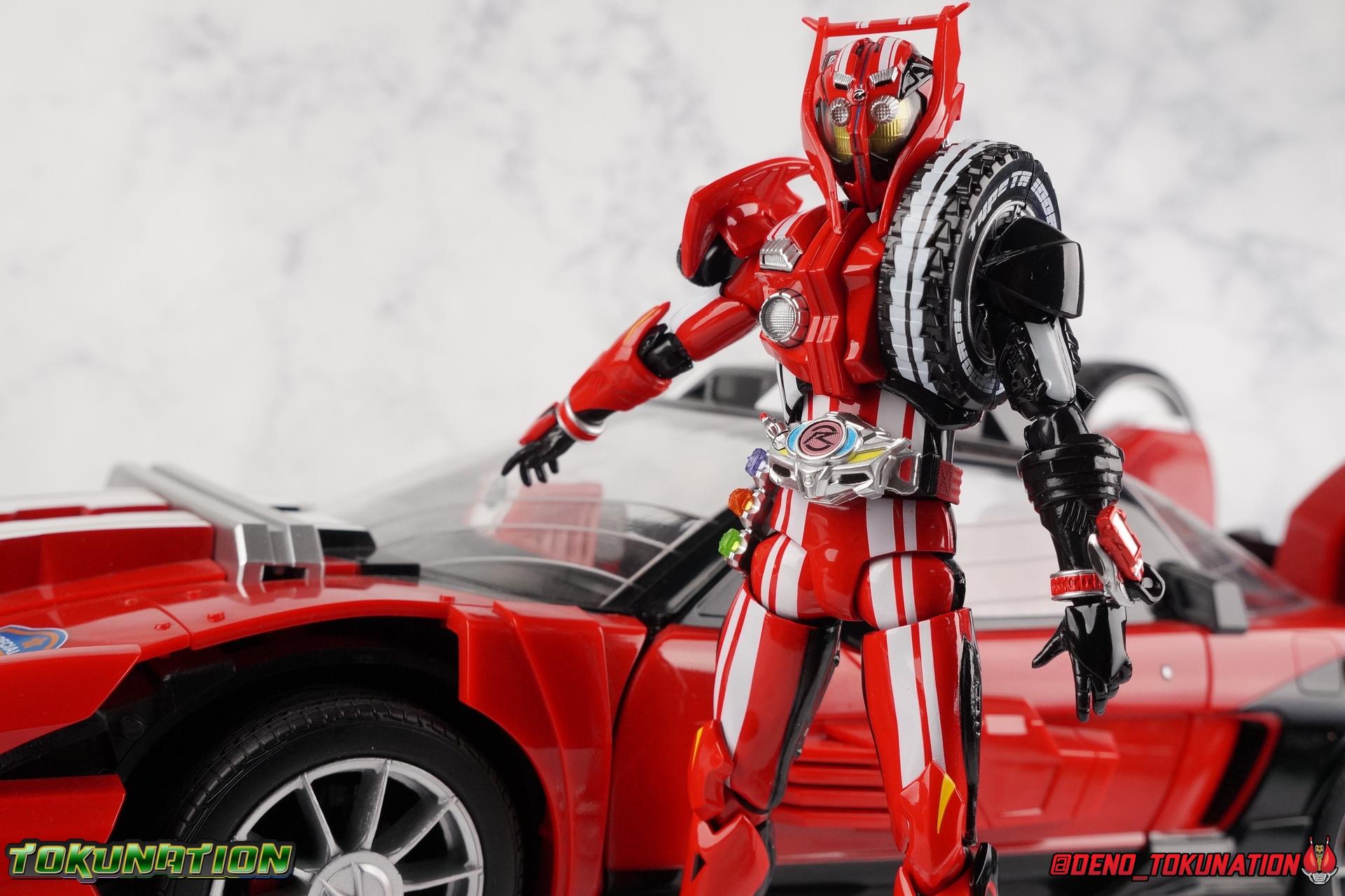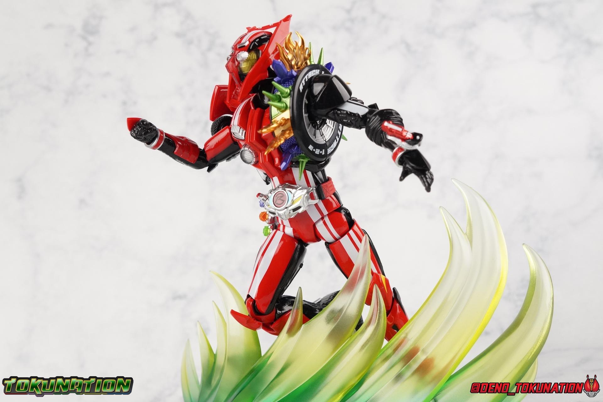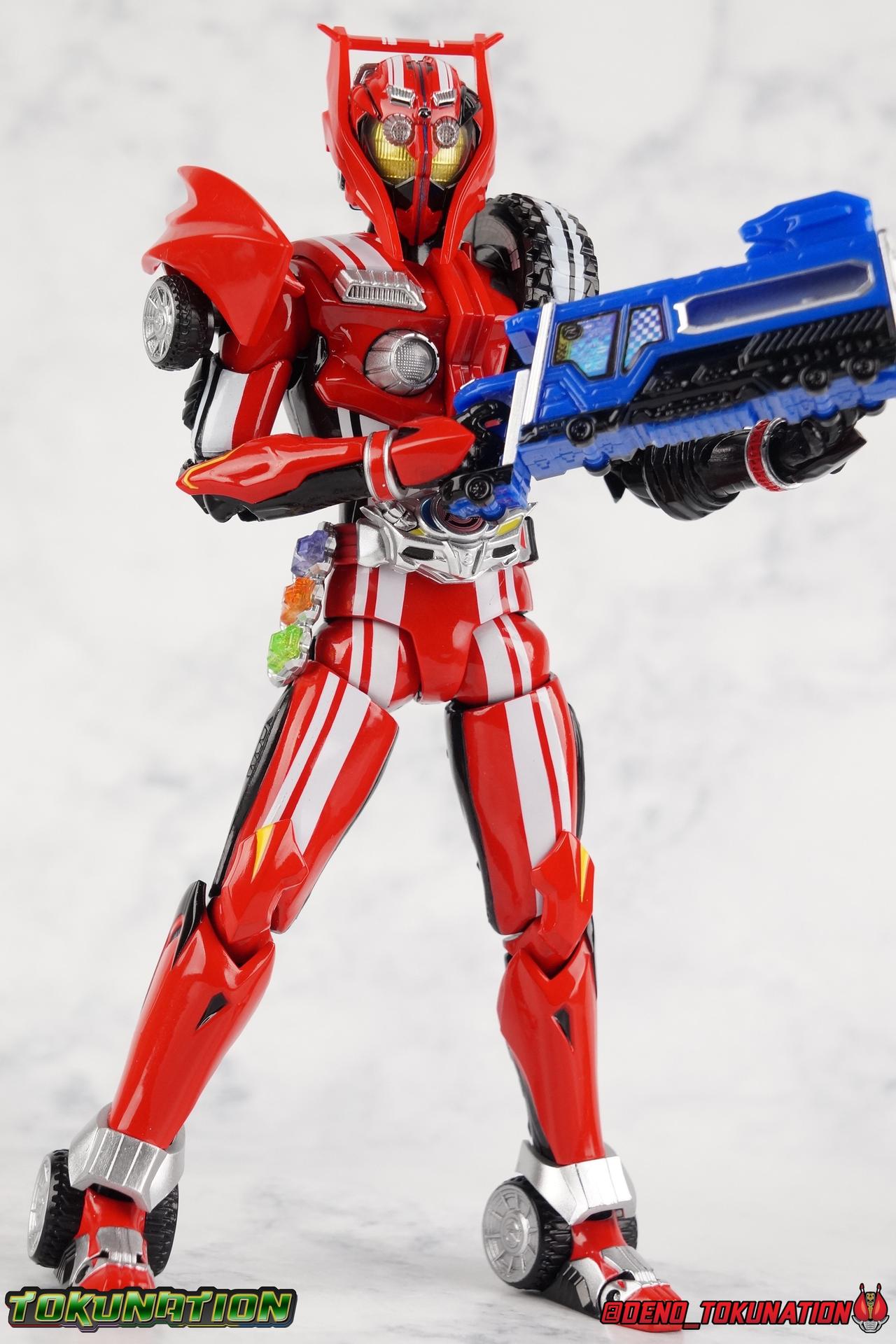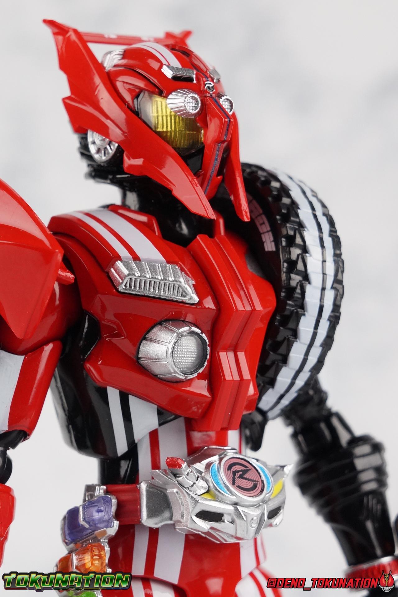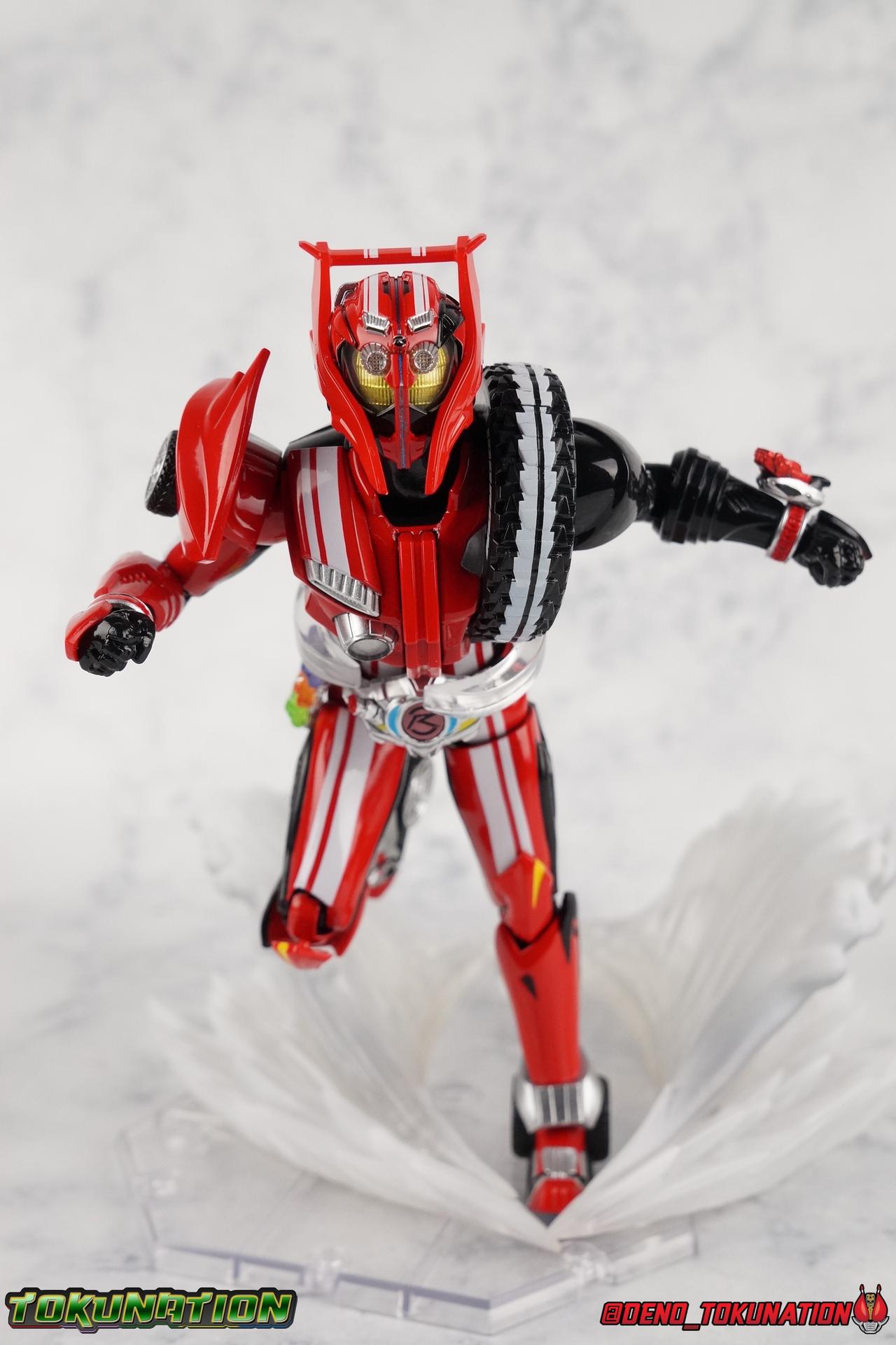 It's been a long time coming but we're proud to finally present a gallery of Kamen Rider Drive's final form with S.H. Figuarts Kamen Rider Drive Type Tridoron (Tire Blending Set)! Unlike many Heisei riders, Drive has yet to gain a new form that appears in a film after the end of his series, that also seems to exceed the power of his original final form. Den-O went from Liner to Super Climax, Fourze went from Cosmic to either of the two Fusion States, Wizard went from Infinity to Infinity All Dragon, etc. Plenty of riders have gotten yet another form that seems to exceed the power of their series' final form. Drive has only received one additional form of his own since the end of the TV series proper, and that was Kamen Rider Zero Drive, which is actually a precursor to even the most basic Drive form, Proto-Drive. So it's refreshing to see that the hulking power-house of Type Tridoron has yet to be outclassed! Let's dive into the figure below! **This gallery contains over 100 images! So it's split across 3 posts. Feel free to peruse them at your leisure. Packaging Type Tridoron continues the steadfast tradition of Drive packaging we've come to know and love over the last 2+ years. Those slick black boxes with a subtle racing theme and killer stock photos. Tridoron's box is a bit thicker in this case because it's specifically the Tire Blending (Tire Kakimazerl) release. So it includes several blended tires for accessories, making the trays a bit thicker. Main Figure It's pretty satisfying to finally have this bad boy in hand. Drive has shaped up to have one of my favorite toylines to date so I'm especially pleased we've finally made it to his final form. Drive Type Tridoron finally rounds out the slew of TV series forms for our heroes. We're left now with only a handful of releases to wait for. But as as is I'm pretty pleased with what we've gotten in Tridoron. Despite what appear to be cumbersome thick feet, the tire ankles actually serve their purpose very well. They balance this figure magnificently, and they still rock side to side a decent amount. Though wide angle stances aren't going to work as well as you'd probably like, the feet won't quite lay flat. The legs are the standard we've seen from this line so far, but the knee pads irk me to no end since they constantly pop off. The Drive Driver & Shift Car holster are identical to previous uses of those molds. The only difference with the driver is the new Type Tridoron read out. It still works just like any other release of the driver in that the face can be replaced. Sadly the arms disappoint me. They're asymmetrical both in design and functionality. They look great, but the left arm can only just manage a 90 degree angle. The second bend in the arm is neutered by the shift tire peg style molding on the forearm. The right arm fares a bit better, but not by much. The arms just aren't super dynamic. Luckily the shoulders are great, even though the Tire has been placed much further over for this outing the left arm doesn't suffer from that. The right is also free of obstruction thanks to the hinge that the fender/bumper part is on. The new chest detailing to replicate Tridoron's front bumper looks fantastic, It's a nice scale representation of what the Tridoron itself looks like. And of course there's that magnificent head. I know a lot of people didn't care for the elongated design itself, but I absolutely adore it. And those gorgeous compound eyes as well. But I think the one bit of detailing I might love most about this figure is the back side of it. It's designed to resemble the undercarriage of the Tridoron itself and it looks incredible. Right down to the small license plate type application on the back of Drive's head. All in all this is a fantastic mold. And I'm glad to see it's getting some mild reuse with the Heart Type Miracle release. I'd love to see another repaint of this mold out down the line but they'll need to make up a new V-cinema form for me to get something that awesome. Drive Type Tridoron is yet another fantastic figure in this great line. Accessories Since this is the more deluxe styled Tire Blending set, Type Tridoron comes with a number of accessories. Everything you could have hoped for: 5 - sets of additional hands. Each set has one red right hand and one black left hand. I love that the asymmetry of this suit carries all the way down to such a minute detail like the hands. You get basically everything you need with this kind of selection as well. 1 - Alternate Krim Head. This extra head represents Krim's control of this form, which was only really demonstrated in show a few times. Primarily we saw it in Drive's final clash with the Freeze Roidmude. The only difference with this head is the bright red compound eyes. It's an extra accessory that totally didn't have to be includde but that I'm very grateful to have as an option. 1 - Trailer Cannon. A straight repack of the accessory included with Type Formula."] It operates exactly the same as before and can accept Shift Cars. 1 - Shift Speed. An extra of this shift car to be used with the included Trailer Cannon, it can be slotted into the cannon just as you could with Type Formula. 1 - Shift Tridoron. An extra of this shift car to be used with the included Trailer Cannon, it can be slotted into the cannon just as you could with Type Formula. 1 - Attack 1 2 3 Tire. A blend of the Midnight Shadow, Max Flare, & Funky Spike Tires. As with any tire that's compatible with Type Tridoron, you just need to split it apart to attach it to his chest/shoulder. 1 - People Saver Tire. A blend of the Mad Doctor, Fire Braver & Justice Hunter Tires. As with any tire that's compatible with Type Tridoron, you just need to split it apart to attach it to his chest/shoulder. 1 - Construction Site (Kouji Genbar) Tire. A blend of the Rumble Dump, Spin Mixer, & Rolling Gravity Tires. As with any tire that's compatible with Type Tridoron, you just need to split it apart to attach it