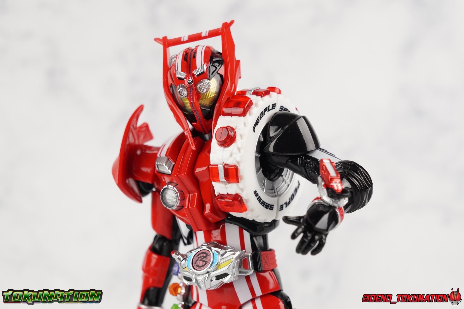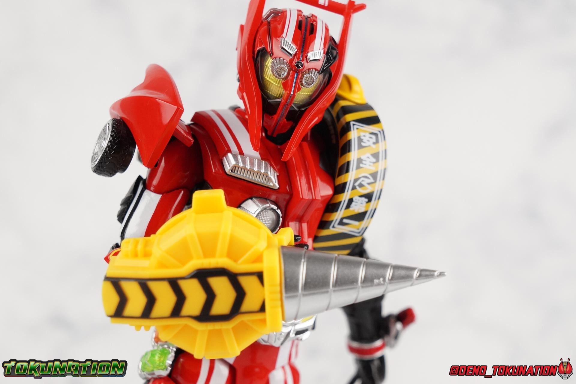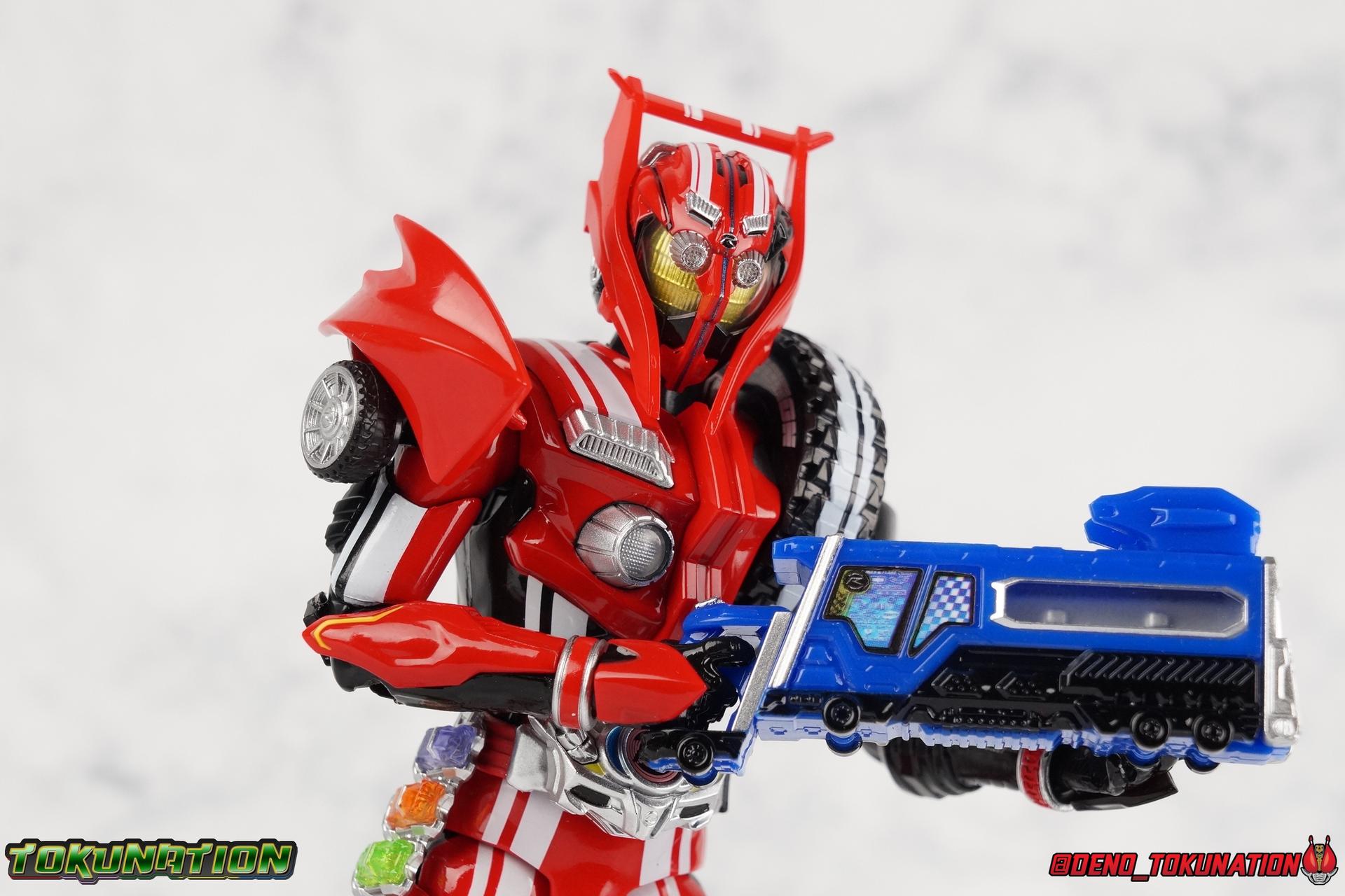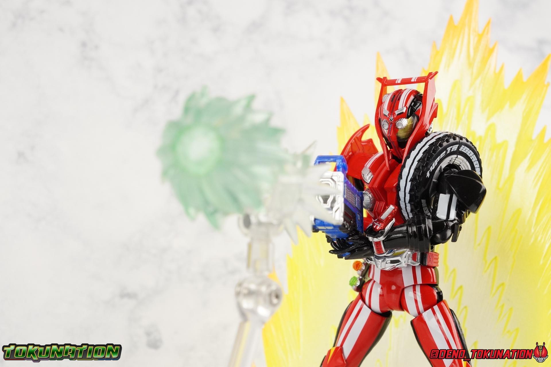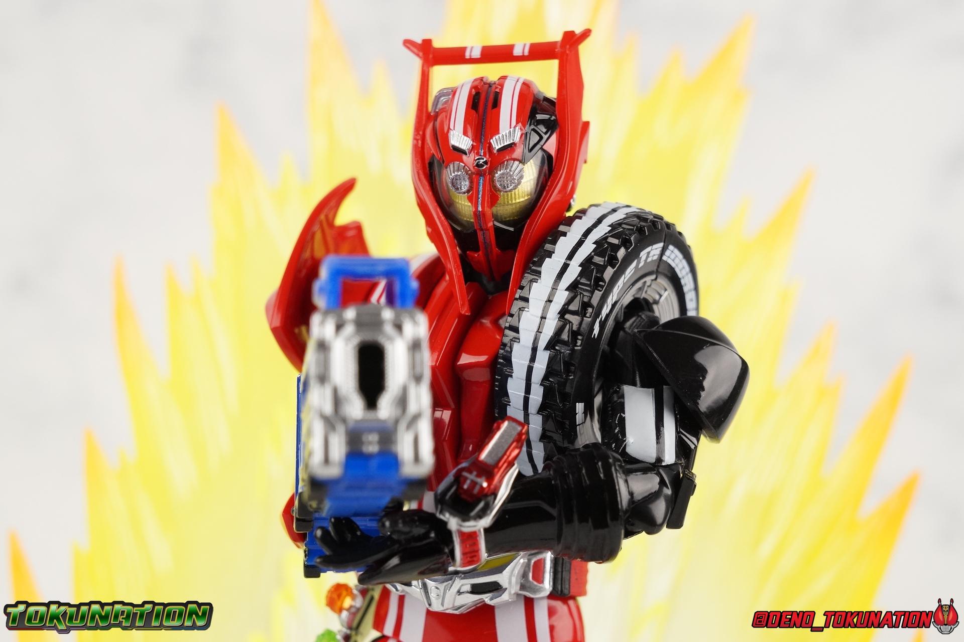 It's been a long time coming but we're proud to finally present a gallery of Kamen Rider Drive's final form with S.H. Figuarts Kamen Rider Drive Type Tridoron (Tire Blending Set)! Unlike many Heisei riders, Drive has yet to gain a new form that appears in a film after the end of his series, that also seems to exceed the power of his original final form. Den-O went from Liner to Super Climax, Fourze went from Cosmic to either of the two Fusion States, Wizard went from Infinity to Infinity All Dragon, etc. Plenty of riders have gotten yet another form that seems to exceed the power of their series' final form. Drive has only received one additional form of his own since the end of the TV series proper, and that was Kamen Rider Zero Drive, which is actually a precursor to even the most basic Drive form, Proto-Drive. So it's refreshing to see that the hulking power-house of Type Tridoron has yet to be outclassed! Let's dive into the figure below! **This gallery contains over 100 images! So it's split across 3 posts. Feel free to peruse them at your leisure. Packaging Type Tridoron continues the steadfast tradition of Drive packaging we've come to know and love over the last 2+ years. Those slick black boxes with a subtle racing theme and killer stock photos. Tridoron's box is a bit thicker in this case because it's specifically the Tire Blending (Tire Kakimazerl) release. So it includes several blended tires for accessories, making the trays a bit thicker. Main Figure It's pretty satisfying to finally have this bad boy in hand. Drive has shaped up to have one of my favorite toylines to date so I'm especially pleased we've finally made it to his final form. Drive Type Tridoron finally rounds out the slew of TV series forms for our heroes. We're left now with only a handful of releases to wait for. But as as is I'm pretty pleased with what we've gotten in Tridoron. Despite what appear to be cumbersome thick feet, the tire ankles actually serve their purpose very well. They balance this figure magnificently, and they still rock side to side a decent amount. Though wide angle stances aren't going to work as well as you'd probably like, the feet won't quite lay flat. The legs are the standard we've seen from this line so far, but the knee pads irk me to no end since they constantly pop off. The Drive Driver & Shift Car holster are identical to previous uses of those molds. The only difference with the driver is the new Type Tridoron read out. It still works just like any other release of the driver in that the face can be replaced. Sadly the arms disappoint me. They're asymmetrical both in design and functionality. They look great, but the left arm can only just manage a 90 degree angle. The second bend in the arm is neutered by the shift tire peg style molding on the forearm. The right arm fares a bit better, but not by much. The arms just aren't super dynamic. Luckily the shoulders are great, even though the Tire has been placed much further over for this outing the left arm doesn't suffer from that. The right is also free of obstruction thanks to the hinge that the fender/bumper part is on. The new chest detailing to replicate Tridoron's front bumper looks fantastic, It's a nice scale representation of what the Tridoron itself looks like. And of course there's that magnificent head. I know a lot of people didn't care for the elongated design itself, but I absolutely adore it. And those gorgeous compound eyes as well. But I think the one bit of detailing I might love most about this figure is the back side of it. It's designed to resemble the undercarriage of the Tridoron itself and it looks incredible. Right down to the small license plate type application on the back of Drive's head. All in all this is a fantastic mold. And I'm glad to see it's getting some mild reuse with the Heart Type Miracle release. I'd love to see another repaint of this mold out down the line but they'll need to make up a new V-cinema form for me to get something that awesome. Drive Type Tridoron is yet another fantastic figure in this great line. Accessories Since this is the more deluxe styled Tire Blending set, Type Tridoron comes with a number of accessories. Everything you could have hoped for: 5 - sets of additional hands. Each set has one red right hand and one black left hand. I love that the asymmetry of this suit carries all the way down to such a minute detail like the hands. You get basically everything you need with this kind of selection as well. 1 - Alternate Krim Head. This extra head represents Krim's control of this form, which was only really demonstrated in show a few times. Primarily we saw it in Drive's final clash with the Freeze Roidmude. The only difference with this head is the bright red compound eyes. It's an extra accessory that totally didn't have to be includde but that I'm very grateful to have as an option. 1 - Trailer Cannon. A straight repack of the accessory included with Type Formula."] It operates exactly the same as before and can accept Shift Cars. 1 - Shift Speed. An extra of this shift car to be used with the included Trailer Cannon, it can be slotted into the cannon just as you could with Type Formula. 1 - Shift Tridoron. An extra of this shift car to be used with the included Trailer Cannon, it can be slotted into the cannon just as you could with Type Formula. 1 - Attack 1 2 3 Tire. A blend of the Midnight Shadow, Max Flare, & Funky Spike Tires. As with any tire that's compatible with Type Tridoron, you just need to split it apart to attach it to his chest/shoulder. 1 - People Saver Tire. A blend of the Mad Doctor, Fire Braver & Justice Hunter Tires. As with any tire that's compatible with Type Tridoron, you just need to split it apart to attach it to his chest/shoulder. 1 - Construction Site (Kouji Genbar) Tire. A blend of the Rumble Dump, Spin Mixer, & Rolling Gravity Tires. As with any tire that's compatible with Type Tridoron, you just need to split it apart to attach it