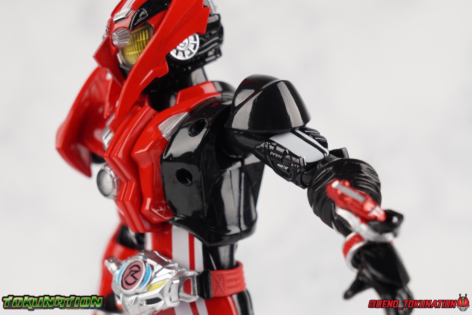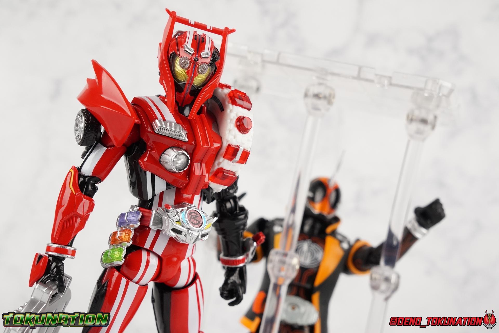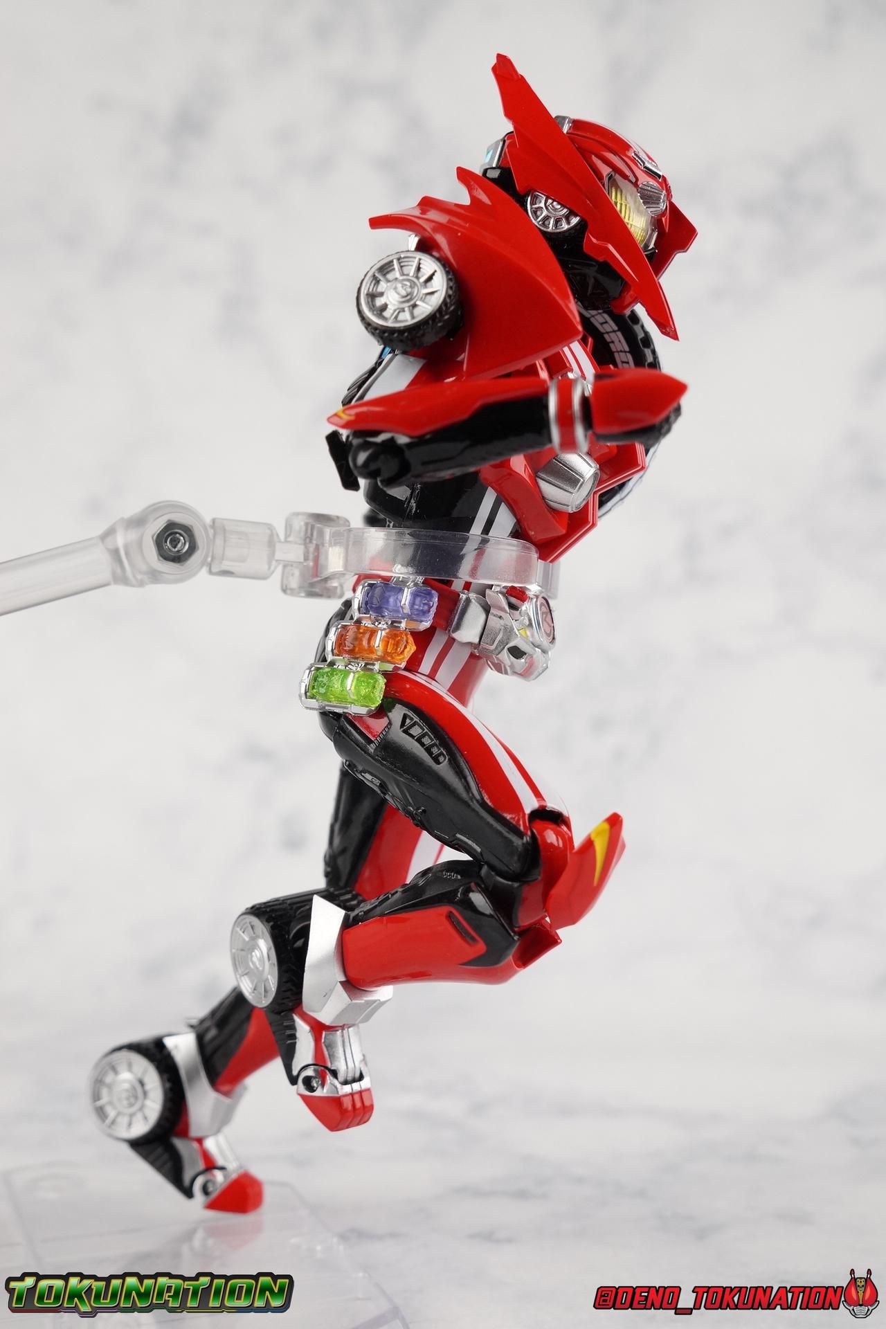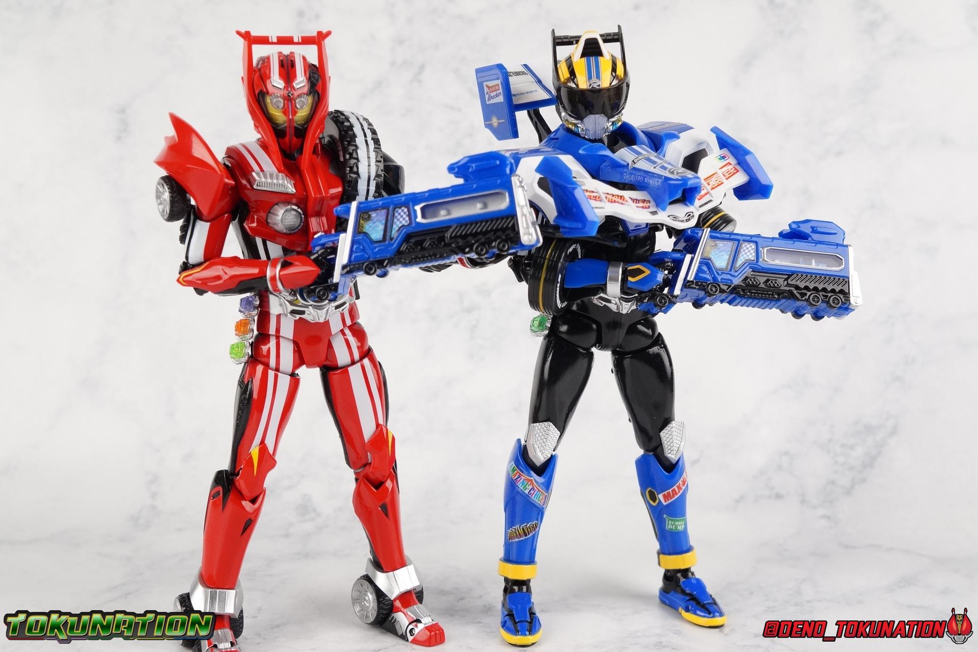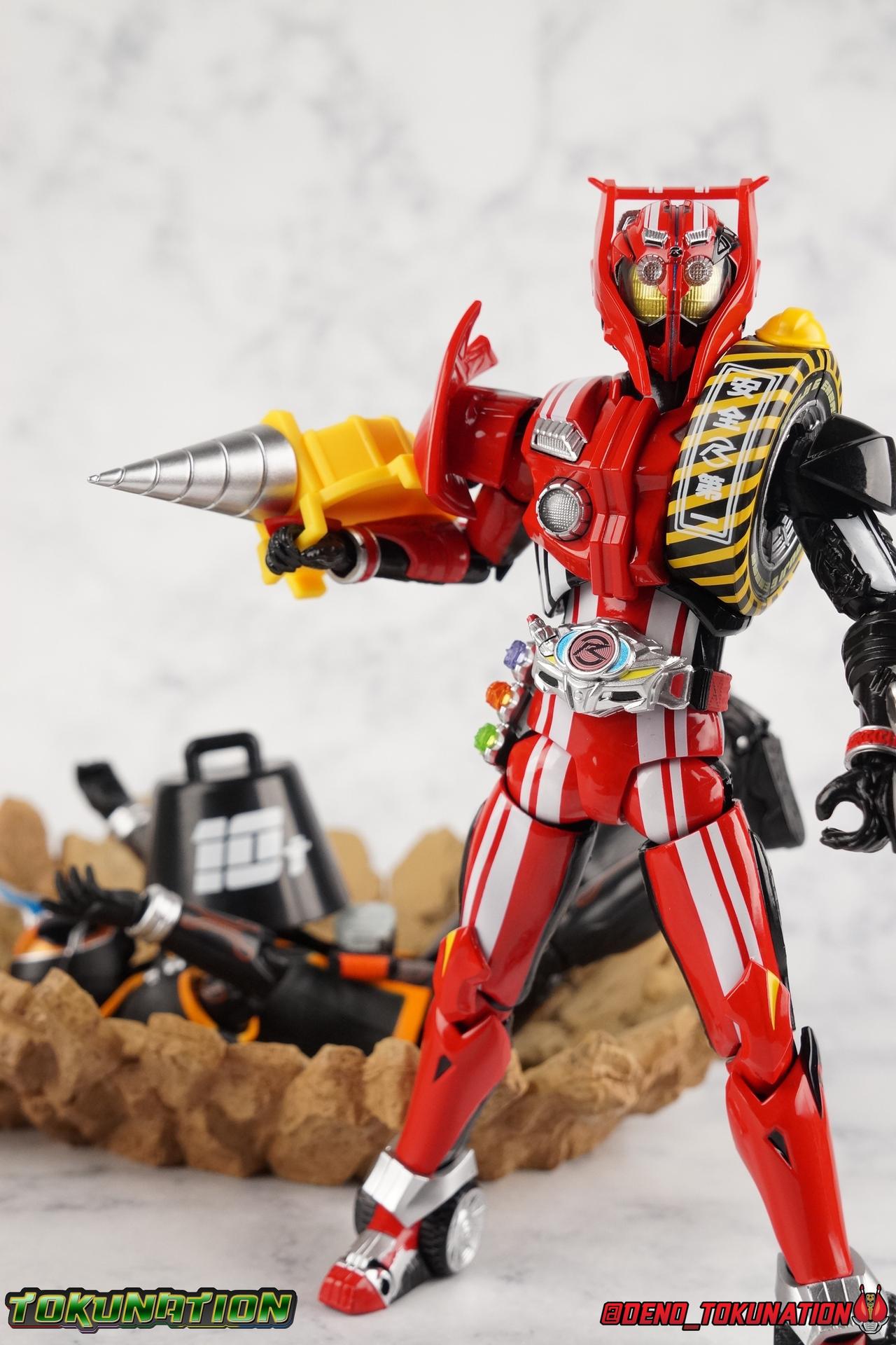 It's been a long time coming but we're proud to finally present a gallery of Kamen Rider Drive's final form with S.H. Figuarts Kamen Rider Drive Type Tridoron (Tire Blending Set)! Unlike many Heisei riders, Drive has yet to gain a new form that appears in a film after the end of his series, that also seems to exceed the power of his original final form. Den-O went from Liner to Super Climax, Fourze went from Cosmic to either of the two Fusion States, Wizard went from Infinity to Infinity All Dragon, etc. Plenty of riders have gotten yet another form that seems to exceed the power of their series' final form. Drive has only received one additional form of his own since the end of the TV series proper, and that was Kamen Rider Zero Drive, which is actually a precursor to even the most basic Drive form, Proto-Drive. So it's refreshing to see that the hulking power-house of Type Tridoron has yet to be outclassed! Let's dive into the figure below! **This gallery contains over 100 images! So it's split across 3 posts. Feel free to peruse them at your leisure. Packaging Type Tridoron continues the steadfast tradition of Drive packaging we've come to know and love over the last 2+ years. Those slick black boxes with a subtle racing theme and killer stock photos. Tridoron's box is a bit thicker in this case because it's specifically the Tire Blending (Tire Kakimazerl) release. So it includes several blended tires for accessories, making the trays a bit thicker. Main Figure It's pretty satisfying to finally have this bad boy in hand. Drive has shaped up to have one of my favorite toylines to date so I'm especially pleased we've finally made it to his final form. Drive Type Tridoron finally rounds out the slew of TV series forms for our heroes. We're left now with only a handful of releases to wait for. But as as is I'm pretty pleased with what we've gotten in Tridoron. Despite what appear to be cumbersome thick feet, the tire ankles actually serve their purpose very well. They balance this figure magnificently, and they still rock side to side a decent amount. Though wide angle stances aren't going to work as well as you'd probably like, the feet won't quite lay flat. The legs are the standard we've seen from this line so far, but the knee pads irk me to no end since they constantly pop off. The Drive Driver & Shift Car holster are identical to previous uses of those molds. The only difference with the driver is the new Type Tridoron read out. It still works just like any other release of the driver in that the face can be replaced. Sadly the arms disappoint me. They're asymmetrical both in design and functionality. They look great, but the left arm can only just manage a 90 degree angle. The second bend in the arm is neutered by the shift tire peg style molding on the forearm. The right arm fares a bit better, but not by much. The arms just aren't super dynamic. Luckily the shoulders are great, even though the Tire has been placed much further over for this outing the left arm doesn't suffer from that. The right is also free of obstruction thanks to the hinge that the fender/bumper part is on. The new chest detailing to replicate Tridoron's front bumper looks fantastic, It's a nice scale representation of what the Tridoron itself looks like. And of course there's that magnificent head. I know a lot of people didn't care for the elongated design itself, but I absolutely adore it. And those gorgeous compound eyes as well. But I think the one bit of detailing I might love most about this figure is the back side of it. It's designed to resemble the undercarriage of the Tridoron itself and it looks incredible. Right down to the small license plate type application on the back of Drive's head. All in all this is a fantastic mold. And I'm glad to see it's getting some mild reuse with the Heart Type Miracle release. I'd love to see another repaint of this mold out down the line but they'll need to make up a new V-cinema form for me to get something that awesome. Drive Type Tridoron is yet another fantastic figure in this great line. Accessories Since this is the more deluxe styled Tire Blending set, Type Tridoron comes with a number of accessories. Everything you could have hoped for: 5 - sets of additional hands. Each set has one red right hand and one black left hand. I love that the asymmetry of this suit carries all the way down to such a minute detail like the hands. You get basically everything you need with this kind of selection as well. 1 - Alternate Krim Head. This extra head represents Krim's control of this form, which was only really demonstrated in show a few times. Primarily we saw it in Drive's final clash with the Freeze Roidmude. The only difference with this head is the bright red compound eyes. It's an extra accessory that totally didn't have to be includde but that I'm very grateful to have as an option. 1 - Trailer Cannon. A straight repack of the accessory included with Type Formula."] It operates exactly the same as before and can accept Shift Cars. 1 - Shift Speed. An extra of this shift car to be used with the included Trailer Cannon, it can be slotted into the cannon just as you could with Type Formula. 1 - Shift Tridoron. An extra of this shift car to be used with the included Trailer Cannon, it can be slotted into the cannon just as you could with Type Formula. 1 - Attack 1 2 3 Tire. A blend of the Midnight Shadow, Max Flare, & Funky Spike Tires. As with any tire that's compatible with Type Tridoron, you just need to split it apart to attach it to his chest/shoulder. 1 - People Saver Tire. A blend of the Mad Doctor, Fire Braver & Justice Hunter Tires. As with any tire that's compatible with Type Tridoron, you just need to split it apart to attach it to his chest/shoulder. 1 - Construction Site (Kouji Genbar) Tire. A blend of the Rumble Dump, Spin Mixer, & Rolling Gravity Tires. As with any tire that's compatible with Type Tridoron, you just need to split it apart to attach it