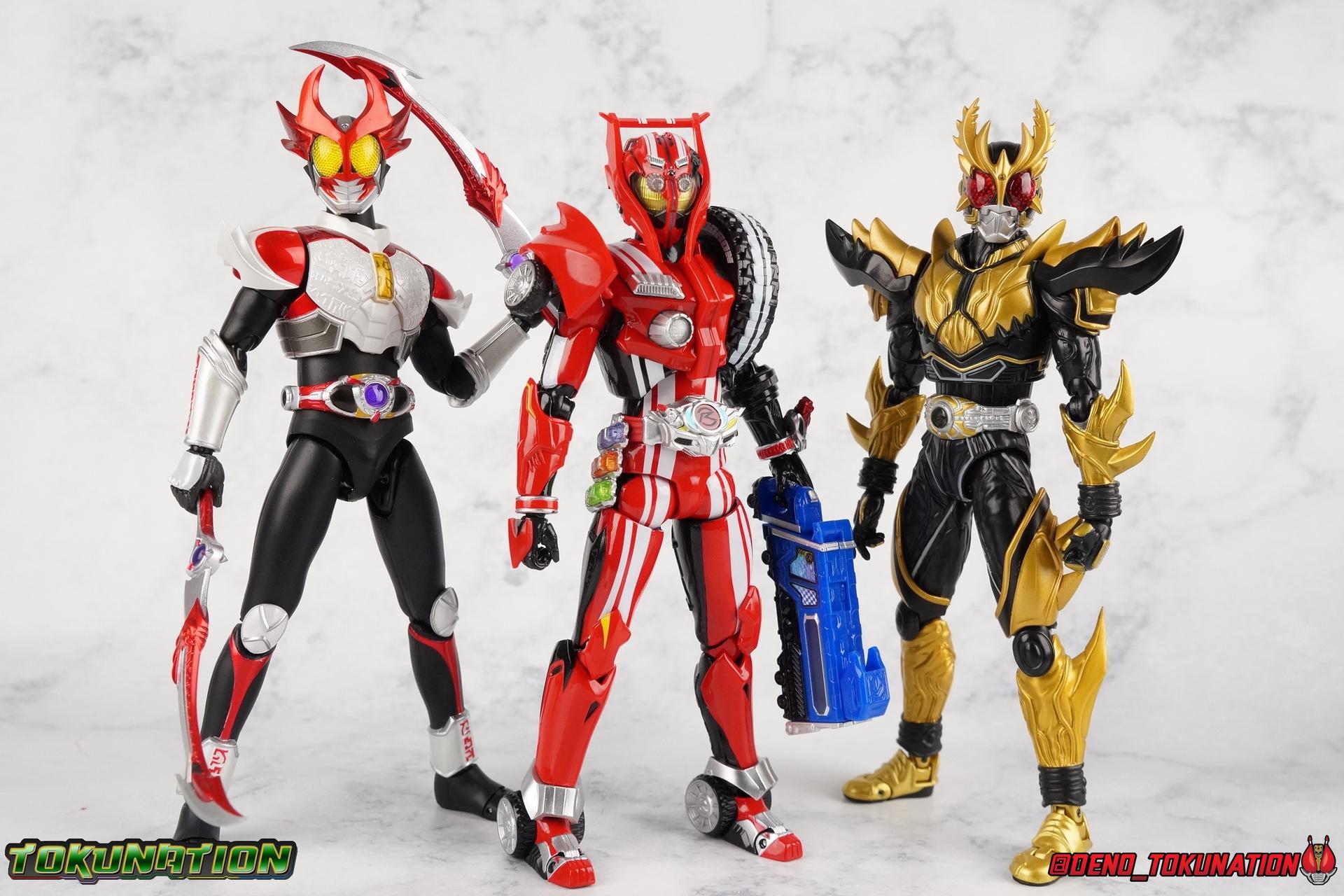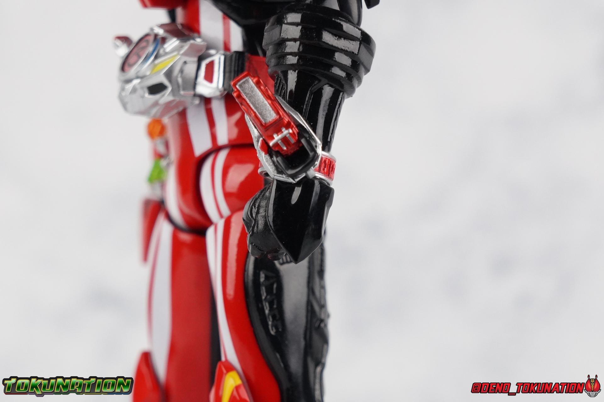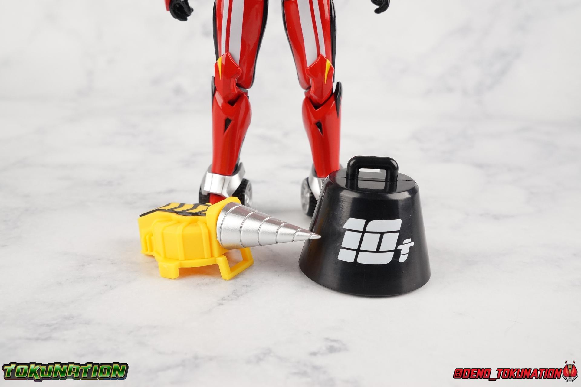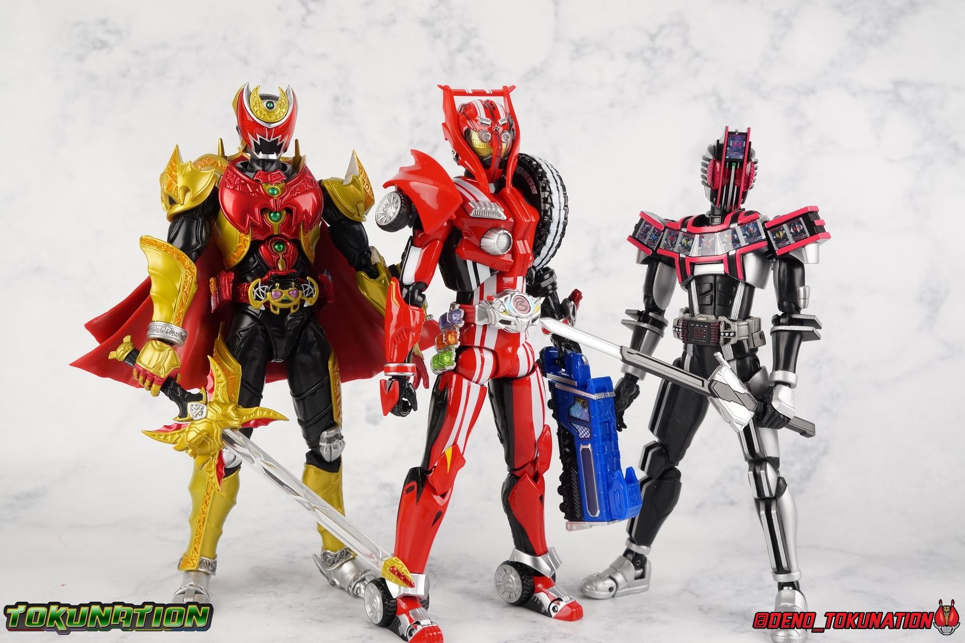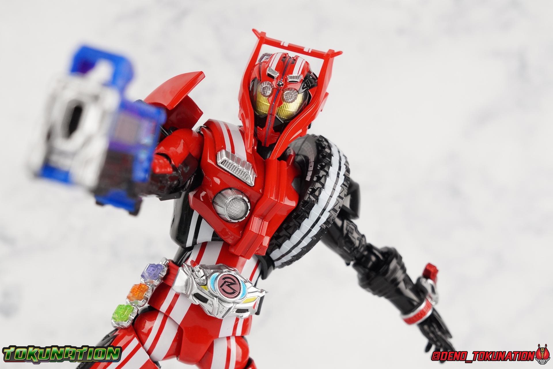 It's been a long time coming but we're proud to finally present a gallery of Kamen Rider Drive's final form with S.H. Figuarts Kamen Rider Drive Type Tridoron (Tire Blending Set)! Unlike many Heisei riders, Drive has yet to gain a new form that appears in a film after the end of his series, that also seems to exceed the power of his original final form. Den-O went from Liner to Super Climax, Fourze went from Cosmic to either of the two Fusion States, Wizard went from Infinity to Infinity All Dragon, etc. Plenty of riders have gotten yet another form that seems to exceed the power of their series' final form. Drive has only received one additional form of his own since the end of the TV series proper, and that was Kamen Rider Zero Drive, which is actually a precursor to even the most basic Drive form, Proto-Drive. So it's refreshing to see that the hulking power-house of Type Tridoron has yet to be outclassed! Let's dive into the figure below! **This gallery contains over 100 images! So it's split across 3 posts. Feel free to peruse them at your leisure. Packaging Type Tridoron continues the steadfast tradition of Drive packaging we've come to know and love over the last 2+ years. Those slick black boxes with a subtle racing theme and killer stock photos. Tridoron's box is a bit thicker in this case because it's specifically the Tire Blending (Tire Kakimazerl) release. So it includes several blended tires for accessories, making the trays a bit thicker. Main Figure It's pretty satisfying to finally have this bad boy in hand. Drive has shaped up to have one of my favorite toylines to date so I'm especially pleased we've finally made it to his final form. Drive Type Tridoron finally rounds out the slew of TV series forms for our heroes. We're left now with only a handful of releases to wait for. But as as is I'm pretty pleased with what we've gotten in Tridoron. Despite what appear to be cumbersome thick feet, the tire ankles actually serve their purpose very well. They balance this figure magnificently, and they still rock side to side a decent amount. Though wide angle stances aren't going to work as well as you'd probably like, the feet won't quite lay flat. The legs are the standard we've seen from this line so far, but the knee pads irk me to no end since they constantly pop off. The Drive Driver & Shift Car holster are identical to previous uses of those molds. The only difference with the driver is the new Type Tridoron read out. It still works just like any other release of the driver in that the face can be replaced. Sadly the arms disappoint me. They're asymmetrical both in design and functionality. They look great, but the left arm can only just manage a 90 degree angle. The second bend in the arm is neutered by the shift tire peg style molding on the forearm. The right arm fares a bit better, but not by much. The arms just aren't super dynamic. Luckily the shoulders are great, even though the Tire has been placed much further over for this outing the left arm doesn't suffer from that. The right is also free of obstruction thanks to the hinge that the fender/bumper part is on. The new chest detailing to replicate Tridoron's front bumper looks fantastic, It's a nice scale representation of what the Tridoron itself looks like. And of course there's that magnificent head. I know a lot of people didn't care for the elongated design itself, but I absolutely adore it. And those gorgeous compound eyes as well. But I think the one bit of detailing I might love most about this figure is the back side of it. It's designed to resemble the undercarriage of the Tridoron itself and it looks incredible. Right down to the small license plate type application on the back of Drive's head. All in all this is a fantastic mold. And I'm glad to see it's getting some mild reuse with the Heart Type Miracle release. I'd love to see another repaint of this mold out down the line but they'll need to make up a new V-cinema form for me to get something that awesome. Drive Type Tridoron is yet another fantastic figure in this great line. Accessories Since this is the more deluxe styled Tire Blending set, Type Tridoron comes with a number of accessories. Everything you could have hoped for: 5 - sets of additional hands. Each set has one red right hand and one black left hand. I love that the asymmetry of this suit carries all the way down to such a minute detail like the hands. You get basically everything you need with this kind of selection as well. 1 - Alternate Krim Head. This extra head represents Krim's control of this form, which was only really demonstrated in show a few times. Primarily we saw it in Drive's final clash with the Freeze Roidmude. The only difference with this head is the bright red compound eyes. It's an extra accessory that totally didn't have to be includde but that I'm very grateful to have as an option. 1 - Trailer Cannon. A straight repack of the accessory included with Type Formula."] It operates exactly the same as before and can accept Shift Cars. 1 - Shift Speed. An extra of this shift car to be used with the included Trailer Cannon, it can be slotted into the cannon just as you could with Type Formula. 1 - Shift Tridoron. An extra of this shift car to be used with the included Trailer Cannon, it can be slotted into the cannon just as you could with Type Formula. 1 - Attack 1 2 3 Tire. A blend of the Midnight Shadow, Max Flare, & Funky Spike Tires. As with any tire that's compatible with Type Tridoron, you just need to split it apart to attach it to his chest/shoulder. 1 - People Saver Tire. A blend of the Mad Doctor, Fire Braver & Justice Hunter Tires. As with any tire that's compatible with Type Tridoron, you just need to split it apart to attach it to his chest/shoulder. 1 - Construction Site (Kouji Genbar) Tire. A blend of the Rumble Dump, Spin Mixer, & Rolling Gravity Tires. As with any tire that's compatible with Type Tridoron, you just need to split it apart to attach it