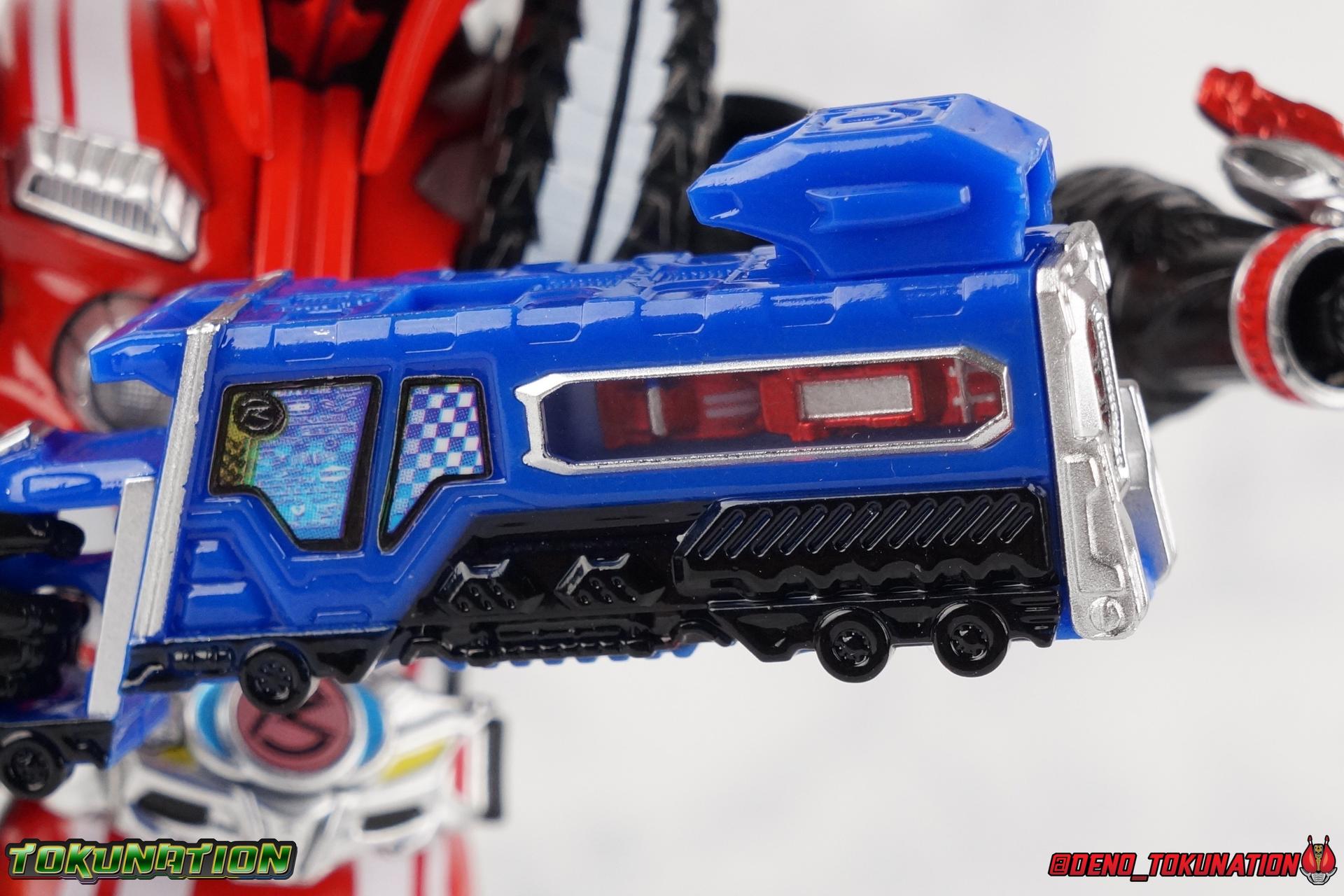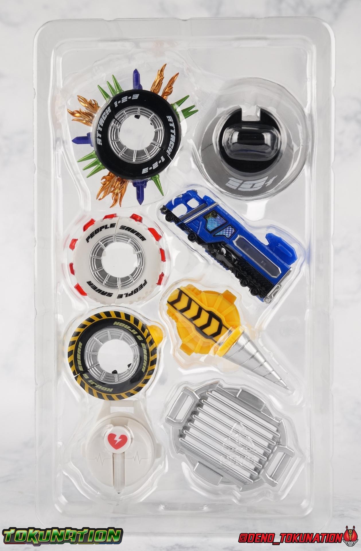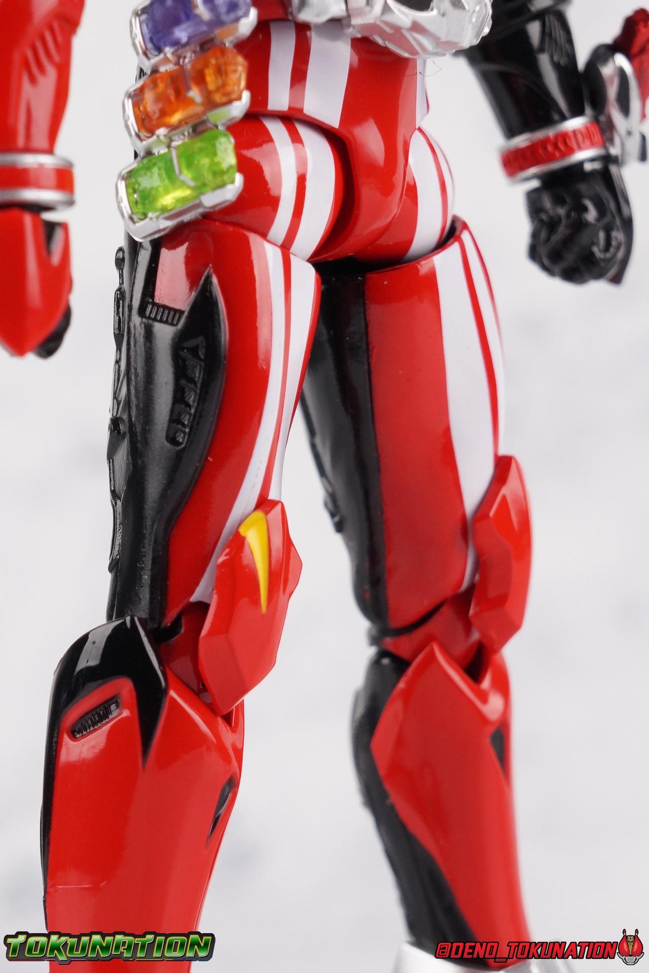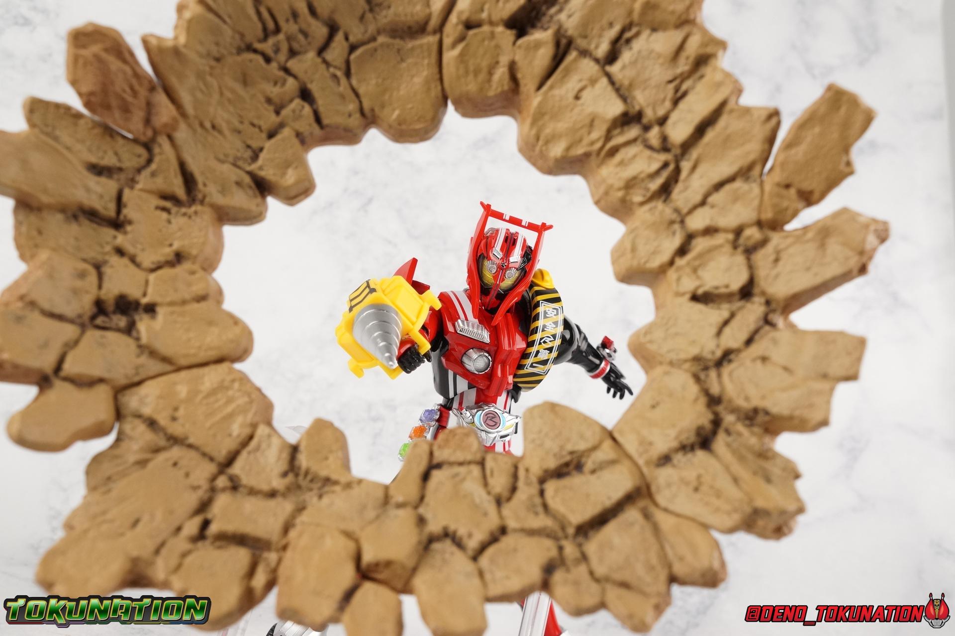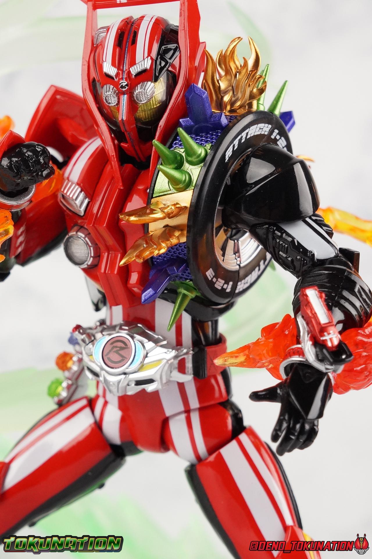 It's been a long time coming but we're proud to finally present a gallery of Kamen Rider Drive's final form with S.H. Figuarts Kamen Rider Drive Type Tridoron (Tire Blending Set)! Unlike many Heisei riders, Drive has yet to gain a new form that appears in a film after the end of his series, that also seems to exceed the power of his original final form. Den-O went from Liner to Super Climax, Fourze went from Cosmic to either of the two Fusion States, Wizard went from Infinity to Infinity All Dragon, etc. Plenty of riders have gotten yet another form that seems to exceed the power of their series' final form. Drive has only received one additional form of his own since the end of the TV series proper, and that was Kamen Rider Zero Drive, which is actually a precursor to even the most basic Drive form, Proto-Drive. So it's refreshing to see that the hulking power-house of Type Tridoron has yet to be outclassed! Let's dive into the figure below! **This gallery contains over 100 images! So it's split across 3 posts. Feel free to peruse them at your leisure. Packaging Type Tridoron continues the steadfast tradition of Drive packaging we've come to know and love over the last 2+ years. Those slick black boxes with a subtle racing theme and killer stock photos. Tridoron's box is a bit thicker in this case because it's specifically the Tire Blending (Tire Kakimazerl) release. So it includes several blended tires for accessories, making the trays a bit thicker. Main Figure It's pretty satisfying to finally have this bad boy in hand. Drive has shaped up to have one of my favorite toylines to date so I'm especially pleased we've finally made it to his final form. Drive Type Tridoron finally rounds out the slew of TV series forms for our heroes. We're left now with only a handful of releases to wait for. But as as is I'm pretty pleased with what we've gotten in Tridoron. Despite what appear to be cumbersome thick feet, the tire ankles actually serve their purpose very well. They balance this figure magnificently, and they still rock side to side a decent amount. Though wide angle stances aren't going to work as well as you'd probably like, the feet won't quite lay flat. The legs are the standard we've seen from this line so far, but the knee pads irk me to no end since they constantly pop off. The Drive Driver & Shift Car holster are identical to previous uses of those molds. The only difference with the driver is the new Type Tridoron read out. It still works just like any other release of the driver in that the face can be replaced. Sadly the arms disappoint me. They're asymmetrical both in design and functionality. They look great, but the left arm can only just manage a 90 degree angle. The second bend in the arm is neutered by the shift tire peg style molding on the forearm. The right arm fares a bit better, but not by much. The arms just aren't super dynamic. Luckily the shoulders are great, even though the Tire has been placed much further over for this outing the left arm doesn't suffer from that. The right is also free of obstruction thanks to the hinge that the fender/bumper part is on. The new chest detailing to replicate Tridoron's front bumper looks fantastic, It's a nice scale representation of what the Tridoron itself looks like. And of course there's that magnificent head. I know a lot of people didn't care for the elongated design itself, but I absolutely adore it. And those gorgeous compound eyes as well. But I think the one bit of detailing I might love most about this figure is the back side of it. It's designed to resemble the undercarriage of the Tridoron itself and it looks incredible. Right down to the small license plate type application on the back of Drive's head. All in all this is a fantastic mold. And I'm glad to see it's getting some mild reuse with the Heart Type Miracle release. I'd love to see another repaint of this mold out down the line but they'll need to make up a new V-cinema form for me to get something that awesome. Drive Type Tridoron is yet another fantastic figure in this great line. Accessories Since this is the more deluxe styled Tire Blending set, Type Tridoron comes with a number of accessories. Everything you could have hoped for: 5 - sets of additional hands. Each set has one red right hand and one black left hand. I love that the asymmetry of this suit carries all the way down to such a minute detail like the hands. You get basically everything you need with this kind of selection as well. 1 - Alternate Krim Head. This extra head represents Krim's control of this form, which was only really demonstrated in show a few times. Primarily we saw it in Drive's final clash with the Freeze Roidmude. The only difference with this head is the bright red compound eyes. It's an extra accessory that totally didn't have to be includde but that I'm very grateful to have as an option. 1 - Trailer Cannon. A straight repack of the accessory included with Type Formula."] It operates exactly the same as before and can accept Shift Cars. 1 - Shift Speed. An extra of this shift car to be used with the included Trailer Cannon, it can be slotted into the cannon just as you could with Type Formula. 1 - Shift Tridoron. An extra of this shift car to be used with the included Trailer Cannon, it can be slotted into the cannon just as you could with Type Formula. 1 - Attack 1 2 3 Tire. A blend of the Midnight Shadow, Max Flare, & Funky Spike Tires. As with any tire that's compatible with Type Tridoron, you just need to split it apart to attach it to his chest/shoulder. 1 - People Saver Tire. A blend of the Mad Doctor, Fire Braver & Justice Hunter Tires. As with any tire that's compatible with Type Tridoron, you just need to split it apart to attach it to his chest/shoulder. 1 - Construction Site (Kouji Genbar) Tire. A blend of the Rumble Dump, Spin Mixer, & Rolling Gravity Tires. As with any tire that's compatible with Type Tridoron, you just need to split it apart to attach it