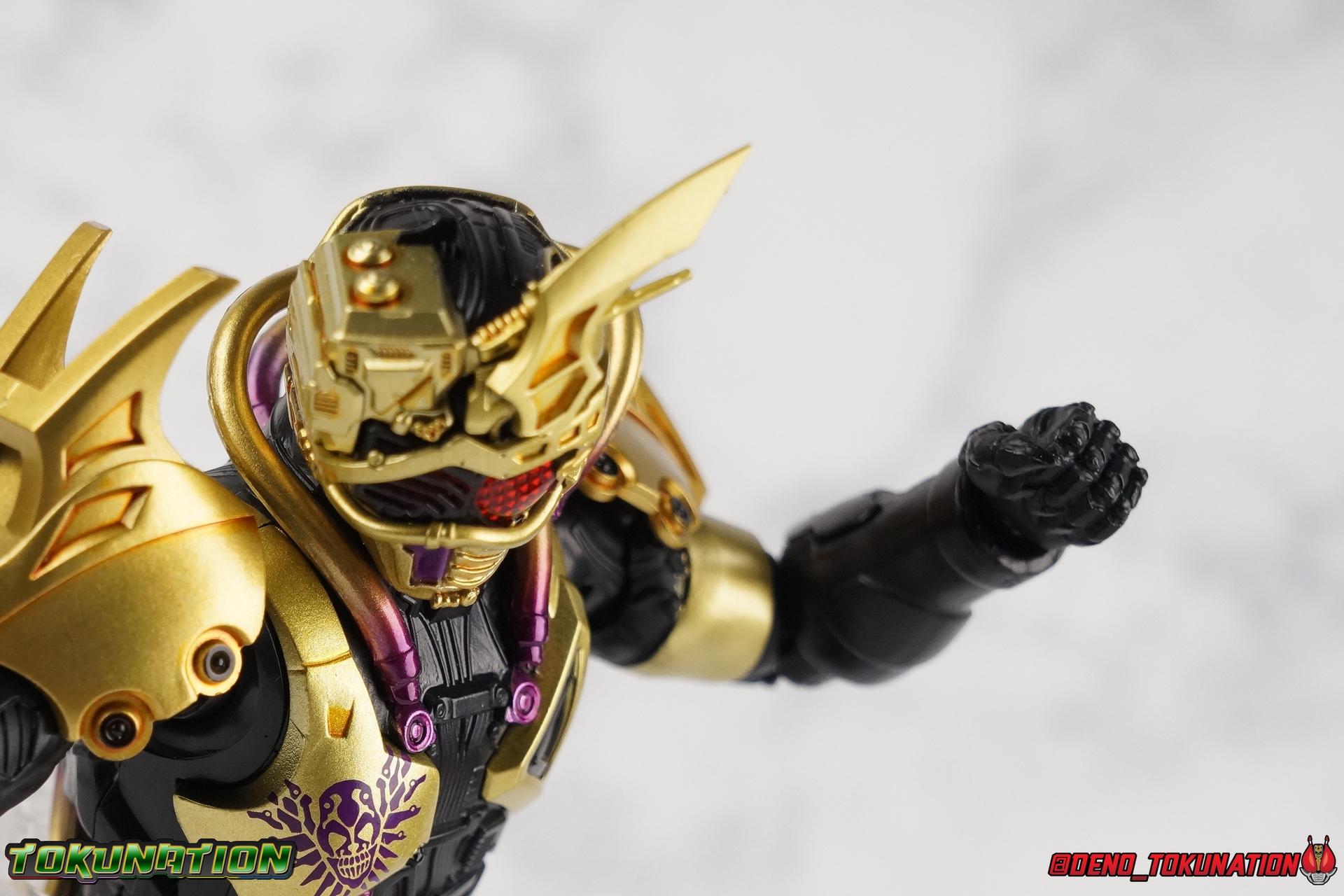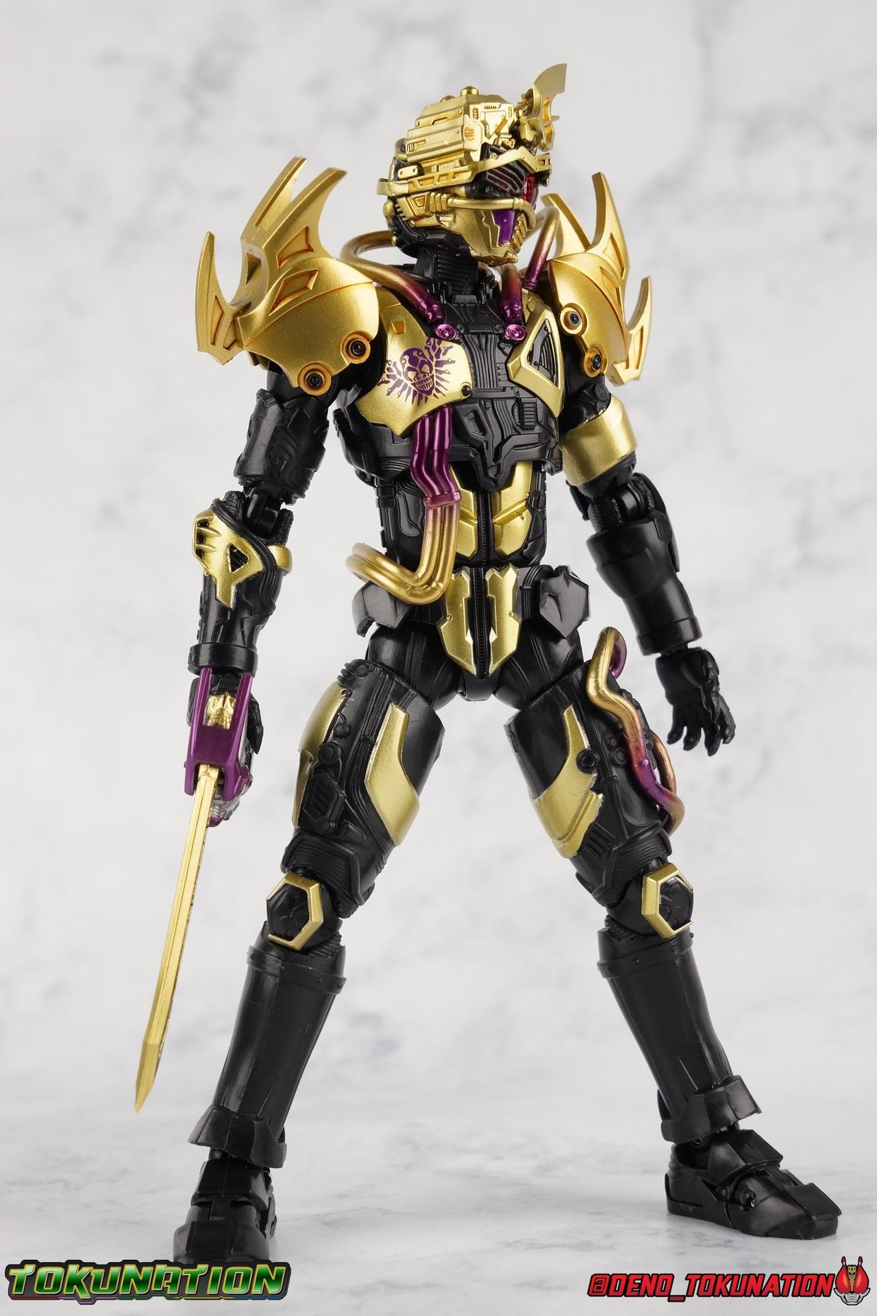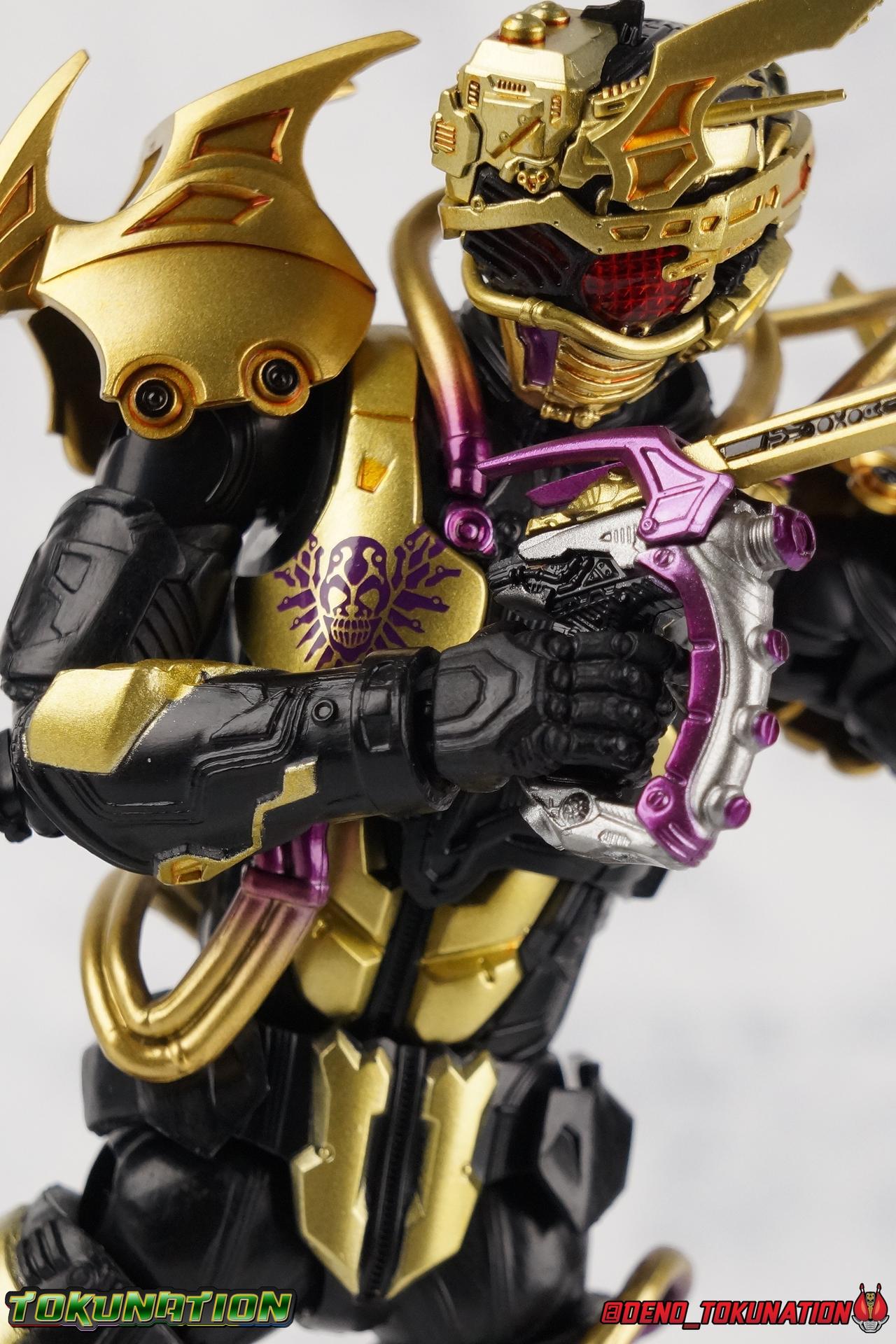 Faced with the inability to become a Kamen Rider anymore, Chase had to rely on a new dangerous power to fight Roidmudes again. The Rhino Super Viral Core unlocks the Super Evolution level abilities of a Roidmude. For Chase, this puts him on the same level as other evolved types like Heart & Medic. This viral core takes Chase's previous transformed state and upgrades him to Super Mashin Chaser! Packaging Super Mashin Chasers' packaging is identical to what we've seen from previous Drive releases. This box is very much in line with how Drive Tamashii Web Exclusive have looked with art across the front instead of a window, but otherwise this packaging resembles the original Chaser packaging quite a bit. Nothing really out of the ordinary. Main Figure This figure is a straight up repaint (with some retooling) of the original S.H. Figuarts Mashin Chaser mold, which was released nearly 2 years ago now. And it's actually the third release of this mold after Kamen Rider Super Dead Heat Drive. An absolutely brilliant figure in it's original state, this release is every bit as fantastic the third go around. A majority of my review will be identical to the last two, so if you'd like to skip ahead to pictures, feel free! At the time that I reviewed the original Chaser release this mold was all it's own, totally unique to other Drive releases. And even after 3 outings it's still a really interesting figure with lots of unique details, plenty that seem to shine in each particular release. And a lot of that is thanks to Chaser's incredible asymmetry. Super Mashin Chaser of course looks gorgeous even more so in this new form because of all that beautiful gold. While the original release was quite dark and mostly black, this one features a nice vibrant metallic gold with some minor purple accents. Back to the asymmetry though, Super Mashin Chaser is probably one of the more elaborately molded Figuarts ever. Each thigh is unique, both forearms, his chest, head, everything really. On the original release both shoulders were unique as well, but this release opts for symmetrical spiked shoulders and move's Chase's signature skull emblem to his chest. The head is by far the most interesting part of the figure, and like the shoulders it's also seen some retooling for new parts. There's just so much technical detailing put into it that it's astounding. I had a bit of a gapping issue through the middle of the head on my original Chaser, but this one seems to have mostly corrected it. And those eyes, just some of the best compound eyes I've ever seen on a rider figuart, aside from the incredible ones on Jungraider. This is just a lovely figure. By the way those tubes you see all over Chaser's body? They're made of an awesomely flexible plastic so you're much less likely to break them. Also because of the way the torso tubes are connected to Chaser they run the length of his torso and down to his waist but loop back up and attach to his back. So you don't have a rigid connection to the waist that would hinder movement. Sadly there are 2 things that hinder the arms. The shoulders. Though Super Mashin Chaser really does have a full range of motion, his shoulders are more poorly designed than the original. Though both have ball jointed pads on them the way the shoulders are designed prevents you from lifting the arms up and fully out perpendicular to the body, the original release could get much closer. The shoulders can be pulled down and out but when you try to bend them back and up the sheath around the shoulder impacts the torso. Rather than being able to put his arms in a 90 degree angle you get more of about 60 degrees. So it's a bit hard to get the arms posed more naturally out. Otherwise the figure is still incredibly solid, though I still have one minor complaint, Tires aren't compatible with his back. Just as with the previous two releases this one can't interact with the rest of the line in that fashion. Still disappointed by that. Like I said though this mold is mostly identical to the other two. So it can utilize the Busou Chaser set, but you will have to remove the forearm section as well as the back plate panel for them. And for obvious reason the additional forearm that was included in the Busou Chaser set is purple, so it won't match the gold of Super Mashin Chaser's original arm. Either way, you can work it, and the effect is well worth it. That set looked great on the first Chaser, but wow, with the extra pop of the gold? It's perfection. I'll most likely leave it displayed that way from now on. Accessories Super Mashin Chaser comes with basically the same things that the original release did with one addition. 3 - set of hands. Pretty standard fare here. Open hands for menacing stuff, one set to hold the Break Gunner in either hand, and a set of bike riding hands for the Ride Chaser. These are a seriously welcome inclusion as many modern figuarts have not always included them right off the bat. 1 - Break Gunner Super Viral Core Loaded Version. Initially I thought this was a straight repack, but this one is actually a remold. On the old Gunner the guard on top could be removed to allow Shift Cars/Viral Cores to attach. The guard came off with a chunk from the center of the Gunner. This version allows the top guard part to come off, but not the chunk from the middle of the gun. It's a very loose fit for the guard which is annoying, but considering you don't need to change out shift cars or cores much I guess it isn't a big deal. 1 - Rhino Super Viral Core. A brand new Viral Core, this one is pretty large and has a blade attached to the end, it is compatible with a Break Gunner in this form as well so you can recreate the final use of this core by Kamen Rider Chaser, when he destroyed the Angel Roidmude. As far as anything new from the Chaser V-Cinema goes, Super Mashin Chaser includes it. It's a little lite on accessories, but it's totally acceptable given that he comes with everything he really nee