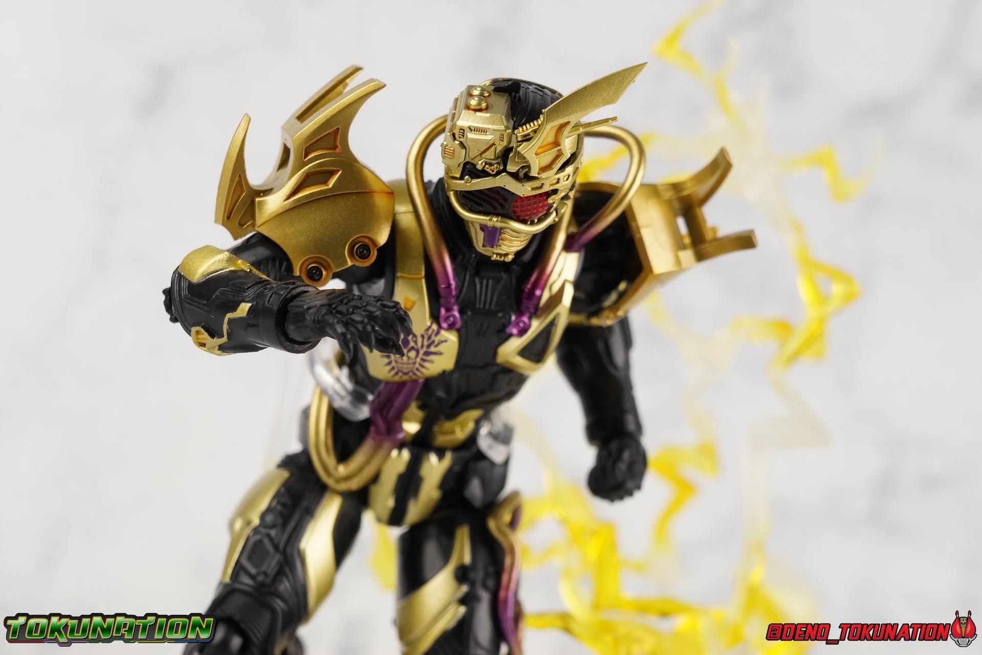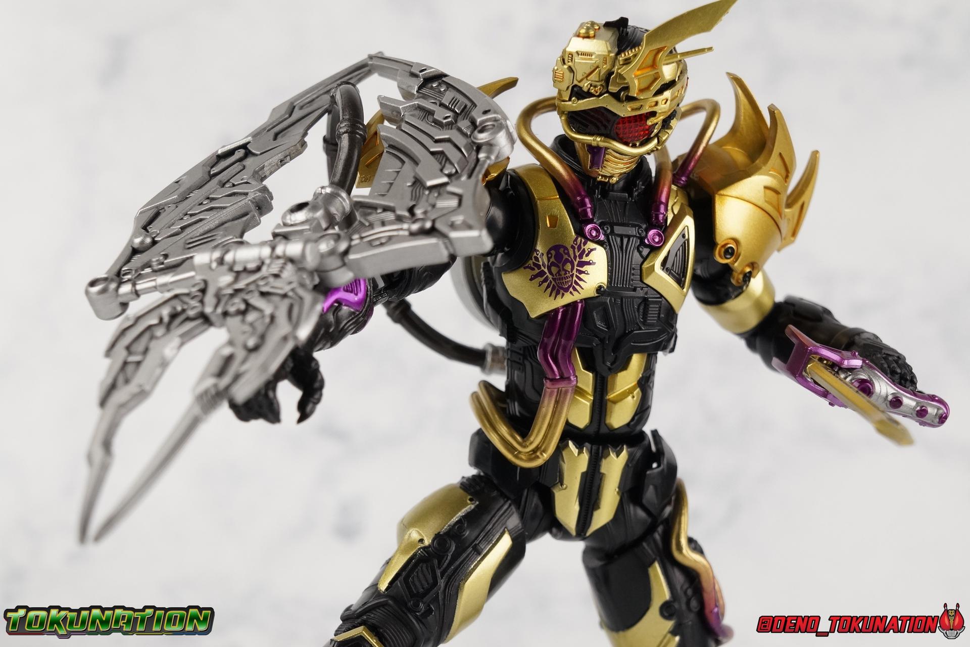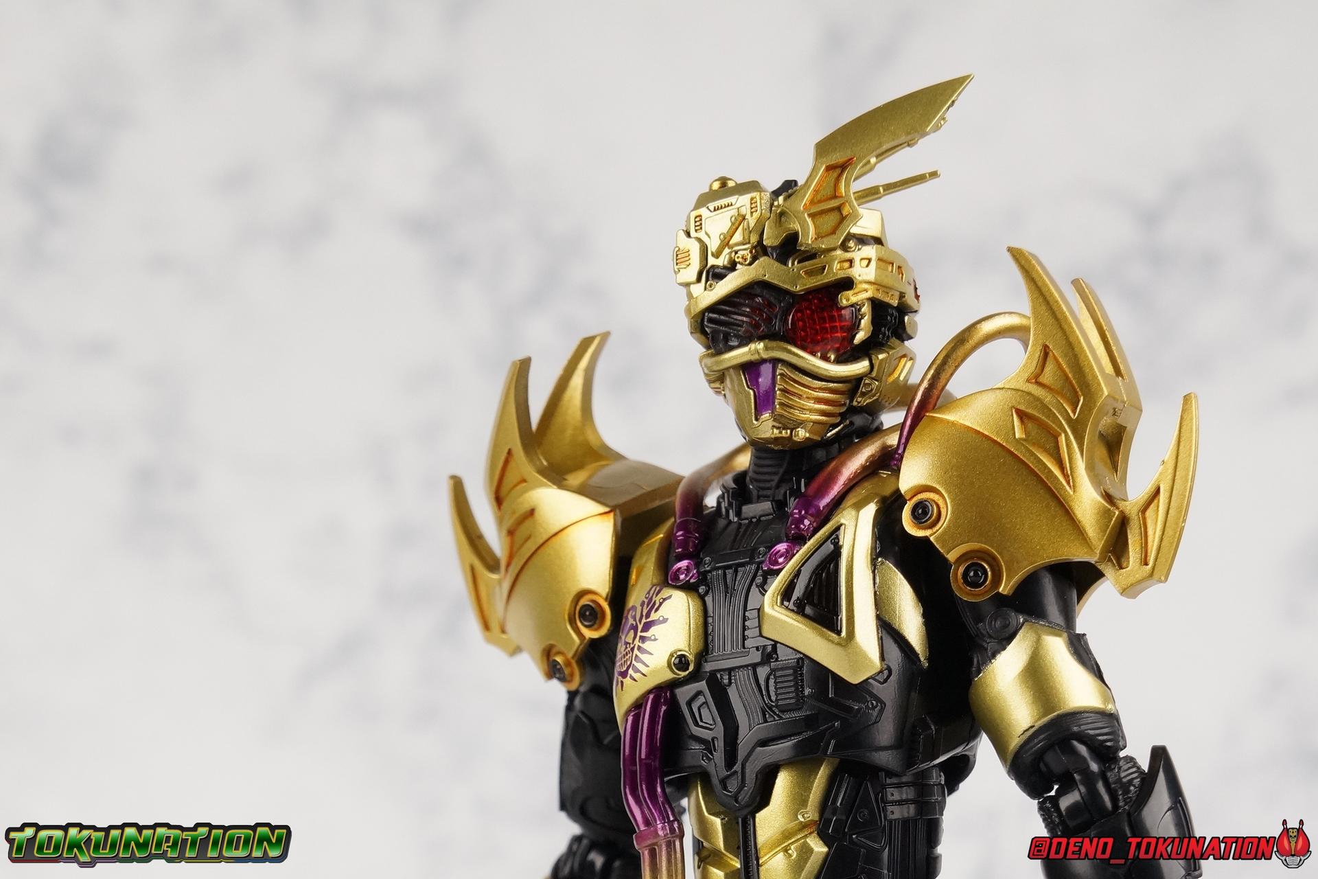 Faced with the inability to become a Kamen Rider anymore, Chase had to rely on a new dangerous power to fight Roidmudes again. The Rhino Super Viral Core unlocks the Super Evolution level abilities of a Roidmude. For Chase, this puts him on the same level as other evolved types like Heart & Medic. This viral core takes Chase's previous transformed state and upgrades him to Super Mashin Chaser! Packaging Super Mashin Chasers' packaging is identical to what we've seen from previous Drive releases. This box is very much in line with how Drive Tamashii Web Exclusive have looked with art across the front instead of a window, but otherwise this packaging resembles the original Chaser packaging quite a bit. Nothing really out of the ordinary. Main Figure This figure is a straight up repaint (with some retooling) of the original S.H. Figuarts Mashin Chaser mold, which was released nearly 2 years ago now. And it's actually the third release of this mold after Kamen Rider Super Dead Heat Drive. An absolutely brilliant figure in it's original state, this release is every bit as fantastic the third go around. A majority of my review will be identical to the last two, so if you'd like to skip ahead to pictures, feel free! At the time that I reviewed the original Chaser release this mold was all it's own, totally unique to other Drive releases. And even after 3 outings it's still a really interesting figure with lots of unique details, plenty that seem to shine in each particular release. And a lot of that is thanks to Chaser's incredible asymmetry. Super Mashin Chaser of course looks gorgeous even more so in this new form because of all that beautiful gold. While the original release was quite dark and mostly black, this one features a nice vibrant metallic gold with some minor purple accents. Back to the asymmetry though, Super Mashin Chaser is probably one of the more elaborately molded Figuarts ever. Each thigh is unique, both forearms, his chest, head, everything really. On the original release both shoulders were unique as well, but this release opts for symmetrical spiked shoulders and move's Chase's signature skull emblem to his chest. The head is by far the most interesting part of the figure, and like the shoulders it's also seen some retooling for new parts. There's just so much technical detailing put into it that it's astounding. I had a bit of a gapping issue through the middle of the head on my original Chaser, but this one seems to have mostly corrected it. And those eyes, just some of the best compound eyes I've ever seen on a rider figuart, aside from the incredible ones on Jungraider. This is just a lovely figure. By the way those tubes you see all over Chaser's body? They're made of an awesomely flexible plastic so you're much less likely to break them. Also because of the way the torso tubes are connected to Chaser they run the length of his torso and down to his waist but loop back up and attach to his back. So you don't have a rigid connection to the waist that would hinder movement. Sadly there are 2 things that hinder the arms. The shoulders. Though Super Mashin Chaser really does have a full range of motion, his shoulders are more poorly designed than the original. Though both have ball jointed pads on them the way the shoulders are designed prevents you from lifting the arms up and fully out perpendicular to the body, the original release could get much closer. The shoulders can be pulled down and out but when you try to bend them back and up the sheath around the shoulder impacts the torso. Rather than being able to put his arms in a 90 degree angle you get more of about 60 degrees. So it's a bit hard to get the arms posed more naturally out. Otherwise the figure is still incredibly solid, though I still have one minor complaint, Tires aren't compatible with his back. Just as with the previous two releases this one can't interact with the rest of the line in that fashion. Still disappointed by that. Like I said though this mold is mostly identical to the other two. So it can utilize the Busou Chaser set, but you will have to remove the forearm section as well as the back plate panel for them. And for obvious reason the additional forearm that was included in the Busou Chaser set is purple, so it won't match the gold of Super Mashin Chaser's original arm. Either way, you can work it, and the effect is well worth it. That set looked great on the first Chaser, but wow, with the extra pop of the gold? It's perfection. I'll most likely leave it displayed that way from now on. Accessories Super Mashin Chaser comes with basically the same things that the original release did with one addition. 3 - set of hands. Pretty standard fare here. Open hands for menacing stuff, one set to hold the Break Gunner in either hand, and a set of bike riding hands for the Ride Chaser. These are a seriously welcome inclusion as many modern figuarts have not always included them right off the bat. 1 - Break Gunner Super Viral Core Loaded Version. Initially I thought this was a straight repack, but this one is actually a remold. On the old Gunner the guard on top could be removed to allow Shift Cars/Viral Cores to attach. The guard came off with a chunk from the center of the Gunner. This version allows the top guard part to come off, but not the chunk from the middle of the gun. It's a very loose fit for the guard which is annoying, but considering you don't need to change out shift cars or cores much I guess it isn't a big deal. 1 - Rhino Super Viral Core. A brand new Viral Core, this one is pretty large and has a blade attached to the end, it is compatible with a Break Gunner in this form as well so you can recreate the final use of this core by Kamen Rider Chaser, when he destroyed the Angel Roidmude. As far as anything new from the Chaser V-Cinema goes, Super Mashin Chaser includes it. It's a little lite on accessories, but it's totally acceptable given that he comes with everything he really nee