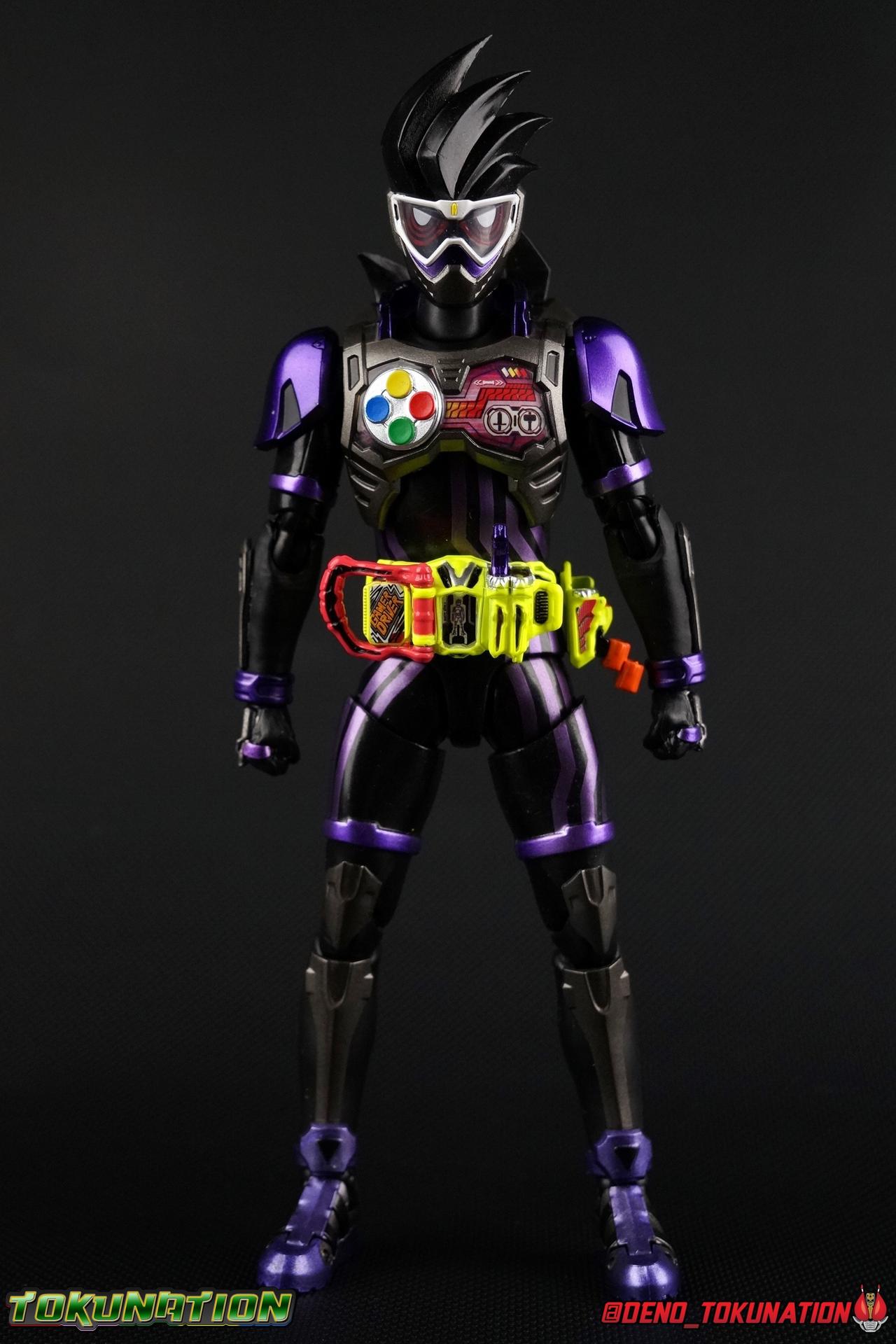 At long last, Kuroto Dan arrives in his original form! While we previously took a look at the exceedingly popular Level X/Dangerous Zombie release, now we have him as he was first presented in his Level 2 form! This figure, oddly, came out as a Tamashii Nations 2017 exclusive. While this was clearly done because of it's nature as a very simple repaint, as has been the trend with event exclusives of years past, the characters' immense popularity made this a less than ideal situation. In light of this Tamashii opted to make this figure available as a Lucky Draw Web Exclusive item at a later date as well, with the caveat that it would not include the Shakariki Sports bike. So of course I had to have this more complete version. So let's take a look at S.H. Figuarts Kamen Rider GenM Action Gamer Level 2 & Shakariki Sports! Packaging Now THIS is something interesting. Event exclusives have had some great box art over the last few years. See Dark Kabuto, Proto-Drive & Lemon Energy Baron. This year however, Tamashii Nations has gone over the top for their 10th anniversary. GenM comes packaged in a special 2-box slipcase set. The outer slipcase in mint green has a fantastic stock photo of the figure and bike that I think looks really sharp. The inner packaging is two separate boxes, one containing GenM, and one containing the Shakariki bike. GenM's box is identical to what we we'll see with the Web Exclusive release coming next year and fits in line with the rest of the toyline perfectly. The Shakariki bike comes in a separate purple monotone box that I really like. It reminds me of the way the Tires & Effect bonuses were packaged for Kamen Rider Driver, though obviously on a larger scale this time. Main Figure We're back once again with a mold we know all too well! The original Ex-Aid mold has been used as a basis for a majority of figures in the line so far including Ex-Aid himself as well as Snipe, Brave, their upgrades, and the Mighty Brothers. But very specifically the figure we're looking at today, Genm Level 2, is a 100% repaint of Ex-Aid Level 2 with no physical alterations whatsoever. GenM is a pretty lavish repaint of this original mold, and a dead sexy one. But the physical portions of this review will be a carbon copy of what I wrote for Ex-Aid. Feel free to skip down a bit if you like. GenM Action Gamer Level 2 utilizes the familiar Mighty Action X body type we've come to know and love. Bringing with it all the meticulous molded details and paint apps we've previously seen before. TMuch as with Ex-Aid, this figure is just lavishly executed. From the Ground up this body type is a sold build. Physically I still nitpick the ankles on this mold, they still feel a bit limited, especially moving forward. And getting GenM into a good pose is a total necessity for his character. So you really have to work with these feet. The knees have a great bend that helps add to the general athletic platformer theme of the figure. Sadly, as with GenM Level X, I find the paint apps on the legs, and in several other places to be a bit sloppy. There are plenty of flecks on the thighs and minor defects that are an annoyance on an expensive event exclusive such as this one. The Gamer Driver for this figure is the same standard one we've seen close to 10 times now. I still think it's an incredible to-scale replica. The appropriate readout and Game title have been added to this release. The Driver handle can flip shut, thus hiding the rider read out on the front screen as well. The right of the driver has 2 slots for Gasshats. One is already attached in the form of the Proto-Mighty Action X Gasshat. As is standard this is a dummy Gashat that can be reattached to any compatible Driver, holster, or Gashacon weapon. To the right of the driver, is a Gashat holster. There are 2 slots for extra Gasshats as well as 1 slot for a Critical Finish to be inserted. As with Ex-Aid, GenM's chest detailing is magnificent. And unlike the Mighty Brothers the interior label used for the Rider Gauge is flawless. The paint apps on the outer layer are crisp and clear here for the most part as well. I should point out that much like Brave having an incorrectly colored collar piece, GenM too is wrong. His shoulder/collar area should be purple but has instead been left silver. On the flip side of the torso is the deactivated Level 1 head. It's a bit stylized and shrunk down, but that's as it should be if TV CG magic could really work in toy form. Not to be forgotten are the arms, which admittedly only have one flaw that I'm truly bothered by, and that's the shoulder pads. Not because they impact the articulation, but because they pop off easily when fully extending the arms. I had the same problem with my Ex-Aid though oddly not with the Mighty Brothers. But it's a minor issue. The wrists are solid, the elbows fully functional and the bicep swivel welcome as always. Finally that brings us to the head. This is where the most egregious paint issues are present. The white paint used for the visor is just pitifully applied. Lot's of hazy overspray around the edges and a ton of flecks on the visor itself. The "hair" of the helmet likewise has a number of white flecks that really detract from it's overall look. Otherwise I think the shape of the head is generally great, and the hair looks very solid. Lots of people took issue with this head on the original Ex-Aid release, but I've always thought it looked spot on. Accessories 4 - set of hands. 3 varieties of open palm hands and 1 set for holding things, weapons or bike handles. 1 - set of Gashacon Bug Visor parts. This accessory is actually split into a few pieces though out of box it comes in the Chainsaw Eliminator mode. Although the saw form is not the standard mode of the weapon. The Bug Visor itself is just a plate in the center that makes up most of the mass of the accessory. It's attached to a long board with the saw extended on one end. The EXP Grip Knuckle is likewise a separate pa