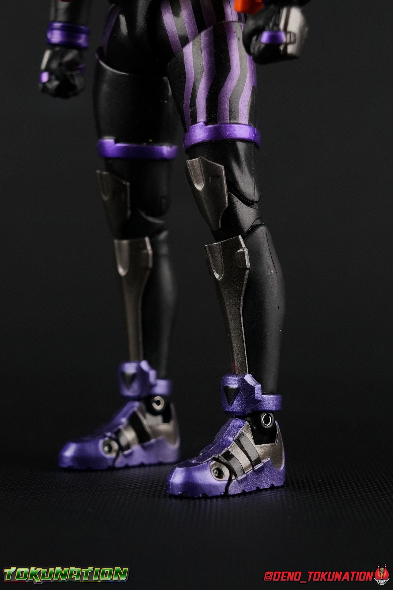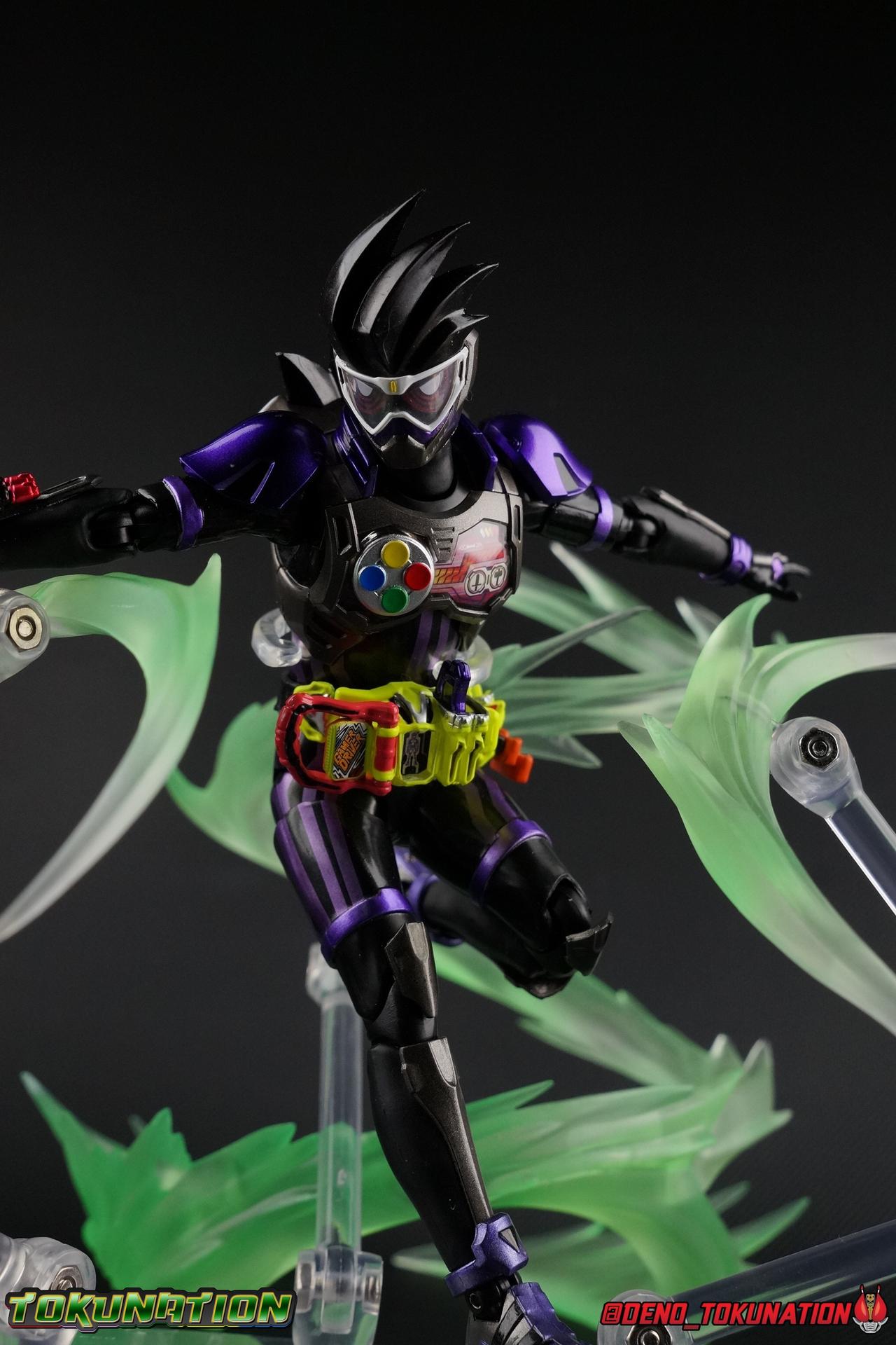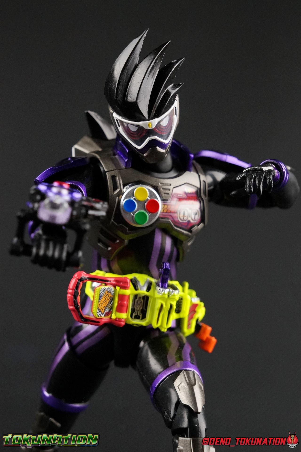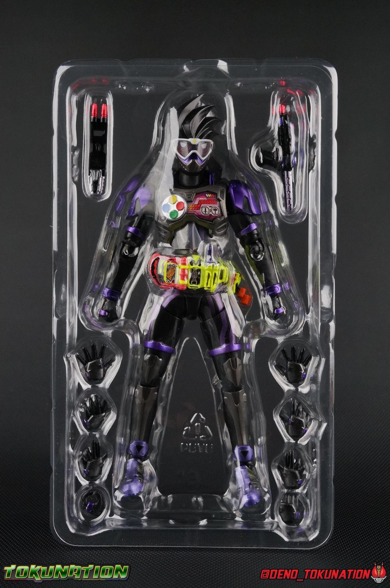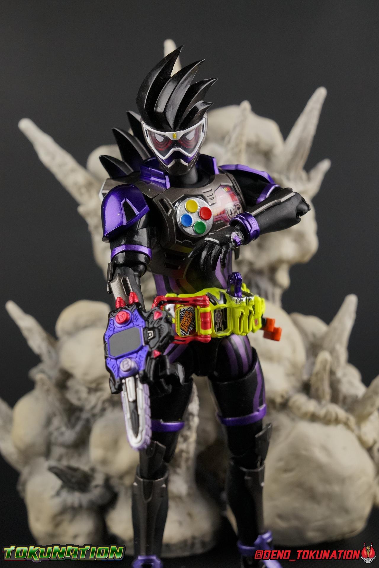At long last, Kuroto Dan arrives in his original form! While we previously took a look at the exceedingly popular Level X/Dangerous Zombie release, now we have him as he was first presented in his Level 2 form! This figure, oddly, came out as a Tamashii Nations 2017 exclusive. While this was clearly done because of it's nature as a very simple repaint, as has been the trend with event exclusives of years past, the characters' immense popularity made this a less than ideal situation. In light of this Tamashii opted to make this figure available as a Lucky Draw Web Exclusive item at a later date as well, with the caveat that it would not include the Shakariki Sports bike. So of course I had to have this more complete version. So let's take a look at S.H. Figuarts Kamen Rider GenM Action Gamer Level 2 & Shakariki Sports! Packaging Now THIS is something interesting. Event exclusives have had some great box art over the last few years. See Dark Kabuto, Proto-Drive & Lemon Energy Baron. This year however, Tamashii Nations has gone over the top for their 10th anniversary. GenM comes packaged in a special 2-box slipcase set. The outer slipcase in mint green has a fantastic stock photo of the figure and bike that I think looks really sharp. The inner packaging is two separate boxes, one containing GenM, and one containing the Shakariki bike. GenM's box is identical to what we we'll see with the Web Exclusive release coming next year and fits in line with the rest of the toyline perfectly. The Shakariki bike comes in a separate purple monotone box that I really like. It reminds me of the way the Tires & Effect bonuses were packaged for Kamen Rider Driver, though obviously on a larger scale this time. Main Figure We're back once again with a mold we know all too well! The original Ex-Aid mold has been used as a basis for a majority of figures in the line so far including Ex-Aid himself as well as Snipe, Brave, their upgrades, and the Mighty Brothers. But very specifically the figure we're looking at today, Genm Level 2, is a 100% repaint of Ex-Aid Level 2 with no physical alterations whatsoever. GenM is a pretty lavish repaint of this original mold, and a dead sexy one. But the physical portions of this review will be a carbon copy of what I wrote for Ex-Aid. Feel free to skip down a bit if you like. GenM Action Gamer Level 2 utilizes the familiar Mighty Action X body type we've come to know and love. Bringing with it all the meticulous molded details and paint apps we've previously seen before. TMuch as with Ex-Aid, this figure is just lavishly executed. From the Ground up this body type is a sold build. Physically I still nitpick the ankles on this mold, they still feel a bit limited, especially moving forward. And getting GenM into a good pose is a total necessity for his character. So you really have to work with these feet. The knees have a great bend that helps add to the general athletic platformer theme of the figure. Sadly, as with GenM Level X, I find the paint apps on the legs, and in several other places to be a bit sloppy. There are plenty of flecks on the thighs and minor defects that are an annoyance on an expensive event exclusive such as this one. The Gamer Driver for this figure is the same standard one we've seen close to 10 times now. I still think it's an incredible to-scale replica. The appropriate readout and Game title have been added to this release. The Driver handle can flip shut, thus hiding the rider read out on the front screen as well. The right of the driver has 2 slots for Gasshats. One is already attached in the form of the Proto-Mighty Action X Gasshat. As is standard this is a dummy Gashat that can be reattached to any compatible Driver, holster, or Gashacon weapon. To the right of the driver, is a Gashat holster. There are 2 slots for extra Gasshats as well as 1 slot for a Critical Finish to be inserted. As with Ex-Aid, GenM's chest detailing is magnificent. And unlike the Mighty Brothers the interior label used for the Rider Gauge is flawless. The paint apps on the outer layer are crisp and clear here for the most part as well. I should point out that much like Brave having an incorrectly colored collar piece, GenM too is wrong. His shoulder/collar area should be purple but has instead been left silver. On the flip side of the torso is the deactivated Level 1 head. It's a bit stylized and shrunk down, but that's as it should be if TV CG magic could really work in toy form. Not to be forgotten are the arms, which admittedly only have one flaw that I'm truly bothered by, and that's the shoulder pads. Not because they impact the articulation, but because they pop off easily when fully extending the arms. I had the same problem with my Ex-Aid though oddly not with the Mighty Brothers. But it's a minor issue. The wrists are solid, the elbows fully functional and the bicep swivel welcome as always. Finally that brings us to the head. This is where the most egregious paint issues are present. The white paint used for the visor is just pitifully applied. Lot's of hazy overspray around the edges and a ton of flecks on the visor itself. The "hair" of the helmet likewise has a number of white flecks that really detract from it's overall look. Otherwise I think the shape of the head is generally great, and the hair looks very solid. Lots of people took issue with this head on the original Ex-Aid release, but I've always thought it looked spot on. Accessories 4 - set of hands. 3 varieties of open palm hands and 1 set for holding things, weapons or bike handles. 1 - set of Gashacon Bug Visor parts. This accessory is actually split into a few pieces though out of box it comes in the Chainsaw Eliminator mode. Although the saw form is not the standard mode of the weapon. The Bug Visor itself is just a plate in the center that makes up most of the mass of the accessory. It's attached to a long board with the saw extended on one end. The EXP Grip Knuckle is likewise a separate pa