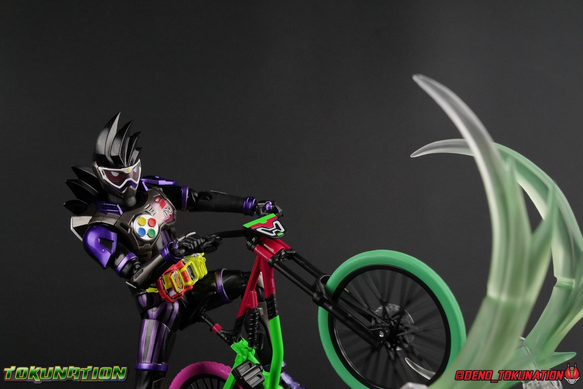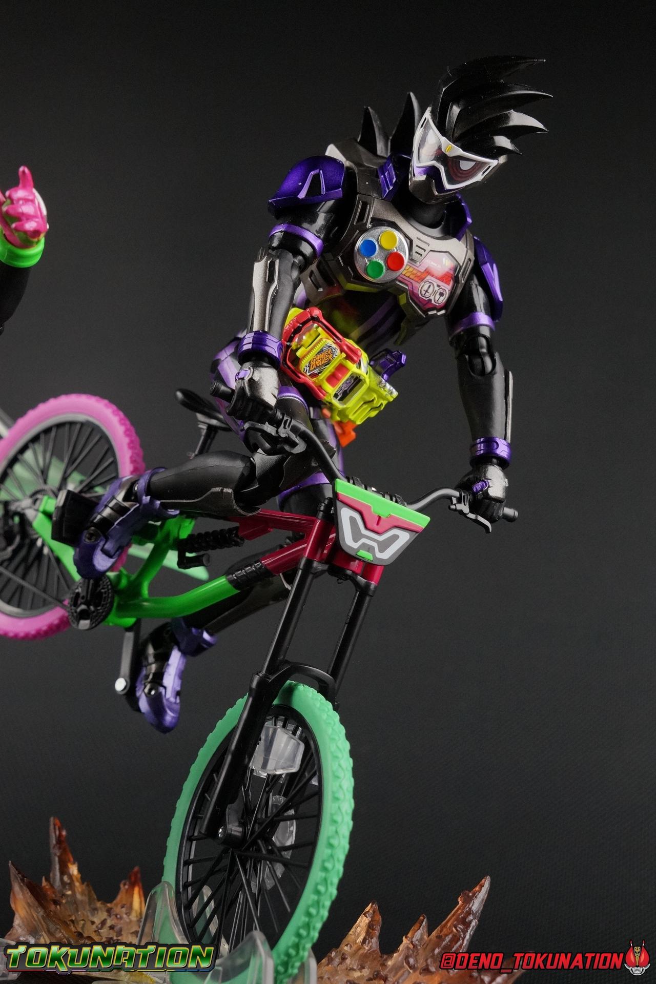 At long last, Kuroto Dan arrives in his original form! While we previously took a look at the exceedingly popular Level X/Dangerous Zombie release, now we have him as he was first presented in his Level 2 form! This figure, oddly, came out as a Tamashii Nations 2017 exclusive. While this was clearly done because of it's nature as a very simple repaint, as has been the trend with event exclusives of years past, the characters' immense popularity made this a less than ideal situation. In light of this Tamashii opted to make this figure available as a Lucky Draw Web Exclusive item at a later date as well, with the caveat that it would not include the Shakariki Sports bike. So of course I had to have this more complete version. So let's take a look at S.H. Figuarts Kamen Rider GenM Action Gamer Level 2 & Shakariki Sports! Packaging Now THIS is something interesting. Event exclusives have had some great box art over the last few years. See Dark Kabuto, Proto-Drive & Lemon Energy Baron. This year however, Tamashii Nations has gone over the top for their 10th anniversary. GenM comes packaged in a special 2-box slipcase set. The outer slipcase in mint green has a fantastic stock photo of the figure and bike that I think looks really sharp. The inner packaging is two separate boxes, one containing GenM, and one containing the Shakariki bike. GenM's box is identical to what we we'll see with the Web Exclusive release coming next year and fits in line with the rest of the toyline perfectly. The Shakariki bike comes in a separate purple monotone box that I really like. It reminds me of the way the Tires & Effect bonuses were packaged for Kamen Rider Driver, though obviously on a larger scale this time. Main Figure We're back once again with a mold we know all too well! The original Ex-Aid mold has been used as a basis for a majority of figures in the line so far including Ex-Aid himself as well as Snipe, Brave, their upgrades, and the Mighty Brothers. But very specifically the figure we're looking at today, Genm Level 2, is a 100% repaint of Ex-Aid Level 2 with no physical alterations whatsoever. GenM is a pretty lavish repaint of this original mold, and a dead sexy one. But the physical portions of this review will be a carbon copy of what I wrote for Ex-Aid. Feel free to skip down a bit if you like. GenM Action Gamer Level 2 utilizes the familiar Mighty Action X body type we've come to know and love. Bringing with it all the meticulous molded details and paint apps we've previously seen before. TMuch as with Ex-Aid, this figure is just lavishly executed. From the Ground up this body type is a sold build. Physically I still nitpick the ankles on this mold, they still feel a bit limited, especially moving forward. And getting GenM into a good pose is a total necessity for his character. So you really have to work with these feet. The knees have a great bend that helps add to the general athletic platformer theme of the figure. Sadly, as with GenM Level X, I find the paint apps on the legs, and in several other places to be a bit sloppy. There are plenty of flecks on the thighs and minor defects that are an annoyance on an expensive event exclusive such as this one. The Gamer Driver for this figure is the same standard one we've seen close to 10 times now. I still think it's an incredible to-scale replica. The appropriate readout and Game title have been added to this release. The Driver handle can flip shut, thus hiding the rider read out on the front screen as well. The right of the driver has 2 slots for Gasshats. One is already attached in the form of the Proto-Mighty Action X Gasshat. As is standard this is a dummy Gashat that can be reattached to any compatible Driver, holster, or Gashacon weapon. To the right of the driver, is a Gashat holster. There are 2 slots for extra Gasshats as well as 1 slot for a Critical Finish to be inserted. As with Ex-Aid, GenM's chest detailing is magnificent. And unlike the Mighty Brothers the interior label used for the Rider Gauge is flawless. The paint apps on the outer layer are crisp and clear here for the most part as well. I should point out that much like Brave having an incorrectly colored collar piece, GenM too is wrong. His shoulder/collar area should be purple but has instead been left silver. On the flip side of the torso is the deactivated Level 1 head. It's a bit stylized and shrunk down, but that's as it should be if TV CG magic could really work in toy form. Not to be forgotten are the arms, which admittedly only have one flaw that I'm truly bothered by, and that's the shoulder pads. Not because they impact the articulation, but because they pop off easily when fully extending the arms. I had the same problem with my Ex-Aid though oddly not with the Mighty Brothers. But it's a minor issue. The wrists are solid, the elbows fully functional and the bicep swivel welcome as always. Finally that brings us to the head. This is where the most egregious paint issues are present. The white paint used for the visor is just pitifully applied. Lot's of hazy overspray around the edges and a ton of flecks on the visor itself. The "hair" of the helmet likewise has a number of white flecks that really detract from it's overall look. Otherwise I think the shape of the head is generally great, and the hair looks very solid. Lots of people took issue with this head on the original Ex-Aid release, but I've always thought it looked spot on. Accessories 4 - set of hands. 3 varieties of open palm hands and 1 set for holding things, weapons or bike handles. 1 - set of Gashacon Bug Visor parts. This accessory is actually split into a few pieces though out of box it comes in the Chainsaw Eliminator mode. Although the saw form is not the standard mode of the weapon. The Bug Visor itself is just a plate in the center that makes up most of the mass of the accessory. It's attached to a long board with the saw extended on one end. The EXP Grip Knuckle is likewise a separate pa