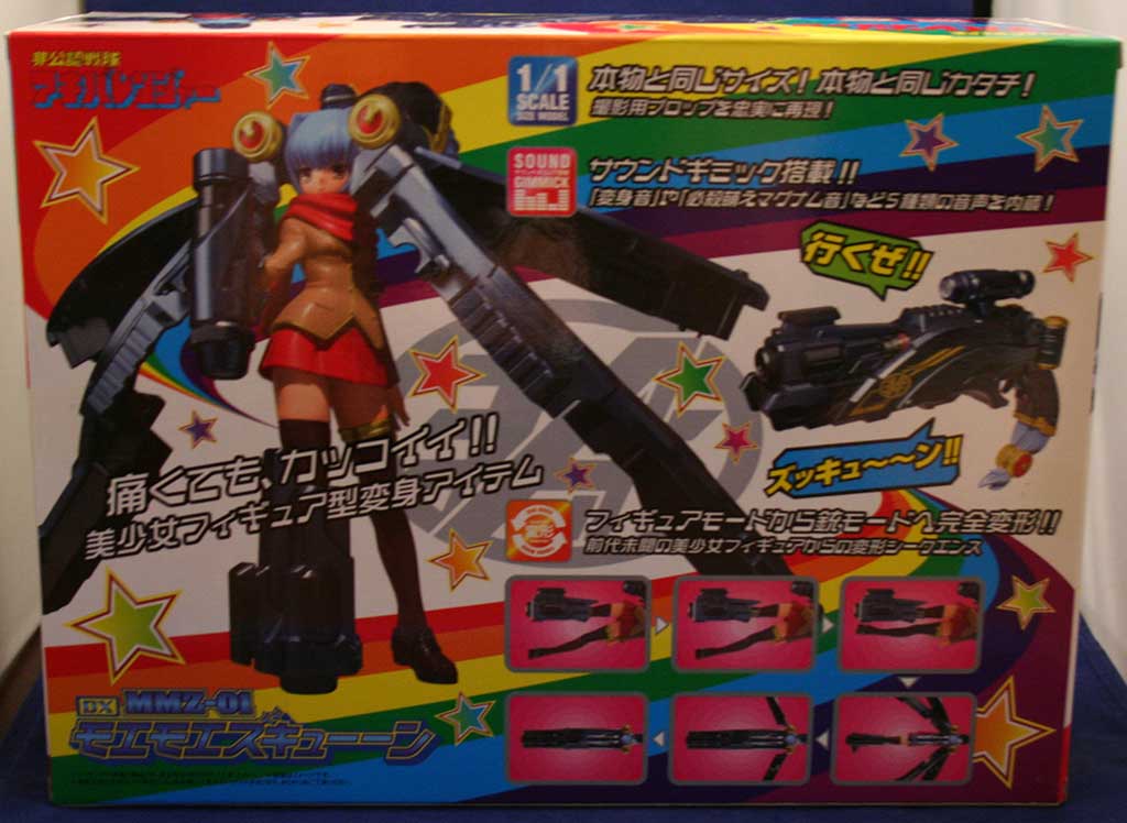 MMZ-01 (Moe Moe Z-Cune): The Akibarangers assume their fighting forms by using a device known as the MMZ-01, a doll-like object which transforms into the Akibarangers' main firearm weapon, with the activation call of "Jumoso" that links their minds so they can fight within the same delusion. The MMZ-01s double as communication devices between the Akibarangers and Hiroyo.