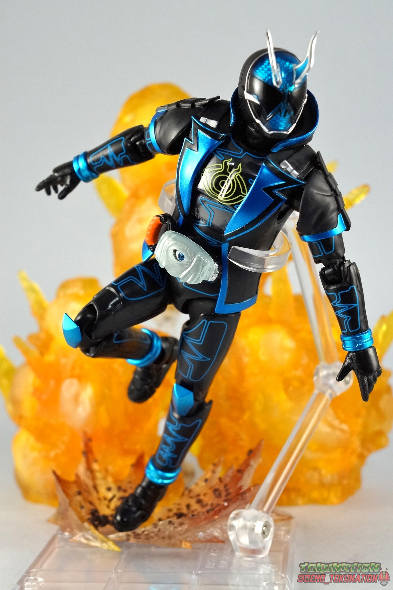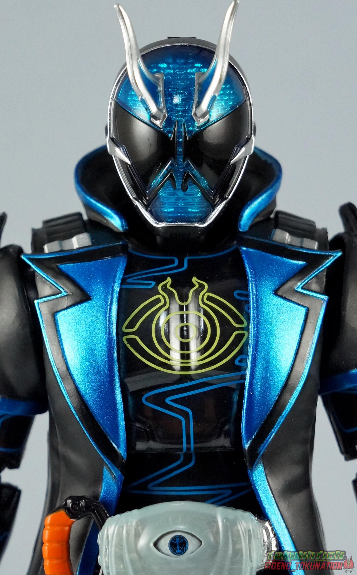 The second release in the fledgling Kamen Rider Ghost subline of S.H. Figuarts is here! The super cool secondary rider of the series, S.H. Figuarts Kamen Rider Specter! And he's brought with him a nice first run bonus much like his predecessor Ghost. ** This figure is part for part identical to Ghost Ore Damashii aside from accessories, paint, and the dual horns. Most of this review will be very similar to that one. Packaging As with Ghost, the packaging is that of the very common slim box popularized during Kamen Rider Drive's run. Same kind of boring design really. This 1st release of the figuart features a foil sticker indicating it includes the 1st run bonus Eyecons. But all in all a very standard box. Main Figure Like many collectors I thought Ghost Ore Damashii would be a disappointment in hand. And who could blame you? At the time of his release there were negative reviews and more than a few stories about it's hit or miss QC. But once I had Ghost in hand I really was charmed by his design. He wasn't executed perfectly, but he worked quite well and had a ton of personality. Now I'm reexamining that same mold and those same feelings with Kamen Rider Specter. Specter is painted in a combination of matte black & almost electric blue that manages to be applied more accurately than Ghosts' paint apps despite them being in the same places. The finer details lining the glossy translucent parts of the armor are top notch. No imperfections at all. Likewise the ghost emblem on his chest is spot on and the head couldn't be more perfect. Specter's head is a gorgeous deep & reflective blue that captures light magnificently. The toy manages to capture a bit more of the menace in his facial design than I think the show suit communicates. The Ghost Driver is the same bland opaque blue and like it's DX counterpart this opaque face plate can be removed to expose the toothy monstrous face beneath. A Specter Ghost Eyecon is present but non-removable as it's sculpted in. It is however painted pretty well for something at that scale. Now lets talk about how Specter moves. Again, its fair to to talk about the limitations of this mold. But first the positives. Specter's leg design provides a full range of motion stunted only by the ankle tilts being more limited by the ankle cuff. If they had a bit more forward/back room to move then they'd be great. The hips just need to be pulled down and rotated a little to clear the waste which is a relief, drop down hips are something I'm not a fan of normally. But here's the biggest issue the figure has, the waist. While it certainly is possible to rotate it side to side, the flawed design of the waist also means you have to apply excessive for to the joint to make it move. This can make a scary loud clicking sound and can in some cases break the waist. This has happened more than once to peoples' Ghosts. It could happen with Specter though I haven't heard such stories yet. I can't really get Specter's waist to rotate that much and I certainly don't plan to force it. Liberal applications of shock oil to that joint seem to be the most popular fix. His Ghost Parka contributes to the restriction of the waist when it impacts the Driver, but more particularly it limits the upper body and shoulders. The arms themselves are actually pretty well thought out and clearly made better than my Ghost, whose arms would fall off simply by being looked at. The weakest piece of their design is the soft rubber shoulder sections. The "tabs" on the end are made of soft rubber so they don't get in the way while posing, as you can tuck the shoulders sort of up into the torso recesses. But they get bent very very easily. So watch out for those. I have to mention that the wrist cuffs also nix just about any dynamic use of the hands When the hand is plugged on to the wrist it sits nearly flush so there isn't much room to work with. Finally Specter's head, as mentioned above, is perfect. But the molded folded down hoodie on his shoulders really limits how it can move side to side. Forcing him to look up when turned to one side or the other. The included normal hoodie accessory fixes that issue somewhat. Kamen Rider Specter is more or less the spitting image of his TV counterpart and a great scale representation of a suit that I didn't particularly care for. Poseability issues aside Specter will fit right into your collection and certainly into your Ghost display. I've included some comparison shots with previous Heisei Secondary riders for fun as well; Mach, Baron, Beast, Meteor, Birth, Accel, Diend. Accessories Retail releases tend to come with a pretty nice array of accessories these days and Specter is pretty on par: 3 - sets of additional hands. 2 different types of "holding things" pair for use with his weapon. The "trigger finger" pair is almost pointless though. The grip is so loose and his weapon so long & heavy that he can barely maintain a pose using them. The other pair of hands are splayed open for dramatic poses. 1 - Gan Gun Hand. Unlike Ghost's Gan Gun Saber this one doesn't really transform per se. Even in show the barely plausible Gun Mode is hardly different from the Rod Mode. Basically you only need to slide up the orange hand grip and close the fingers for Gun Mode. Neither form is very impressive and it winds up being a bit more like a big bat than anything. It's painted well but ultimately does nothing and is incredibly difficult to pose Specter with because of his shoulders and large broad chest. As mentioned above the hands included to hold this thing could have a tighter grip as well. 1 - hoodie (up). Intended to replace the default folded down hoodie, this piece can be used by removing the standard one as well as a small panel on the top of Specter's head. Then just plug this hoodie down on. Weirdly this hoodie, which totally surrounds his head, provides far far better neck movement. It's free floating so it's not attached to anything but it completely covers the hea