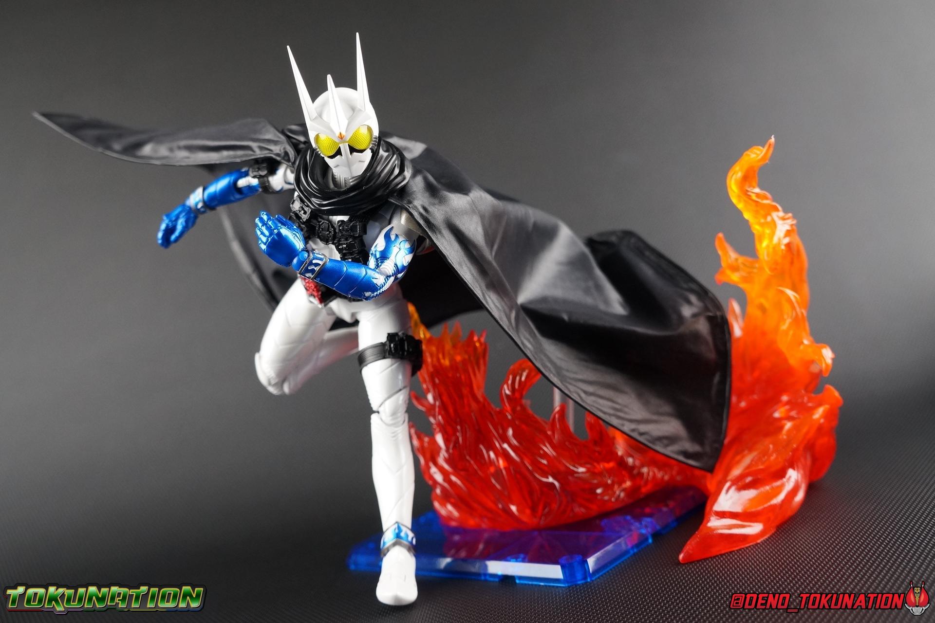 Katsumi Daido, the Necro-Over that preceded the beginning of the Gaia Memory Project, and member of NEVER. A conflicted individual, Katsumi had endured disease, suffering, and experimentation through out his life. He was in a sense the protagonist of the W Returns:Eternal V-Cinema which would shed light on his later (chronologically) appearance as the villain of Kamen Rider W Forever: A-Z The Gaia Memories of Fate. I've never been the biggest fan of the Kamen Rider W franchise, I've made no secret of that. But Shinkocchou Seihou has managed to re-create the gorgeous designs of the series and films exquisitely. Eternal is possibly the greatest example of this line so far. Here's why! Packaging The familiar Shinkocchou Seihou slip cover box makes another appearance! Nothing can be said about it this time that hasn't been said before. Only perhaps that due to Eternal's primarily white color scheme that his character portrait looks rather plain on the front. Main Figure In his first appearance (release order), Eternal is initially shown in his true form, Blue Flare. That's the one with the empty Gaia Memory holsters as well as (or without) his cape, the Eternal Robe. This form should not be confused for the earlier incomplete Eternal, Red Flare. Jun Kazu AKA the Utopia Dopant was the initial user of the Eternal Memory, but his incompatibility with it only allowed him access to the incomplete Red Flare form. Katsumi stole the T2 Eternal Memory & Driver and briefly assumed Red Flare during his first transformation before his perfect compatibility evolved the memory into the completed Blue Flare. The Seihou figure of Eternal, unlike the now ancient original figuart, comes in package loaded out in the further powered up Kyoka Busou/Strengthening Armament configuration. In this form Eternal's 26 Gaia Memory slots are filled thanks to the powers of the Zone Memory. While I'd rather review basic Blue Flare & work my way to Strengthening, I'll work from what we're given in package first. I apologize if that's a bit jarring in the gallery itself. With all that out of the way I just want to touch a bit on the functionality of the figure. I won't spend a ton of time on articulation because what you get is essentially identical to Seihou W & Seihou Skull. The W mold has, to me, been the pinnacle of Seihou/renewal engineering for Riders. Fantastic ankles and toe bends, really nice knees that look like a natural expansion of the costume akin to real fabric stretching, same for the hips. The right hip is weirdly very tight and feels like it could snap when applying too much pressure, I suspect my sample is a just a bit wonky is all. The legs are very tight generally on this release compared to W & Skull. And as with W & Skull, Eternal features an intricately detailed sculpt with appropriate paint apps for his Lost Driver, which is entirely functional. We have an open slot for any to-scale Gaia Memory to be inserted. I find that of the 4 Seihou W Riders I own thus far, Eternal has by far the most loose driver slot. If you breath, memories falls out of there. I'm still amazed at how well the upper body is designed as well. When I initially handled Seihou W, I thought that figure's torso was all one piece until I realized the upper body could move. Eternal still looks that good in hand, though the upper body joints are much tighter. This figure can pull off most any pose you recall him making, and looks absolutely perfect while doing so. I really want to touch on the fantastically sculpted & painted blue flames on Eternals' forearms as well. That electric blue just glows in the right light. I can't wait to see the eventual red flare repaint of this bad boy. Now to some specifics for Strengthening. I've included break down shot of the parts that are removable to change Eternal to standard Blue Flare. As you can see the hip holster, chest & back straps, and bicep strap are all removable. Here's the good part, these Gaia Memories don't come out of their slots as many people seemingly feared. They're molded as solid pieces so no worries losing those. Actually, two of the 26 memories are removable but I'll explain that in the accessories section below. These memories are extraordinarily detailed at their scale just like with the individual ones included for Drivers & weapons with these releases. It's details like this that make this a really sensible release as a web exclusive. It's just so lavishly detailed that it would totally cost out of being an affordable retail figure I'm sure. The standard Blue Flare form of course swaps the holsters out for the empty straps included with the figure. And it's very easy to swap every thing out. While all the parts plug in snugly they're easy to remove as well, even with how the right arm has to come off. The addition of the Eternal Robe completes this look quite nicely but I'll get into that a bit further below. Accessories Bucking the trend of many Web Exclusives, Eternal is loaded down with cool stuff! 3 - Individual Gaia Memories. That's the Eternal, Unicorn, & Zone Memories. Each is phenomenally detailed and easily lost. So be careful! 1 - Eternal Edge. Eternals' personal weapon is a fairly simple knife with a Gaia Memory slot on the back of the grip. Surprisingly this holds memories much more securely than the Lost Driver can. 6 - sets of hands. That's kind of crazy honestly. So many hands, and frankly not enough variety. Like 2 sets that essentially accomplish the same thing, holding memories. While we only get one open palm set of hands that's so unnatural and expressionless. The two varieties of Edge holding hands are great though. A different pair to hold it correctly blade out, or upside down. And I'm always a fans of thumbs up hands, so lucky for me Eternal comes with a right & left. I would have just really liked some more expressive action style hands. 1 - set of empty memory straps. As I mentioned above these are very easy to swap out and I've included some pi