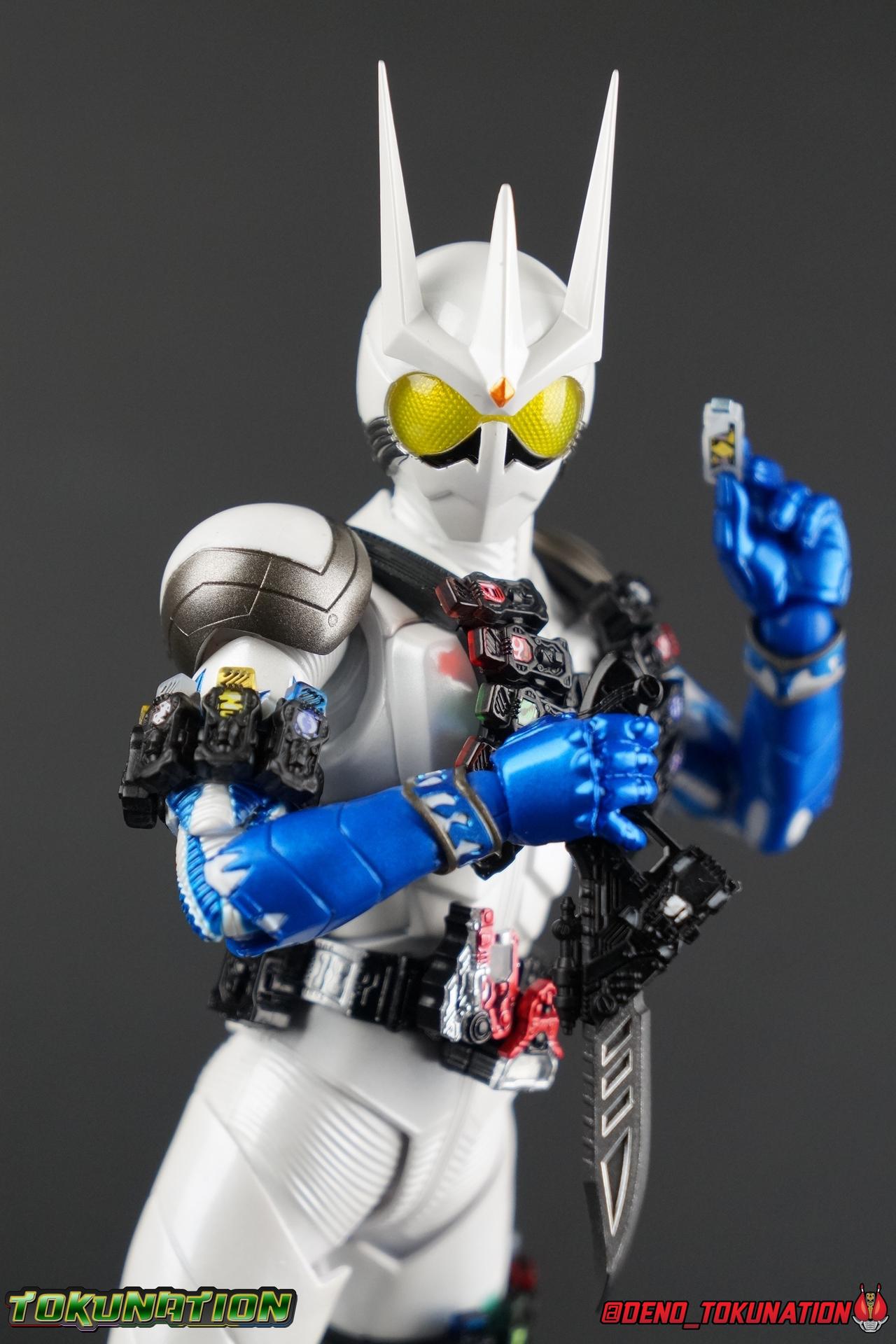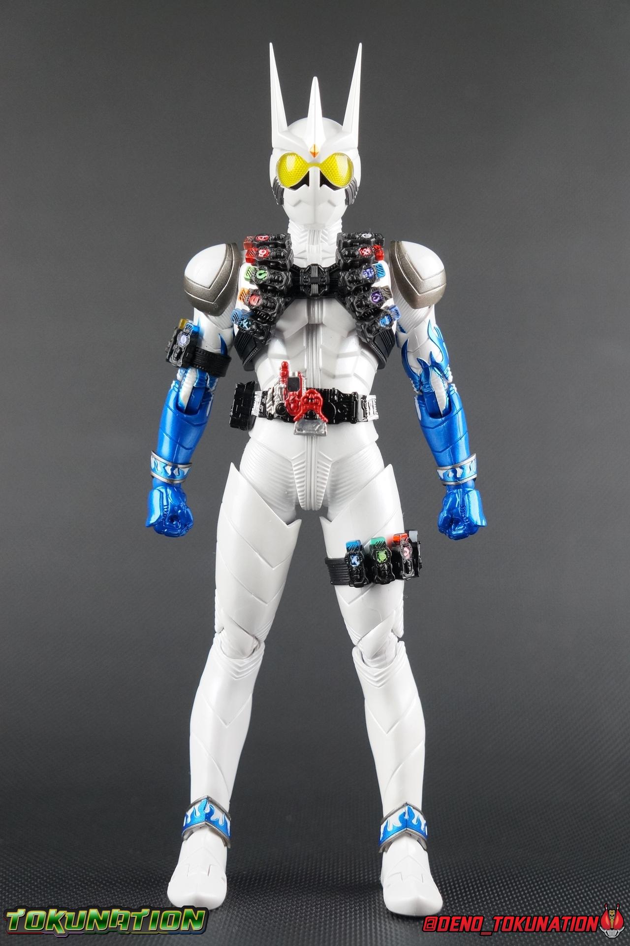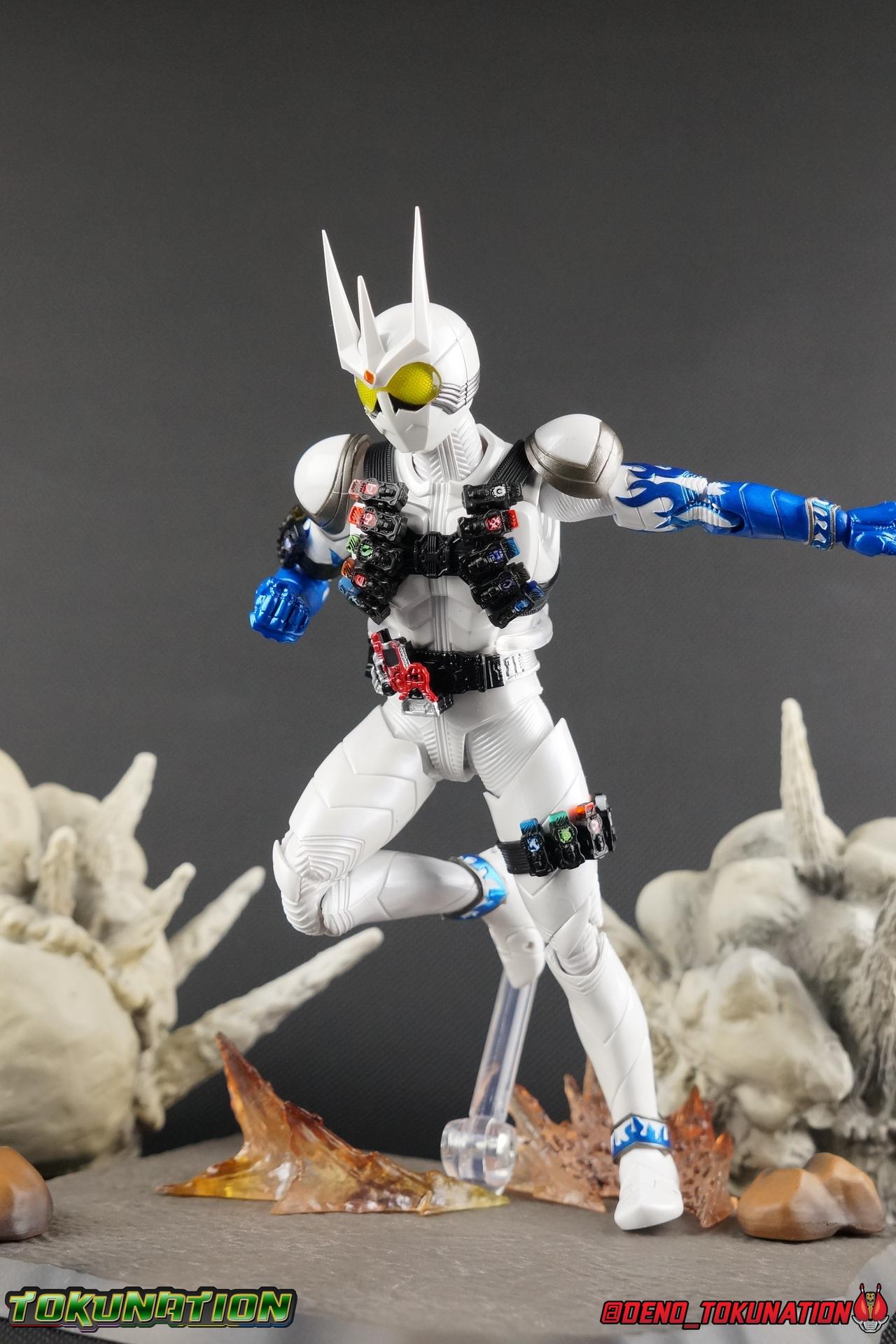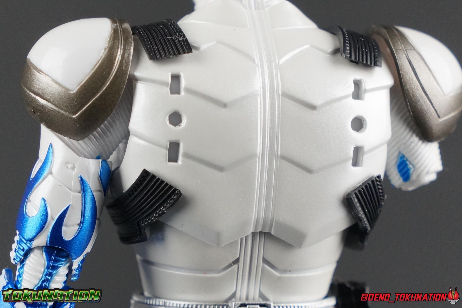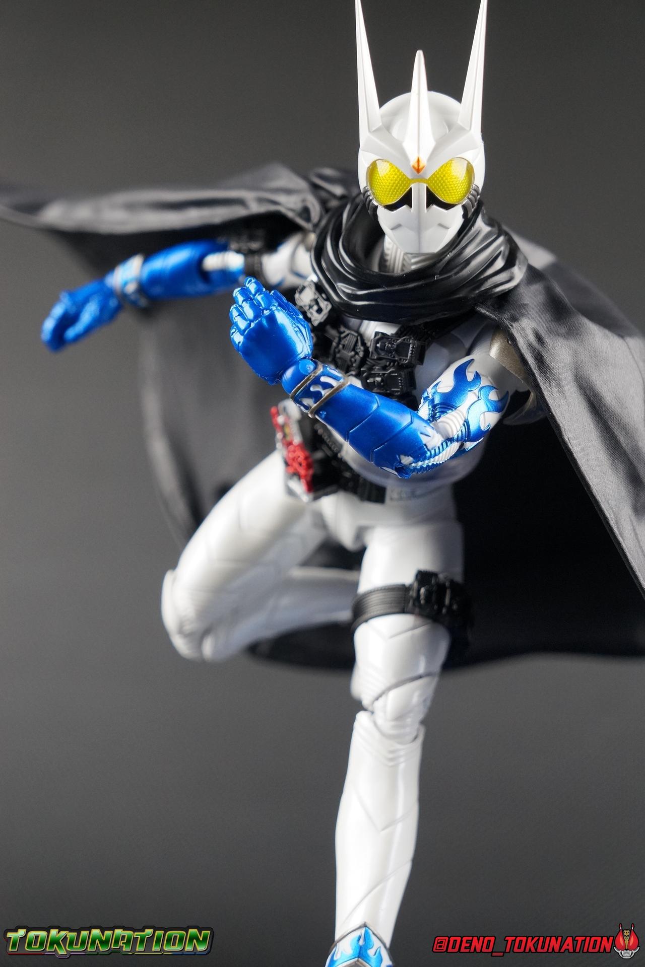 Katsumi Daido, the Necro-Over that preceded the beginning of the Gaia Memory Project, and member of NEVER. A conflicted individual, Katsumi had endured disease, suffering, and experimentation through out his life. He was in a sense the protagonist of the W Returns:Eternal V-Cinema which would shed light on his later (chronologically) appearance as the villain of Kamen Rider W Forever: A-Z The Gaia Memories of Fate. I've never been the biggest fan of the Kamen Rider W franchise, I've made no secret of that. But Shinkocchou Seihou has managed to re-create the gorgeous designs of the series and films exquisitely. Eternal is possibly the greatest example of this line so far. Here's why! Packaging The familiar Shinkocchou Seihou slip cover box makes another appearance! Nothing can be said about it this time that hasn't been said before. Only perhaps that due to Eternal's primarily white color scheme that his character portrait looks rather plain on the front. Main Figure In his first appearance (release order), Eternal is initially shown in his true form, Blue Flare. That's the one with the empty Gaia Memory holsters as well as (or without) his cape, the Eternal Robe. This form should not be confused for the earlier incomplete Eternal, Red Flare. Jun Kazu AKA the Utopia Dopant was the initial user of the Eternal Memory, but his incompatibility with it only allowed him access to the incomplete Red Flare form. Katsumi stole the T2 Eternal Memory & Driver and briefly assumed Red Flare during his first transformation before his perfect compatibility evolved the memory into the completed Blue Flare. The Seihou figure of Eternal, unlike the now ancient original figuart, comes in package loaded out in the further powered up Kyoka Busou/Strengthening Armament configuration. In this form Eternal's 26 Gaia Memory slots are filled thanks to the powers of the Zone Memory. While I'd rather review basic Blue Flare & work my way to Strengthening, I'll work from what we're given in package first. I apologize if that's a bit jarring in the gallery itself. With all that out of the way I just want to touch a bit on the functionality of the figure. I won't spend a ton of time on articulation because what you get is essentially identical to Seihou W & Seihou Skull. The W mold has, to me, been the pinnacle of Seihou/renewal engineering for Riders. Fantastic ankles and toe bends, really nice knees that look like a natural expansion of the costume akin to real fabric stretching, same for the hips. The right hip is weirdly very tight and feels like it could snap when applying too much pressure, I suspect my sample is a just a bit wonky is all. The legs are very tight generally on this release compared to W & Skull. And as with W & Skull, Eternal features an intricately detailed sculpt with appropriate paint apps for his Lost Driver, which is entirely functional. We have an open slot for any to-scale Gaia Memory to be inserted. I find that of the 4 Seihou W Riders I own thus far, Eternal has by far the most loose driver slot. If you breath, memories falls out of there. I'm still amazed at how well the upper body is designed as well. When I initially handled Seihou W, I thought that figure's torso was all one piece until I realized the upper body could move. Eternal still looks that good in hand, though the upper body joints are much tighter. This figure can pull off most any pose you recall him making, and looks absolutely perfect while doing so. I really want to touch on the fantastically sculpted & painted blue flames on Eternals' forearms as well. That electric blue just glows in the right light. I can't wait to see the eventual red flare repaint of this bad boy. Now to some specifics for Strengthening. I've included break down shot of the parts that are removable to change Eternal to standard Blue Flare. As you can see the hip holster, chest & back straps, and bicep strap are all removable. Here's the good part, these Gaia Memories don't come out of their slots as many people seemingly feared. They're molded as solid pieces so no worries losing those. Actually, two of the 26 memories are removable but I'll explain that in the accessories section below. These memories are extraordinarily detailed at their scale just like with the individual ones included for Drivers & weapons with these releases. It's details like this that make this a really sensible release as a web exclusive. It's just so lavishly detailed that it would totally cost out of being an affordable retail figure I'm sure. The standard Blue Flare form of course swaps the holsters out for the empty straps included with the figure. And it's very easy to swap every thing out. While all the parts plug in snugly they're easy to remove as well, even with how the right arm has to come off. The addition of the Eternal Robe completes this look quite nicely but I'll get into that a bit further below. Accessories Bucking the trend of many Web Exclusives, Eternal is loaded down with cool stuff! 3 - Individual Gaia Memories. That's the Eternal, Unicorn, & Zone Memories. Each is phenomenally detailed and easily lost. So be careful! 1 - Eternal Edge. Eternals' personal weapon is a fairly simple knife with a Gaia Memory slot on the back of the grip. Surprisingly this holds memories much more securely than the Lost Driver can. 6 - sets of hands. That's kind of crazy honestly. So many hands, and frankly not enough variety. Like 2 sets that essentially accomplish the same thing, holding memories. While we only get one open palm set of hands that's so unnatural and expressionless. The two varieties of Edge holding hands are great though. A different pair to hold it correctly blade out, or upside down. And I'm always a fans of thumbs up hands, so lucky for me Eternal comes with a right & left. I would have just really liked some more expressive action style hands. 1 - set of empty memory straps. As I mentioned above these are very easy to swap out and I've included some pi