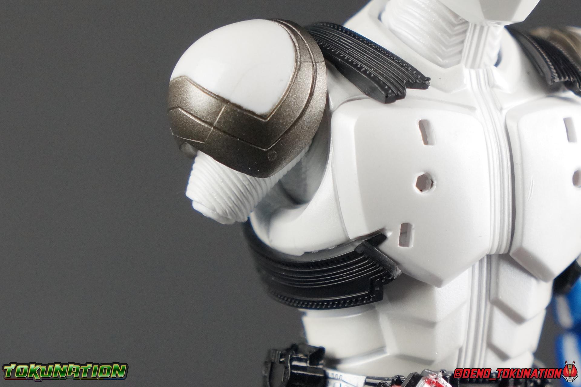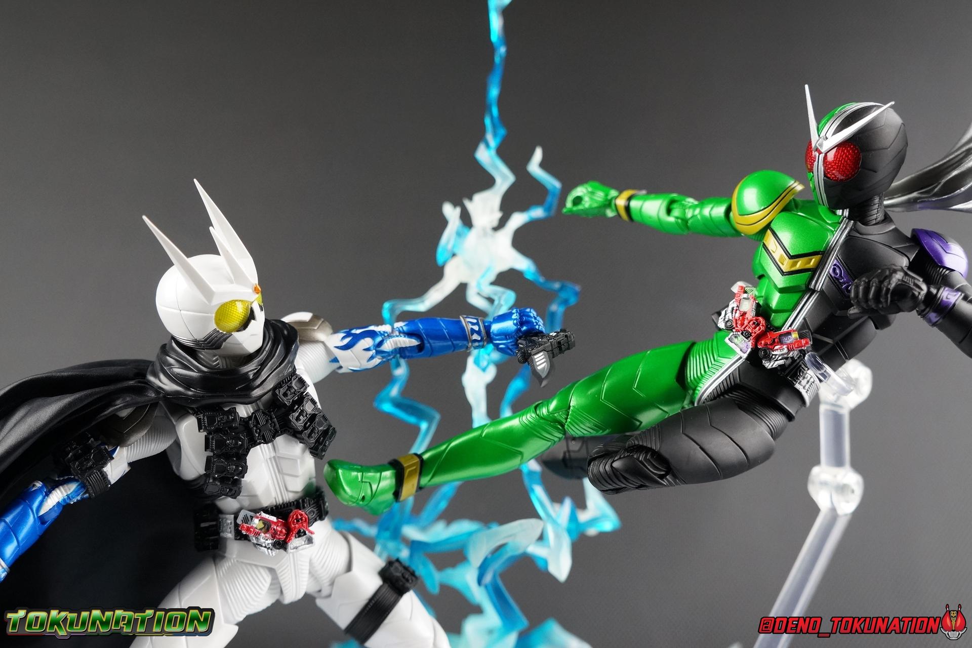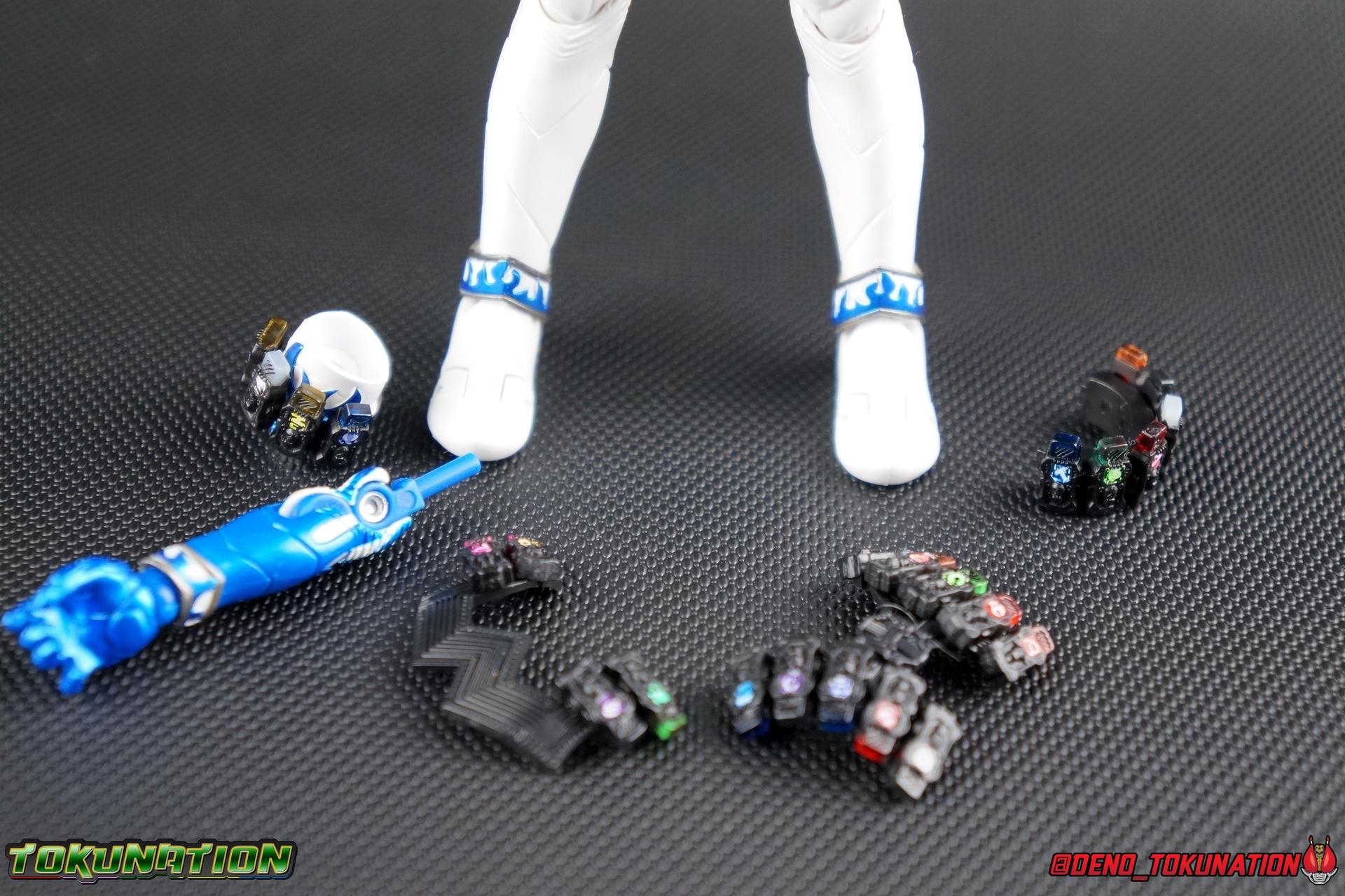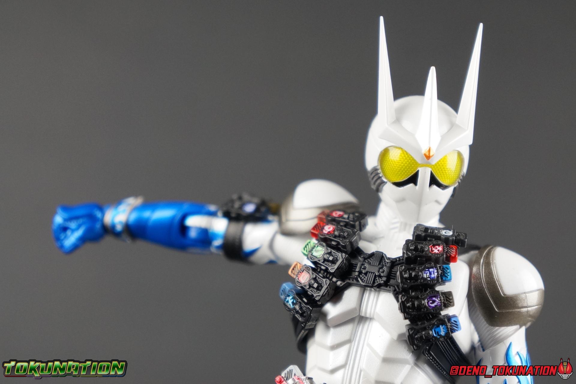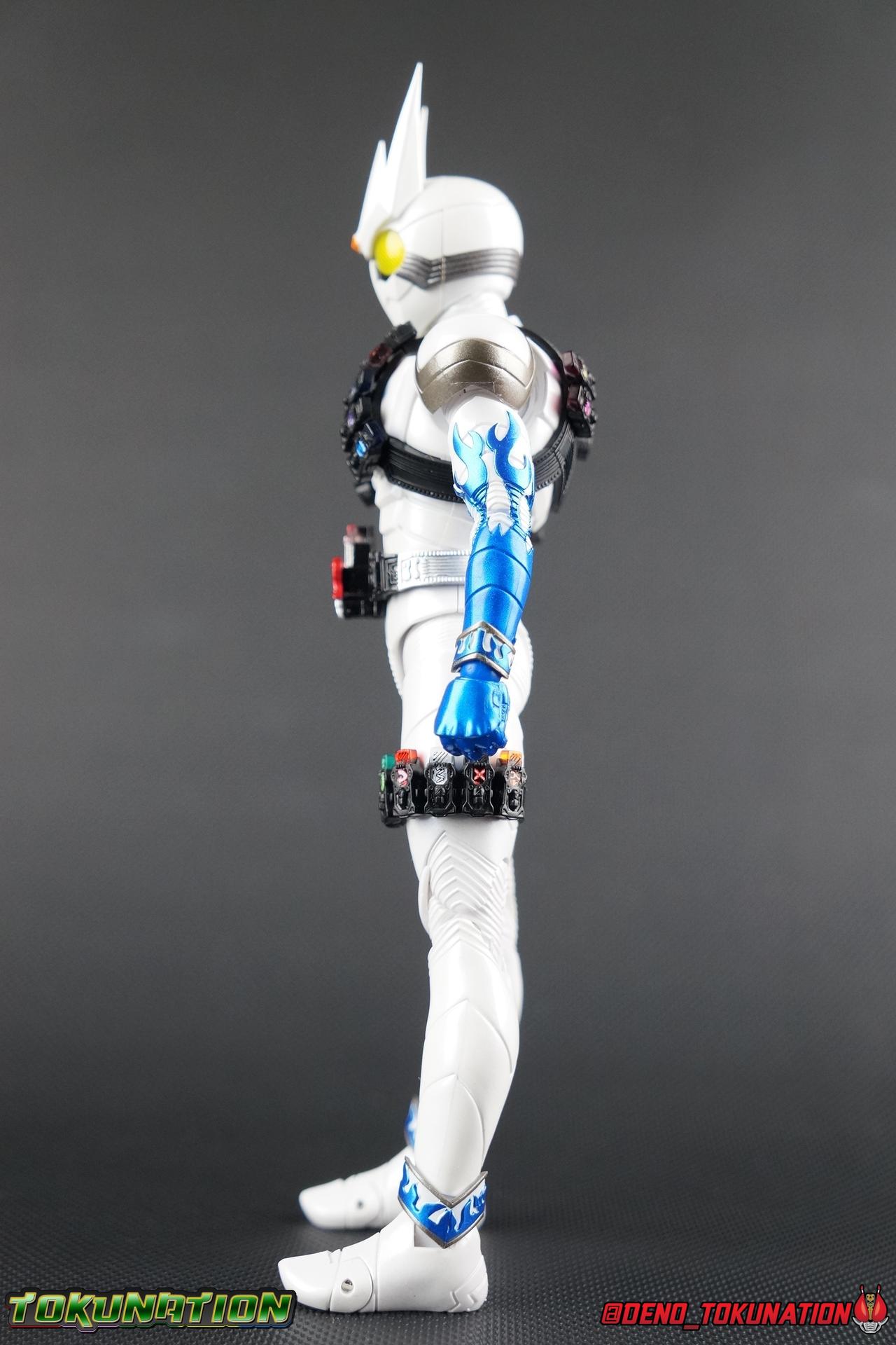 Katsumi Daido, the Necro-Over that preceded the beginning of the Gaia Memory Project, and member of NEVER. A conflicted individual, Katsumi had endured disease, suffering, and experimentation through out his life. He was in a sense the protagonist of the W Returns:Eternal V-Cinema which would shed light on his later (chronologically) appearance as the villain of Kamen Rider W Forever: A-Z The Gaia Memories of Fate. I've never been the biggest fan of the Kamen Rider W franchise, I've made no secret of that. But Shinkocchou Seihou has managed to re-create the gorgeous designs of the series and films exquisitely. Eternal is possibly the greatest example of this line so far. Here's why! Packaging The familiar Shinkocchou Seihou slip cover box makes another appearance! Nothing can be said about it this time that hasn't been said before. Only perhaps that due to Eternal's primarily white color scheme that his character portrait looks rather plain on the front. Main Figure In his first appearance (release order), Eternal is initially shown in his true form, Blue Flare. That's the one with the empty Gaia Memory holsters as well as (or without) his cape, the Eternal Robe. This form should not be confused for the earlier incomplete Eternal, Red Flare. Jun Kazu AKA the Utopia Dopant was the initial user of the Eternal Memory, but his incompatibility with it only allowed him access to the incomplete Red Flare form. Katsumi stole the T2 Eternal Memory & Driver and briefly assumed Red Flare during his first transformation before his perfect compatibility evolved the memory into the completed Blue Flare. The Seihou figure of Eternal, unlike the now ancient original figuart, comes in package loaded out in the further powered up Kyoka Busou/Strengthening Armament configuration. In this form Eternal's 26 Gaia Memory slots are filled thanks to the powers of the Zone Memory. While I'd rather review basic Blue Flare & work my way to Strengthening, I'll work from what we're given in package first. I apologize if that's a bit jarring in the gallery itself. With all that out of the way I just want to touch a bit on the functionality of the figure. I won't spend a ton of time on articulation because what you get is essentially identical to Seihou W & Seihou Skull. The W mold has, to me, been the pinnacle of Seihou/renewal engineering for Riders. Fantastic ankles and toe bends, really nice knees that look like a natural expansion of the costume akin to real fabric stretching, same for the hips. The right hip is weirdly very tight and feels like it could snap when applying too much pressure, I suspect my sample is a just a bit wonky is all. The legs are very tight generally on this release compared to W & Skull. And as with W & Skull, Eternal features an intricately detailed sculpt with appropriate paint apps for his Lost Driver, which is entirely functional. We have an open slot for any to-scale Gaia Memory to be inserted. I find that of the 4 Seihou W Riders I own thus far, Eternal has by far the most loose driver slot. If you breath, memories falls out of there. I'm still amazed at how well the upper body is designed as well. When I initially handled Seihou W, I thought that figure's torso was all one piece until I realized the upper body could move. Eternal still looks that good in hand, though the upper body joints are much tighter. This figure can pull off most any pose you recall him making, and looks absolutely perfect while doing so. I really want to touch on the fantastically sculpted & painted blue flames on Eternals' forearms as well. That electric blue just glows in the right light. I can't wait to see the eventual red flare repaint of this bad boy. Now to some specifics for Strengthening. I've included break down shot of the parts that are removable to change Eternal to standard Blue Flare. As you can see the hip holster, chest & back straps, and bicep strap are all removable. Here's the good part, these Gaia Memories don't come out of their slots as many people seemingly feared. They're molded as solid pieces so no worries losing those. Actually, two of the 26 memories are removable but I'll explain that in the accessories section below. These memories are extraordinarily detailed at their scale just like with the individual ones included for Drivers & weapons with these releases. It's details like this that make this a really sensible release as a web exclusive. It's just so lavishly detailed that it would totally cost out of being an affordable retail figure I'm sure. The standard Blue Flare form of course swaps the holsters out for the empty straps included with the figure. And it's very easy to swap every thing out. While all the parts plug in snugly they're easy to remove as well, even with how the right arm has to come off. The addition of the Eternal Robe completes this look quite nicely but I'll get into that a bit further below. Accessories Bucking the trend of many Web Exclusives, Eternal is loaded down with cool stuff! 3 - Individual Gaia Memories. That's the Eternal, Unicorn, & Zone Memories. Each is phenomenally detailed and easily lost. So be careful! 1 - Eternal Edge. Eternals' personal weapon is a fairly simple knife with a Gaia Memory slot on the back of the grip. Surprisingly this holds memories much more securely than the Lost Driver can. 6 - sets of hands. That's kind of crazy honestly. So many hands, and frankly not enough variety. Like 2 sets that essentially accomplish the same thing, holding memories. While we only get one open palm set of hands that's so unnatural and expressionless. The two varieties of Edge holding hands are great though. A different pair to hold it correctly blade out, or upside down. And I'm always a fans of thumbs up hands, so lucky for me Eternal comes with a right & left. I would have just really liked some more expressive action style hands. 1 - set of empty memory straps. As I mentioned above these are very easy to swap out and I've included some pi