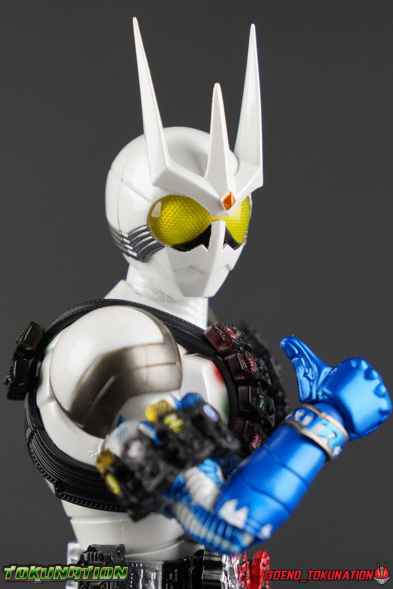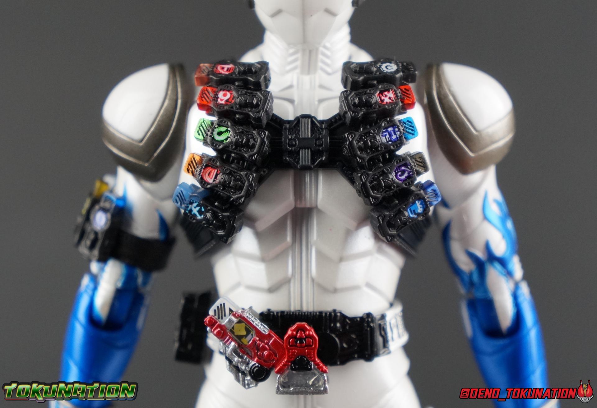 Katsumi Daido, the Necro-Over that preceded the beginning of the Gaia Memory Project, and member of NEVER. A conflicted individual, Katsumi had endured disease, suffering, and experimentation through out his life. He was in a sense the protagonist of the W Returns:Eternal V-Cinema which would shed light on his later (chronologically) appearance as the villain of Kamen Rider W Forever: A-Z The Gaia Memories of Fate. I've never been the biggest fan of the Kamen Rider W franchise, I've made no secret of that. But Shinkocchou Seihou has managed to re-create the gorgeous designs of the series and films exquisitely. Eternal is possibly the greatest example of this line so far. Here's why! Packaging The familiar Shinkocchou Seihou slip cover box makes another appearance! Nothing can be said about it this time that hasn't been said before. Only perhaps that due to Eternal's primarily white color scheme that his character portrait looks rather plain on the front. Main Figure In his first appearance (release order), Eternal is initially shown in his true form, Blue Flare. That's the one with the empty Gaia Memory holsters as well as (or without) his cape, the Eternal Robe. This form should not be confused for the earlier incomplete Eternal, Red Flare. Jun Kazu AKA the Utopia Dopant was the initial user of the Eternal Memory, but his incompatibility with it only allowed him access to the incomplete Red Flare form. Katsumi stole the T2 Eternal Memory & Driver and briefly assumed Red Flare during his first transformation before his perfect compatibility evolved the memory into the completed Blue Flare. The Seihou figure of Eternal, unlike the now ancient original figuart, comes in package loaded out in the further powered up Kyoka Busou/Strengthening Armament configuration. In this form Eternal's 26 Gaia Memory slots are filled thanks to the powers of the Zone Memory. While I'd rather review basic Blue Flare & work my way to Strengthening, I'll work from what we're given in package first. I apologize if that's a bit jarring in the gallery itself. With all that out of the way I just want to touch a bit on the functionality of the figure. I won't spend a ton of time on articulation because what you get is essentially identical to Seihou W & Seihou Skull. The W mold has, to me, been the pinnacle of Seihou/renewal engineering for Riders. Fantastic ankles and toe bends, really nice knees that look like a natural expansion of the costume akin to real fabric stretching, same for the hips. The right hip is weirdly very tight and feels like it could snap when applying too much pressure, I suspect my sample is a just a bit wonky is all. The legs are very tight generally on this release compared to W & Skull. And as with W & Skull, Eternal features an intricately detailed sculpt with appropriate paint apps for his Lost Driver, which is entirely functional. We have an open slot for any to-scale Gaia Memory to be inserted. I find that of the 4 Seihou W Riders I own thus far, Eternal has by far the most loose driver slot. If you breath, memories falls out of there. I'm still amazed at how well the upper body is designed as well. When I initially handled Seihou W, I thought that figure's torso was all one piece until I realized the upper body could move. Eternal still looks that good in hand, though the upper body joints are much tighter. This figure can pull off most any pose you recall him making, and looks absolutely perfect while doing so. I really want to touch on the fantastically sculpted & painted blue flames on Eternals' forearms as well. That electric blue just glows in the right light. I can't wait to see the eventual red flare repaint of this bad boy. Now to some specifics for Strengthening. I've included break down shot of the parts that are removable to change Eternal to standard Blue Flare. As you can see the hip holster, chest & back straps, and bicep strap are all removable. Here's the good part, these Gaia Memories don't come out of their slots as many people seemingly feared. They're molded as solid pieces so no worries losing those. Actually, two of the 26 memories are removable but I'll explain that in the accessories section below. These memories are extraordinarily detailed at their scale just like with the individual ones included for Drivers & weapons with these releases. It's details like this that make this a really sensible release as a web exclusive. It's just so lavishly detailed that it would totally cost out of being an affordable retail figure I'm sure. The standard Blue Flare form of course swaps the holsters out for the empty straps included with the figure. And it's very easy to swap every thing out. While all the parts plug in snugly they're easy to remove as well, even with how the right arm has to come off. The addition of the Eternal Robe completes this look quite nicely but I'll get into that a bit further below. Accessories Bucking the trend of many Web Exclusives, Eternal is loaded down with cool stuff! 3 - Individual Gaia Memories. That's the Eternal, Unicorn, & Zone Memories. Each is phenomenally detailed and easily lost. So be careful! 1 - Eternal Edge. Eternals' personal weapon is a fairly simple knife with a Gaia Memory slot on the back of the grip. Surprisingly this holds memories much more securely than the Lost Driver can. 6 - sets of hands. That's kind of crazy honestly. So many hands, and frankly not enough variety. Like 2 sets that essentially accomplish the same thing, holding memories. While we only get one open palm set of hands that's so unnatural and expressionless. The two varieties of Edge holding hands are great though. A different pair to hold it correctly blade out, or upside down. And I'm always a fans of thumbs up hands, so lucky for me Eternal comes with a right & left. I would have just really liked some more expressive action style hands. 1 - set of empty memory straps. As I mentioned above these are very easy to swap out and I've included some pi