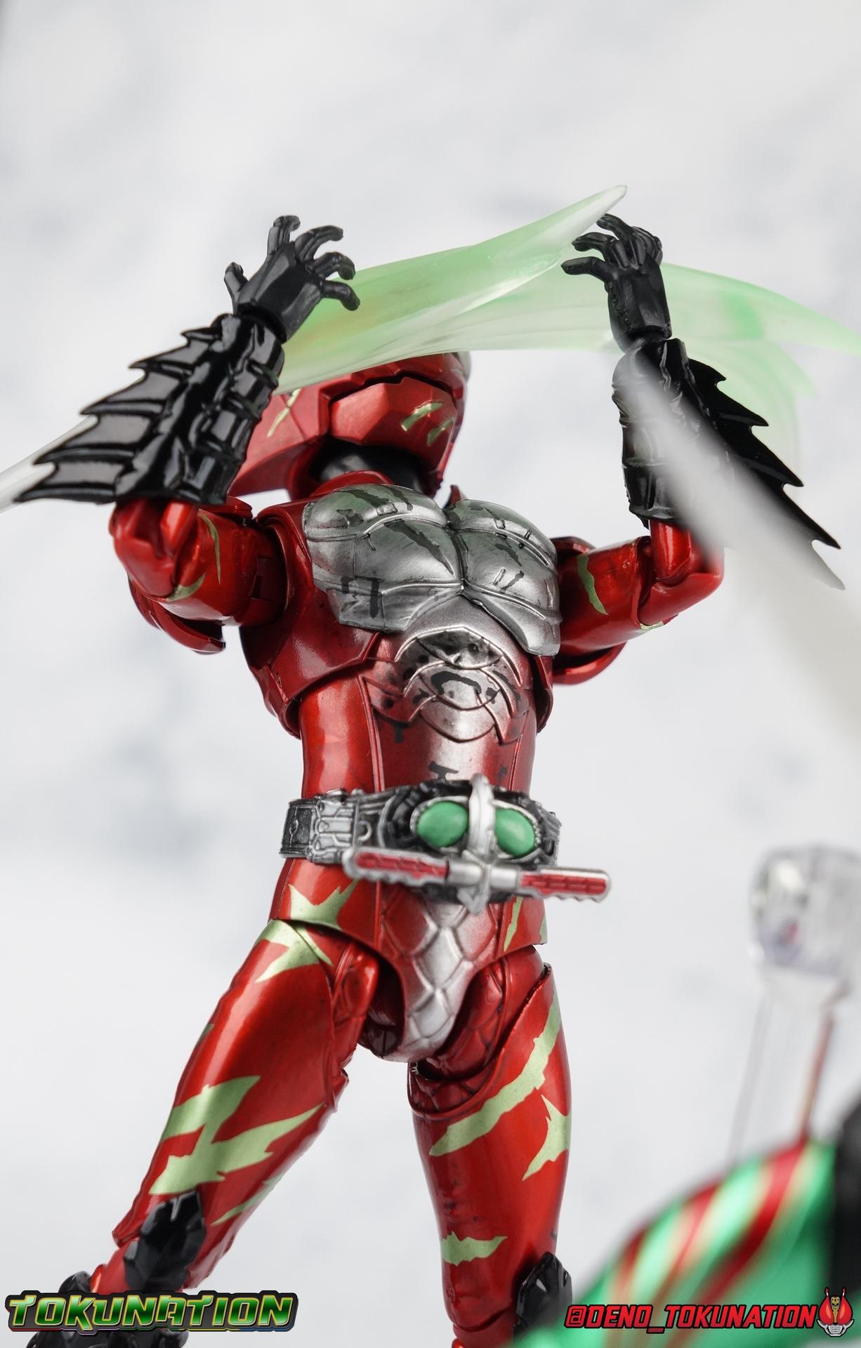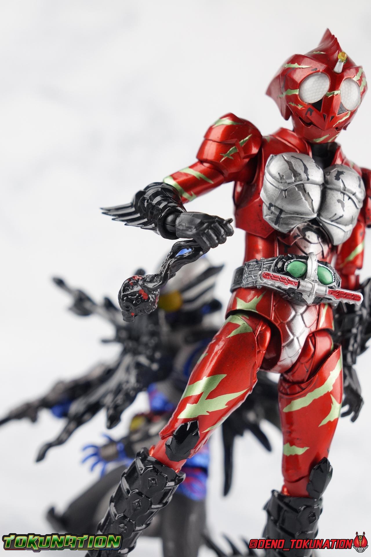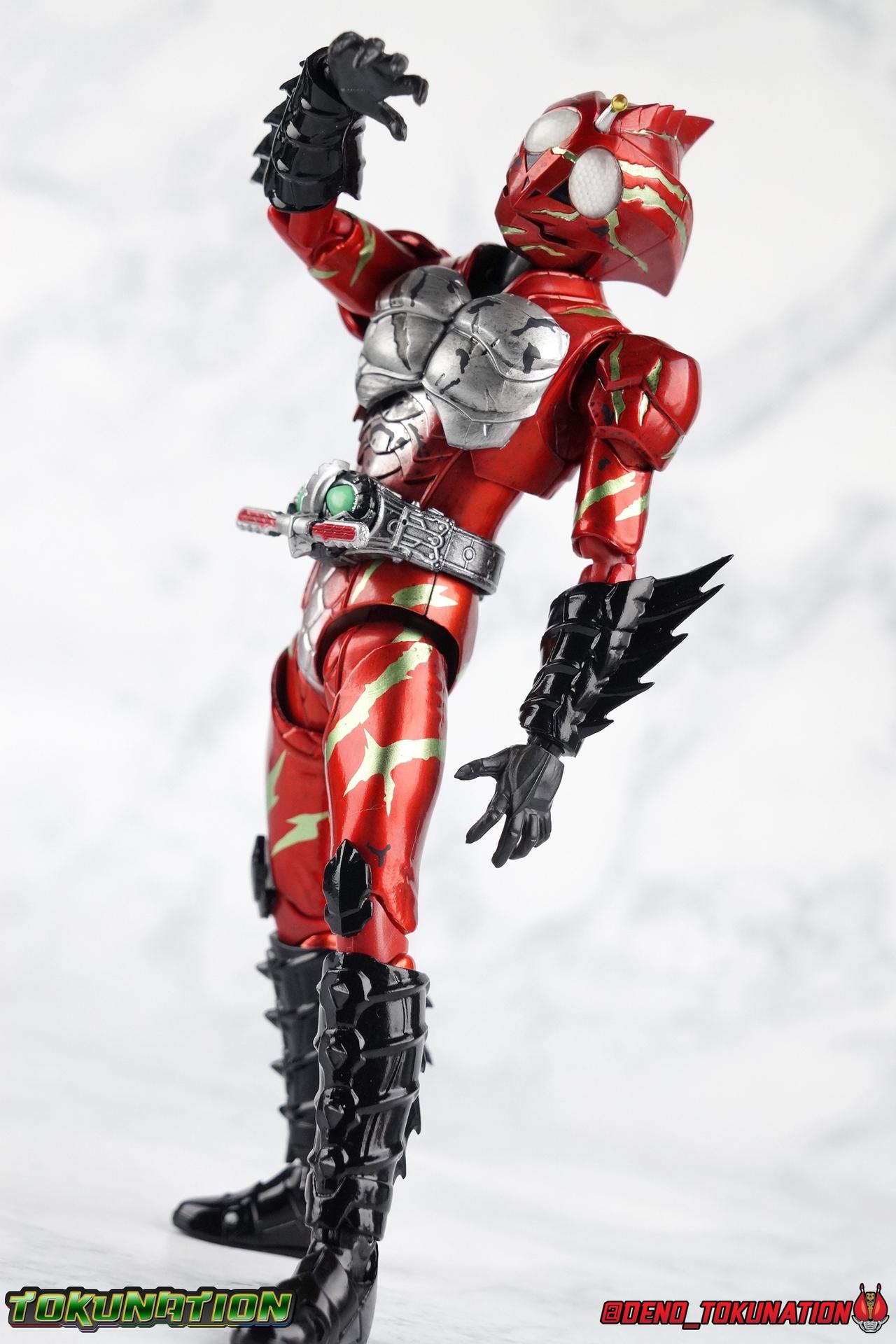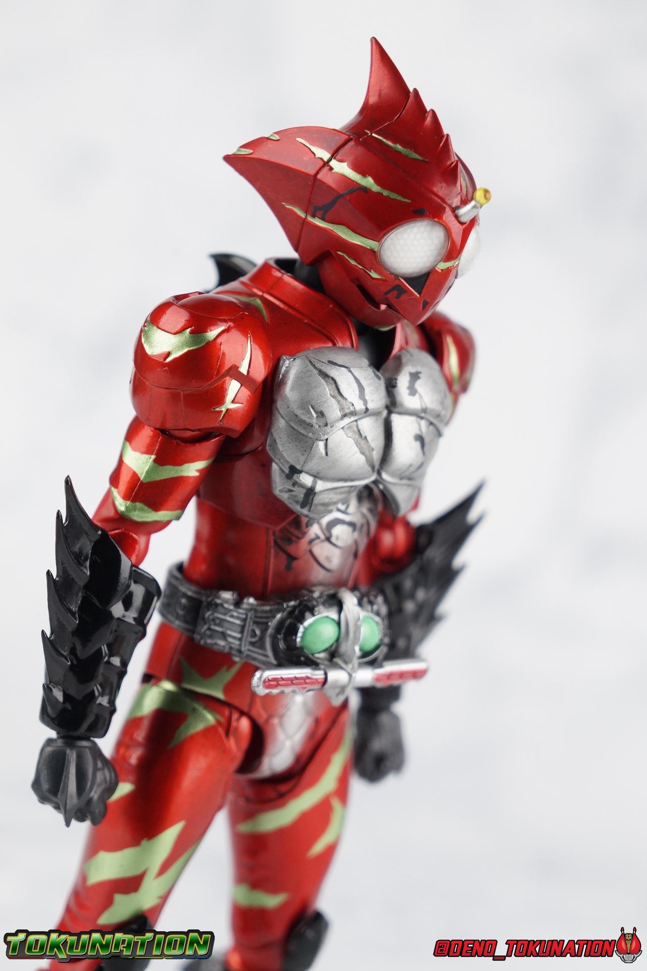As we approach the theatrical release of the hotly anticipated Kamen Rider Amazons film we're back to take a look at the latest, and currently last, release for this series. S.H. Figuarts Kamen Rider Amazon Alpha (2nd Season Ver.) represents Jin Takeyama's more broken form after years of battle with Haruka. Badly scarred, and now blind, Alpha is a wild animal with the sole purpose of destroying every Amazon that crosses his path. Including his son, Chihiro. Packaging Season 2 Alpha comes in much the same style of box we've come to know from the Amazons line up. Though in particular I really love the shot they've used for the front facing character portrait this time. The figure and accessories are mostly packed in one tray identical to the original Alpha releases. A small additional tray that fits under the main one is included to house the Amazon Heart. Main Figure This portion consists of text largely taken from my review of the original Amazon Alpha release. This is a physically identical figure just with a few new paint apps for me to gush about. If you've checked out that review from last year then you mostly know what to expect. Amazon Alpha is a design that more closely resembles the original Showa Amazon, while Omega had a similar color scheme. It's clear though that Alpha has always been meant to be the more direct homage. In fact, specifically, Alpha is based on the S.I.C. Hero Saga exclusive form of Pre-Amazon. As for the figure itself, Alpha (as with any Amazons release thus far) is just a solid release. I do still have some issues with Alpha's leg design though. Sadly Alpha has some weirdly stunted ankles that can't quite bend back. The very tip of his heel points upward and impacts the fins on the back of his legs, making it difficult to balance him on occasion. The hips do feel a bit more free on this Season 2 version than the original release however. Where Omega looked like he was wearing a diaper but had functional legs, Alpha is visually better looking but his hips do still impact the waist a little too soon to be truly dynamic. The Amazons Driver is once again gorgeous with this release. The paint wash applied to the Season 2 Version of the Driver gets it a little closer to the used and scraped look it has in show. It approximates that worn damage but does miss the mark a little. The right grip on the driver is removable like Omega's, though Alpha includes no Battler Grip weapons. When you get to the torso you'll begin to see some significant additional paint apps that really make all the difference for the Season 2 version. The torso overall is dark with a black tinge painted over the silver. The scars molded into the chest have also had a deep paint wash applied to bring out all of their edges and show that Jin has suffered some terrible injuries in the years since season 1. In his first Season 2 appearance Jin is also particularly savage. Far more so than he'd even been before. He is literally bathed in Amazon blood when he defeats one. The figure has what at first seems to be a random application of dark black paint in various areas that on closer inspection is clearly intentional. This figure is blood-splattered in Amazons Blood. A small number of these blood stains are present on the legs and arms as well, but the majority of the rest are present on Alpha's head. Alphas' Arms are designed a bit better than Omega's in my opinion as well. Omega had this pesky habit of his shoulder pads popping off when you stretched the arm out too far, and they were on a friction tab that moved so getting them back was difficult. Alpha's shoulder pads are on ball joints making matters much more manageable. You get the same great range out of the elbows, though the wrists are a bit limited because the balljoint sits a tad too deep in the arm. Finally, Amazon Alpha's head is just spot on. I loved the bright green eyes of the original release, but this go around the compound eyes are now pale white. While that seems like an odd way to represent an injury, it goes back to a flashback battle Jin & Haruka had between seasons in which Haruka's Violent Slash destroyed Jin's vision. This blindness is also an homage to a brief stint from the original Showa Amazon television series, when Amazon lost his own sight. These milky white eyes, combined with the Amazons Blood splatter give Season 2 Alpha a truly haunting look. For a straight up repaint, Alpha Season 2 Version is well worth it for the new paint apps alone. I would love to see battle damaged repaints like this, for Omega & Neo as well. Accessories The basic accessories with this release are identical to the original version" 4 - sets of hands. That's 2 types of open hands, and two sets of "holding things" hands that can be used for something I'm sure. But Alpha doesn't include any Battler Grip weapons, and doesn't ride a Jungraider in show. So really the holding hands are superfluous here. 1 - Violent Slash effect part. It clips right on over the forearm blades on either arm and can be a little snug. So just be careful when removing it. 1 - Amazons Heart. The only new accessory for this release, this morbid accessory goes well with the distinctly more savage Season 2 version of Jin. Taking into account this accessory, the blood splattered on this version of Jin is even more perfect. I really love this accessory, though it would make more sense for Jin to have ripped it out of a generic Amazon of either generation, one such figure doesn't exist. So for this galleries purposes, he's ripped it out of Chihiro. Final Thoughts Kamen Rider Amazons has been my jam for two years now. I've been thoroughly pleased with every release from it frankly. There are still several more things I'd love to see make it to market as well. Evolved Mole Amazon, Iyu/Crow, and in particular the new Neo Alpha from the upcoming movie. I'd love to have them all. And if getting things like that means I have to buy some minor repaints with a few new bells & whistl