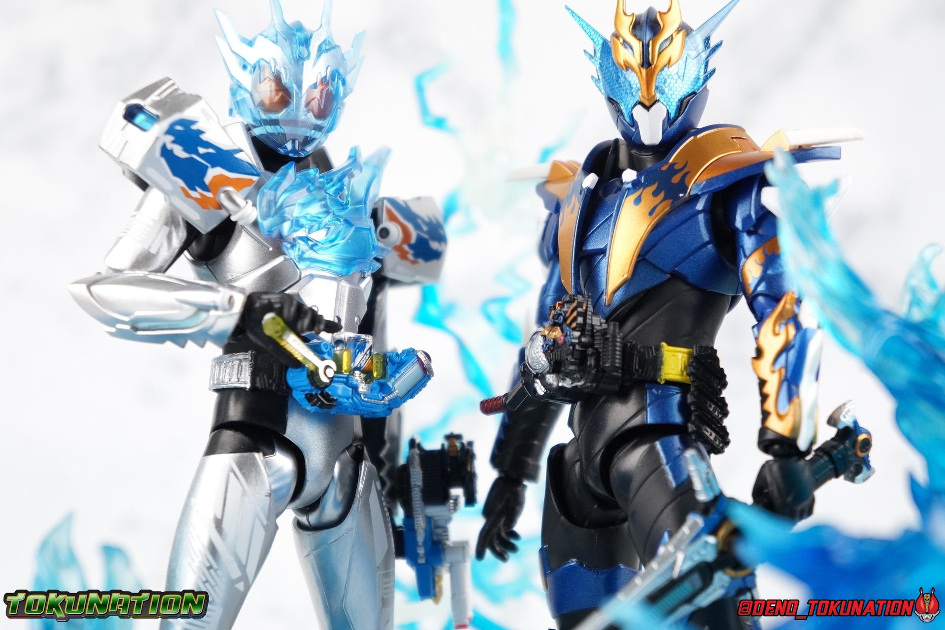 With a 3 sided war for Japan's future (and the power of Pandora's Box) underway, Hokuto's own warrior Kamen Rider Grease has appeared. His arrival on the battlefield brings with it the powerful and dangerous Sclash Driver. Fueled by Sclash Jellies, this wild driver has detrimental side effects on the users' body. In Ryuga Banjou's case, his drive to find a reason to fight, to protect his friends has given him the strength to overcome these hazards. But will this power be enough? When the time comes, can the muscle headed hero face his destiny? We'll see today in our gallery of S.H. Figuarts Kamen Rider Cross-Z Charge! Packaging Charge continues the trend of two-tone boxes for Build releases despite the rather bland combination of blue & gray on it. This one's not particularly interesting honestly, but I'm not here for the box. I'm legitimately quite happy to finally have a chance to review this figure and form. Main Figure It's odd the by the time this form has finally made the crossover to figuarts, that it literally doesn't exist in the show anymore. Cross-Z Charge took over for Banjou's original Cross-Z form fairly early on. The original only having a few outings to speak of including 1 movie. But with the introduction of Cross-Z Magma, Charge was literally no longer viable. That was several months ago now. Despite this I've been excited to see how this design translated to toy form and I'm pretty happy with the results. Cross-Z Charge is pretty strikingly different when compared to Cross-Z, Magma, or Great. It's shiny silver and translucent blue color scheme really go a long way to setting it apart from Cross-Z's various evolution's. But that's pretty appropriate given the different Driver being used, the transition from Grease to Grease Blizzard is very similar. Anyways, that striking color scheme is what I'd like to touch on first. Charge is almost fully painted in a really gorgeous metallic silver. The only notable exceptions being the shins, abdomen, and translucent parts. The finish on this is really excellent, I've only noticed a few iffy spots where the application is either over sprayed or a little under applied. The legs are accented by some ice blue on the feet, and some very sharp white techy detailing on the thighs. The legs themselves feel like they have a much greater range of movement than the standard Build/Cross-Z or Night Rogue/Stalk molds. I do wish the ankles had a little more clearance, but the overall performance of the legs is nice. The waist features a brand new driver as well, the Sclash Driver! I always liked the design of this driver and felt like it's ultimately been under used. Originally billed as the "big upgrade" near the middle of the series, and certainly used to great effect by Grease, Rogue, & Cross-Z, it has been outclassed. To the point that by the oncoming series finale, only Rogue is still using it. And even then he's about to get a Build Driver based upgrade form in an upcoming DVD/V-Cinema. That's all beside the point. This driver works very well at this scale. The Wrench handle can move up and down and the include Dragon Sclash Jelly can be removed as well as inserted into the Twin Breaker weapon. The upper body has an elaborate translucent blue dragon emblem stretched across it that I'm totally in love with. In a coincidence of the suit and toy designs, the peg holding the dragon to the chest is placed where the eye is so it syncs up well enough to hide it despite the translucence. The sculpt for this part is very well defined and the blue plastic just the right opacity. The arms are pretty much standard, though the elbows are hindered a little bit by the way the forearm ends on a point. They do look quite nice thanks to that silver paint application and the white tamphographed details on the biceps. The shoulder pads have magnificent airbrushed style dragon art that would look very much at home on the side of a van I would love to drive. I love it. These big dumb shoulder do however limit some of what you can do with the upper arms, they tend to impact the chest at very strange angles, though they are surprisingly well jointed. It's imperfect but they work. Finally, the head. Made with the same glorious clear plastic as the chest. I absolutely *Love* how it turned out. I half expected the opaqueness of the plastic to be off like in the past with Meteor Storm. But I'm happy to report that it's dead on. The faceplate is sharp and well defined, while the features underneath it shine through in almost any lighting. They just nailed it on this one. Bravo. Overall this is a really excellent figure that I think excels in several areas that the first Cross-Z did not. It's not absolutely perfect, but it's turned out so much better than I ever expected too. Accessories Charge comes with a pretty balanced set of accessories: 2.5 - sets of hands. That's an open pair, one set of open fists for either holding the Sclash Driver handle or possibly the handlebars of the Machine Builder, and one left hand to hold the Twin Breaker. 1 - Twin Breaker. This dual mode weapon always looked a bit clumsy to me in the show, but I like it for the most part here. The hand meant to grip it, holds it an angle but that can help navigate around the forearm a bit. I wish it could rest flush against the arm but that wouldn't be entirely accurate. The twin breaker comes packaged in Beam Mode with the gun barrels pointed forward. You can easily transition it to Attack Mode by rotating them back and extending the golden spear point in the middle. This locks nice and snugly in place, just be careful not to scratch it. The Twin Breaker also comes equipped with the Cross-Z Dragon and Dragon Full Bottle. They can be removed and are identical to those included with standard Cross-Z. They fit very snugly into the slots of the Breaker so you'll need a little force to get it out. These slots can also accommodate any Full Bottle, or Sclash Jelly. Really that's everything this form coul