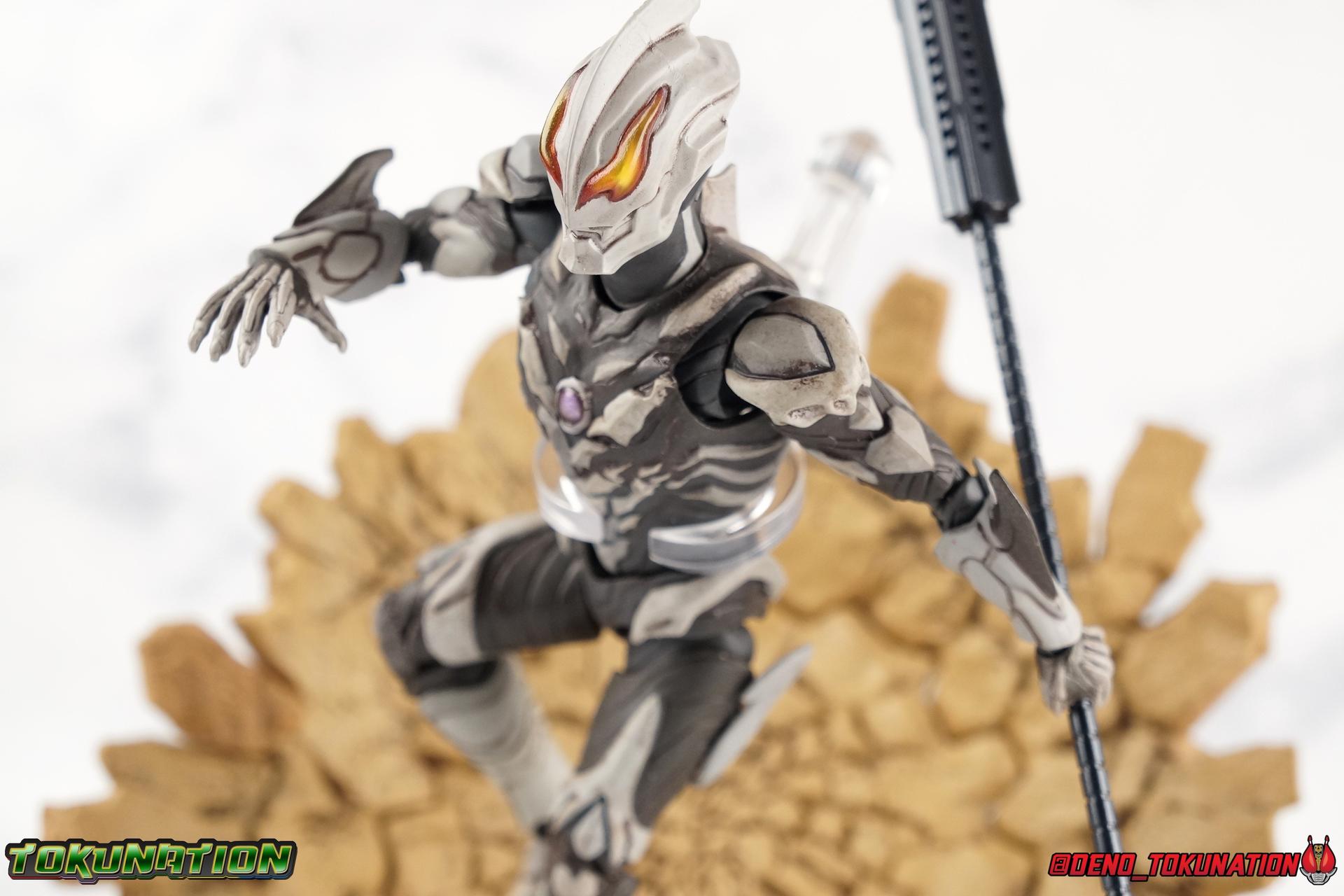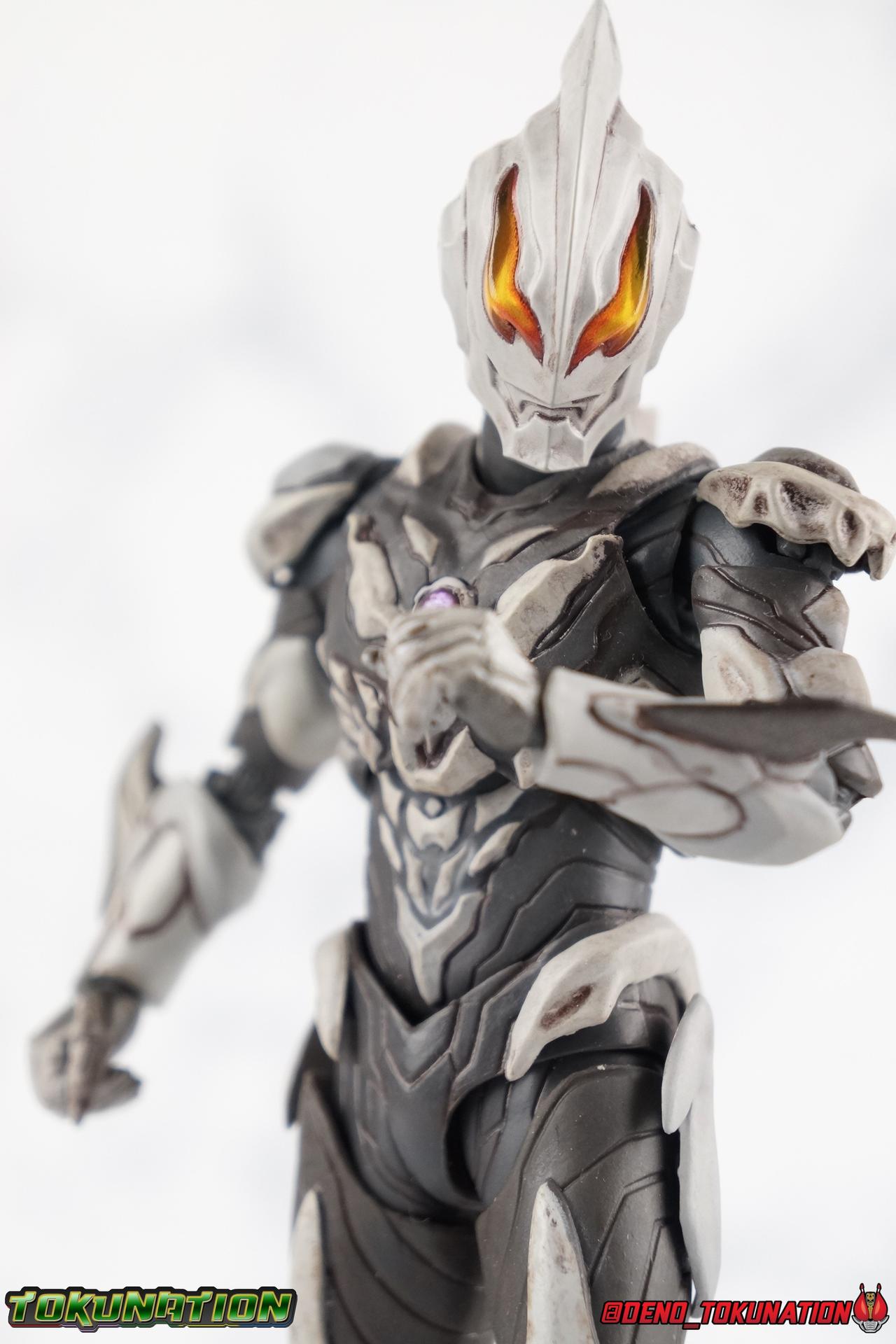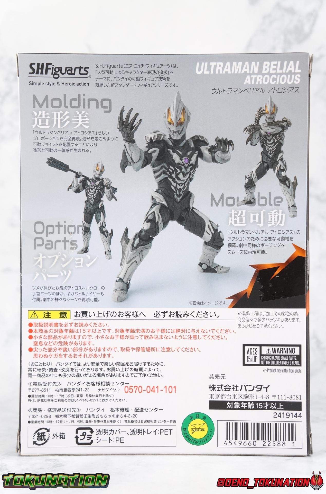 The greatest evil in this universe and all others, Ultraman Belial has risen again! Harvesting Kei Fukuide's Sturm Organs, and using the Dark Lugiel & Alien Empera Capsules, Belial attains his most powerful form ever. Powerful enough to destroy the universe for real this time, stronger than Ultraman Geed's own Royal Megamaster, Belial may finally be unstoppable. His body has obtained supreme power in our gallery of S.H. Figuarts Ultraman Belial Atrocious! Packaging Belial's packaging is just gorgeous, such a departure from the old Ultra-Act days. Belial came out in that line when plain black boxes were it. So this is radically and fantastically different. The design is elaborate, the stock photos are gorgeous, and the spine art is superb. More of this please. Main Figure Belial Atrocious is the first new collector themed figure the character has received since the original Ultra-Act Belial from 2010 & subsequent Kaiser Belial from 2011. Quite a gap for a character that I personally find to be the best villain the franchise has ever produced. Clearly Tsuburaya sees his popularity as well since Belial has made some sort of cameo or appearance as a power-up, been given a full return, or a new form numerous times in the last decade. But Atrocious is the first of Belial's myriad of forms outside his most iconic to get the Tamashii treatment. Given the general quality and design issues that many Ultra-Act suffered from, especially in the early days of Belial, I had hoped that this figure would be quite the improvement. There are some issues however. Undoubtedly Belial Atrocious is an insanely gorgeous form. A devilishly decadent design, Atrocious looks like the reanimated monster that Belial has continued to be for years. The entire suit takes it's major design cues from a skeleton, or at least a monstrous skeletal bone structure of some sort, and it honestly almost tops the original Belial design for me personally. It's a really great, imposing, and menacing form. The figure is intricately detailed, and has a dark paint wash to bring out more of the grit and grime of this form, and it does so quite nicely. Functionally however, I'm not a huge fan of this figure. This mold sadly suffers from the overly ornate design, being designed with pretty standard articulation. The ankles are standard fair and don't really have much issue with the shin parts. The knees are sadly limited to about a 90 degree angle thanks to the thickness of Belial's legs. The biggest issue with the lower body however, is the way the hips interact with the waist. Each leg has a built in thigh swivel and is attached to the interior of the waist. Frankly I don't care for the design of the hips though because it really breaks up the lower body sculpt. But these joints are also frustratingly tight and don't have enough clearance. The bone protrusions on the outer thighs are a real pain. If you aren't careful when spreading the hips out, you'll inadvertently nearly break them off as they stick right into the waist parts. You can angle the legs so that these parts go inside the waist, but that isn't the correct way for them to look, and you still can't get the full range out of the joints either. Now the upper body has issues as well. The upper and lower torso are separated in way that does doesn't draw your eye's attention. However they're also very very tight, and there isn't a ton of range in how the upper part can float around the lower. The waist connector is similarly a bit limited. This whole chunk of the body is gorgeously sculpted and painted though. In particular I LOVE Belial's back. The bone protrusions are organized in such a way that they almost look like a crude monstrous face. There's something about that design that I just love. The arms are fairly standard for an Ultraman figuart with functional elbows, wrists with pretty great clearance, and bicep swivels as well. Though these are a little too tight. The shoulder pads however are garbage, plain and simple. The hinge which holds them together is made from absolutely the flimsiest plastic possible ensuring there's no real tension holding them together. Even if you take the time to arrange them out of the way before moving the arm, the slightest nudge will send them off. Finally, that Atrocious head. I meant that in a good way! Atrocious has a magnificently malicious head sculpt. The classic Reionic/Belial eyes have never looked better than in this devilish form and generally light catches them in just the right way to make them look as though they're glowing. I still think of the original Belial as a tough design to beat, but this one certainly gets close. I just hate to say it, but the figure itself is a bit of a mixed bag. On the one hand, I absolutely love Belial as a character. But being his first figuart, I did expect better. I feel that some of the design choices were poorly thought out, while others were just poorly executed. Accessories 1 - set of Giga Battle Nizer parts. Belial's most iconic weapon, the Giga Battle Nizer has been with him since his early days. This go around, the device functions exactly the same way as the old Ultra-Act. It's packaged in it's more compact form but the staff extension is included. In fact, the sculpt of the figuart version seems nigh identical to the Ultra-Act weapon, simply downsized. 4 - sets of hands. Included are two types of open palms, one slightly more menacing, the other more of a general open stance. A pair of open fists for holding the Battle Nizer, and lastly a dark black pair of hands. This pair is meant to represent Belial Atrocious' Astros Hell Claws. They aren't quite claw-like enough for my tastes, especially given the original figure's giant poseable talons. But they work fine. I wish this figure had come with some form of energy effect to replicate any of Belial's numerous moves. Even some scaled down versions of the Battle Nizer parts the original Belial came with would have been nice. But that's reall