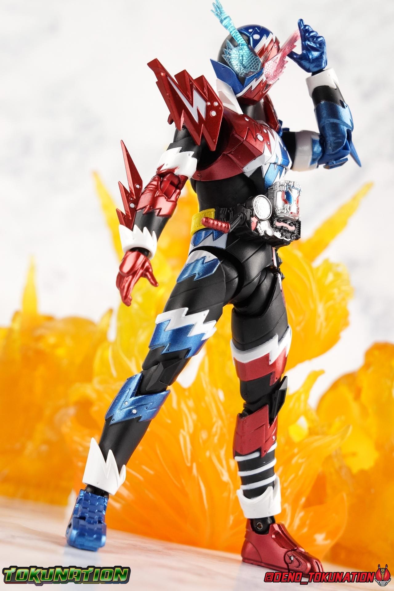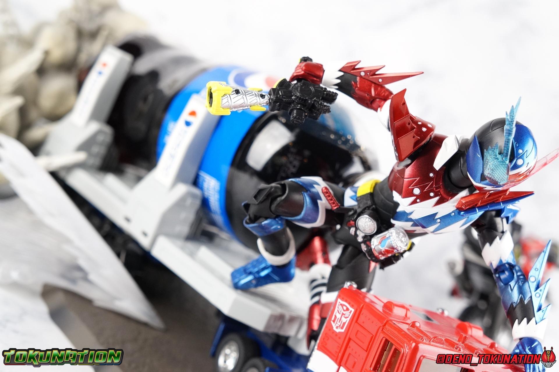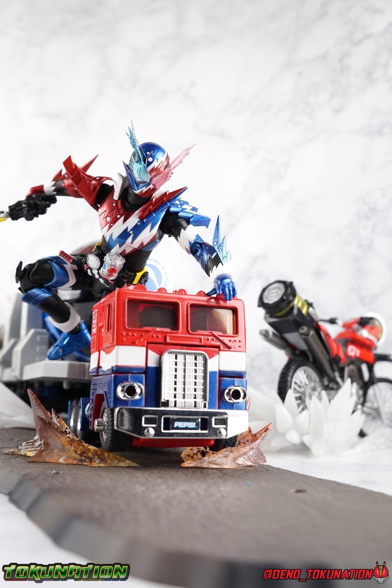 Faced with the truth about Souichi Isurugi & Blood Stalk, Sento has one last ditch plan to stop him. Distill the power of Pandora's Box into a new power up item! Now that he knows the truth about Souichi, and himself, can Sento really wield this power? Find out in our gallery of S.H. Figuarts Kamen Rider Build Rabbit Tank Sparkling Form! Packaging Sparkling continues the trend of two-tone boxes for Build releases and much like the solid color Ex-Aid boxes, this style has gotten a bit stale rather quickly. Honestly it's not terribly important to me how boxes look anymore anyway. Main Figure Build Sparkling builds (HA HA HA) off of what we've seen from the line already, and I mean that literally. The main Build mold has only made 2 outings in the line so far as Rabbit/Tank and modified as Cross-Z. Sparkling sees it for a third time. If you've had experience with either of those releases then you know all the essentials of this mold and what it can do. Here's a brief refresher. With the lower body, the legs are largely identical to Build aside from the new electrical white strips. Like Cross-Z, Sparkling seems to have some tolerance issues with the legs. The knees creak on mine the same way Cross-Z's hips did. The hips are quite tight as well. So just be careful handling him, it seems like a recipe for disaster. Apply heat and shock oil where necessary. For articuation, these legs function identically to the last two uses of the mold. The Build Driver is once again carried over and identical to it's previous outings. The new feature here is of course the Rabbit Tank Sparkling Full Bottle which is modeled on a typical can of soda. The Bottle is removable, there's no functionality to it though, the pegs can't recede into the can form like the DX toy. Weirdly, because of the way it's designed to slot into the holes on the Driver, it can also fit nicely into the Bottle holster on the hip. For the upper body, the primary change is the new electrical burst pattern that stretches over the chest and up to the left shoulder. You can see the original diagonal lines from base Build's chest under the paint but the new sculpted detail obscures that somewhat. It's basically the same chest, just with these new details and paint on top. I also really dig thew little electric additions to the rabbit/tank protrusions on the shoulder. A new collar part has been added around the neck as well, continuing the electrical theme. With the arms we again see what are essentially identical parts to base Build just with new detailing, each forearm also now has a new protrusion on top of the detailing. The biggest change comes in the new shoulder pads which can look a little awkward depending on the angle you move them to. I tended to pop them off by accident a number of time while shooting this gallery. While keeping in line with the original Build's theme, Sparkling's head is by the far the best new addition. It's very much the super powered version of the Rabbit/Tank head, right down to the new electrified look of the compound eyes. I gotta say Sparkling has never been a favorite form of mine, but this head sells it so hard. It's just spot on. The new collar around the neck can get in the way of posing the head somewhat, but that's about the only drawback. Quite often, people have made the joke of "Sparkling is Pepsiman" which totally makes sense given this form's color scheme. I took that a bit further with some bonus shots attached in the second post. I hope you enjoy Target: Pepsi Prime! Accessories Sadly, Sparkling follows the standard Rabbit/Tank form's lead and comes with minimal accessories: 10 - additional hands. Weirdly not all in matching pairs either. 3 left hands, and 7 right hands of various posers. Which include multiple to hold weapons he doesn't actually come with and ride a motorcycle that was a previous web exclusive and included said weapons. The hand variety is fantastic. Honestly, I wish regular Rabbit/Tank had come this sort of variety. But these go a long way to helping Sparkilng feel like it has more than it does since it can utilize things from the rest of the line. If you're like me and had already picked up Machine Builder with the parts set then this figure is a perfect compliment. If not, then you'll likely be quite disappointed with the accessory selection here. Final thoughts Overall this is a really solid remold of a base figure that I quite like. I didn't really expect to like Sparkling that much, but it's succeeded in being a really great little addition to my Build collection. I usually tend to go completionist on shows I love and I'm really happy I did in this case. Build Sparkling Form is a really unexpectedly fun addition to any Build collection.