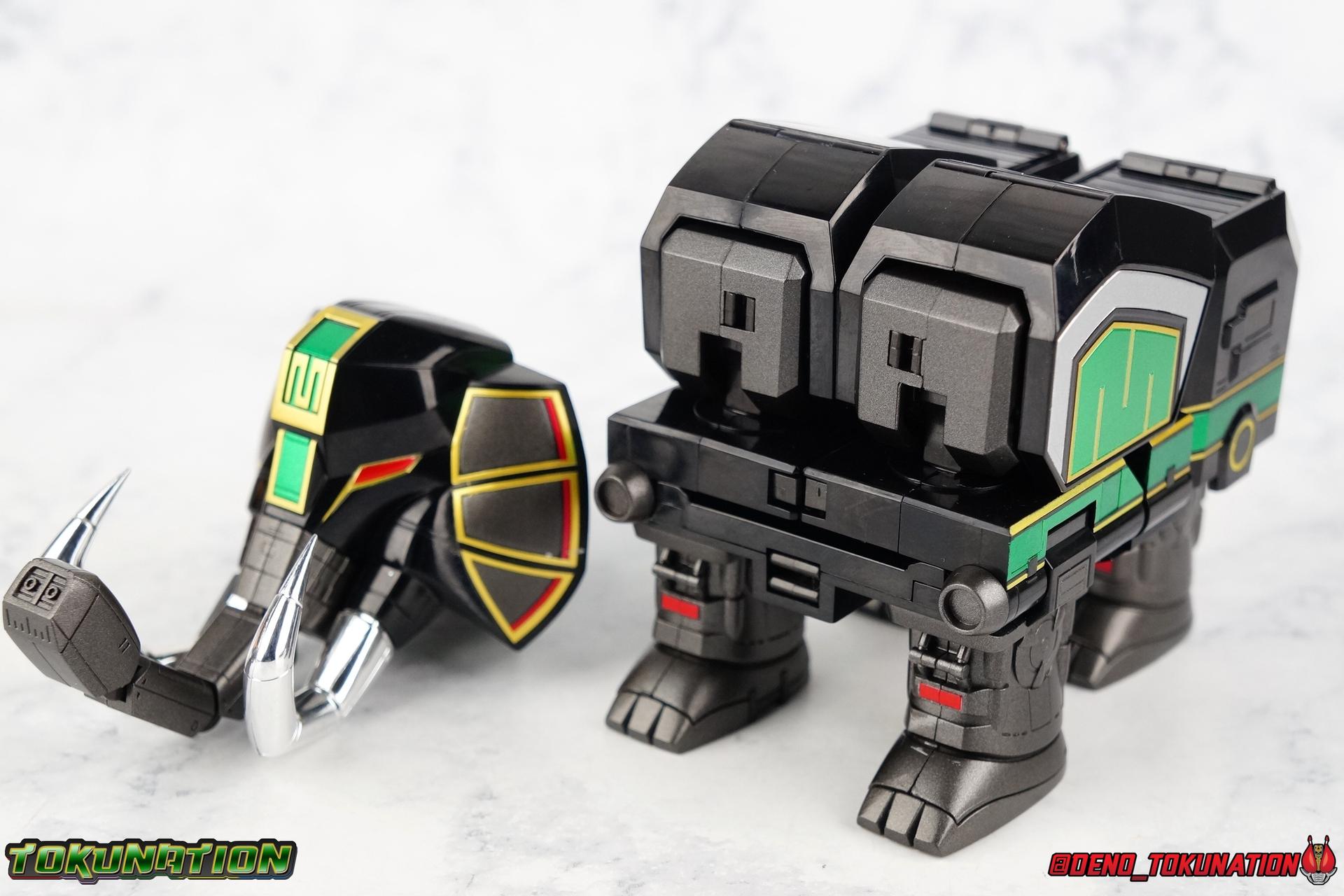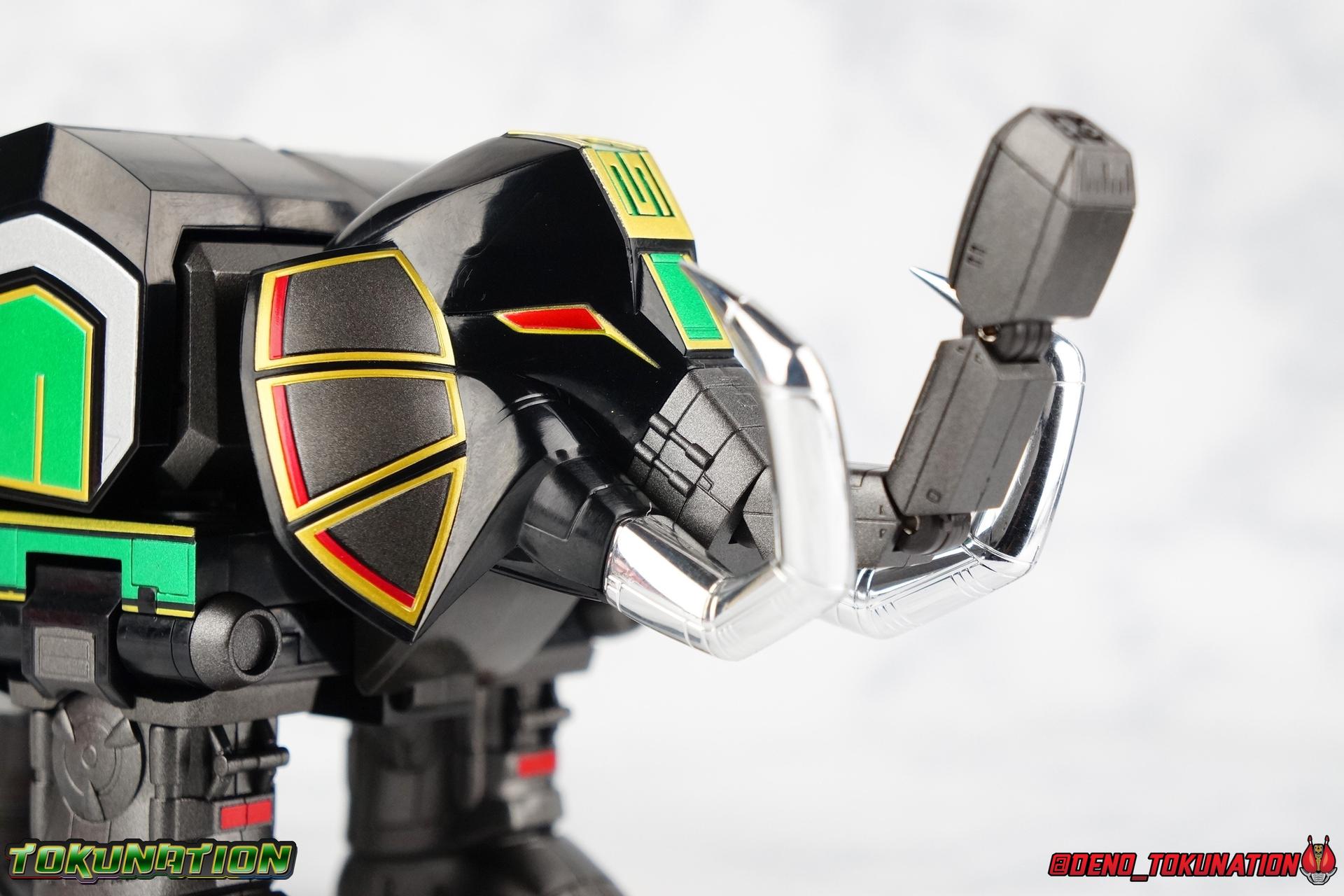 Today we tackle the gorgeous SDCC 2018 exclusive Black repaint of the SOC Megazord Daizyujin! Originally sold exclusively at SDCC, it has since been made available to pick up at NYCC as well, and will even be sold through the Tamashii Web Shop by Tamashii Nations as a web exclusive in Japan, next year. Sadly that means the exclusivity of this release, as well as it's value, are diminished. With that in mind, let's go! ***We've broken the review portion down into 7 individual sections. 1 for each Zord/Guardian Beast with a rundown of what they can do individually, then one for Megazord Tank Mode/Dino Tanker, and finally Megazord/Daizyujin itself. There will be 4 posts with images in this thread containing a total of over 120 images of this gorgeous set. Be sure to check them all out! But to kick things off: Packaging The packaging that you'll see in this gallery is actually that of the western market Bluefin release of this set, made available at SDCC & NYCC 2018. Thankfully a new trend has begun with Bluefin dual-branding their Power Rangers releases with Zyuranger markings as well. Making the differences between the two market releases minimal, such as the SOC Dragon Caeasr/Zord. Unlike the original release of this set, which unfortunately had radically different box art from it's native Japanese release. Since these are more dual releases I'll refer to everything in the set by both American & Japanese names as well. The packaging itself is quite a departure from Bluefin's own original release of the SOC, featuring the toy, rather than new art this go around. But the stock photography is indeed gorgeous and far exceeds any of my work. Stock photos can be kind of magically nice. I actually really enjoy this packaging quite a bit as well. The interior is identical to the previous Megazord/Daizyujin release. I always love styrofoam trays, and Soul of Chogokin almost always feature these. It's a nice throwback that I appreciate more than is necessary I think. The functionality I discuss in this review is identical to my first gallery of the SOC molds, there's no physical difference between this release and that one whatsoever. Though I will talk about paint app differences. This color scheme by the way, is meant to match the SOC Dragon Caesar/Dragonzord. The black/gold/green colors go perfectly with that figure, one I sadly do not have yet at the moment but will soon. If you'd like to see some comparisons, we did galleries of the original vintage DX Black Daizyujin as well as the Legacy Black & Gold Megazord in the past. Tyrannosaurus Zord/Guardian Beast Tyrannosaurus Tyrannosaurus kicks things off for us. For starters this big dino is a very impressive looking beast. It was a dynamic design for it's original time anyway, but the SOC has overhauled it in all the best ways to make it look a bit more proportional and (as much as a robotic dinosaur spirit thing can be) believable. With this new take on the figure we get the expected levels of SOC articulation to really hammer home it's high end nature, as well as that gokin heft to give it real weight. Tyranno has an opening mouth that functions in such a way as to make it appear there's a real neck joint, much like the original. Inside the mouth are sculpted in blasters to replicate Tyranno's sonic attacks. Making a vast improvement on the original DX, this go around Tyranno also has poseable arms. These tiny vestigial arms may not look like much on the original, but here the shoulder and elbow have lots of range to them. The shoulder can even angle out a bit away from the body. The claws are also articulated in 2 sections per hand. When combined with the lower body articulation you can get some dynamic results. That's largely thanks in part to the torso joint. While this joint get's lost in the fully combined modes, Tyranno can make use of it to turn about 45 degrees to each side. The hips, while not quite as dynamic, can also angle out and back/forth on some really strong hinges for stable posing. The diamond shaped chunk of armor on the outside of each hip needs to be angled correctly to give the hips the room they need though. Surprisingly there is also a sliding thigh joint. When pushed outward it gives him a wider stance, and is primarily meant for the Megazord/Daizyujin combo. We also get a swiveling thigh joint just below here that allows each leg to turn completely outward. Again primarily meant for combined mode, but still a really welcome addition. Sadly the knees don't bend very far forward, most of their use comes into play for the combined mode where they fold backwards. The same can be said for the ankles which only tilt back and forth and don't have a side to side rocker. The hips and thigh joints mostly alleviate that though. Finally we have a segmented and articulated tail. Each of the 6 segments is on a nice tight floating joint so they have room to move up or down slightly as well as side to side. Just enough to cover what you'd need. Tyrannosaurus could definitely get physical with this thing in the series, and I think the SOC accurately represents the range he had with it. As probably the most memorable and iconic of the Zords/Guardians, he's the one they needed to nail individually. The new color scheme for this set really makes the Tyrannosaurus look very imposing, and even a little sinister. Though we lose a lot of that gorgeous painted silver from before, the new gunmetal and black are accented by perfectly gold outlines and some hints of metallic green that really set this thing off. Gotta love those red eyes as well. Mastodon Zord/Guardian Beast Zyumammoth Of all the beasts it's the Mastodon/Mammoth (and Pterodactyl/Pteranodon) that are by far the most simplistic still, and largely similar to their original toys. With Mastodon it's just the design. There's not a lot to make more dynamic for it's individual mode. Now it's transformation process has been greatly enhanced to get to both modes. But as an individual, it