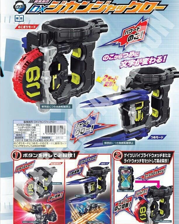 Beyondriver Henshin process 1. Set the miride watch on the right side of the Beyondriver. 2. Press the button on the watch and the doors on the watch opens. 3. Close the lever to henshin. So basically, the lever is pushed frontwards bending at 90 degrees. Special attacks 1. Pull the lever back and then close it again pretty much. Jikan Despear -Most likely a pun on "jikan desu", a formal way of saying it is time. - Woz's weapon is the Jikan Despear and has 3 modes that are activated by touching the touch sensors. - It has 3 modes, spear(yari), sickle(kama), and staff(tsue). From the looks of it Futuring Shinobi will be the spear, Kikai the sickle, and Quiz the staff. - The green mask button will activate the special attack. Saikyo Gilade - Zi-O II's weapon is the Saikyo Gilade. - Pulling the lever up will change the rider face to saikyo face. The katakana on the eyes change from RIDER to SAIKYO. - Combining it with the Jikan Gilade will form Saikyo Jikan Gilade. Jikan Jaclaw -Most likely a pun on "jikan jya!", a non-formal way of saying it is time. - Geiz Revive's weapon is called the Jikan Jaclaw(pronounced jack-claw). It has a sawblade(nokogiri) mode and a claw(tsume) mode. - Geiz Revive Gouretsu will most likely be using the sawblade, Geiz Revive Shippu the claw respectively based on the scans. - Special attack can be activated by setting the Geiz Revive Ride Watch on it.