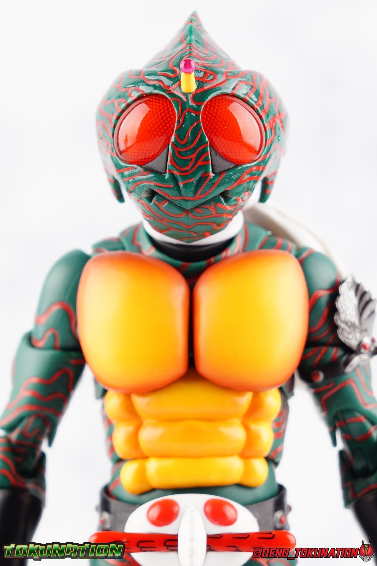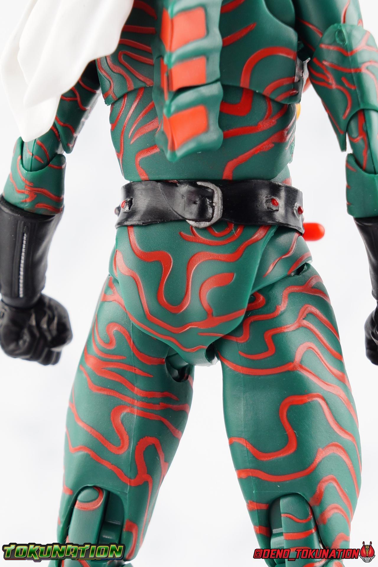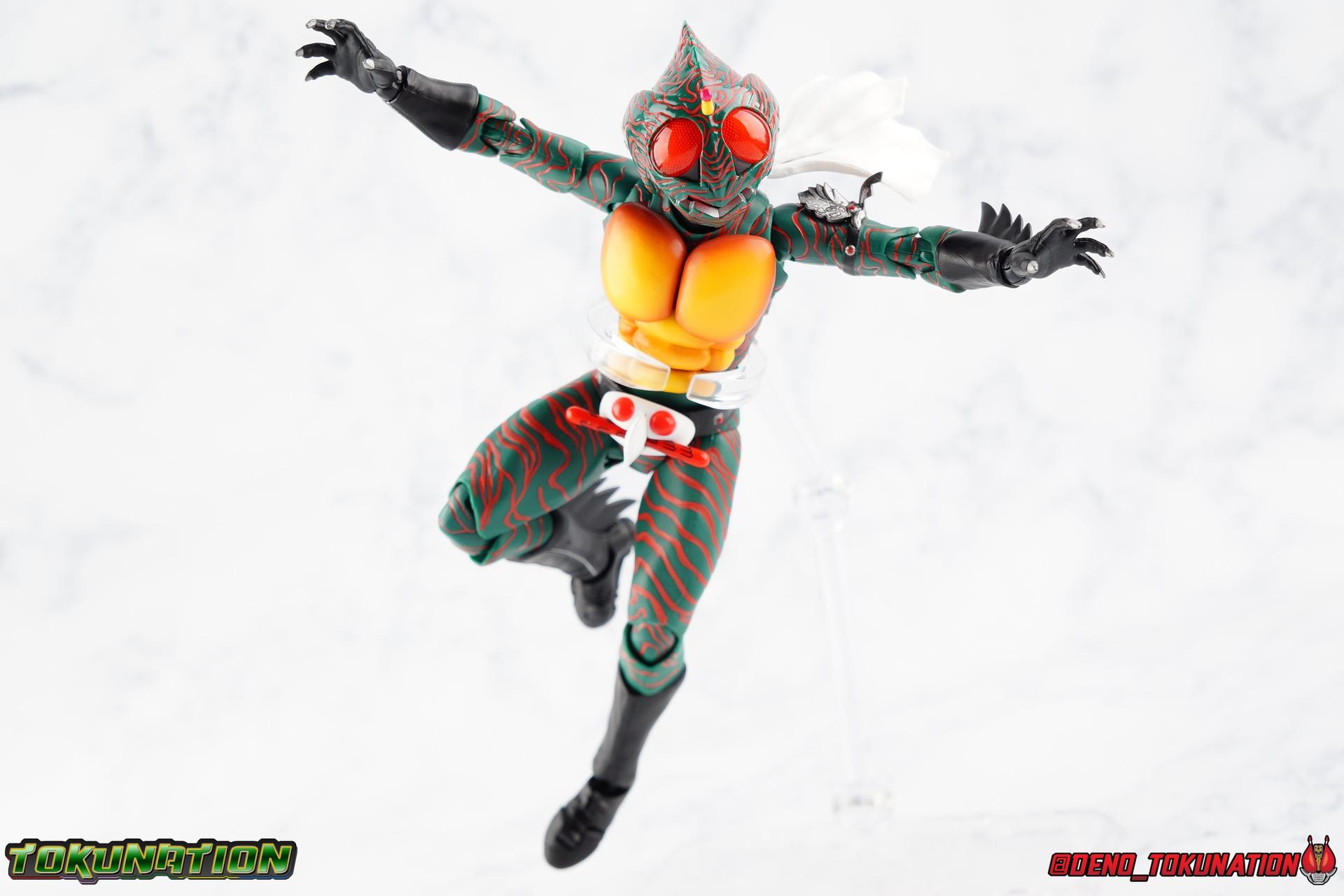 When the village Elder Bago passed the Incan GiGi Armlet to the wild boy Daisuke Yamamoto, he also performed an ancient ritual to save his life. In order to battle against the Ten-Faced Demon Gorgos, Daisuke would learn to use the ancient artifact he'd been entrusted with and master it's powers as Kamen Rider Amazon! Today, we see how Daisuke has evolved with a brand new figure, and the Amazon Series' first foray into the renewal era with S.H. Figuarts Shinkkocchou Seihou Kamen Rider Amazon! Packaging The familiar Shinkocchou Seihou slip cover box makes another appearance! Not much can be said about it this time that hasn't been said before. It's gotten a bit stale over time but it's still a pleasing type of collector's box. For Amazon we do have some cosmetic changes however. The new Bandai Spirits blue logo is featured on the box, as well as a new holofoil Tamashii Nations brand sticker. Main Figure 7 years ago, the original S.H. Figuarts Amazon was released, we reviewed it in 2016. At the time of it's release, this Amazon was already beginning to shift the quality of Showa figuarts, though it would be some time before real change came about with the Black & RX Renewals. Looking back now, Amazon is an extremely dated figure. But for it's time, it really was something else. The functionality & detail presented in it's sculpt was unprecedented. But things change, and now we have something of a next leap in the decade+ long history of S.H. Figuarts. Shinkocchou Seihou has slowly, but much more rapidly in the last 3 years, reshaped what figuarts are. Redesigning characters from the ground up with engineering that takes into account what these suits really looked like on screen, while accommodating the fact that there would be an actual person inside. As the first figure in the line, Kabuto really set the bar high, and I was highly impressed then. When Seihou W was released I found it easily to be the greatest release in the line thus far. Rider 1 was also an incredibly impressive change from it's original counterpart. With ALL of that being said, Shinkocchou Seihou Amazon is absolutely the best the line has to offer so far. Bar none. This version of Amazon, finally puts the original Figuart to shame. Just seeing the two side by side, it's evident just how short, wrongly colored, disproportionate, small overall, and frankly emaciated looking that figure was. The entire shape of it is just wrong. The Seihou is a thing of pure beauty to me. From the ground up, the suit has been fully realized and given the absolute best articulation possible given the design. Where the original had hollow ankles you could see straight through, the Seihou has fully formed feet on wide angle ball joints that provide plenty of posing opportunities. The knees are likewise just about perfect, they have far more range than the original, but like it, the calve spikes will impact the back of the leg when bent far enough. The hips also feature that wonderful interlaced style joint we've come to appreciate in recent years. Some people call it a diaper, but I greatly appreciate the separation of parts and joints in these hips. This complex design allows Amazon to assume some of his moist savage and acrobatic poses. Aside from functionality, the legs are detailed *perfectly*. Every red stripe is sculpted into the body of the figure, and this applies to their placement on the entire body. Then it's painted over. The sculpt is shallow as well, allowing the paint to look like red color on green fabric as with the actual suit. But the detailing isn't limited to just the body and appendages, Bandai has gone the extra mile and made sure that even the connecting joints of the figure feature this detail. Gone are the days of miscolored joints holding limbs together. This is perhaps my favorite minute detail. Moving up, we see Amazon's belt, the Condorer. Though not his henshin device, the Condorer is still just as iconic. The Seihou's belt is a bit more properly round, and has the black detailing the original lacked, while also being more proportionate to the body. Like the original it can be replaced with an open Condorer accessory. As huge an improvement as the legs are, the arms may be more so. The original figure suffered from long scrawny arms that lacked girth. Seihou Amazon is kind of jacked. Thankfully these arms also have a wealth of articulation. Fully unencumbered wrists, a natural elbow joint that fills in the gap as it moves, in much the same way as the knees. A full 360 bicep swivel, and possibly the best shoulder joint I've ever handled. More so than some other Seihou's (looking at you Rider 1), Amazon can bring his arms down to his sides a bit better, though still not totally flat. The trade-off is the excellent shoulder which allows full movement of the arms up and down in nearly any direction. The left arm features the GiGi Armlet, which looks a lot more natural this go around than with the original, as it actually goes around the entire bicep. The sculpt for it is phenomenally better as well. The abdomen and chest now are really something else. The original figure was separated into two chunks, with the pectoral section rotating a little above the lower half. The Seihou takes a cue from Rider 1 and separates this into 3 sections, which can each move independently. There are 3 rows of "abs", the lower most one being it's own ring on the torso, plugged into the waist itself. The middle section has the most movement, then the pecs can rotate a bit as well, but are actually more for arching the back or bending forward. Sometimes this can expose an ugly gap on the side, but it also just goes to show how much this figure can move. This section of the suit is just so much more accurate than the original, and thankfully doesn't have those wacky articulated pecs it did either. While these can move on the Seihou, you don't have giant gaps in them that expose the plastic underneath. And on Amazon's back is a finned spine