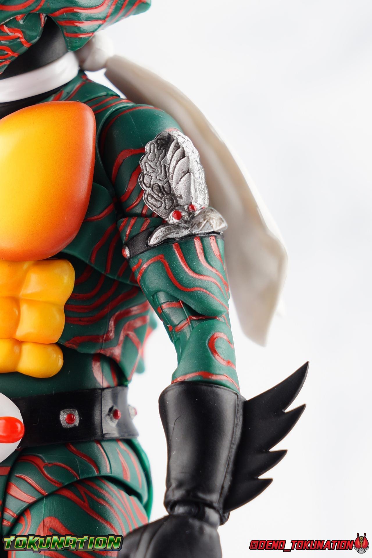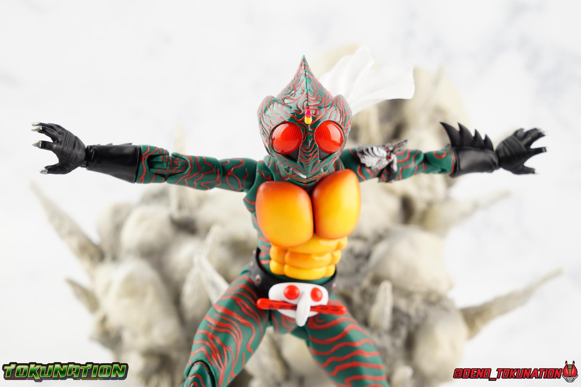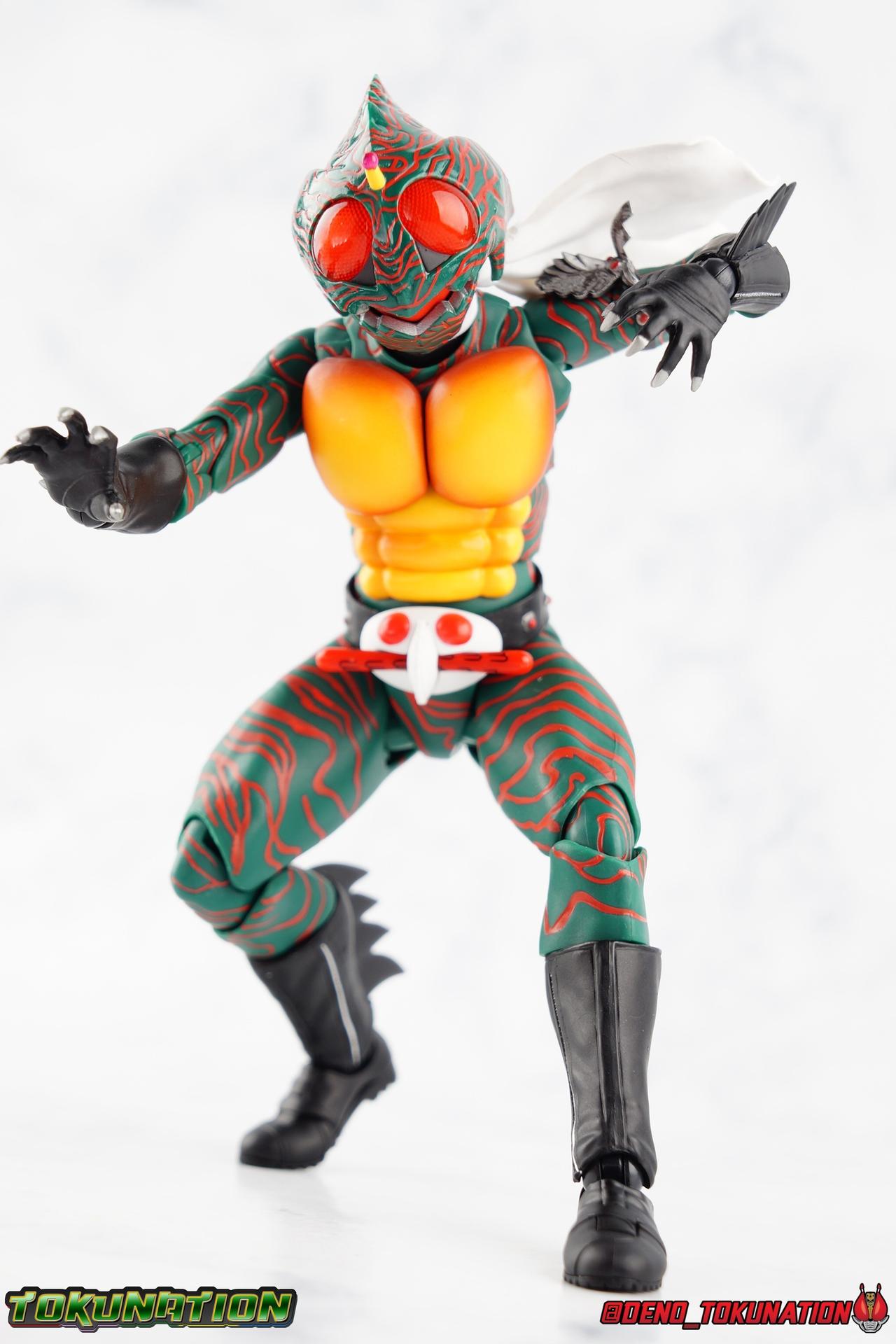When the village Elder Bago passed the Incan GiGi Armlet to the wild boy Daisuke Yamamoto, he also performed an ancient ritual to save his life. In order to battle against the Ten-Faced Demon Gorgos, Daisuke would learn to use the ancient artifact he'd been entrusted with and master it's powers as Kamen Rider Amazon! Today, we see how Daisuke has evolved with a brand new figure, and the Amazon Series' first foray into the renewal era with S.H. Figuarts Shinkkocchou Seihou Kamen Rider Amazon! Packaging The familiar Shinkocchou Seihou slip cover box makes another appearance! Not much can be said about it this time that hasn't been said before. It's gotten a bit stale over time but it's still a pleasing type of collector's box. For Amazon we do have some cosmetic changes however. The new Bandai Spirits blue logo is featured on the box, as well as a new holofoil Tamashii Nations brand sticker. Main Figure 7 years ago, the original S.H. Figuarts Amazon was released, we reviewed it in 2016. At the time of it's release, this Amazon was already beginning to shift the quality of Showa figuarts, though it would be some time before real change came about with the Black & RX Renewals. Looking back now, Amazon is an extremely dated figure. But for it's time, it really was something else. The functionality & detail presented in it's sculpt was unprecedented. But things change, and now we have something of a next leap in the decade+ long history of S.H. Figuarts. Shinkocchou Seihou has slowly, but much more rapidly in the last 3 years, reshaped what figuarts are. Redesigning characters from the ground up with engineering that takes into account what these suits really looked like on screen, while accommodating the fact that there would be an actual person inside. As the first figure in the line, Kabuto really set the bar high, and I was highly impressed then. When Seihou W was released I found it easily to be the greatest release in the line thus far. Rider 1 was also an incredibly impressive change from it's original counterpart. With ALL of that being said, Shinkocchou Seihou Amazon is absolutely the best the line has to offer so far. Bar none. This version of Amazon, finally puts the original Figuart to shame. Just seeing the two side by side, it's evident just how short, wrongly colored, disproportionate, small overall, and frankly emaciated looking that figure was. The entire shape of it is just wrong. The Seihou is a thing of pure beauty to me. From the ground up, the suit has been fully realized and given the absolute best articulation possible given the design. Where the original had hollow ankles you could see straight through, the Seihou has fully formed feet on wide angle ball joints that provide plenty of posing opportunities. The knees are likewise just about perfect, they have far more range than the original, but like it, the calve spikes will impact the back of the leg when bent far enough. The hips also feature that wonderful interlaced style joint we've come to appreciate in recent years. Some people call it a diaper, but I greatly appreciate the separation of parts and joints in these hips. This complex design allows Amazon to assume some of his moist savage and acrobatic poses. Aside from functionality, the legs are detailed *perfectly*. Every red stripe is sculpted into the body of the figure, and this applies to their placement on the entire body. Then it's painted over. The sculpt is shallow as well, allowing the paint to look like red color on green fabric as with the actual suit. But the detailing isn't limited to just the body and appendages, Bandai has gone the extra mile and made sure that even the connecting joints of the figure feature this detail. Gone are the days of miscolored joints holding limbs together. This is perhaps my favorite minute detail. Moving up, we see Amazon's belt, the Condorer. Though not his henshin device, the Condorer is still just as iconic. The Seihou's belt is a bit more properly round, and has the black detailing the original lacked, while also being more proportionate to the body. Like the original it can be replaced with an open Condorer accessory. As huge an improvement as the legs are, the arms may be more so. The original figure suffered from long scrawny arms that lacked girth. Seihou Amazon is kind of jacked. Thankfully these arms also have a wealth of articulation. Fully unencumbered wrists, a natural elbow joint that fills in the gap as it moves, in much the same way as the knees. A full 360 bicep swivel, and possibly the best shoulder joint I've ever handled. More so than some other Seihou's (looking at you Rider 1), Amazon can bring his arms down to his sides a bit better, though still not totally flat. The trade-off is the excellent shoulder which allows full movement of the arms up and down in nearly any direction. The left arm features the GiGi Armlet, which looks a lot more natural this go around than with the original, as it actually goes around the entire bicep. The sculpt for it is phenomenally better as well. The abdomen and chest now are really something else. The original figure was separated into two chunks, with the pectoral section rotating a little above the lower half. The Seihou takes a cue from Rider 1 and separates this into 3 sections, which can each move independently. There are 3 rows of "abs", the lower most one being it's own ring on the torso, plugged into the waist itself. The middle section has the most movement, then the pecs can rotate a bit as well, but are actually more for arching the back or bending forward. Sometimes this can expose an ugly gap on the side, but it also just goes to show how much this figure can move. This section of the suit is just so much more accurate than the original, and thankfully doesn't have those wacky articulated pecs it did either. While these can move on the Seihou, you don't have giant gaps in them that expose the plastic underneath. And on Amazon's back is a finned spine