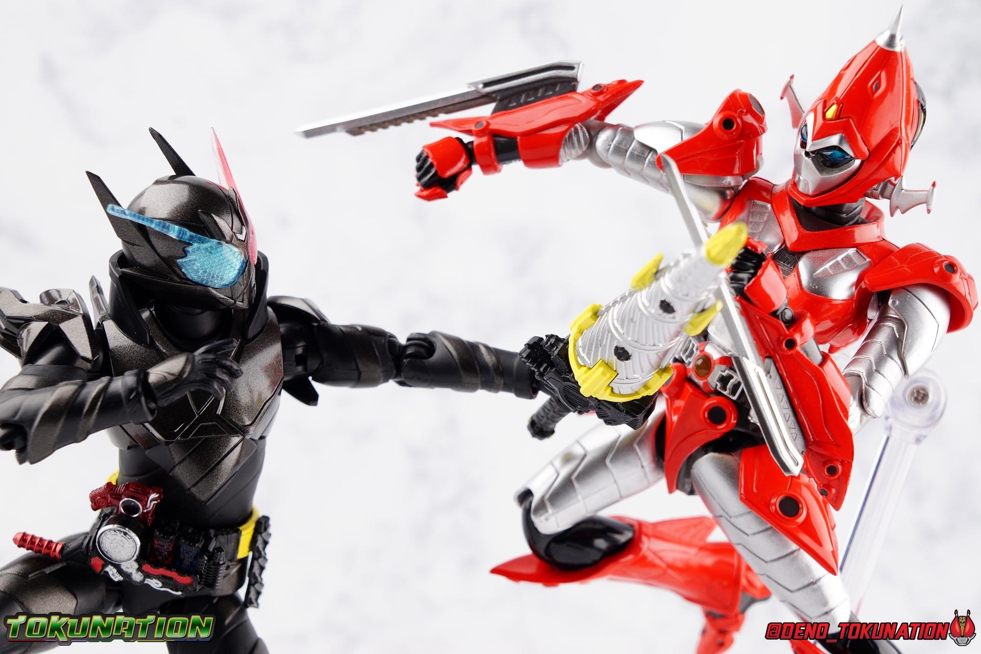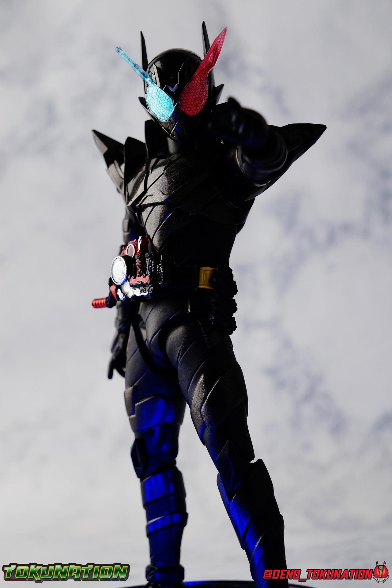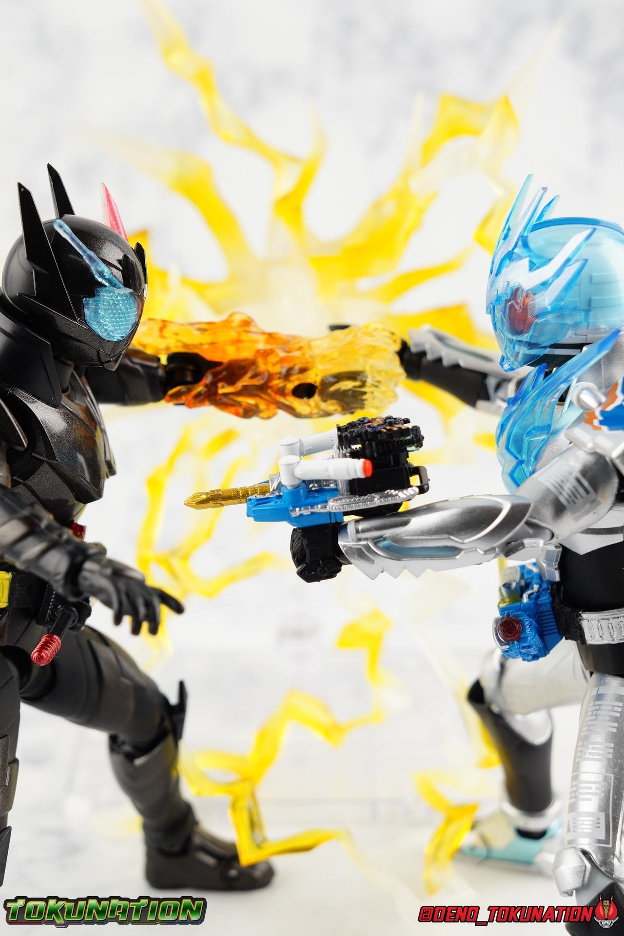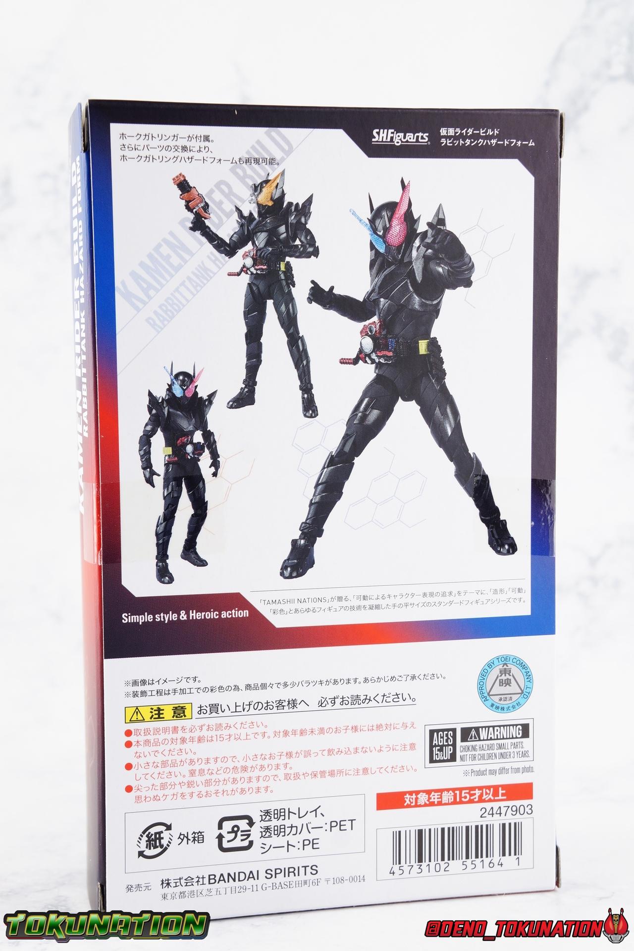 For the 2nd year in a row, Tamashii Nations has seriously delivered on their event exclusives. Cashing in with the extremely popular 2017 exclusive GenM Level 2 was clearly the correct move based on the value it still retains. And riding this years wave of popularity with Kamen Rider Build, Tamashii has made a similarly intelligent choice for their big exclusive. Unable to stave off new enemies and out of options, Sento sought help from his greatest enemy. The man known to our heroes as Souichi Isurugi would eventually reveal himself as the extra terrestrial threat, Evolt. But early on, he would torment and aide our heroes as it benefited his schemes under the guise of Blood Stalk. One of the most significant, and consequential, actions he undertook in these earlier days was giving Sento the Hazard Trigger. A weapon of incredible power, they couldn't possibly have known at the time it's dark origins, or what it was really based upon. Using this mighty power up, Build is able to achieve a dangerous new form, the black hazard, Kamen Rider Build Rabbit Tank Hazard Form! For better or worse Sento had to rely on this power, particularly and regrettably in his battles with Grease & the Hokuto Three. Packaging Following the recent trend of Tamashii Nations fall event exclusives, Hazard comes in a particularly gorgeous new slip cover box. Like GenM Level 2 last year, the slip cover was produced exclusively for the event release of the figure, while the later 2nd run being sold through the Tamashii Web Shop will not feature it. This slip features the event logos as well as a stunning shot of Hazard in blue flame on the back. The interior box is identical to what the Web release will be, but it does look so very nice. It's honestly hard for anything featuring this gorgeous form to look bad. Main Figure I know plenty of people like to link final forms to having detrimental side effects on their users, and there's some evidence to support that in the 1st half of the Heisei Era. Blade King Form is often cited. But I've never really considered that a benchmark for what makes a final form. To me, the more often dangerous forms are those that come close to final forms. The in-betweens, the new and experimental, the untamed powers, ones that require the hero to hone their skills to control. Dexterity gained using such forms prepares them for the final power to come. OOO PuToTyra is a great example of this. I do not consider this to be OOO final form no matter what some say. (It's Super TaToBa k?) In this zone of powerful and dangerous but not quite final are forms like Agito Burning, Kuuga Ultimate (again Rising Ultimate is the final, I will die on this hill), W Fang Joker, OOO PuToTyra, Wizard All Dragon, Drive Type's Dead Heat & Formula, etc. So Build Hazard Form fits right into that quarter to middle of series astronomically dangerous power-up category. But where does the figure fit in? For better or worse, Build Hazard is almost entirely a repaint of the standard Rabbit/Tank figuart. There are some newly mold parts, but it's a very similar release, as many figure's in this sub line have been. If you're familiar with one of them, you're likely familiar with several of them. The biggest difference here, is Hazard's tendency towards uniformity. Where many Build designs have asymmetrical elements to them, Hazard limits this mainly to the head. For now though, with the lower body the legs are largely identical to the original, aside from the absence of the rabbit "spring". Molded identically now, and painted in alternating shades of black, they look very sleek. The base of the body and legs in this case is a matte black, while the raised surfaces on the legs are more of a shiny speckled gray, which I really dig. It helps bring out detail that would otherwise not be as evident. For articulation, these legs function identically to the last three uses of the mold. The only limitations being some upward hip movement, and less than perfect knee bends. The Build Driver is once again carried over from previous outings. The new feature here is of course the addition of the new Hazard Trigger. The last several uses of the Build Driver do not actually have an open slot for the Trigger to be used, so it's molded into this one. If it is removable, well mine's in there quite tightly. The driver also features the same Rabbit & Tank Full Bottles seen on the first Build, though with slightly better paint apps. As always these bottles can be slotted into the left side hip mounted holster. For the upper body, we again see a new symmetrical component, the breast plate. While I love the interesting way the two-tone, uniquely molded halves of the chest normally are, this new uniform design adds some menace and power to the design, and draws your eyes to the center of the design as well. Interestingly the plate across the abs, is hinged to move up and out as necessary to get away from the Driver. The neckline also features a dramatic collar that accents the head really nicely and adds some fantastic artificial bulk and depth to the upper body. Color wise we see the base body in matte black, while armor and raised surfaced use that same nicely speckled black as the lower body. With the arms we again see what are essentially identical parts to the basic Build, Articulation works out the same for the most part. The only significant change are the new shoulder pads. The harsh and pointed design of these new shoulders adds to the overall menacing and powerful look of this figure. In a natural flow of design, they look like they're growing out of the new chest plate, and man I just really love them. Functionally they do hurt how much upward and outward movement there is in the shoulder. But they're no more worse than say Cross-Z Charge or say Blood Stalk's shoulders. The only true bit of asymmetry to this design is of course the head. This is a really striking and intense design that sets this form apart from all of Build's other to