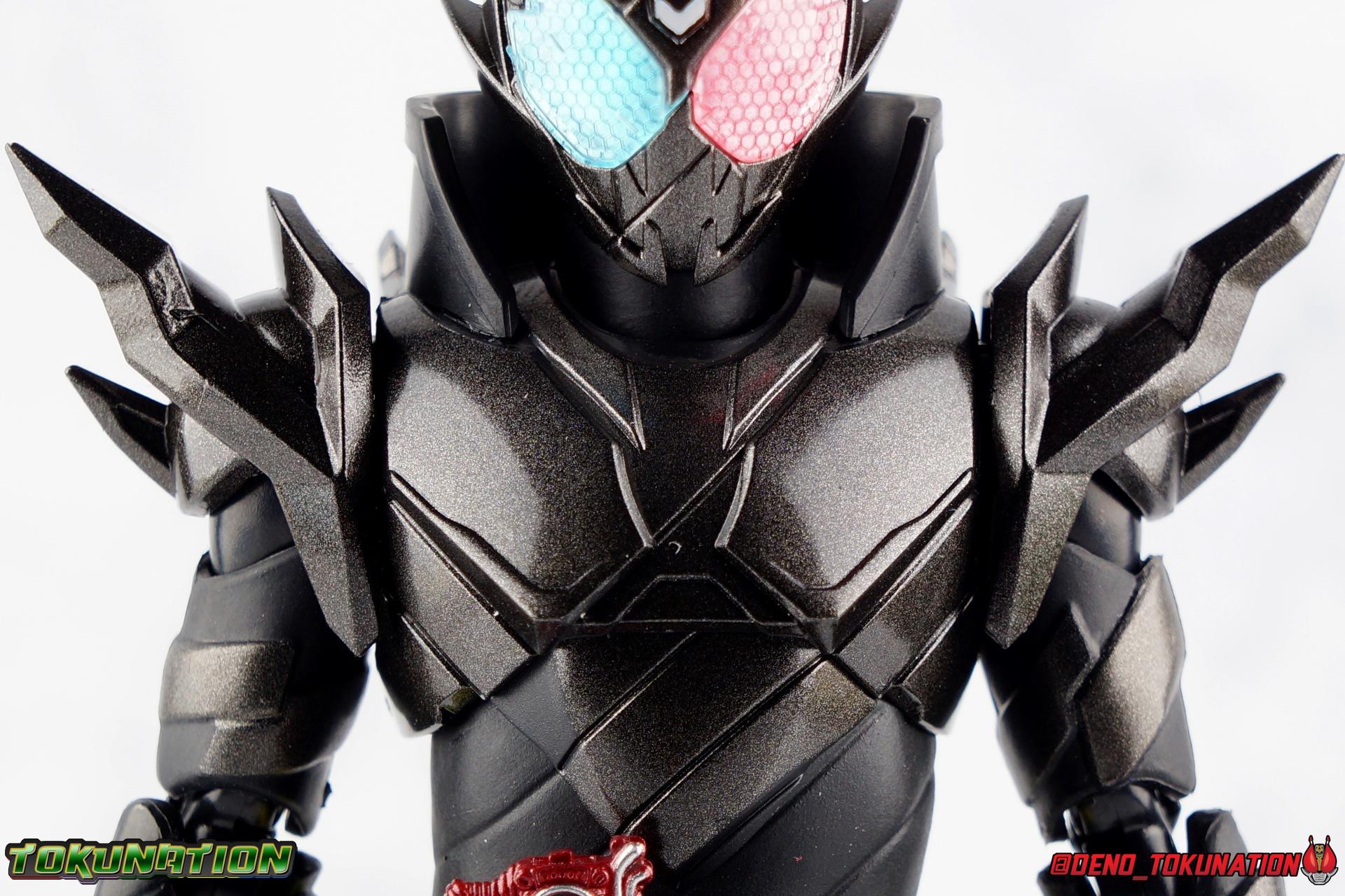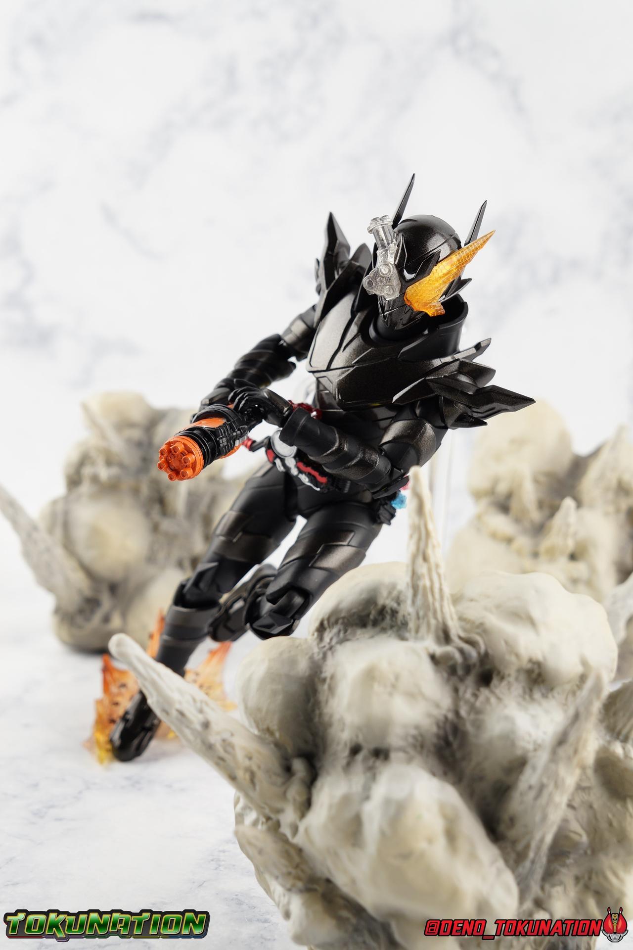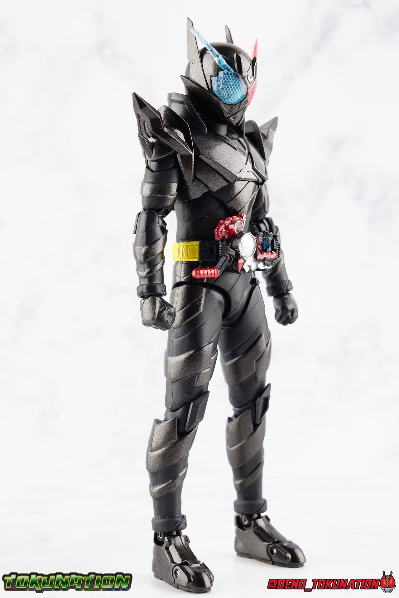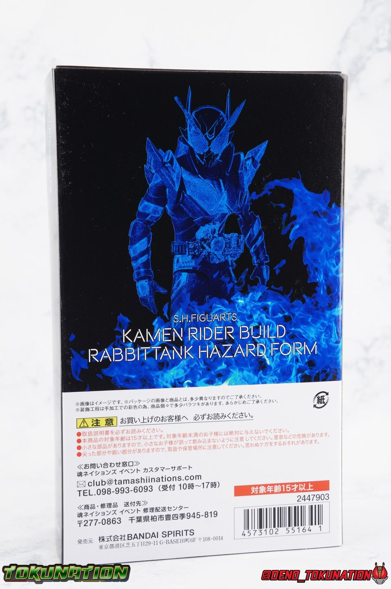For the 2nd year in a row, Tamashii Nations has seriously delivered on their event exclusives. Cashing in with the extremely popular 2017 exclusive GenM Level 2 was clearly the correct move based on the value it still retains. And riding this years wave of popularity with Kamen Rider Build, Tamashii has made a similarly intelligent choice for their big exclusive. Unable to stave off new enemies and out of options, Sento sought help from his greatest enemy. The man known to our heroes as Souichi Isurugi would eventually reveal himself as the extra terrestrial threat, Evolt. But early on, he would torment and aide our heroes as it benefited his schemes under the guise of Blood Stalk. One of the most significant, and consequential, actions he undertook in these earlier days was giving Sento the Hazard Trigger. A weapon of incredible power, they couldn't possibly have known at the time it's dark origins, or what it was really based upon. Using this mighty power up, Build is able to achieve a dangerous new form, the black hazard, Kamen Rider Build Rabbit Tank Hazard Form! For better or worse Sento had to rely on this power, particularly and regrettably in his battles with Grease & the Hokuto Three. Packaging Following the recent trend of Tamashii Nations fall event exclusives, Hazard comes in a particularly gorgeous new slip cover box. Like GenM Level 2 last year, the slip cover was produced exclusively for the event release of the figure, while the later 2nd run being sold through the Tamashii Web Shop will not feature it. This slip features the event logos as well as a stunning shot of Hazard in blue flame on the back. The interior box is identical to what the Web release will be, but it does look so very nice. It's honestly hard for anything featuring this gorgeous form to look bad. Main Figure I know plenty of people like to link final forms to having detrimental side effects on their users, and there's some evidence to support that in the 1st half of the Heisei Era. Blade King Form is often cited. But I've never really considered that a benchmark for what makes a final form. To me, the more often dangerous forms are those that come close to final forms. The in-betweens, the new and experimental, the untamed powers, ones that require the hero to hone their skills to control. Dexterity gained using such forms prepares them for the final power to come. OOO PuToTyra is a great example of this. I do not consider this to be OOO final form no matter what some say. (It's Super TaToBa k?) In this zone of powerful and dangerous but not quite final are forms like Agito Burning, Kuuga Ultimate (again Rising Ultimate is the final, I will die on this hill), W Fang Joker, OOO PuToTyra, Wizard All Dragon, Drive Type's Dead Heat & Formula, etc. So Build Hazard Form fits right into that quarter to middle of series astronomically dangerous power-up category. But where does the figure fit in? For better or worse, Build Hazard is almost entirely a repaint of the standard Rabbit/Tank figuart. There are some newly mold parts, but it's a very similar release, as many figure's in this sub line have been. If you're familiar with one of them, you're likely familiar with several of them. The biggest difference here, is Hazard's tendency towards uniformity. Where many Build designs have asymmetrical elements to them, Hazard limits this mainly to the head. For now though, with the lower body the legs are largely identical to the original, aside from the absence of the rabbit "spring". Molded identically now, and painted in alternating shades of black, they look very sleek. The base of the body and legs in this case is a matte black, while the raised surfaces on the legs are more of a shiny speckled gray, which I really dig. It helps bring out detail that would otherwise not be as evident. For articulation, these legs function identically to the last three uses of the mold. The only limitations being some upward hip movement, and less than perfect knee bends. The Build Driver is once again carried over from previous outings. The new feature here is of course the addition of the new Hazard Trigger. The last several uses of the Build Driver do not actually have an open slot for the Trigger to be used, so it's molded into this one. If it is removable, well mine's in there quite tightly. The driver also features the same Rabbit & Tank Full Bottles seen on the first Build, though with slightly better paint apps. As always these bottles can be slotted into the left side hip mounted holster. For the upper body, we again see a new symmetrical component, the breast plate. While I love the interesting way the two-tone, uniquely molded halves of the chest normally are, this new uniform design adds some menace and power to the design, and draws your eyes to the center of the design as well. Interestingly the plate across the abs, is hinged to move up and out as necessary to get away from the Driver. The neckline also features a dramatic collar that accents the head really nicely and adds some fantastic artificial bulk and depth to the upper body. Color wise we see the base body in matte black, while armor and raised surfaced use that same nicely speckled black as the lower body. With the arms we again see what are essentially identical parts to the basic Build, Articulation works out the same for the most part. The only significant change are the new shoulder pads. The harsh and pointed design of these new shoulders adds to the overall menacing and powerful look of this figure. In a natural flow of design, they look like they're growing out of the new chest plate, and man I just really love them. Functionally they do hurt how much upward and outward movement there is in the shoulder. But they're no more worse than say Cross-Z Charge or say Blood Stalk's shoulders. The only true bit of asymmetry to this design is of course the head. This is a really striking and intense design that sets this form apart from all of Build's other to