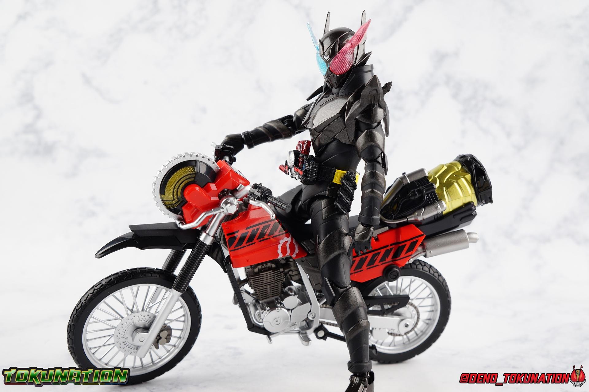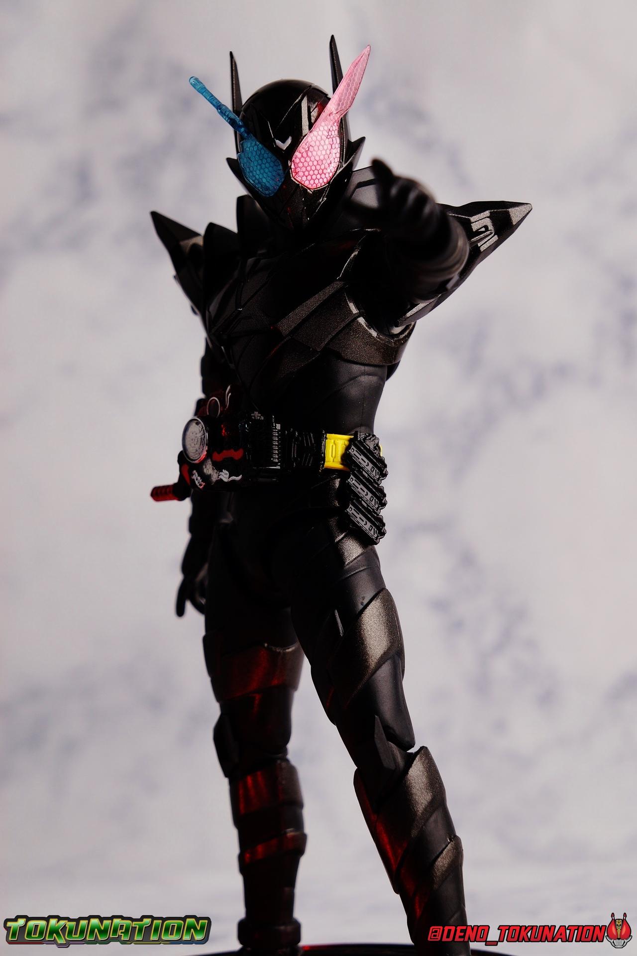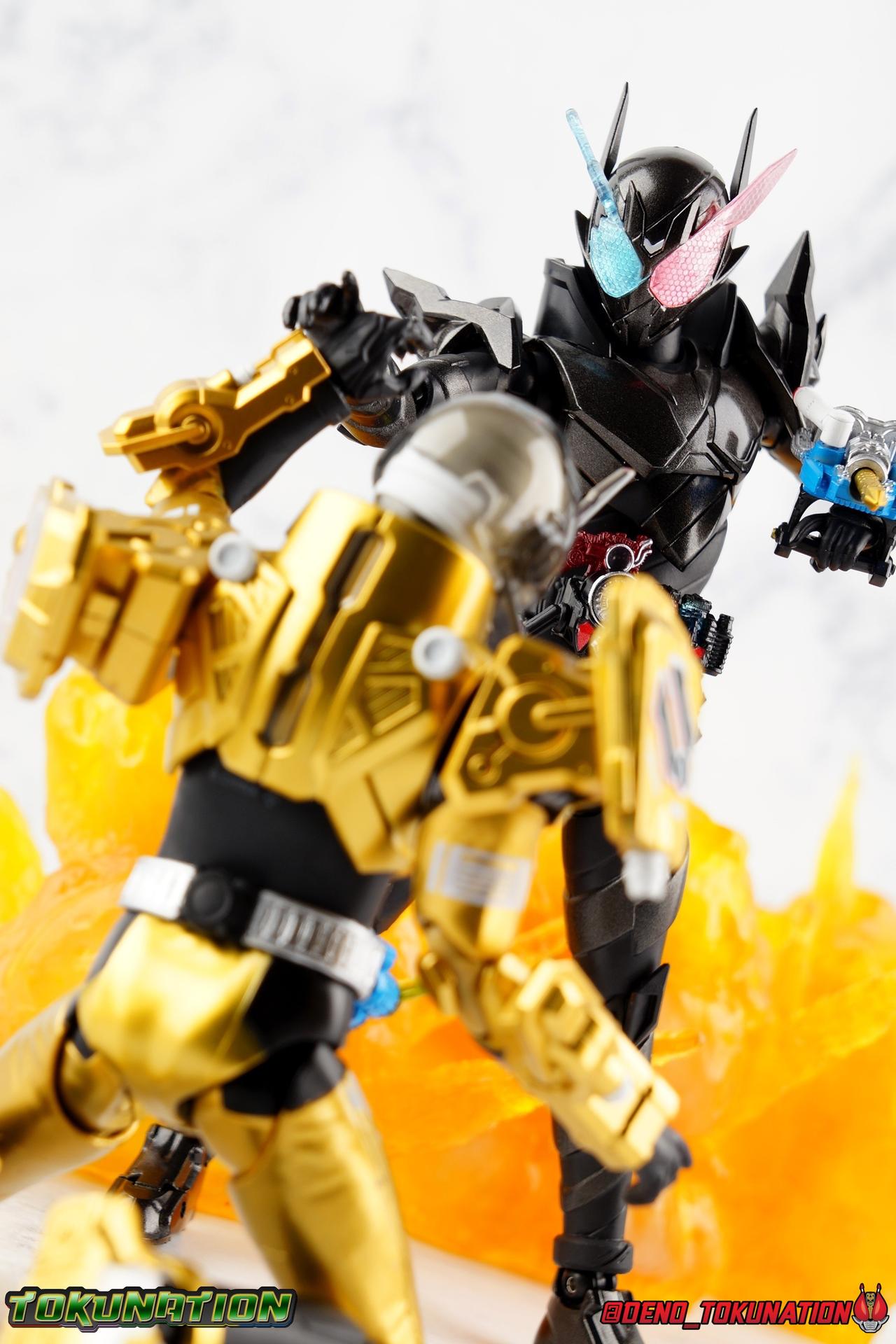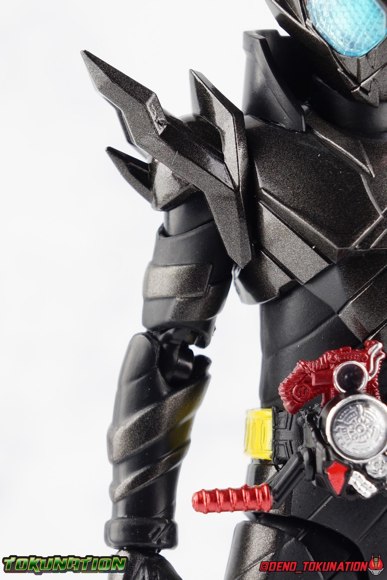 For the 2nd year in a row, Tamashii Nations has seriously delivered on their event exclusives. Cashing in with the extremely popular 2017 exclusive GenM Level 2 was clearly the correct move based on the value it still retains. And riding this years wave of popularity with Kamen Rider Build, Tamashii has made a similarly intelligent choice for their big exclusive. Unable to stave off new enemies and out of options, Sento sought help from his greatest enemy. The man known to our heroes as Souichi Isurugi would eventually reveal himself as the extra terrestrial threat, Evolt. But early on, he would torment and aide our heroes as it benefited his schemes under the guise of Blood Stalk. One of the most significant, and consequential, actions he undertook in these earlier days was giving Sento the Hazard Trigger. A weapon of incredible power, they couldn't possibly have known at the time it's dark origins, or what it was really based upon. Using this mighty power up, Build is able to achieve a dangerous new form, the black hazard, Kamen Rider Build Rabbit Tank Hazard Form! For better or worse Sento had to rely on this power, particularly and regrettably in his battles with Grease & the Hokuto Three. Packaging Following the recent trend of Tamashii Nations fall event exclusives, Hazard comes in a particularly gorgeous new slip cover box. Like GenM Level 2 last year, the slip cover was produced exclusively for the event release of the figure, while the later 2nd run being sold through the Tamashii Web Shop will not feature it. This slip features the event logos as well as a stunning shot of Hazard in blue flame on the back. The interior box is identical to what the Web release will be, but it does look so very nice. It's honestly hard for anything featuring this gorgeous form to look bad. Main Figure I know plenty of people like to link final forms to having detrimental side effects on their users, and there's some evidence to support that in the 1st half of the Heisei Era. Blade King Form is often cited. But I've never really considered that a benchmark for what makes a final form. To me, the more often dangerous forms are those that come close to final forms. The in-betweens, the new and experimental, the untamed powers, ones that require the hero to hone their skills to control. Dexterity gained using such forms prepares them for the final power to come. OOO PuToTyra is a great example of this. I do not consider this to be OOO final form no matter what some say. (It's Super TaToBa k?) In this zone of powerful and dangerous but not quite final are forms like Agito Burning, Kuuga Ultimate (again Rising Ultimate is the final, I will die on this hill), W Fang Joker, OOO PuToTyra, Wizard All Dragon, Drive Type's Dead Heat & Formula, etc. So Build Hazard Form fits right into that quarter to middle of series astronomically dangerous power-up category. But where does the figure fit in? For better or worse, Build Hazard is almost entirely a repaint of the standard Rabbit/Tank figuart. There are some newly mold parts, but it's a very similar release, as many figure's in this sub line have been. If you're familiar with one of them, you're likely familiar with several of them. The biggest difference here, is Hazard's tendency towards uniformity. Where many Build designs have asymmetrical elements to them, Hazard limits this mainly to the head. For now though, with the lower body the legs are largely identical to the original, aside from the absence of the rabbit "spring". Molded identically now, and painted in alternating shades of black, they look very sleek. The base of the body and legs in this case is a matte black, while the raised surfaces on the legs are more of a shiny speckled gray, which I really dig. It helps bring out detail that would otherwise not be as evident. For articulation, these legs function identically to the last three uses of the mold. The only limitations being some upward hip movement, and less than perfect knee bends. The Build Driver is once again carried over from previous outings. The new feature here is of course the addition of the new Hazard Trigger. The last several uses of the Build Driver do not actually have an open slot for the Trigger to be used, so it's molded into this one. If it is removable, well mine's in there quite tightly. The driver also features the same Rabbit & Tank Full Bottles seen on the first Build, though with slightly better paint apps. As always these bottles can be slotted into the left side hip mounted holster. For the upper body, we again see a new symmetrical component, the breast plate. While I love the interesting way the two-tone, uniquely molded halves of the chest normally are, this new uniform design adds some menace and power to the design, and draws your eyes to the center of the design as well. Interestingly the plate across the abs, is hinged to move up and out as necessary to get away from the Driver. The neckline also features a dramatic collar that accents the head really nicely and adds some fantastic artificial bulk and depth to the upper body. Color wise we see the base body in matte black, while armor and raised surfaced use that same nicely speckled black as the lower body. With the arms we again see what are essentially identical parts to the basic Build, Articulation works out the same for the most part. The only significant change are the new shoulder pads. The harsh and pointed design of these new shoulders adds to the overall menacing and powerful look of this figure. In a natural flow of design, they look like they're growing out of the new chest plate, and man I just really love them. Functionally they do hurt how much upward and outward movement there is in the shoulder. But they're no more worse than say Cross-Z Charge or say Blood Stalk's shoulders. The only true bit of asymmetry to this design is of course the head. This is a really striking and intense design that sets this form apart from all of Build's other to