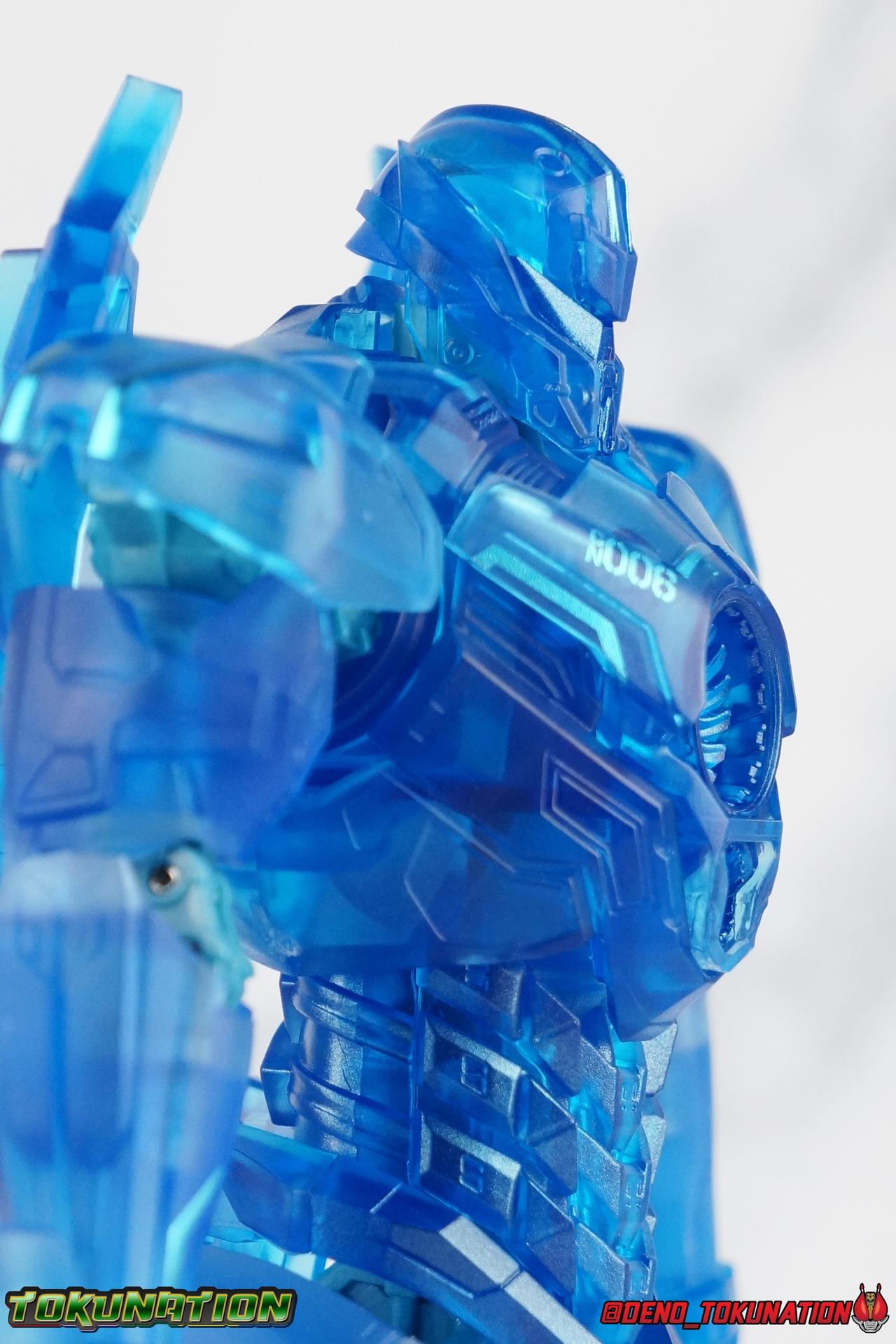 Last month we took you on a tour of all things Pacific Rim Uprising with a complete look at the line of Robot Spirits figures produced for the film from Tamashii Nations. 6 solid releases, each with it's own strengths and weaknesses. Now, we get to add an extra step on that journey with a look a this recent 7-11 Japan Exclusive release. Robot Spirits Gipsy Avenger Clear Blueprint Version! Packaging Feeling very much like a Takara Tomy Transformers exclusive, Blueprint Gipsy comes in a color shifted version of the original releases's box. The package is identical in design, just done up in light blue with white accents. The new "Clear Blueprint Ver." name has also been added to the box. Otherwise it's still the same innovative box design we've gotten to know with this line. Main Figure The $20 price tag that accompanied the original Gipsy Avenger release is what truly sold me on it, and ultimately the entire toyline. Bandai really did an excellent job marketing and releasing these figures. As an exclusive Blueprint Gipsy is a bit different. It wasn't available in the US, it was only sold at Japanese 7-11 locations, it retailed for 5180 yen, and given it's release method to import it here you'd have to pay some middleman and shipping fees. I got lucky and had a friend hook me up with mine so it came out to around $60 USD when all was said and done. So it's a good thing I really love this mold already. My review of this figure is going to essentially be word for word the one I wrote for the original Gipsy Avenger release. The "Clear Blueprint" part of this figure is pretty obvious. This figure has been recast in almost entirely translucent blue plastic. Essentially every part of the body is made from this material. The only parts that aren't, are the joints. Which are cast in a very pale blue that compliments and blends with the clear parts quite well. That's basically the ankles, knees, hips, shoulders and neck. You'll also notice some subtle ice blue paint apps on certain parts such as the shins/calfs. Much of the paint applications that the original Gipsy had are also applied here in that same ice blue. Like the ID numbers on the thighs as well as the chest details. These colors are absolutely stunning on this mold frankly. Now back to some articulation notes. The Gipsy Avenger is a very flexible robot with a few caveats that leave it just short of perfect. After reviewing all 6 of the mainline releases, it's easy for me to see that Gipsy is still the best and most balanced of them all. And much of it's Excellence is still owed to the implementation of it's leg articulation. Gipsy has ball-jointed ankles with a ton of open range thanks to the ankle armor design. You'll find this mech can pull off very wide and stable poses thanks to these ankles and balances very nicely. Another one in the win column is Gypsy's very flexible knees, allowing you to bend the leg back far enough that the calf touches the back of the thigh. That odd waist/hip/thigh assembly that carries through the line is still present, and it still works really well. Each thigh has a rotating section within it attached to the hip ball joint which let you turn the leg in or out, but they themselves are also attached to another balljoint down within the thigh. In essence Double jointed thighs.The hip balljoints are also attached to the interior of the waist on a shared panel and moves independently of the waist/crotch itself. This entire assembly can swing in and out of both sides of the waist allowing for maximum movement. The upper body, while not as dynamic, is still sculpted beautifully. We get an upper body on a "floating" joint allowing you to rotate it within about a 90 degree range. You can basically get Gypsy looking directly sideways thanks to this joint. The ab section is attached to the waist so it won't move independently i.e. no waist joint, but it all still looks great. On Gipsy's back there are some peg holes that you can plug his shoulder wings/binders into, to complete the basic look out of box just go ahead and throw them on. I actually really appreciate this upgrade to the design over Gipsy Danger's bulkier shoulder pad and hunched down look. Gipsy's arms do leave a little bit to be desired. In a similar fashion to the thighs, the shoulder joints are double jointed. There's a ball joint in the shoulder and one within the upper arm giving you an exceptional range of motion up and down. The issue lies in the way the shoulder pads have to maneuver between the torso armor and wing binders on the back. Depending on how far up or down the arms are positioned and where the shoulder plate is at the time, it can be a little difficult to give the arm proper clearance. Because of this armor you do lose the potential to extend the arms straight out to Gypsy's sides which is a shame to me. To the side you're limited to about 45 degrees, pointing forward the arms only get about 30 degrees of movement. Luckily a swiveling bicep helps alleviate some issues. Thankfully we also get a double jointed elbow, which is a by-product of the toys ability to swap forearm weapons. I should mention that removing the forearms is quite easy to do. The wrists are the only other real letdown of the arms. The wrist guards block the hands just enough to impact the fists and keep them from getting in a few standard poses. The wrist joints across the line have been quite weak and sadly there's more of the same here. The hands pop off quite easily. Gipsy Avenger's head is the last component to touch on. As with the rest of the design, I find this sleeker design to be superior to Gypsy Danger's. Avenger has a very super robot-esque look that the head complements quite well. Like the arms and legs, the neck is on a double ball joint. So you get movement within the chest and at the neck joint. And there's only minimal impact with any of the armor around the head to worry about. Overall this is a very well balanced (in more than one sense) figure