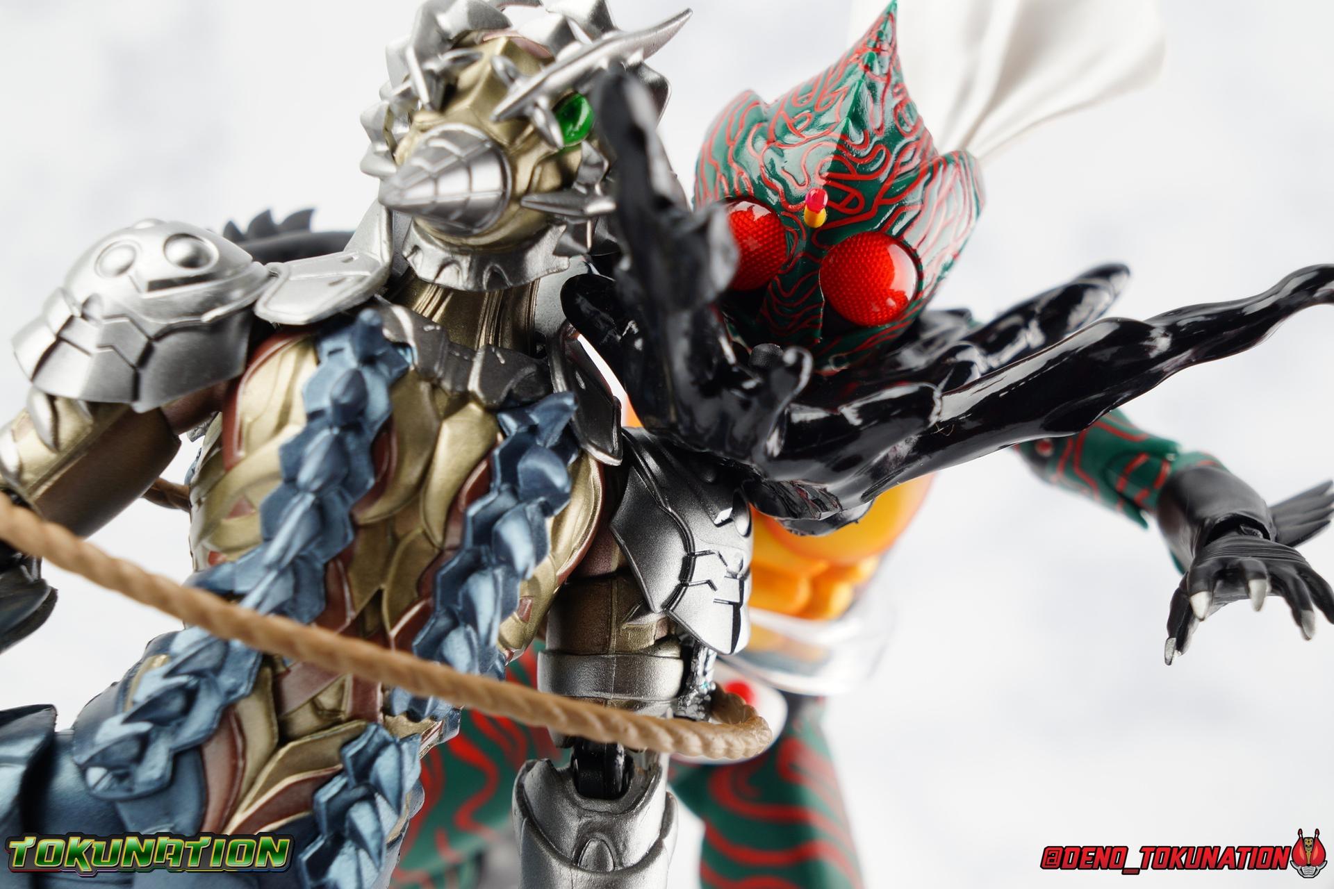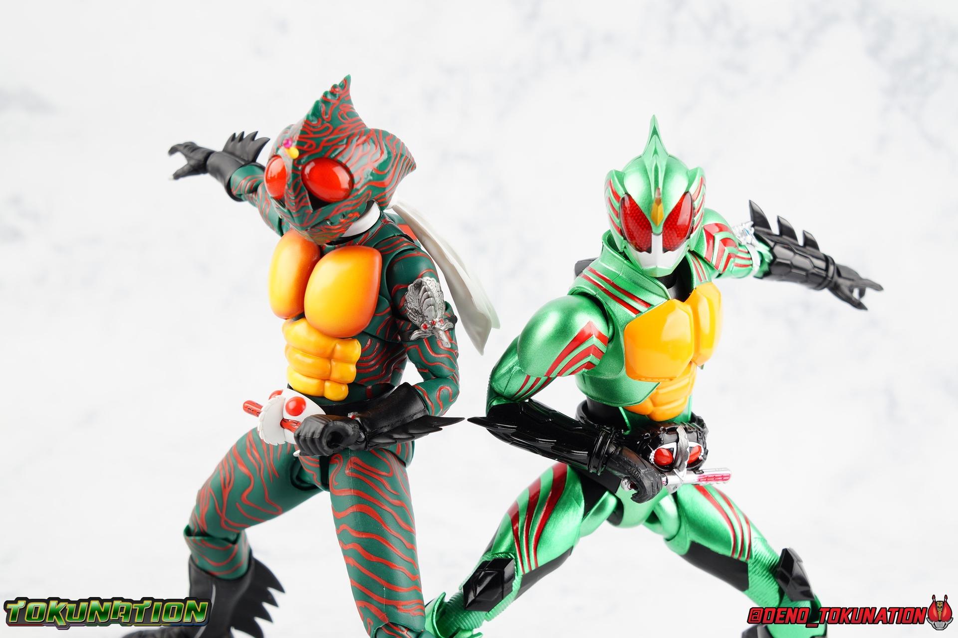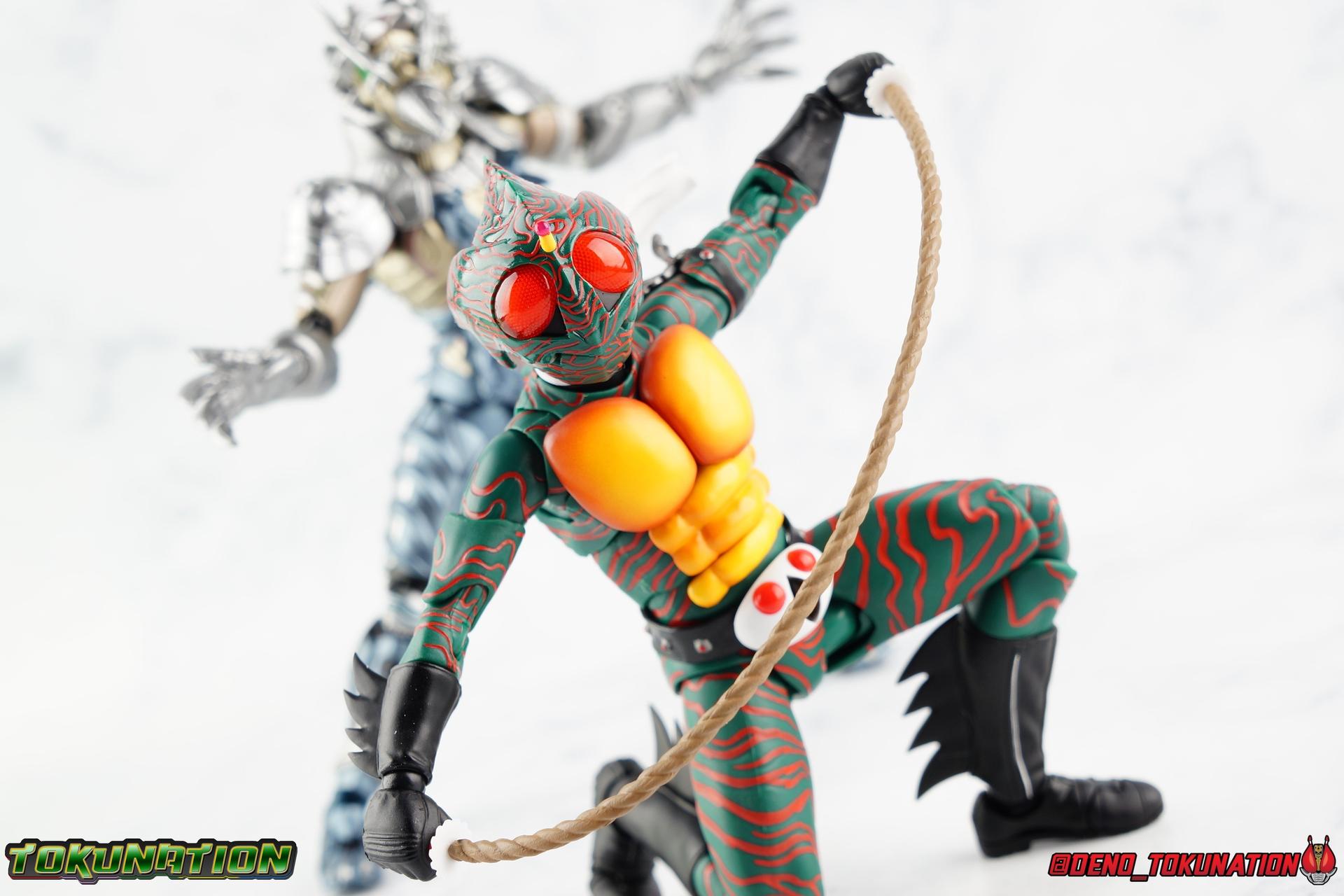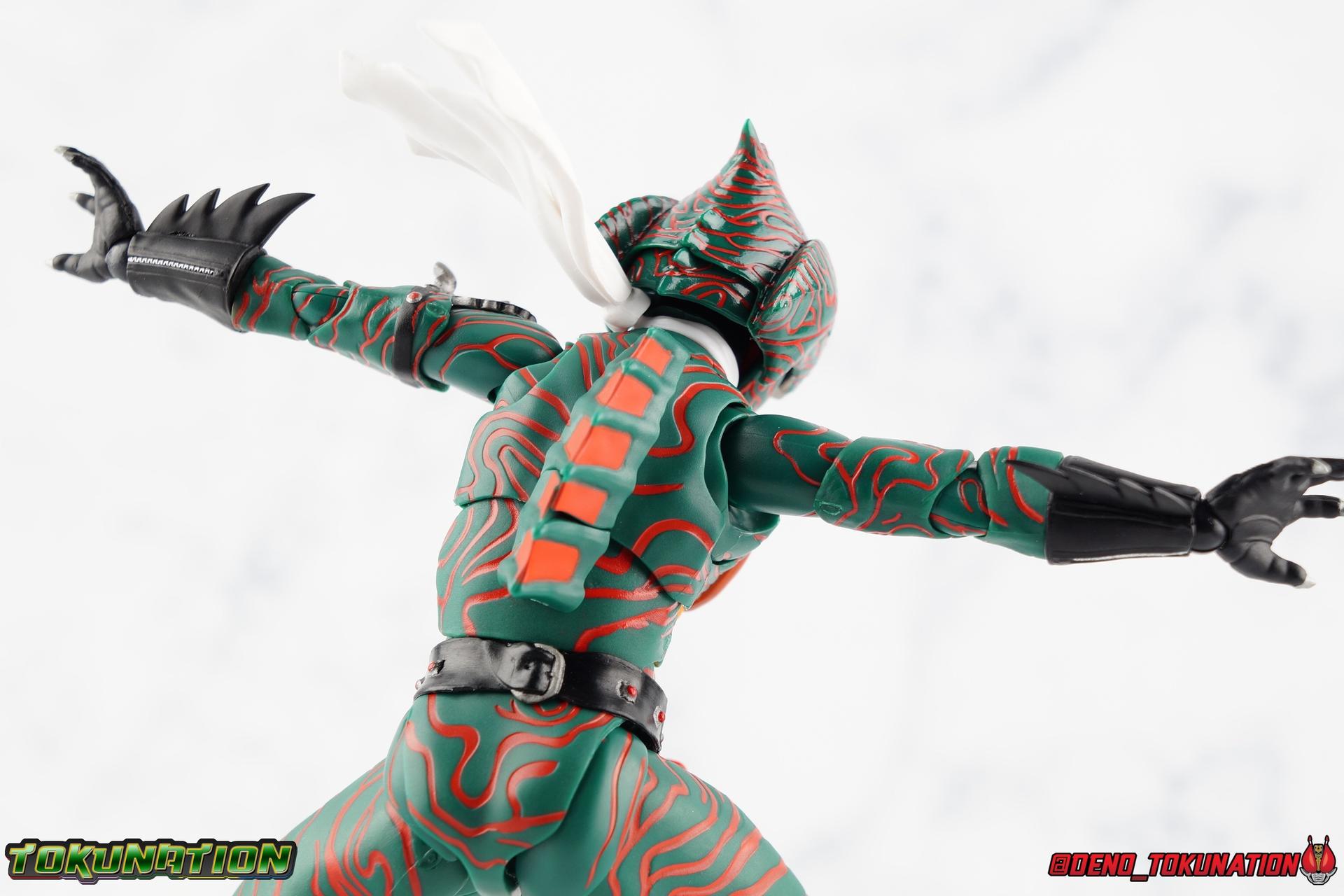 When the village Elder Bago passed the Incan GiGi Armlet to the wild boy Daisuke Yamamoto, he also performed an ancient ritual to save his life. In order to battle against the Ten-Faced Demon Gorgos, Daisuke would learn to use the ancient artifact he'd been entrusted with and master it's powers as Kamen Rider Amazon! Today, we see how Daisuke has evolved with a brand new figure, and the Amazon Series' first foray into the renewal era with S.H. Figuarts Shinkkocchou Seihou Kamen Rider Amazon! Packaging The familiar Shinkocchou Seihou slip cover box makes another appearance! Not much can be said about it this time that hasn't been said before. It's gotten a bit stale over time but it's still a pleasing type of collector's box. For Amazon we do have some cosmetic changes however. The new Bandai Spirits blue logo is featured on the box, as well as a new holofoil Tamashii Nations brand sticker. Main Figure 7 years ago, the original S.H. Figuarts Amazon was released, we reviewed it in 2016. At the time of it's release, this Amazon was already beginning to shift the quality of Showa figuarts, though it would be some time before real change came about with the Black & RX Renewals. Looking back now, Amazon is an extremely dated figure. But for it's time, it really was something else. The functionality & detail presented in it's sculpt was unprecedented. But things change, and now we have something of a next leap in the decade+ long history of S.H. Figuarts. Shinkocchou Seihou has slowly, but much more rapidly in the last 3 years, reshaped what figuarts are. Redesigning characters from the ground up with engineering that takes into account what these suits really looked like on screen, while accommodating the fact that there would be an actual person inside. As the first figure in the line, Kabuto really set the bar high, and I was highly impressed then. When Seihou W was released I found it easily to be the greatest release in the line thus far. Rider 1 was also an incredibly impressive change from it's original counterpart. With ALL of that being said, Shinkocchou Seihou Amazon is absolutely the best the line has to offer so far. Bar none. This version of Amazon, finally puts the original Figuart to shame. Just seeing the two side by side, it's evident just how short, wrongly colored, disproportionate, small overall, and frankly emaciated looking that figure was. The entire shape of it is just wrong. The Seihou is a thing of pure beauty to me. From the ground up, the suit has been fully realized and given the absolute best articulation possible given the design. Where the original had hollow ankles you could see straight through, the Seihou has fully formed feet on wide angle ball joints that provide plenty of posing opportunities. The knees are likewise just about perfect, they have far more range than the original, but like it, the calve spikes will impact the back of the leg when bent far enough. The hips also feature that wonderful interlaced style joint we've come to appreciate in recent years. Some people call it a diaper, but I greatly appreciate the separation of parts and joints in these hips. This complex design allows Amazon to assume some of his moist savage and acrobatic poses. Aside from functionality, the legs are detailed *perfectly*. Every red stripe is sculpted into the body of the figure, and this applies to their placement on the entire body. Then it's painted over. The sculpt is shallow as well, allowing the paint to look like red color on green fabric as with the actual suit. But the detailing isn't limited to just the body and appendages, Bandai has gone the extra mile and made sure that even the connecting joints of the figure feature this detail. Gone are the days of miscolored joints holding limbs together. This is perhaps my favorite minute detail. Moving up, we see Amazon's belt, the Condorer. Though not his henshin device, the Condorer is still just as iconic. The Seihou's belt is a bit more properly round, and has the black detailing the original lacked, while also being more proportionate to the body. Like the original it can be replaced with an open Condorer accessory. As huge an improvement as the legs are, the arms may be more so. The original figure suffered from long scrawny arms that lacked girth. Seihou Amazon is kind of jacked. Thankfully these arms also have a wealth of articulation. Fully unencumbered wrists, a natural elbow joint that fills in the gap as it moves, in much the same way as the knees. A full 360 bicep swivel, and possibly the best shoulder joint I've ever handled. More so than some other Seihou's (looking at you Rider 1), Amazon can bring his arms down to his sides a bit better, though still not totally flat. The trade-off is the excellent shoulder which allows full movement of the arms up and down in nearly any direction. The left arm features the GiGi Armlet, which looks a lot more natural this go around than with the original, as it actually goes around the entire bicep. The sculpt for it is phenomenally better as well. The abdomen and chest now are really something else. The original figure was separated into two chunks, with the pectoral section rotating a little above the lower half. The Seihou takes a cue from Rider 1 and separates this into 3 sections, which can each move independently. There are 3 rows of "abs", the lower most one being it's own ring on the torso, plugged into the waist itself. The middle section has the most movement, then the pecs can rotate a bit as well, but are actually more for arching the back or bending forward. Sometimes this can expose an ugly gap on the side, but it also just goes to show how much this figure can move. This section of the suit is just so much more accurate than the original, and thankfully doesn't have those wacky articulated pecs it did either. While these can move on the Seihou, you don't have giant gaps in them that expose the plastic underneath. And on Amazon's back is a finned spine