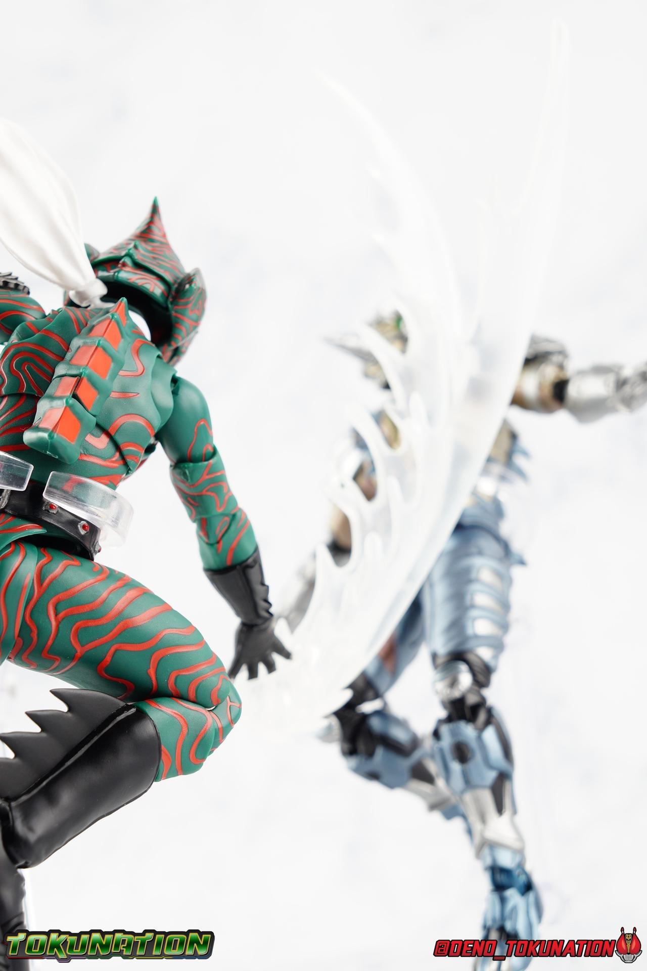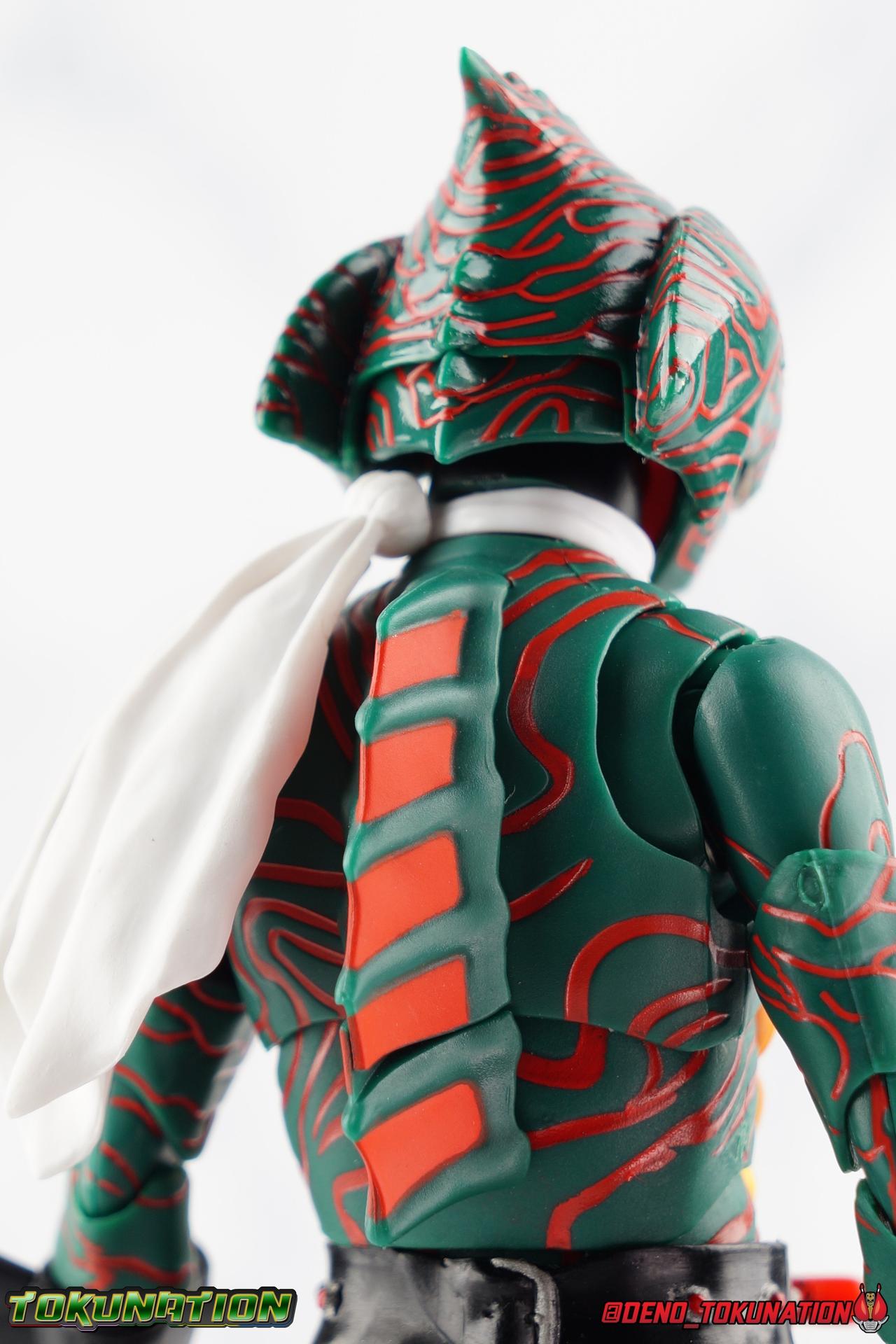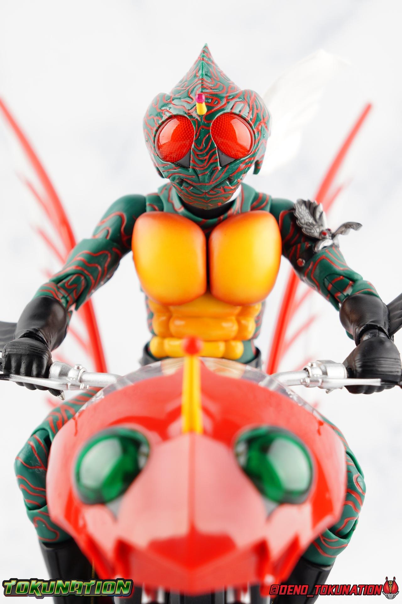 When the village Elder Bago passed the Incan GiGi Armlet to the wild boy Daisuke Yamamoto, he also performed an ancient ritual to save his life. In order to battle against the Ten-Faced Demon Gorgos, Daisuke would learn to use the ancient artifact he'd been entrusted with and master it's powers as Kamen Rider Amazon! Today, we see how Daisuke has evolved with a brand new figure, and the Amazon Series' first foray into the renewal era with S.H. Figuarts Shinkkocchou Seihou Kamen Rider Amazon! Packaging The familiar Shinkocchou Seihou slip cover box makes another appearance! Not much can be said about it this time that hasn't been said before. It's gotten a bit stale over time but it's still a pleasing type of collector's box. For Amazon we do have some cosmetic changes however. The new Bandai Spirits blue logo is featured on the box, as well as a new holofoil Tamashii Nations brand sticker. Main Figure 7 years ago, the original S.H. Figuarts Amazon was released, we reviewed it in 2016. At the time of it's release, this Amazon was already beginning to shift the quality of Showa figuarts, though it would be some time before real change came about with the Black & RX Renewals. Looking back now, Amazon is an extremely dated figure. But for it's time, it really was something else. The functionality & detail presented in it's sculpt was unprecedented. But things change, and now we have something of a next leap in the decade+ long history of S.H. Figuarts. Shinkocchou Seihou has slowly, but much more rapidly in the last 3 years, reshaped what figuarts are. Redesigning characters from the ground up with engineering that takes into account what these suits really looked like on screen, while accommodating the fact that there would be an actual person inside. As the first figure in the line, Kabuto really set the bar high, and I was highly impressed then. When Seihou W was released I found it easily to be the greatest release in the line thus far. Rider 1 was also an incredibly impressive change from it's original counterpart. With ALL of that being said, Shinkocchou Seihou Amazon is absolutely the best the line has to offer so far. Bar none. This version of Amazon, finally puts the original Figuart to shame. Just seeing the two side by side, it's evident just how short, wrongly colored, disproportionate, small overall, and frankly emaciated looking that figure was. The entire shape of it is just wrong. The Seihou is a thing of pure beauty to me. From the ground up, the suit has been fully realized and given the absolute best articulation possible given the design. Where the original had hollow ankles you could see straight through, the Seihou has fully formed feet on wide angle ball joints that provide plenty of posing opportunities. The knees are likewise just about perfect, they have far more range than the original, but like it, the calve spikes will impact the back of the leg when bent far enough. The hips also feature that wonderful interlaced style joint we've come to appreciate in recent years. Some people call it a diaper, but I greatly appreciate the separation of parts and joints in these hips. This complex design allows Amazon to assume some of his moist savage and acrobatic poses. Aside from functionality, the legs are detailed *perfectly*. Every red stripe is sculpted into the body of the figure, and this applies to their placement on the entire body. Then it's painted over. The sculpt is shallow as well, allowing the paint to look like red color on green fabric as with the actual suit. But the detailing isn't limited to just the body and appendages, Bandai has gone the extra mile and made sure that even the connecting joints of the figure feature this detail. Gone are the days of miscolored joints holding limbs together. This is perhaps my favorite minute detail. Moving up, we see Amazon's belt, the Condorer. Though not his henshin device, the Condorer is still just as iconic. The Seihou's belt is a bit more properly round, and has the black detailing the original lacked, while also being more proportionate to the body. Like the original it can be replaced with an open Condorer accessory. As huge an improvement as the legs are, the arms may be more so. The original figure suffered from long scrawny arms that lacked girth. Seihou Amazon is kind of jacked. Thankfully these arms also have a wealth of articulation. Fully unencumbered wrists, a natural elbow joint that fills in the gap as it moves, in much the same way as the knees. A full 360 bicep swivel, and possibly the best shoulder joint I've ever handled. More so than some other Seihou's (looking at you Rider 1), Amazon can bring his arms down to his sides a bit better, though still not totally flat. The trade-off is the excellent shoulder which allows full movement of the arms up and down in nearly any direction. The left arm features the GiGi Armlet, which looks a lot more natural this go around than with the original, as it actually goes around the entire bicep. The sculpt for it is phenomenally better as well. The abdomen and chest now are really something else. The original figure was separated into two chunks, with the pectoral section rotating a little above the lower half. The Seihou takes a cue from Rider 1 and separates this into 3 sections, which can each move independently. There are 3 rows of "abs", the lower most one being it's own ring on the torso, plugged into the waist itself. The middle section has the most movement, then the pecs can rotate a bit as well, but are actually more for arching the back or bending forward. Sometimes this can expose an ugly gap on the side, but it also just goes to show how much this figure can move. This section of the suit is just so much more accurate than the original, and thankfully doesn't have those wacky articulated pecs it did either. While these can move on the Seihou, you don't have giant gaps in them that expose the plastic underneath. And on Amazon's back is a finned spine