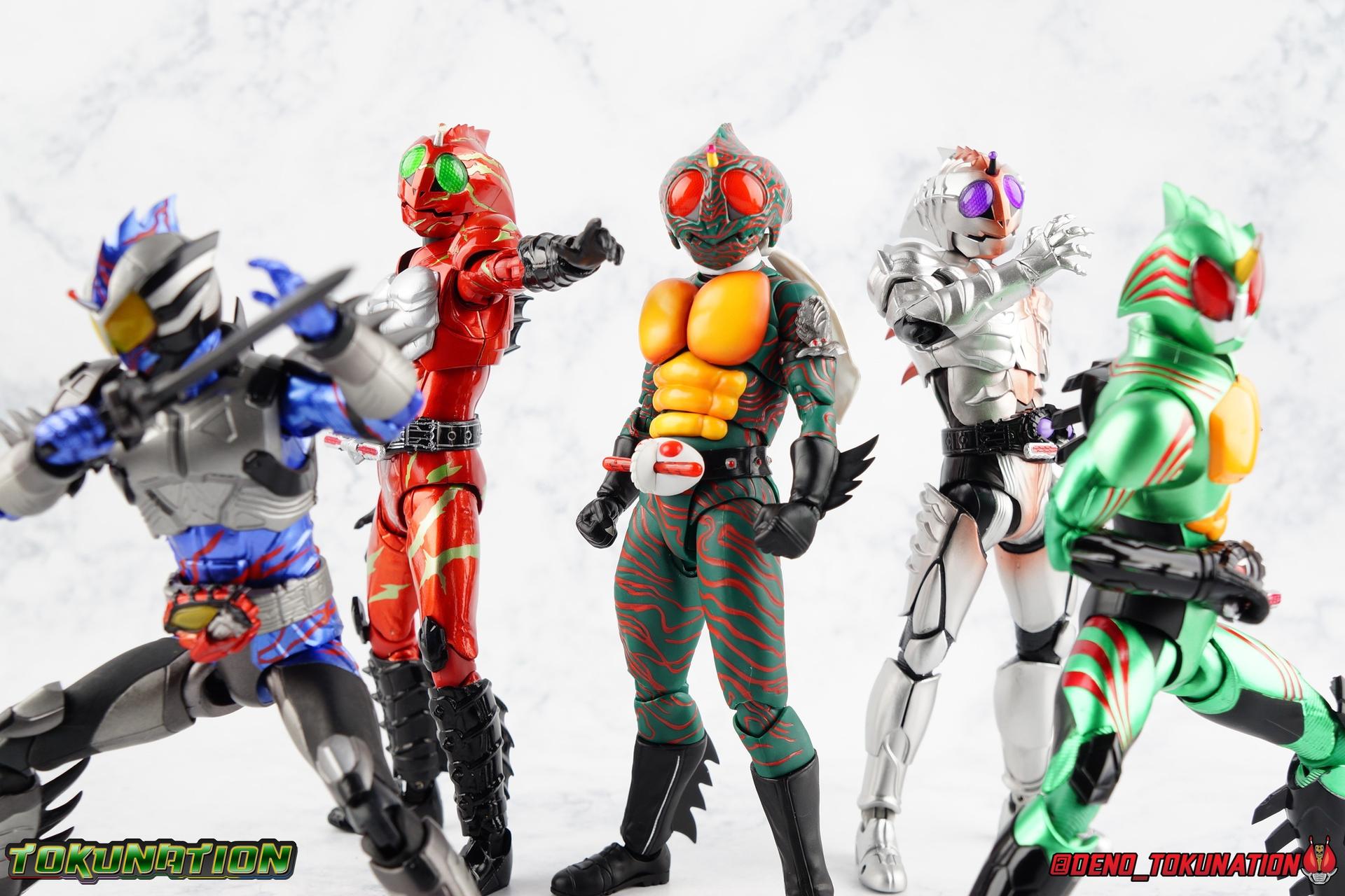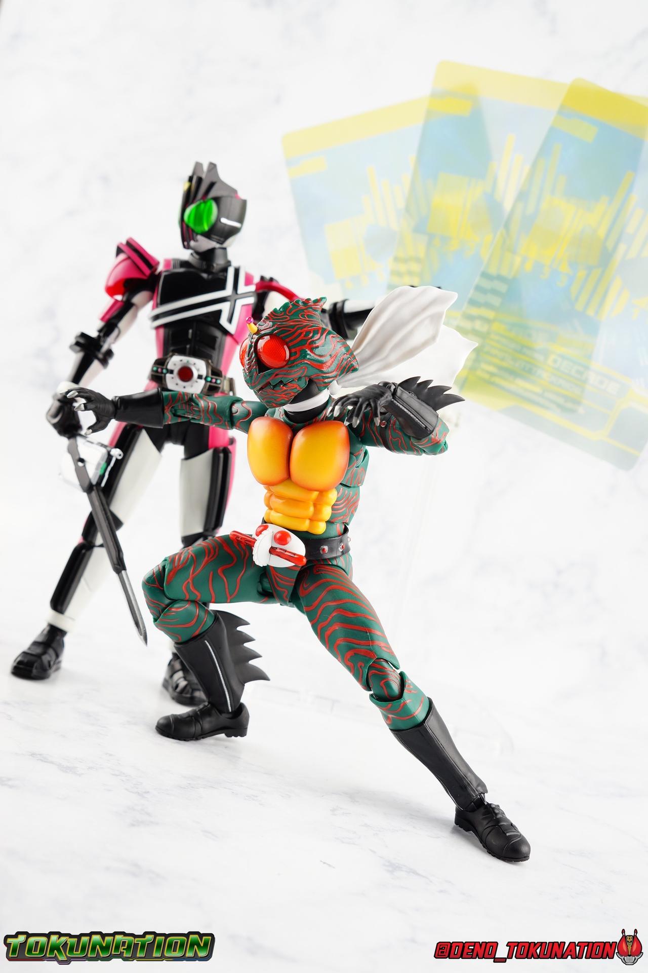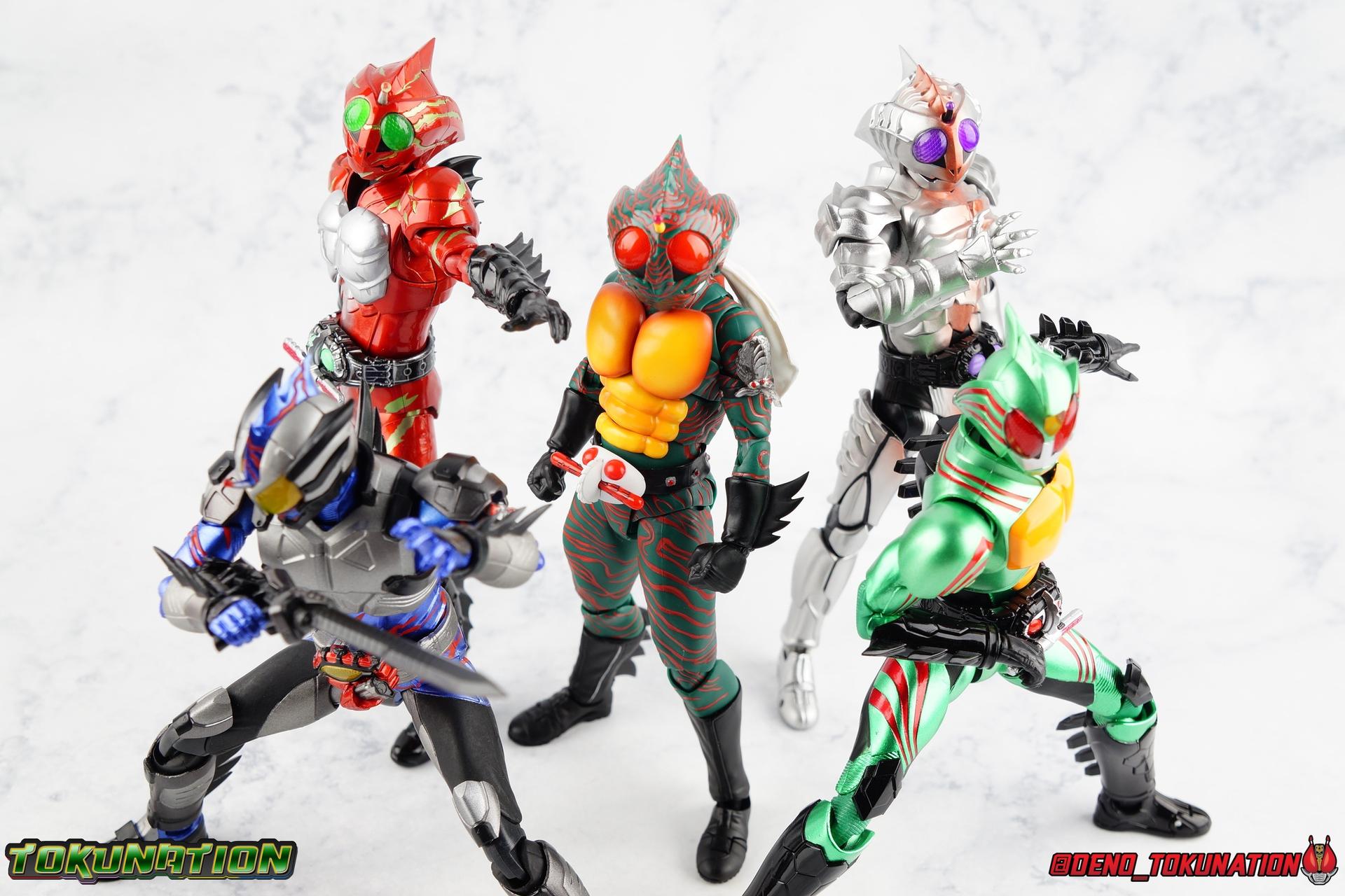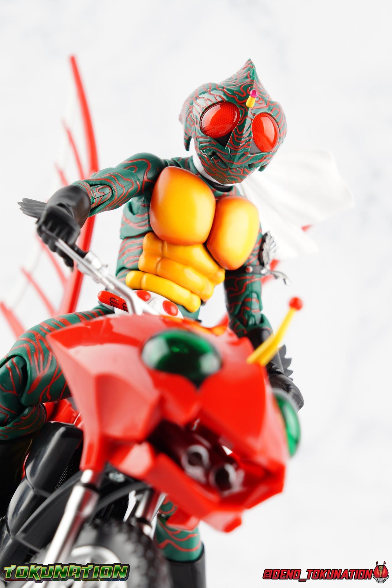 When the village Elder Bago passed the Incan GiGi Armlet to the wild boy Daisuke Yamamoto, he also performed an ancient ritual to save his life. In order to battle against the Ten-Faced Demon Gorgos, Daisuke would learn to use the ancient artifact he'd been entrusted with and master it's powers as Kamen Rider Amazon! Today, we see how Daisuke has evolved with a brand new figure, and the Amazon Series' first foray into the renewal era with S.H. Figuarts Shinkkocchou Seihou Kamen Rider Amazon! Packaging The familiar Shinkocchou Seihou slip cover box makes another appearance! Not much can be said about it this time that hasn't been said before. It's gotten a bit stale over time but it's still a pleasing type of collector's box. For Amazon we do have some cosmetic changes however. The new Bandai Spirits blue logo is featured on the box, as well as a new holofoil Tamashii Nations brand sticker. Main Figure 7 years ago, the original S.H. Figuarts Amazon was released, we reviewed it in 2016. At the time of it's release, this Amazon was already beginning to shift the quality of Showa figuarts, though it would be some time before real change came about with the Black & RX Renewals. Looking back now, Amazon is an extremely dated figure. But for it's time, it really was something else. The functionality & detail presented in it's sculpt was unprecedented. But things change, and now we have something of a next leap in the decade+ long history of S.H. Figuarts. Shinkocchou Seihou has slowly, but much more rapidly in the last 3 years, reshaped what figuarts are. Redesigning characters from the ground up with engineering that takes into account what these suits really looked like on screen, while accommodating the fact that there would be an actual person inside. As the first figure in the line, Kabuto really set the bar high, and I was highly impressed then. When Seihou W was released I found it easily to be the greatest release in the line thus far. Rider 1 was also an incredibly impressive change from it's original counterpart. With ALL of that being said, Shinkocchou Seihou Amazon is absolutely the best the line has to offer so far. Bar none. This version of Amazon, finally puts the original Figuart to shame. Just seeing the two side by side, it's evident just how short, wrongly colored, disproportionate, small overall, and frankly emaciated looking that figure was. The entire shape of it is just wrong. The Seihou is a thing of pure beauty to me. From the ground up, the suit has been fully realized and given the absolute best articulation possible given the design. Where the original had hollow ankles you could see straight through, the Seihou has fully formed feet on wide angle ball joints that provide plenty of posing opportunities. The knees are likewise just about perfect, they have far more range than the original, but like it, the calve spikes will impact the back of the leg when bent far enough. The hips also feature that wonderful interlaced style joint we've come to appreciate in recent years. Some people call it a diaper, but I greatly appreciate the separation of parts and joints in these hips. This complex design allows Amazon to assume some of his moist savage and acrobatic poses. Aside from functionality, the legs are detailed *perfectly*. Every red stripe is sculpted into the body of the figure, and this applies to their placement on the entire body. Then it's painted over. The sculpt is shallow as well, allowing the paint to look like red color on green fabric as with the actual suit. But the detailing isn't limited to just the body and appendages, Bandai has gone the extra mile and made sure that even the connecting joints of the figure feature this detail. Gone are the days of miscolored joints holding limbs together. This is perhaps my favorite minute detail. Moving up, we see Amazon's belt, the Condorer. Though not his henshin device, the Condorer is still just as iconic. The Seihou's belt is a bit more properly round, and has the black detailing the original lacked, while also being more proportionate to the body. Like the original it can be replaced with an open Condorer accessory. As huge an improvement as the legs are, the arms may be more so. The original figure suffered from long scrawny arms that lacked girth. Seihou Amazon is kind of jacked. Thankfully these arms also have a wealth of articulation. Fully unencumbered wrists, a natural elbow joint that fills in the gap as it moves, in much the same way as the knees. A full 360 bicep swivel, and possibly the best shoulder joint I've ever handled. More so than some other Seihou's (looking at you Rider 1), Amazon can bring his arms down to his sides a bit better, though still not totally flat. The trade-off is the excellent shoulder which allows full movement of the arms up and down in nearly any direction. The left arm features the GiGi Armlet, which looks a lot more natural this go around than with the original, as it actually goes around the entire bicep. The sculpt for it is phenomenally better as well. The abdomen and chest now are really something else. The original figure was separated into two chunks, with the pectoral section rotating a little above the lower half. The Seihou takes a cue from Rider 1 and separates this into 3 sections, which can each move independently. There are 3 rows of "abs", the lower most one being it's own ring on the torso, plugged into the waist itself. The middle section has the most movement, then the pecs can rotate a bit as well, but are actually more for arching the back or bending forward. Sometimes this can expose an ugly gap on the side, but it also just goes to show how much this figure can move. This section of the suit is just so much more accurate than the original, and thankfully doesn't have those wacky articulated pecs it did either. While these can move on the Seihou, you don't have giant gaps in them that expose the plastic underneath. And on Amazon's back is a finned spine