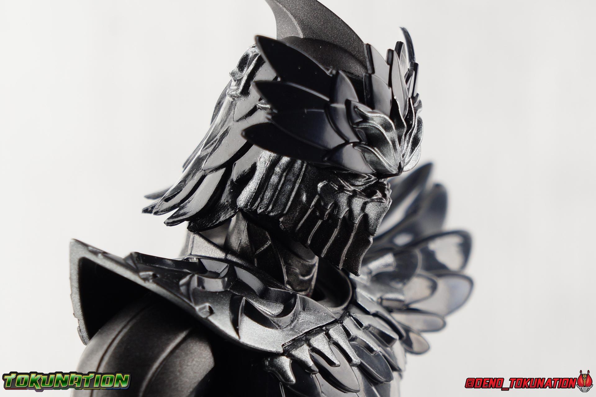 Iyu Hoshino, had not been an Amazon in life. A happy student & devoted daughter, her fate was sealed when her father encountered Jin Takayama, and was subsequently infected with Chihiro's DNA. Driven by an uncontrollable hunger for human flesh her father became the Vulture Amazon, and subsequently murdered his entire family. In the fallout from the original Nozama Pharmaceutical incidents, the emergence and subsequent attempt to massacre the Amazons, strict guidelines were put in place regulating how it's successor 4C could eradicate these creatures. Given special permission, 4C was allowed to create one last Sigma Type in order to have a weapon capable of defeating Amazons. The decision was made for the corpse of Iyu Hoshino to undergo this transformation, creating the first & last new Sigma since Jun Maehara became Kamen Rider Amazon Sigma. This process resulted in a cold, calculating, and powerful fighter capable of taking on the new breed of Amazons on the rampage. Iyu was reborn as the Crow Amazon! Packaging Right in line with the rest of the Amazons that preceeded her, Crow comes in a dark themed box, which is quite sparse thanks to her also dark color scheme. Crow is also the first Amazons release to feature the new blue Bandai Spirits logo as well as the Tamashii Nations holofoil brand sticker. Main Figure The Crow Amazon is the first completely new mold we've gotten in a while for this line. There are two releases of the Alpha mold, two versions of the Omega mold, Sigma Neo & Mole were each unique though spread quite far apart as well. Also releasing this month is Neo Alpha, a reuse of the Neo mold. So Crow is a breath of fresh air for the line right now. I always really dig Kaijin in figure form. Undoubtedly though some don't turn out perfectly, like even the Mole Amazon which had it's faults. But I always welcome the addition of something a bit more monstrous into my collection. These types of figures compliment riders so nicely and Crow is no exception. This unique mold is absolutely covered in sculpted details. There's so much to unpack with this figure, so starting with the legs, I am super intro those Crow Talons. These are nice and pointy so be careful, but they add just little bit to the sinister nature of the design. The sort of claw/talon motif continues the length of the legs as well, as what look like barbs or maybe spines run up the sides of the legs. There's also some scale detail on the thighs that's akin to feathers that I really like a lot. All of these parts are just the same shade of black, a couple with some more metallic applications applied to them. But the details are just so sharply defined that the lack of color isn't detrimental at all. Functionally the ankles really need more clearance for wide stances, sadly the knees are limited by the thickness of the calf and the thighs and the hips are similarly a bit limited. Overall the articulation loses out a bit, but gets the job done. The Crow theme continues for the torso, where talons wrap around the abdomen and the chest is lined by asymmetrical feathers. The back of the figure has this same asymmetry along the the neck and shoulders but the lower back has what I can only describe is a tail fanned out. I feel like this part in particular hurt how the articulation was implemented in the torso. As you can see, there's no waist joint, the figure has an upper body/chest that can rotate just slightly but can also be pushed forward and back on a sliding joint just slightly. The lower torso however is one solid chunk that's attached to the waist, providing no movement at all, and I think that's largely due to the sculpt of the figure, in particular that tail on the back. At the very least though I do appreciate that feather shoulders that sweep up to the left shoulder. They sculpt is just so on point that I tend to be able to forgive some of the other shortcomings. The arms however are harder to forgive. While the feather shoulders are gorgeous, they also limit what the arms can do in extreme ways, disallowing most any upward movement. The elbows & wrists are pretty standard though and they feature more great feather detailing and talons. Crow's left arm also features the Neo Amazons Register, which is her transformation device. It's the same model as the one featured on Amazon Neo, and it's a nice drop of color on this otherwise very dark figure. Finally we come up to the head, which is simply beautiful. It's such an elegant design. The way the mouth plate is designed and shaped I just cannot help but see The Shredder from TMNT. But like, a bird you know? You know what I mean. The way the feathers fan out from the back of the head just makes her seem so regal. But possibly my favorite detail, is that Crow only has one eye. This detail has it's gruesome origin in the night Iyu was killed by her father. As he removed, and then consumed, her right eye. When she was turned into a Sigma Type (like Amazon Sigma before her) she was given a cybernetic eye for her human form. But her Crow Amazon form is forever scarred by the events of that fateful night. The gold paint on the left eye really pops and shines in the right light, and I love it. Accessories Unfortunately Crow comes with very very few accessories. A mere 2 sets of hands. Iyu didn't use any weapons, she didn't have a bike, or a driver. So there's nothing she really could have come with that's specific in that way. The hands are fine, though not particularly unique, but she very well could and should have come with some effect parts. Amazon blood parts like those that came with Mole Amazon would have been fantastic. Just something at all, would have been great frankly. Final Thoughts S.H. Figuarts Crow Amazon is a figure that was really excited to get. After Mole came out I was really hopeful that we'd eventually see more proper Amazons in the line and not just the riders. Season 2 Mole is another figure I'd really like to see at some point, so I hope that Cr