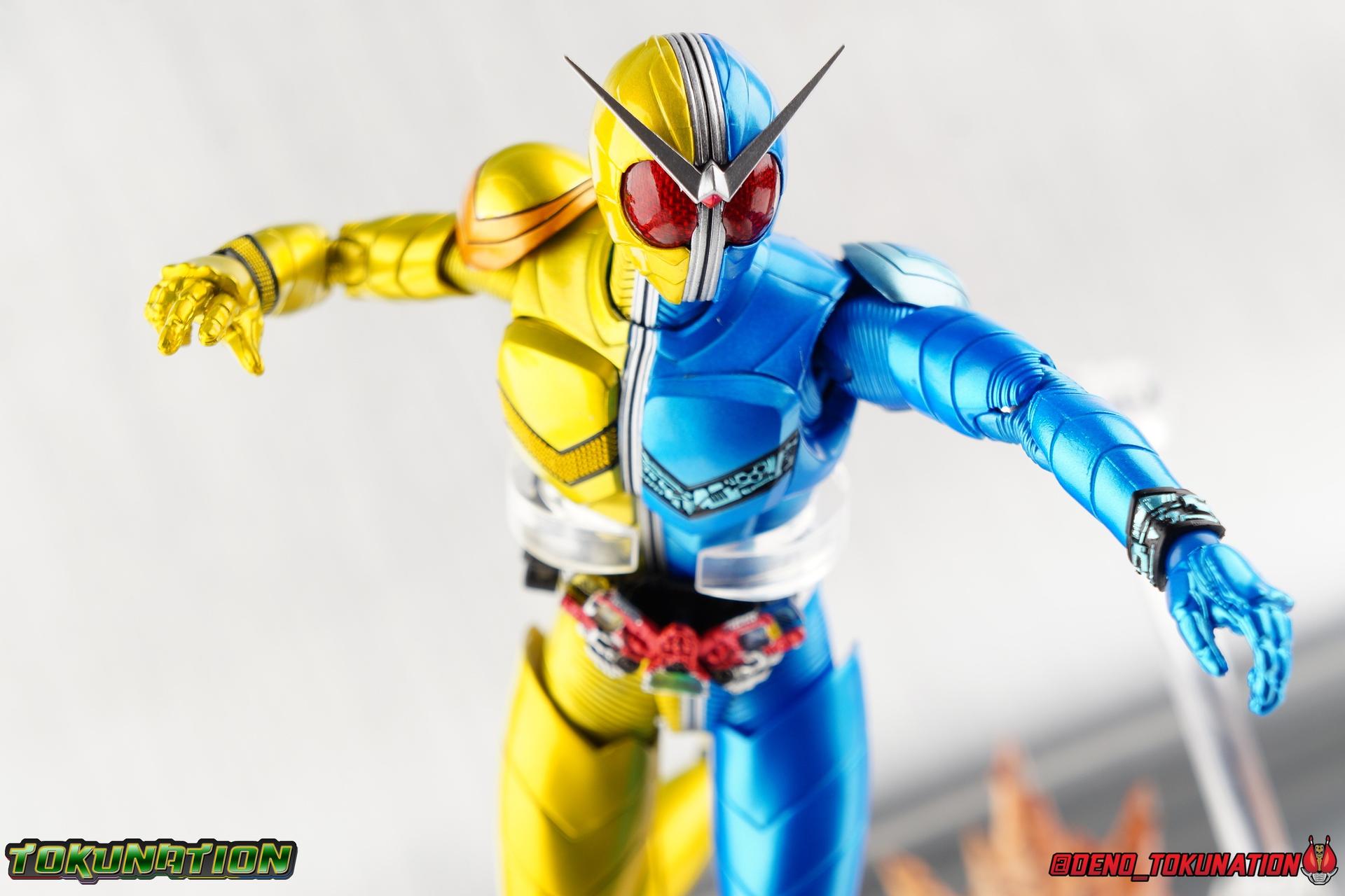 In order to save the young Asuka, who mistakes W for her Papa, Shotaro & Phillip took on the Anomalocaris Dopant. To save Asuka from the monster's tight grip, W used the elastic powers of Luna and sure shooting of Trigger to change the direction of his blasts and stop the Dopant as Kamen Rider W Luna/Trigger! Though this form doesn't have a debut with much fanfare, it'se a really fantastic color and ability combo that we've not seen in rider much before. Packaging The familiar Shinkocchou Seihou slip cover box makes another appearance! Nothing can be said about it this time that hasn't been said before. It's gotten a bit stale over time but it's still a pleasing type of collector's box. However, the benefit of Joker having been a Tamashii Nations event exclusive is that it got a bit of extra packaging fan fare. The anniversary slipcover around the regular Seihou box may be a bit monotone, but it's welcome change to what these releases normally have. Main Figure As with the previous line of Kamen Rider W figuarts, the Seihou releases rely heavily on repaints. Luna/Trigger is just the latest such, soon to be followed up by Heat/Metal. The nice thing about the almost straight repaints of these figures, is that we know exactly what to expect when it comes to W releases now. As with base Cyclone/Joker W, as well as Skull, Fang/Joker, & Joker that's true excellence. Feel free to peruse my review below, but it will be very similar in wording to my previous W related reviews due to the absence of radical changes. This mold has accurately recreated the suits you've seen in numerous episodes and movies down to their finest details. I've said this many times with Shinkoccouh Seihou releases, but I truly think the W body is the peak of engineering in the line so far (though I will be reviewing Wizard Flame Style this month....). But the W mold narrowly beats out other such examples of excellence like Garo & Kabuto Hyper Form. In every conceivable way these are fantastic figuarts though. For a frame of reference, the original W Figuarts were largely a product of their time. The contrast between the old line, and what we have now, is stark. For starters the S.S. release of Luna/Trigger nails the details and coloring. The original L/T figuart had far from accurate colors, more of a mustard yellow and icey blue, but colors imperfections were prevalent and often accepted early in the line. This go around, both halves are gorgeously painted though. The body itself is physically unchanged though aside from the always differnet chest, ankle & wrist details which always corespond to the memory on that half of the body. The figure functions identically the previous outings of the mold as well. If you've seen the C/J, Skull, Joker F/J or even the Eternal review, then you know what you're in for again. This mold works in every way that it must. It has not disappointed, even now, after many repeated uses. So I really don't have much of anything to say about functionality, please feel free to peruse any of those previous reviews for a more in depth look at how the figure functions. Now onto the Double Driver! This belt is still the crowning achievement of W Seihou line. A functional belt at this scale blows me away and simultaneously manages to frustrate me to no end. This figuart includes the Luna & Trigger Memories packed as a separate accessories, rather than in the Driver, so as not to lose them. I lose them very, very, often when shooting galleries of W figures. Just be extremely careful as the fit is quite loose in the Double Driver. Though this time around I only seem to have trouble with Trigger, as Luna stays in quite snugly. I think perhaps one of the few physical issues I may have with this figure is the head. The compound eyes seem a bit off to me. Almost like they're just too dark to see properly. In the group shot I took of C/J, L/T, & F/J together, it's apparent just how much brighter the eyes on C/J were. But I'm just not sure, Luna/Trigger's eyes just look off to me. This minor shortcoming aside this is still another excellent outing of this mold, and because this figure is a repaint of the magnificent Seihou W mold, it has the functionality spot. Seihou Luna/Trigger has the articulation to pull off everything it's known for in show *(though not necessarily the parts for it), and the proper sculpting for the joints needed for it to look perfect while doing so. The extending knee joints that look like a natural expansion of the costume, the near seamless thigh swivels, the way the upper arms & shoulder come together and separate just as you need, and the miraculous way the upper torso is designed. This figure just looks stunning in hand. I think these colors may pop even more than the previous several outings of the mold. The various Seihou W releases just have a way of doing that. I have an irrational desire to own all of these W variant even when I don't actually like the show. It's wacky. Accessories As with other W releases (mostly), Luna/Trigger comes with all the necessities: 6 - sets of hands. A wonderful smattering of options to choose from, these are all just repaints of hands that came with Cyclone/Joker, Fang/Joker, Joker, and Skull. Pretty much everything you're gonna need. 2 - Gaia Memories. 1 Luna, 1 Trigger. Same mold as any other memory, exquisite paint apps on each. Just as easy to lose as every other Gaia Memory you've ever handled. 1 - Trigger Magnum. Unlike the now ancient original Luna/Trigger figuart, this Magnum is fully functional. The original figure came with two Magnums, one for each mode. Whereas this one has a properly rotating Maximum Drive slot to differentiate it's two modes, Normal & Maximum. Memories stick in the slot much better than the Driver. 3 - Memory Gadgets. 1 Spider Shock. This one is set in Spider Mode Permanently and does not have the watch mode. This version can be plugged on the to back of the Magnum and allows W to shoot nets at his enemies. The othe