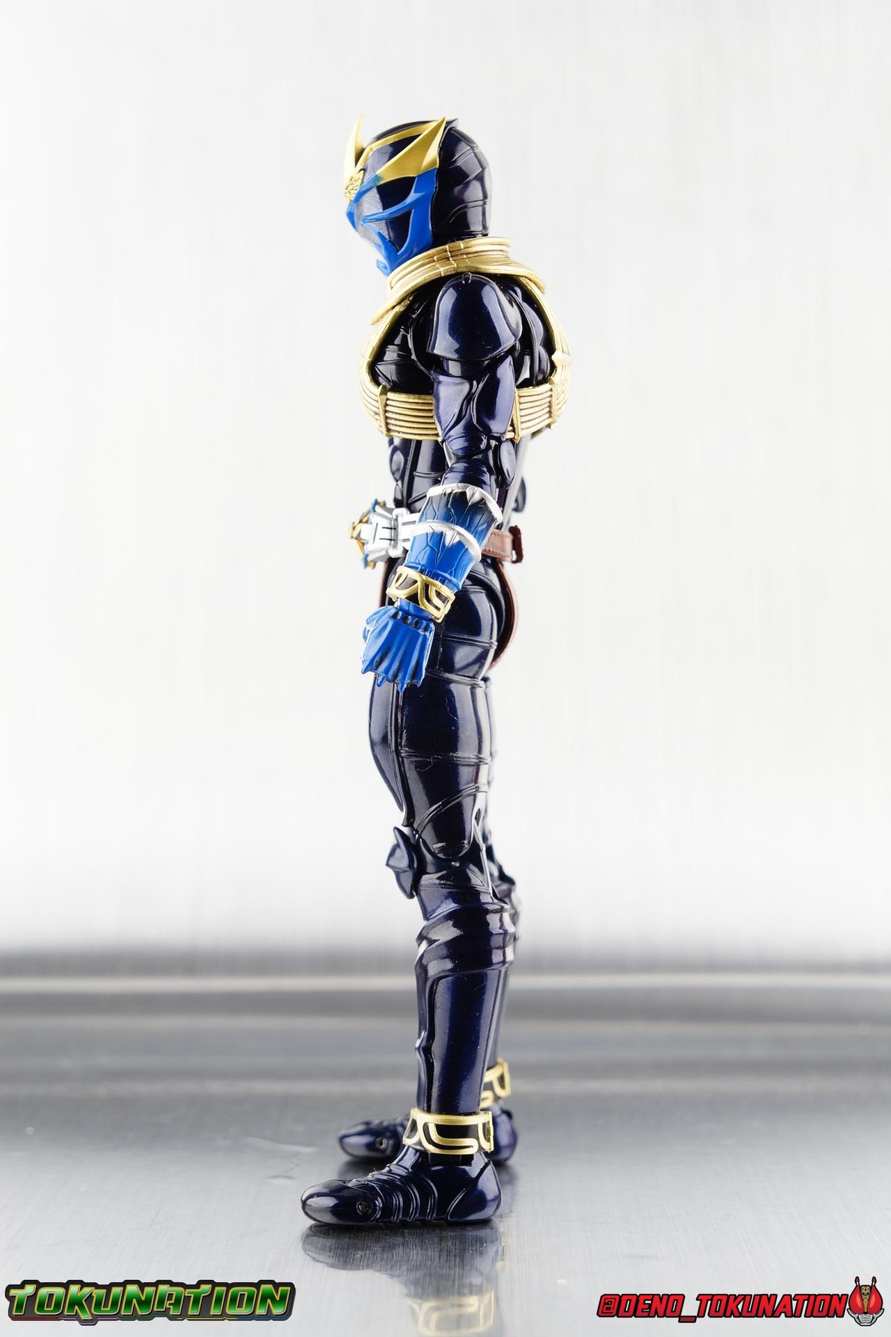 Iori Izumi was born into the head Oni family of the Kanto region. A prodigy driven by loyalty to his family, and to his duty to defeat the Makamou, Izumi fully abandoned his human identity and fully became the Oni of the Izumi family, Kamen Rider Ibuki! Convinced that he cannot be defeated, convinced of his family's strength, Ibuki is a formidable fighter and master of the trumpet weapon Ongekikan Reppuu. This Oni of breath will blow away any Makamou that stand in his path. And for the first time ever, Ibuki makes his debut in the S.H. Figuarts line as a Shinkocchou Seihou! Packaging It's the familiar Shinkocchou Seihou slip cover box once again! Not much can be said about it this time that hasn't been said before. It's gotten a bit stale (to me) over time but it's still a pleasing type of uniform collector's box. Main Figure First things first, like Hibiki, Ibuki is just a really pretty figure. The sculpt of this body type is superb, really bringing to life these unique Oni Rider suits. In every way imaginable it captures the look of the on screen suit right down to the textured musculature. The design process Seihou's go through has always been much much more involved than that of the standard figuarts line. The best example of this having been the special booklets that were included with Kabuto & Hibiki. When the design begins with a sort of skeletal inner frame, and builds out what would be like a suit on a real body like this, you get a much more realistic application of articulation and proportion to the body as a result. Now despite the obvious cosmetic changes, Ibuki is exactly the same basic figure as Hibiki. Featuring identical articulation even. When Bandai nails the design of the body, it can be truly astounding how outer level changes can create two vastly different figures from the same toy. But of course, even 4 years later some of my issues with this mold still persist. I've always found the legs to be quite odd. To me, they look really long and at odds with the torso, especially when bent for crouching poses. Something about them looks off. They function well enough, though I've always thought the Hibiki mold had one of the more strange figuarts hip joints out there. While the part separation undoubtedly gives them great range, the hips look very small by the time you angle them out fully, making the thigh seem huge by comparison. And while the knees function just fine, the feet irk me to no end. Despite being pretty big, too big if you ask me, they don't easily rest flat on any surface, and the toe bends are perpetually difficult to line up straight. It's just hard to get Ibuki or Hibiki for that matter, in a flat footed stance. Ibuki's belt is really loaded up with accessories like Hibiki. This figure comes with a lot any way, luckily you can store multiple things on the belt, in various interchangeable forms. When loaded out for static poses, Ibuki's right hip has the Henshin Onibue Onteki, Ibuki's transformation whistle. The left hip features a Disc Animal holster with 3 non-removable discs sculpted in. Straight out of the box, the center of the belt has Ibuki's Ongekimei Narukaze attached. This disc piece is removable to simulate how it combines with Ibuki's Ongekikan Reppuu, though it does not actually combine with either of the Reppuu's included with the figure. It can be used with any Oni Rider that has a similarly designed belt. The upper body is identical to Hibiki, just removing the silver accent parts and replacing them with golden trumpet like tubing. The upper and lower halves of the torso move well enough, independent of one another, though it's a tight fit to get either to move very far. I've always felt this body type was a bit stiff, but it gets the job done. Ibuki's arms are basically identical to Hibiki, though like the rest of the body are painted in a nice glossy blue rather than Hibiki's metallic purple. The shoulder pads still annoy me to no end, they just pop off basically all the time. And like Hibiki, Ibuki has a stunning headsculpt. In particular the blue lines along the faceplate and visor are crisply painted, while the visor itself has a near perfect silver fade into the blue of the helmet. Likewise the blue on the visor transitions into gold on the horns near perfectly. And the sculpt on the second Oni face on the forehead is just spot on perfect. The tubing around the neck can impact some of it's outward movement, but overall it's just incredibly nice looking. While I have my gripes about the various components of the figure, the total package taken at once is really very nice. Accessories Much like Hibiki, Ibuki is fully loaded: 4 - sets of hands. This gives you basically everything you need to hold any of the included accessories, though the ones intended to hold the Reppuu do not work well at all. In it's complete form it's intended to be held from the center like an actual trumpet, rather than the trigger and stock as the gun form is. But the hand meant to hold it has a very very poor grip. I also really wish there were more and proper expressive open hands. There just aren't really the right hands to make Ibuki feel like he's really moving. 1 - Ongekikan Reppuu (gun mode). This incomplete form of the Reppuu is what Ibuki uses most often for basic attacks against Makamou. Held like a traditional side arm, this is how I prefer to pose him for display. 1 - Ongekikan Reppuu (trumpet mode). The Trumpet mode in show takes the Reppuu and combines it with the Narukaze on Ibuki's belt to form the end of the instrument. The mouthpiece would also be removed from the front section and plugged onto the back. The Figuart opts to just have this version of the Reppuu included as a complete weapon so you don't risk losing any tiny parts. Which at this scale I'm totally okay with. 1 - open mouth head. When Ibuki uses the Reppuu in Trumpet mode to actually play it properly as an instrument to attack Makamou, a sculpted mouth appears on his helmet. Thank