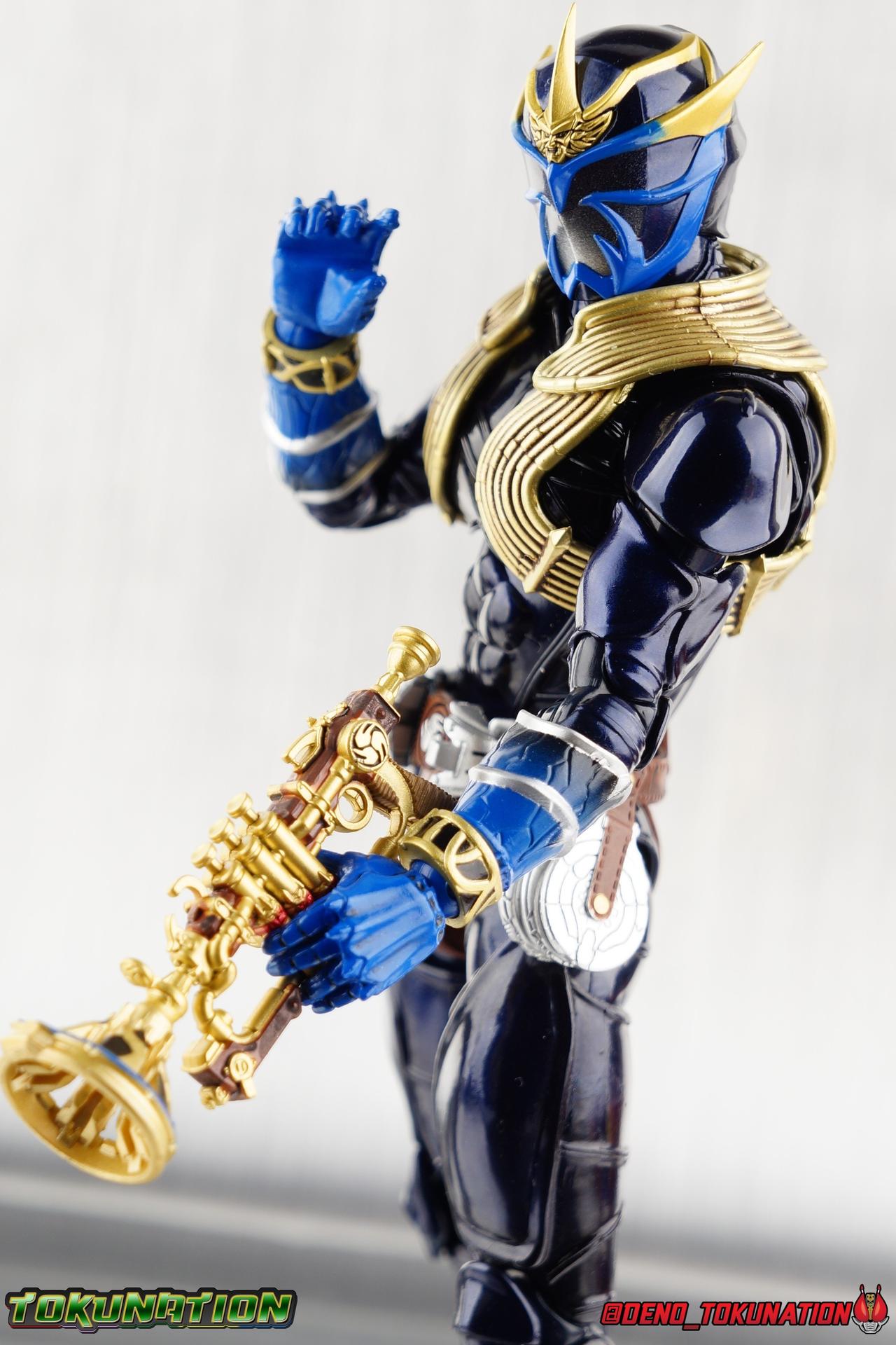 Iori Izumi was born into the head Oni family of the Kanto region. A prodigy driven by loyalty to his family, and to his duty to defeat the Makamou, Izumi fully abandoned his human identity and fully became the Oni of the Izumi family, Kamen Rider Ibuki! Convinced that he cannot be defeated, convinced of his family's strength, Ibuki is a formidable fighter and master of the trumpet weapon Ongekikan Reppuu. This Oni of breath will blow away any Makamou that stand in his path. And for the first time ever, Ibuki makes his debut in the S.H. Figuarts line as a Shinkocchou Seihou! Packaging It's the familiar Shinkocchou Seihou slip cover box once again! Not much can be said about it this time that hasn't been said before. It's gotten a bit stale (to me) over time but it's still a pleasing type of uniform collector's box. Main Figure First things first, like Hibiki, Ibuki is just a really pretty figure. The sculpt of this body type is superb, really bringing to life these unique Oni Rider suits. In every way imaginable it captures the look of the on screen suit right down to the textured musculature. The design process Seihou's go through has always been much much more involved than that of the standard figuarts line. The best example of this having been the special booklets that were included with Kabuto & Hibiki. When the design begins with a sort of skeletal inner frame, and builds out what would be like a suit on a real body like this, you get a much more realistic application of articulation and proportion to the body as a result. Now despite the obvious cosmetic changes, Ibuki is exactly the same basic figure as Hibiki. Featuring identical articulation even. When Bandai nails the design of the body, it can be truly astounding how outer level changes can create two vastly different figures from the same toy. But of course, even 4 years later some of my issues with this mold still persist. I've always found the legs to be quite odd. To me, they look really long and at odds with the torso, especially when bent for crouching poses. Something about them looks off. They function well enough, though I've always thought the Hibiki mold had one of the more strange figuarts hip joints out there. While the part separation undoubtedly gives them great range, the hips look very small by the time you angle them out fully, making the thigh seem huge by comparison. And while the knees function just fine, the feet irk me to no end. Despite being pretty big, too big if you ask me, they don't easily rest flat on any surface, and the toe bends are perpetually difficult to line up straight. It's just hard to get Ibuki or Hibiki for that matter, in a flat footed stance. Ibuki's belt is really loaded up with accessories like Hibiki. This figure comes with a lot any way, luckily you can store multiple things on the belt, in various interchangeable forms. When loaded out for static poses, Ibuki's right hip has the Henshin Onibue Onteki, Ibuki's transformation whistle. The left hip features a Disc Animal holster with 3 non-removable discs sculpted in. Straight out of the box, the center of the belt has Ibuki's Ongekimei Narukaze attached. This disc piece is removable to simulate how it combines with Ibuki's Ongekikan Reppuu, though it does not actually combine with either of the Reppuu's included with the figure. It can be used with any Oni Rider that has a similarly designed belt. The upper body is identical to Hibiki, just removing the silver accent parts and replacing them with golden trumpet like tubing. The upper and lower halves of the torso move well enough, independent of one another, though it's a tight fit to get either to move very far. I've always felt this body type was a bit stiff, but it gets the job done. Ibuki's arms are basically identical to Hibiki, though like the rest of the body are painted in a nice glossy blue rather than Hibiki's metallic purple. The shoulder pads still annoy me to no end, they just pop off basically all the time. And like Hibiki, Ibuki has a stunning headsculpt. In particular the blue lines along the faceplate and visor are crisply painted, while the visor itself has a near perfect silver fade into the blue of the helmet. Likewise the blue on the visor transitions into gold on the horns near perfectly. And the sculpt on the second Oni face on the forehead is just spot on perfect. The tubing around the neck can impact some of it's outward movement, but overall it's just incredibly nice looking. While I have my gripes about the various components of the figure, the total package taken at once is really very nice. Accessories Much like Hibiki, Ibuki is fully loaded: 4 - sets of hands. This gives you basically everything you need to hold any of the included accessories, though the ones intended to hold the Reppuu do not work well at all. In it's complete form it's intended to be held from the center like an actual trumpet, rather than the trigger and stock as the gun form is. But the hand meant to hold it has a very very poor grip. I also really wish there were more and proper expressive open hands. There just aren't really the right hands to make Ibuki feel like he's really moving. 1 - Ongekikan Reppuu (gun mode). This incomplete form of the Reppuu is what Ibuki uses most often for basic attacks against Makamou. Held like a traditional side arm, this is how I prefer to pose him for display. 1 - Ongekikan Reppuu (trumpet mode). The Trumpet mode in show takes the Reppuu and combines it with the Narukaze on Ibuki's belt to form the end of the instrument. The mouthpiece would also be removed from the front section and plugged onto the back. The Figuart opts to just have this version of the Reppuu included as a complete weapon so you don't risk losing any tiny parts. Which at this scale I'm totally okay with. 1 - open mouth head. When Ibuki uses the Reppuu in Trumpet mode to actually play it properly as an instrument to attack Makamou, a sculpted mouth appears on his helmet. Thank