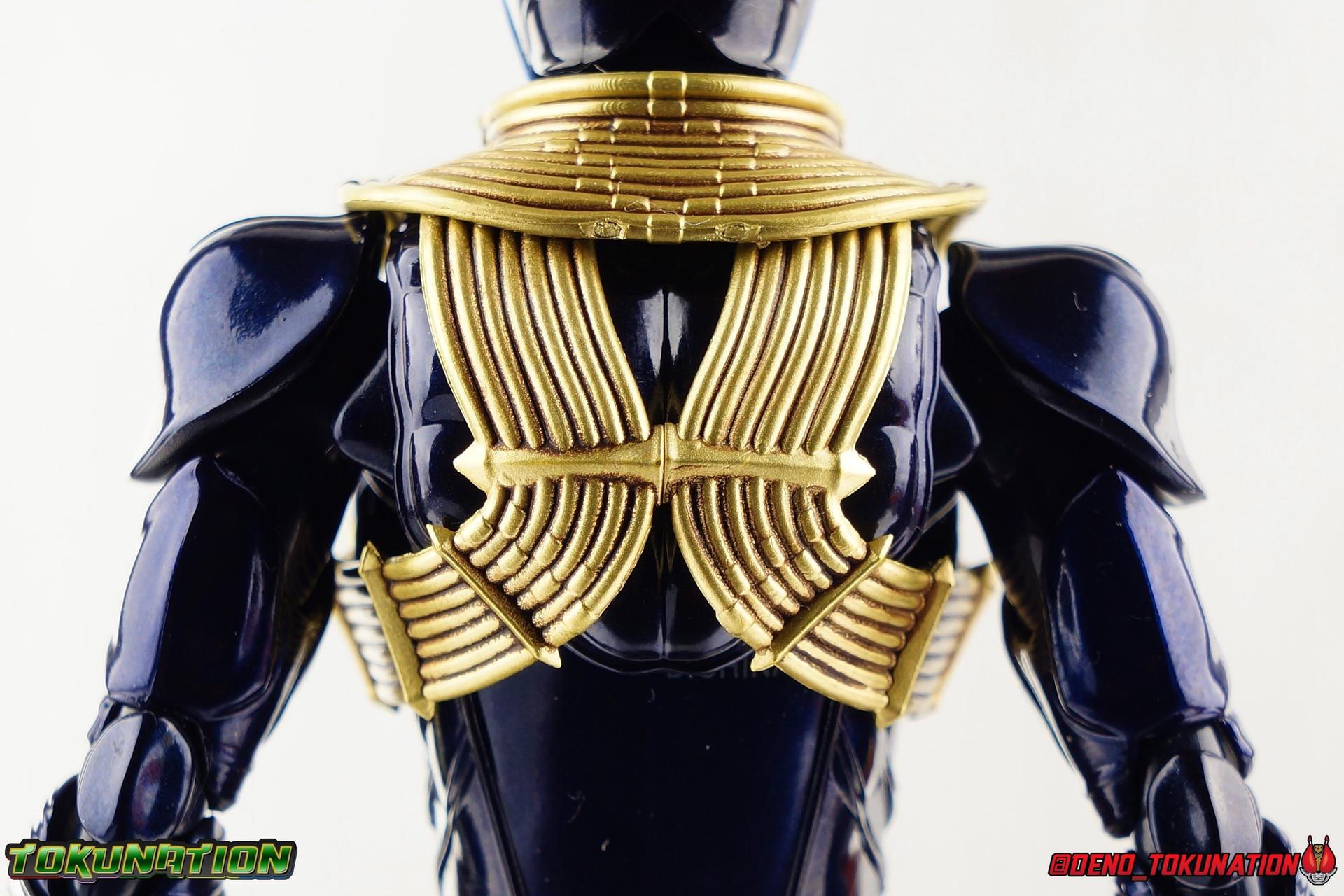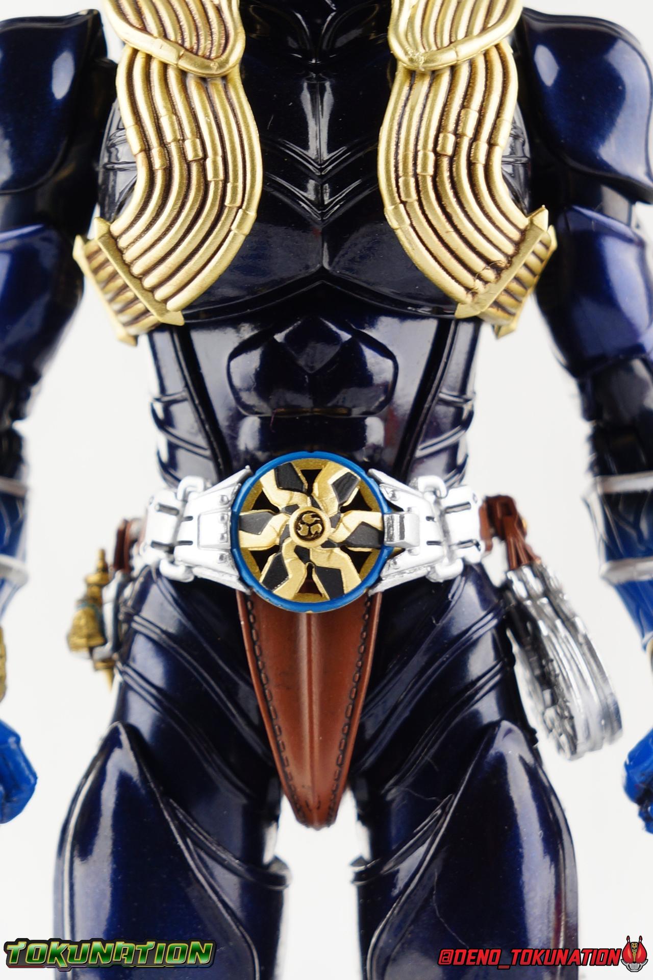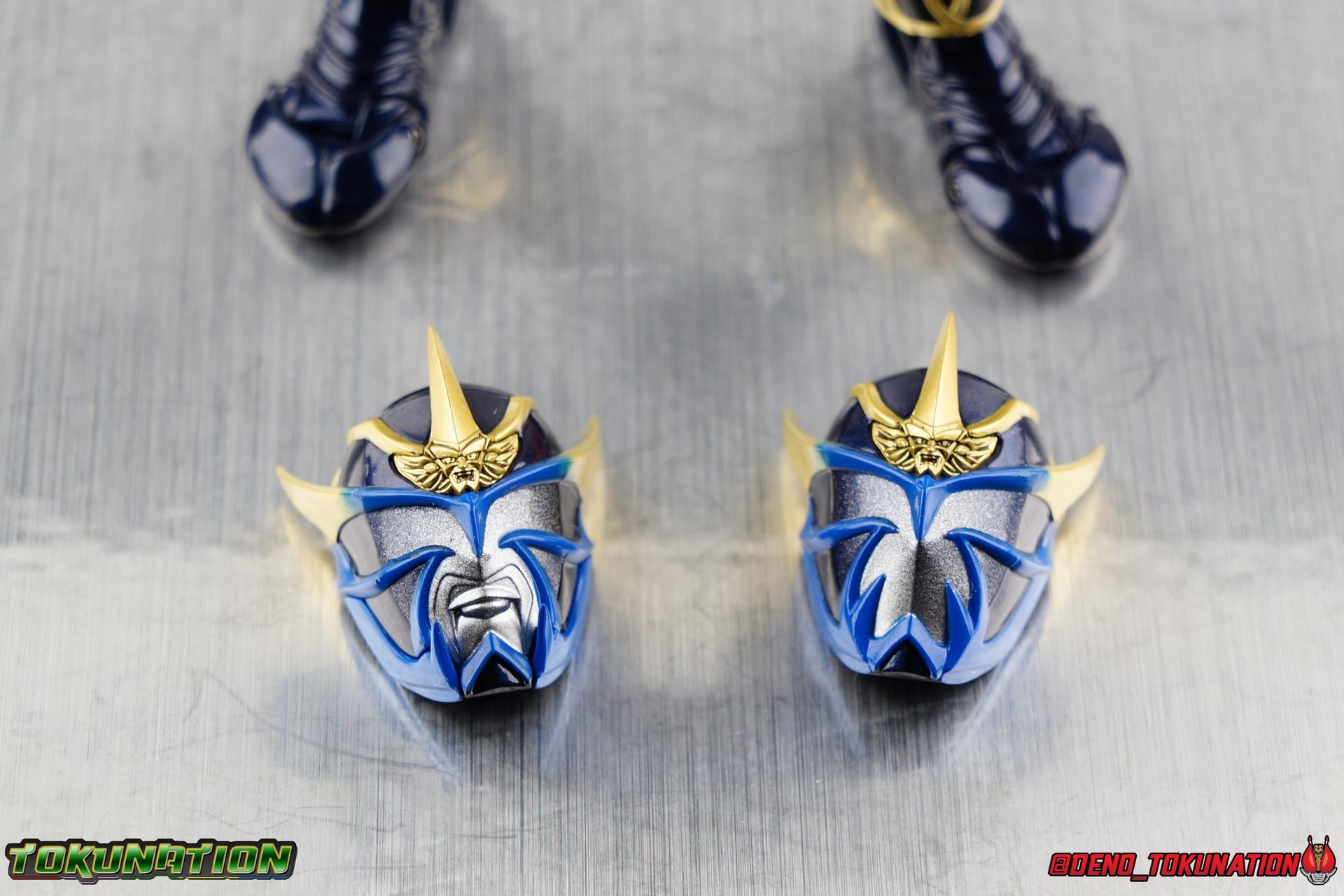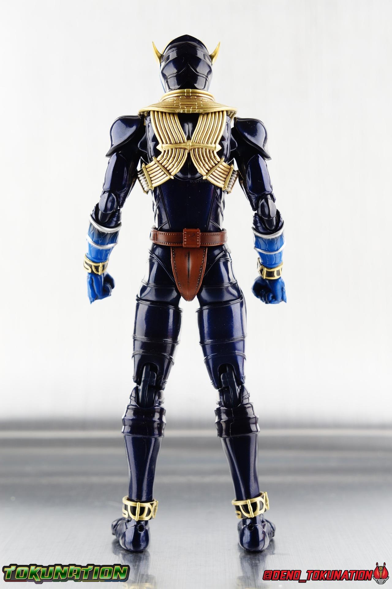 Iori Izumi was born into the head Oni family of the Kanto region. A prodigy driven by loyalty to his family, and to his duty to defeat the Makamou, Izumi fully abandoned his human identity and fully became the Oni of the Izumi family, Kamen Rider Ibuki! Convinced that he cannot be defeated, convinced of his family's strength, Ibuki is a formidable fighter and master of the trumpet weapon Ongekikan Reppuu. This Oni of breath will blow away any Makamou that stand in his path. And for the first time ever, Ibuki makes his debut in the S.H. Figuarts line as a Shinkocchou Seihou! Packaging It's the familiar Shinkocchou Seihou slip cover box once again! Not much can be said about it this time that hasn't been said before. It's gotten a bit stale (to me) over time but it's still a pleasing type of uniform collector's box. Main Figure First things first, like Hibiki, Ibuki is just a really pretty figure. The sculpt of this body type is superb, really bringing to life these unique Oni Rider suits. In every way imaginable it captures the look of the on screen suit right down to the textured musculature. The design process Seihou's go through has always been much much more involved than that of the standard figuarts line. The best example of this having been the special booklets that were included with Kabuto & Hibiki. When the design begins with a sort of skeletal inner frame, and builds out what would be like a suit on a real body like this, you get a much more realistic application of articulation and proportion to the body as a result. Now despite the obvious cosmetic changes, Ibuki is exactly the same basic figure as Hibiki. Featuring identical articulation even. When Bandai nails the design of the body, it can be truly astounding how outer level changes can create two vastly different figures from the same toy. But of course, even 4 years later some of my issues with this mold still persist. I've always found the legs to be quite odd. To me, they look really long and at odds with the torso, especially when bent for crouching poses. Something about them looks off. They function well enough, though I've always thought the Hibiki mold had one of the more strange figuarts hip joints out there. While the part separation undoubtedly gives them great range, the hips look very small by the time you angle them out fully, making the thigh seem huge by comparison. And while the knees function just fine, the feet irk me to no end. Despite being pretty big, too big if you ask me, they don't easily rest flat on any surface, and the toe bends are perpetually difficult to line up straight. It's just hard to get Ibuki or Hibiki for that matter, in a flat footed stance. Ibuki's belt is really loaded up with accessories like Hibiki. This figure comes with a lot any way, luckily you can store multiple things on the belt, in various interchangeable forms. When loaded out for static poses, Ibuki's right hip has the Henshin Onibue Onteki, Ibuki's transformation whistle. The left hip features a Disc Animal holster with 3 non-removable discs sculpted in. Straight out of the box, the center of the belt has Ibuki's Ongekimei Narukaze attached. This disc piece is removable to simulate how it combines with Ibuki's Ongekikan Reppuu, though it does not actually combine with either of the Reppuu's included with the figure. It can be used with any Oni Rider that has a similarly designed belt. The upper body is identical to Hibiki, just removing the silver accent parts and replacing them with golden trumpet like tubing. The upper and lower halves of the torso move well enough, independent of one another, though it's a tight fit to get either to move very far. I've always felt this body type was a bit stiff, but it gets the job done. Ibuki's arms are basically identical to Hibiki, though like the rest of the body are painted in a nice glossy blue rather than Hibiki's metallic purple. The shoulder pads still annoy me to no end, they just pop off basically all the time. And like Hibiki, Ibuki has a stunning headsculpt. In particular the blue lines along the faceplate and visor are crisply painted, while the visor itself has a near perfect silver fade into the blue of the helmet. Likewise the blue on the visor transitions into gold on the horns near perfectly. And the sculpt on the second Oni face on the forehead is just spot on perfect. The tubing around the neck can impact some of it's outward movement, but overall it's just incredibly nice looking. While I have my gripes about the various components of the figure, the total package taken at once is really very nice. Accessories Much like Hibiki, Ibuki is fully loaded: 4 - sets of hands. This gives you basically everything you need to hold any of the included accessories, though the ones intended to hold the Reppuu do not work well at all. In it's complete form it's intended to be held from the center like an actual trumpet, rather than the trigger and stock as the gun form is. But the hand meant to hold it has a very very poor grip. I also really wish there were more and proper expressive open hands. There just aren't really the right hands to make Ibuki feel like he's really moving. 1 - Ongekikan Reppuu (gun mode). This incomplete form of the Reppuu is what Ibuki uses most often for basic attacks against Makamou. Held like a traditional side arm, this is how I prefer to pose him for display. 1 - Ongekikan Reppuu (trumpet mode). The Trumpet mode in show takes the Reppuu and combines it with the Narukaze on Ibuki's belt to form the end of the instrument. The mouthpiece would also be removed from the front section and plugged onto the back. The Figuart opts to just have this version of the Reppuu included as a complete weapon so you don't risk losing any tiny parts. Which at this scale I'm totally okay with. 1 - open mouth head. When Ibuki uses the Reppuu in Trumpet mode to actually play it properly as an instrument to attack Makamou, a sculpted mouth appears on his helmet. Thank