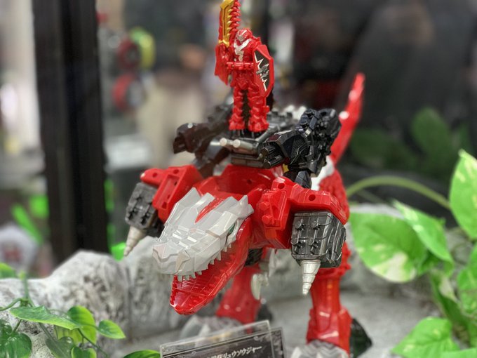 The mecha? We don't have a full rundown. It looks like it's mostly parts-forming: the turrets, drills, and dino head all appear to be detachable. (The dino head fits onto the end of an arm in one of its configurations.) I'm not sure where the tail goes, but I'm guessing it folds into the torso. Plugging stuff into the different Lego-like ports appears to be the primary mechanic, and is one of the main ways the configurations are different from one another. All of them so far involve the Ryusoul being inserted backward into the neck, with the head facing forward. Each revealed mecha form can have a different head based on the Ryusoul used. The pink, blue, black, and green mecha appear to all be able to separate into two or more parts to give different forms more versatility.