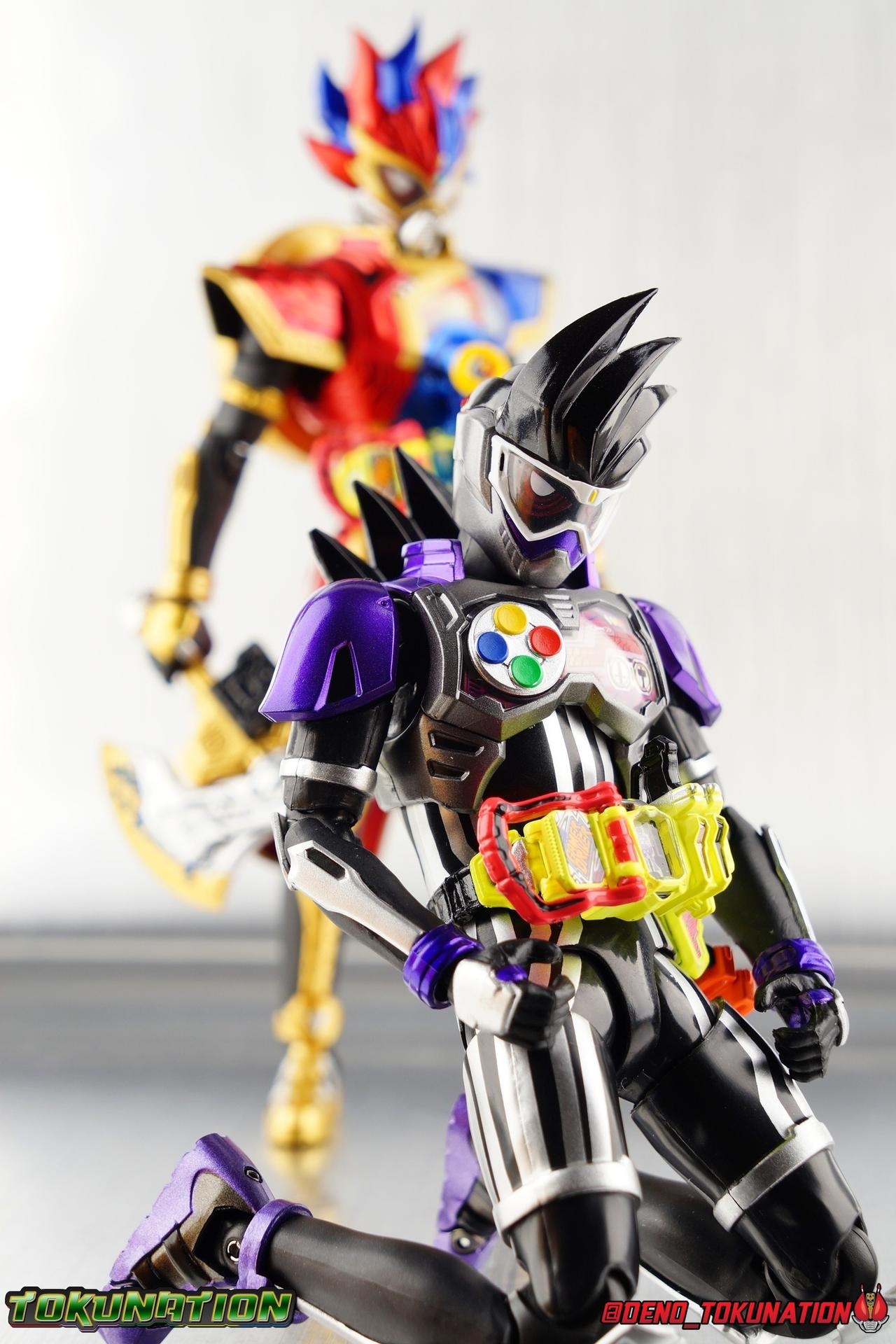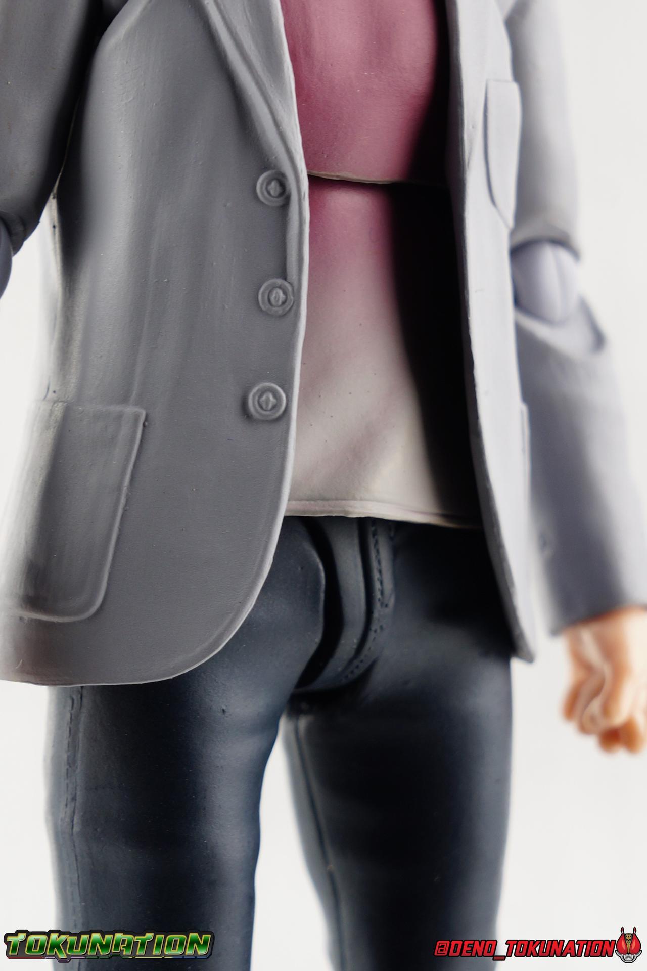 The one and only Game Master returns! And this time in another variation of his wild personality. Deleted by Parad, Kuroto Dan's data was scattered into the Proto Mighty Action X Gashat and seemingly lost. But thanks to Poppy, Kuroto's data was recovered and the game master was reborn, as a Bugster! Now imbued with all the abilities of a Bugster, and begrudgingly joining up with the team at CR, Kuroto has returned to stop Parad, Masamune, and anyone else who gets in the way of his path to godhood! Packaging As you've likely noticed the packaging calls out the name of this figures as "Dan Kuroto Shin". And I'm calling the figure "Shin Kuroto Dan". The situation is undoubtedly confusing because of the way in which Japanese naming conventions work, with family names (Dan) given first and first names (Kuroto) given last. And with adding the title of Shin to his name, Kuroto makes the naming convention that much more odd. Arranged with English naming conventions it should look like Shin (New) Kuroto Dan. Hence the way I reference the figure in the review. Now unlike the other Kuroto civilian release, with a Buggle Driver styled box, this one fits in much more with what we've come to expect of Ex-Aid web exclusives. Though the front of the box does feature an excellent shot of Kuroto rising from his Continue Pipe, the rest of the arrangement is fairly standard. Like most new releases Kuroto's box also features the Tamashii Brand Sticker and blue Bandai Spirits logo. Main Figure As one of only of only a handful of characters to have ever received the civilian figure treatment across the S.H. Figuarts line, Kuroto Dan needs to hit certain benchmarks to be a decent release. Takeshi Hongo & Den-O's Hana are so far the only other Kamen Rider characters to have ever received these types of figures previously. Hongo having been released only about a year ago, is really quite the charming figure. Even if it suffers some articulation loss due to it's design as well as some odd engineering choices. Hana was released at a time when the SHF line really didn't have a truly clear or complex direction, and her figure skewed more toward an anime aesthetic rather than a life like one. Current civilian figuarts do a much better job of hitting the likeness of an actor. So it really does speak to the popularity of Kuroto Dan as a character that not only have 4 of his forms been re-created in this toyline, but now two versions of his civilian identity as well! Today's subject, Shin Kuroto Dan, should not be confused with another release of the character as Kuroto Dan Shin. Though this figure technically represents Kuroto at his return in episode 30, he doesn't begin wearing this outfit or referencing himself as "Shin" Kuroto until the following episode. Now the figure features an odd mix of intelligent choices and just kind of bad ones. Overall, it gets the look of Kuroto down. His slender and stylish look translates very well to this type of figure. In static poses it looks fairly natural. The legs are sculpted with all of the folds that you might imagine real pants would have, giving them a better sense of realism. But then the hips break up this design with really ugly outward rotating joints. Giving Kuroto very much what people would call a "diaper", though in this case I think of it as a thong. The back of the legs have that sort of Figma style disc look for the knee joints, which I personally hate. The feet are of course the typical long stylish dress shoes Kuroto was known for. They feature a toe bend which can be useful in some posing situations, but ankle tilts that can be severely limited by the cuff of the pant leg in most others. For some reason I've found that the plastic that Kuroto & even Hongo were made of is very stiff and inflexible. So despite there being a decent range in the joints that are present in the legs, I find them annoying to pose, and difficult to angle outward. Part of the reason the legs have difficulty moving outward is Kuroto's jacket. It hangs down low enough, and provides just enough resistance to keep the hips a bit restricted. The bigger culprit however is the lower half of the upper body. The body is separated into two halves molded like the t-shirt he's often seen wearing. The bottom half is plugged on and hangs down around the waist joint. This limits rotation of the waste and hip movement. The upper half of the body loses part of it's rotations because of the jacket fixed to the sides of it hitting the rest of the body as it moves. The back of the jacket also has a peg hole to use with an included adapter which makes no sense to me, but I'll get to that further below. Overall I find the torso really unfortunate because, had it been designed correctly, you could have properly used a Gamer Driver from another figure with this one. As is, the best I could do was take the removable Driver from Lazer level 2 and rest it between Kuroto's jacket halves. The shoulders and arms are set basically the same way as Hongo design wise. Shoulder pads set within the shoulder that extend out, with a bicep set within them at an angle. This has, mixed results. You lose quite a bit of the potential rotation in a bicep swivel when it's angled like this. But the real issue is that the shoulder parts rub against each other, there just isn't much room in there, so you wind up with a joint that locks up rather easily. It also inhibits the arm's ability to move across the chest, so you lose a lot of expressiveness there. The arms can move out fairly well at the bicep intersection, and the elbows (with those ugly joints!) work very well as well. For some reason the wrist ball joints are super stiff on mine and just barely rotate. But they work well enough. Finally, kami da! The likeness of actor Tetsuya Iwanagi is actually pretty great. Though I do not care at all for the default face the figure has out of box. I much prefer one of the other two faces included. This one feels much more like an alter